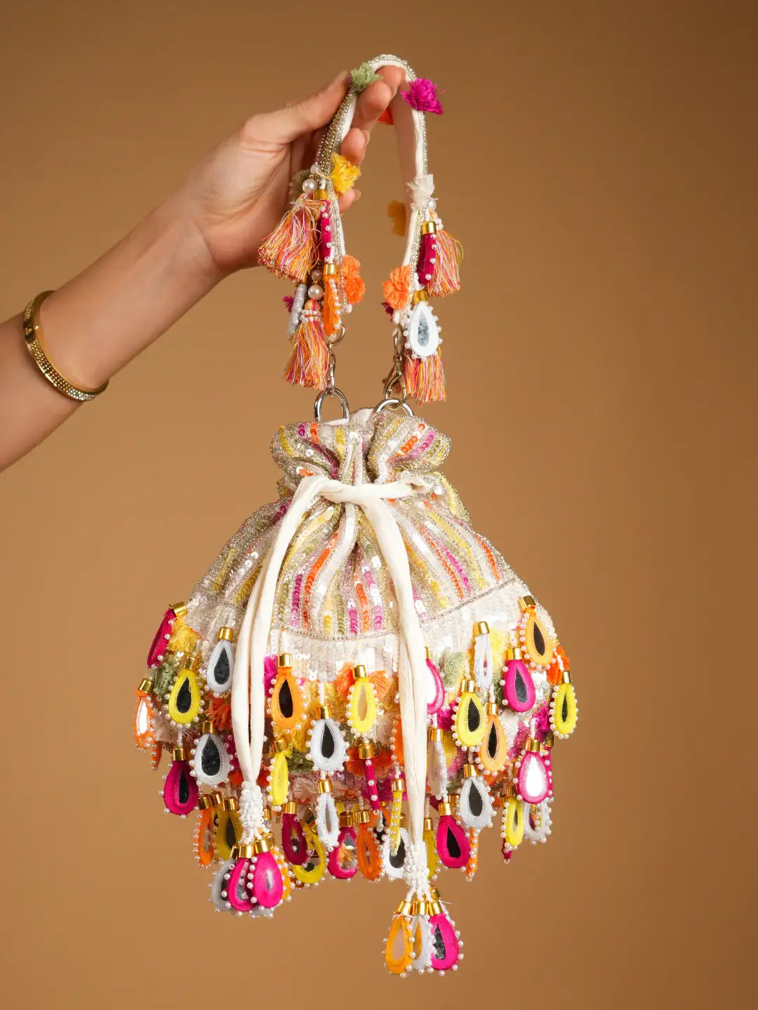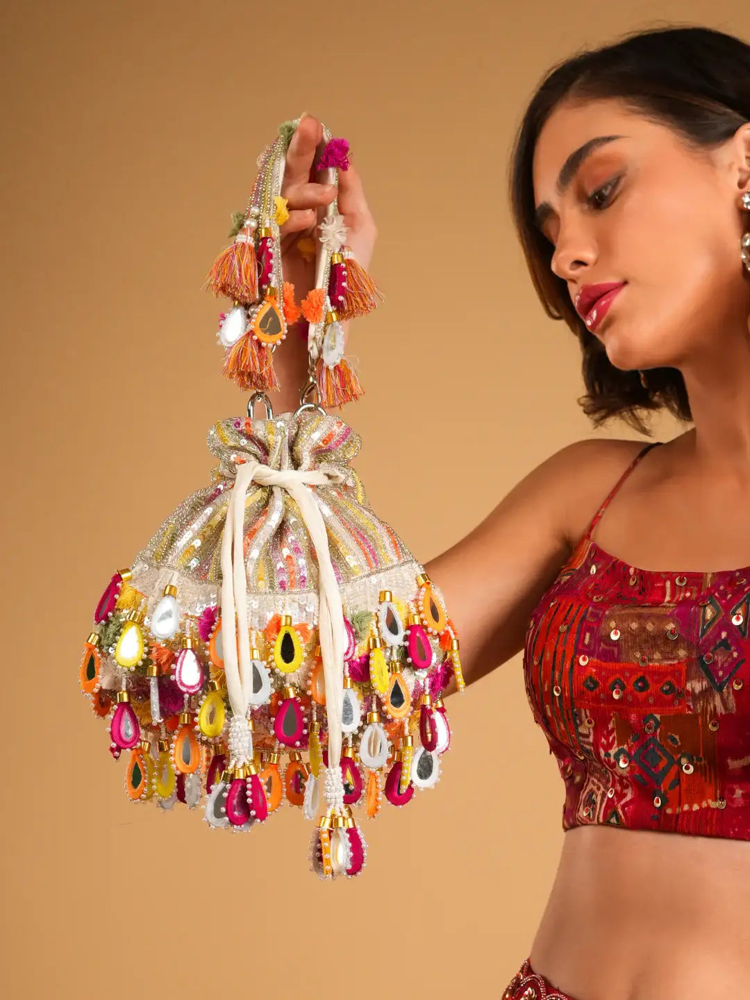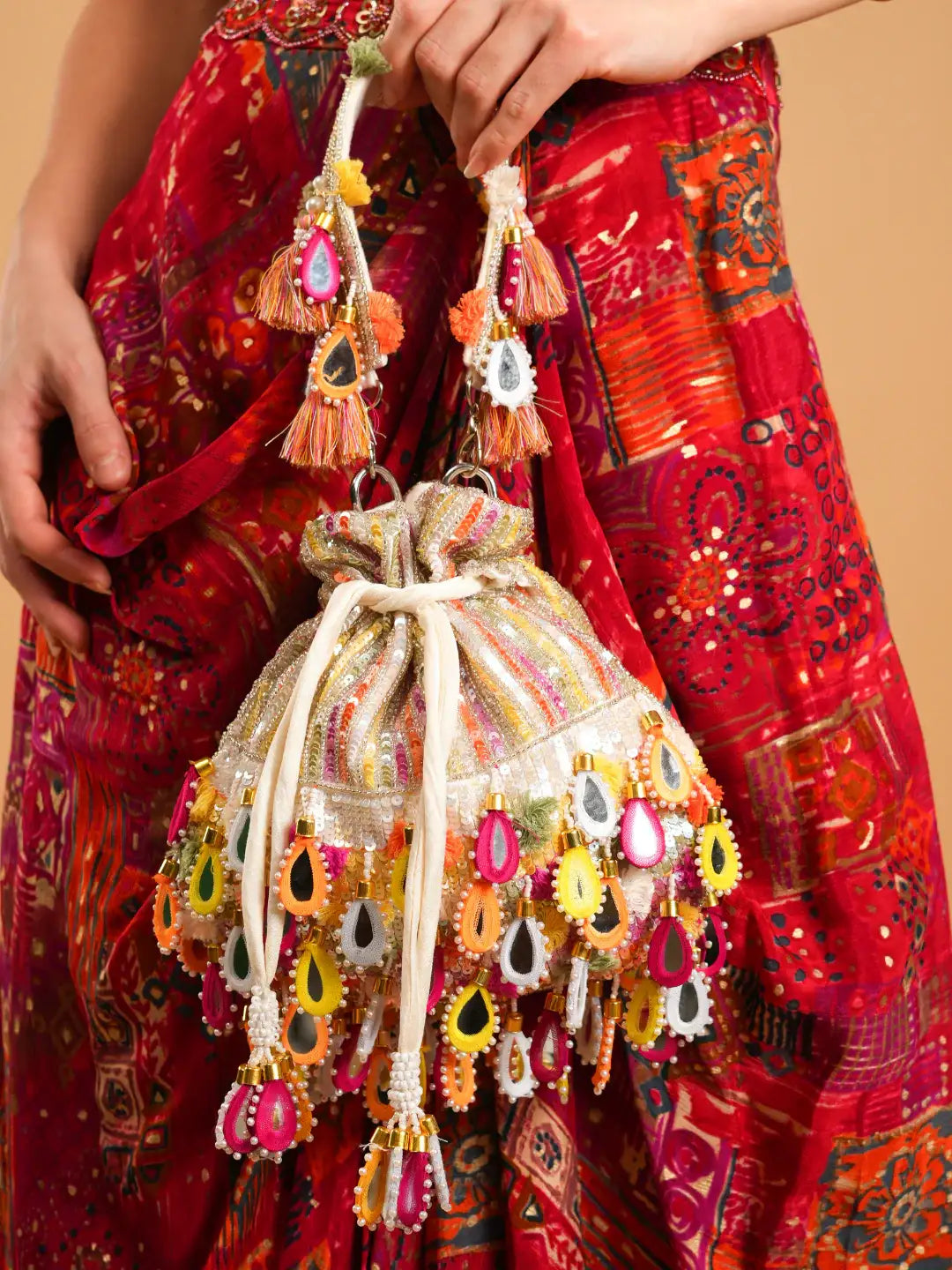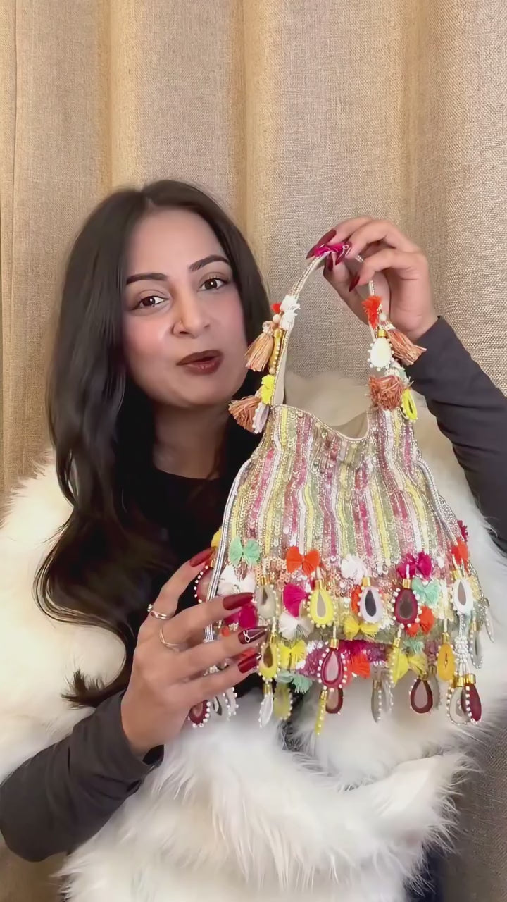 The chunky mirror drops and colorful accents make it the perfect statement accessory for festive events, haldi & mehendi ceremonies, sangeet nights, or any occasion where you want to shine bright. Its sturdy handle with tassel details adds to the charm while ensuring comfort and style.
