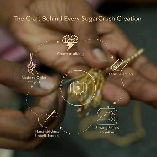 Every Sugarcrush bag is brought to life by skilled karigars who spend hours perfecting each detail. From carefully chosen materials to intricate handwork, nothing here is rushed. This isn’t mass production — it’s craftsmanship, patience, and passion stitched into every bag you carry.