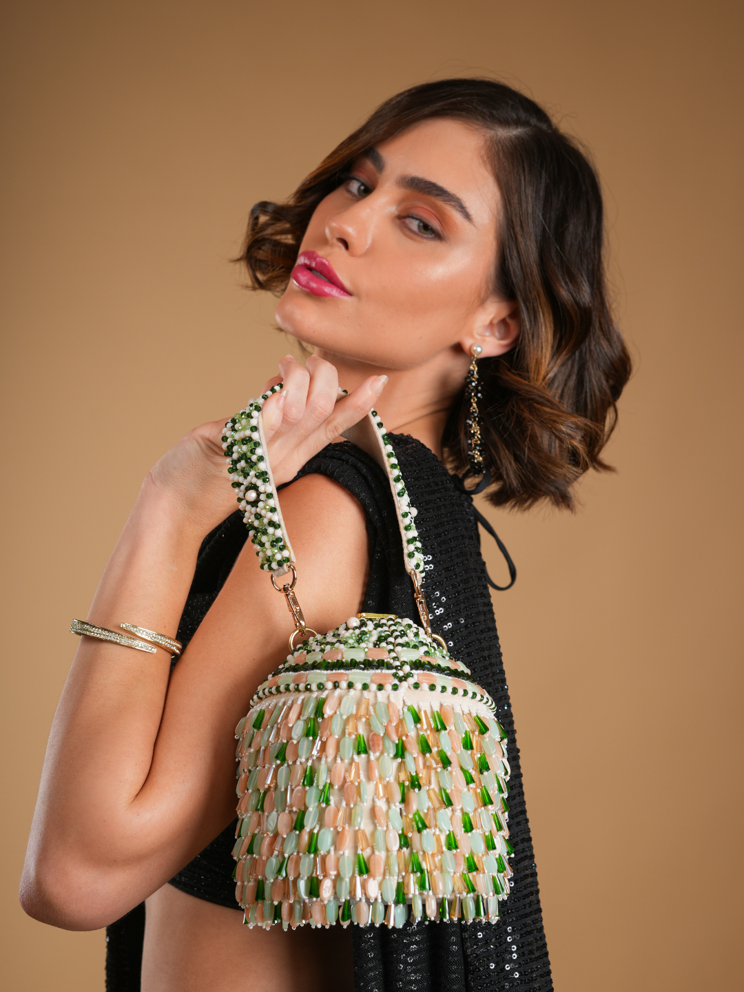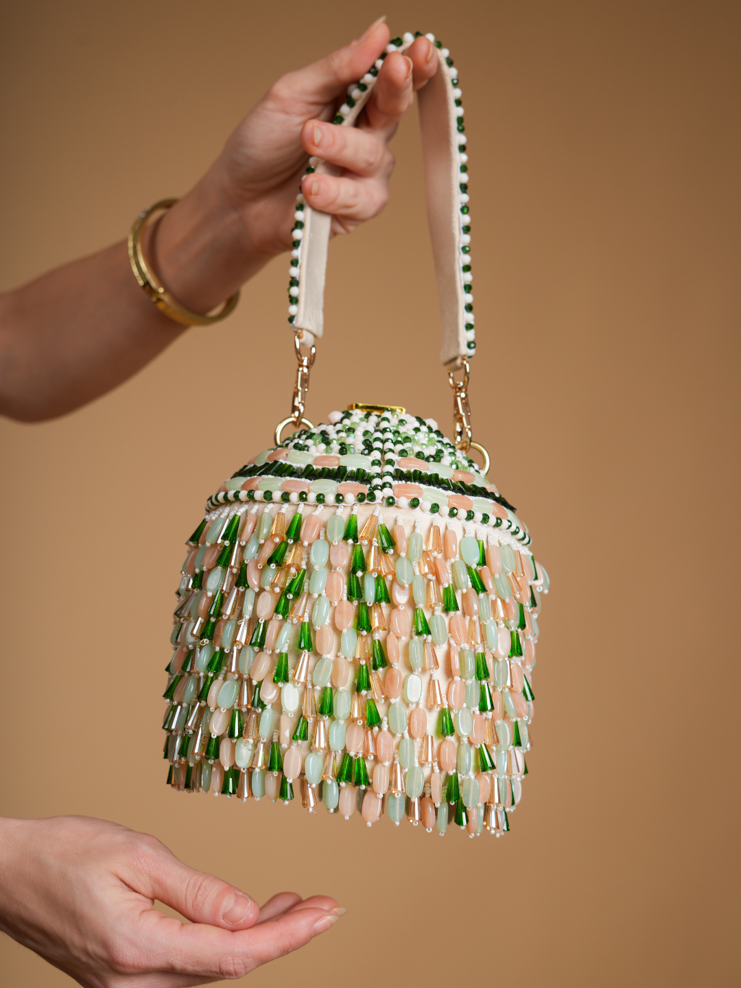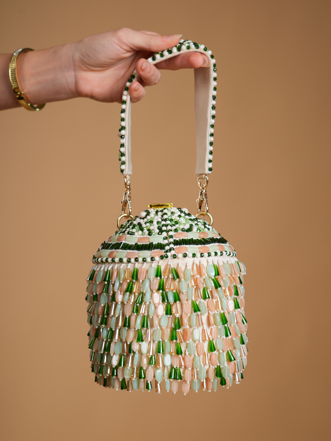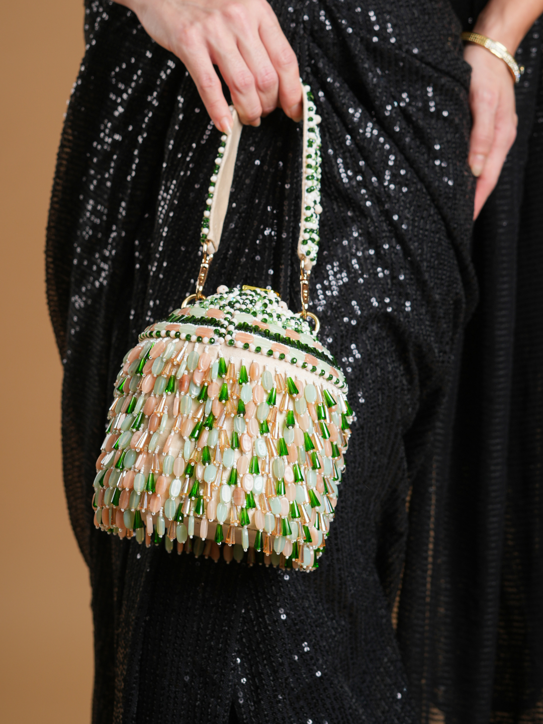 Turn heads wherever you go with this statement bucket bag, designed to add instant glamour to your party look. Hand-embellished with shimmering beads in soft pastel and emerald tones, this bag reflects light beautifully with every move.
