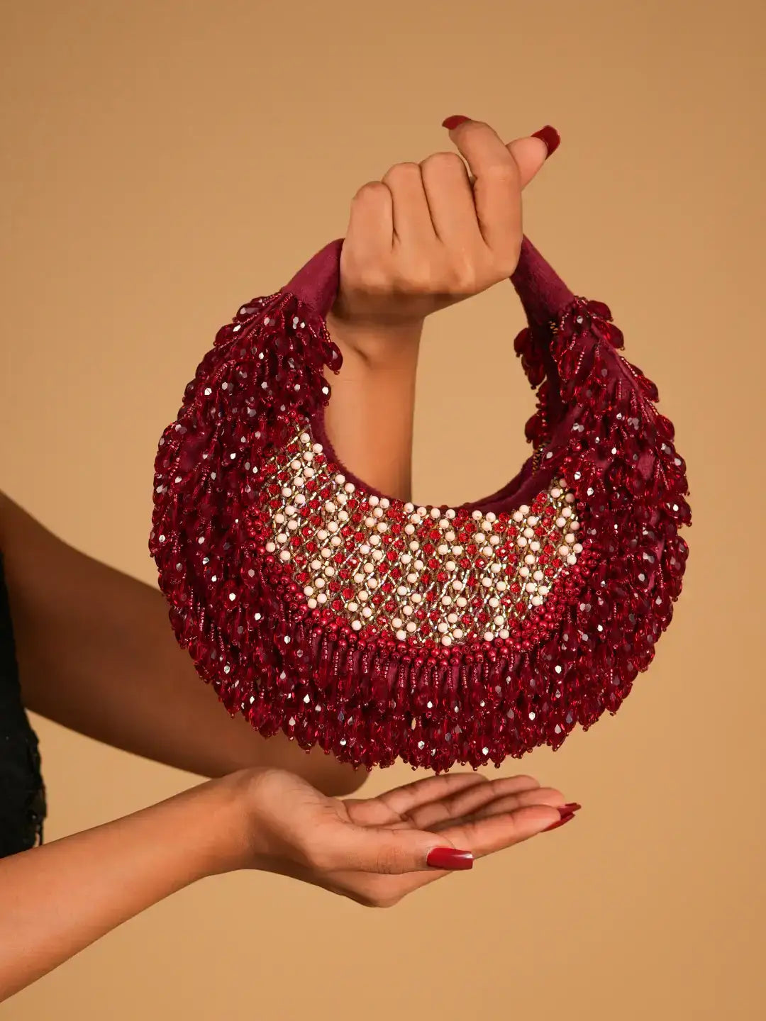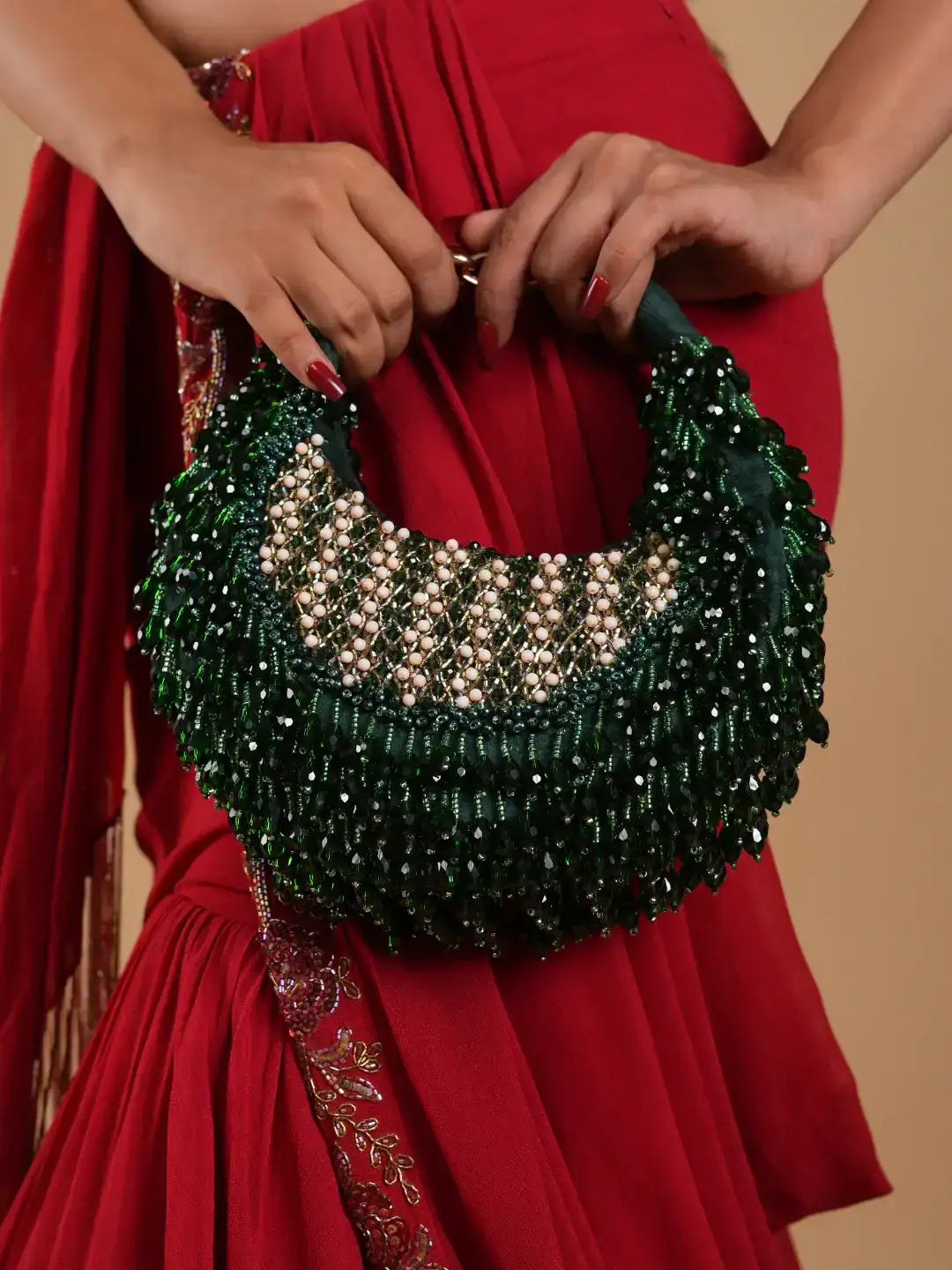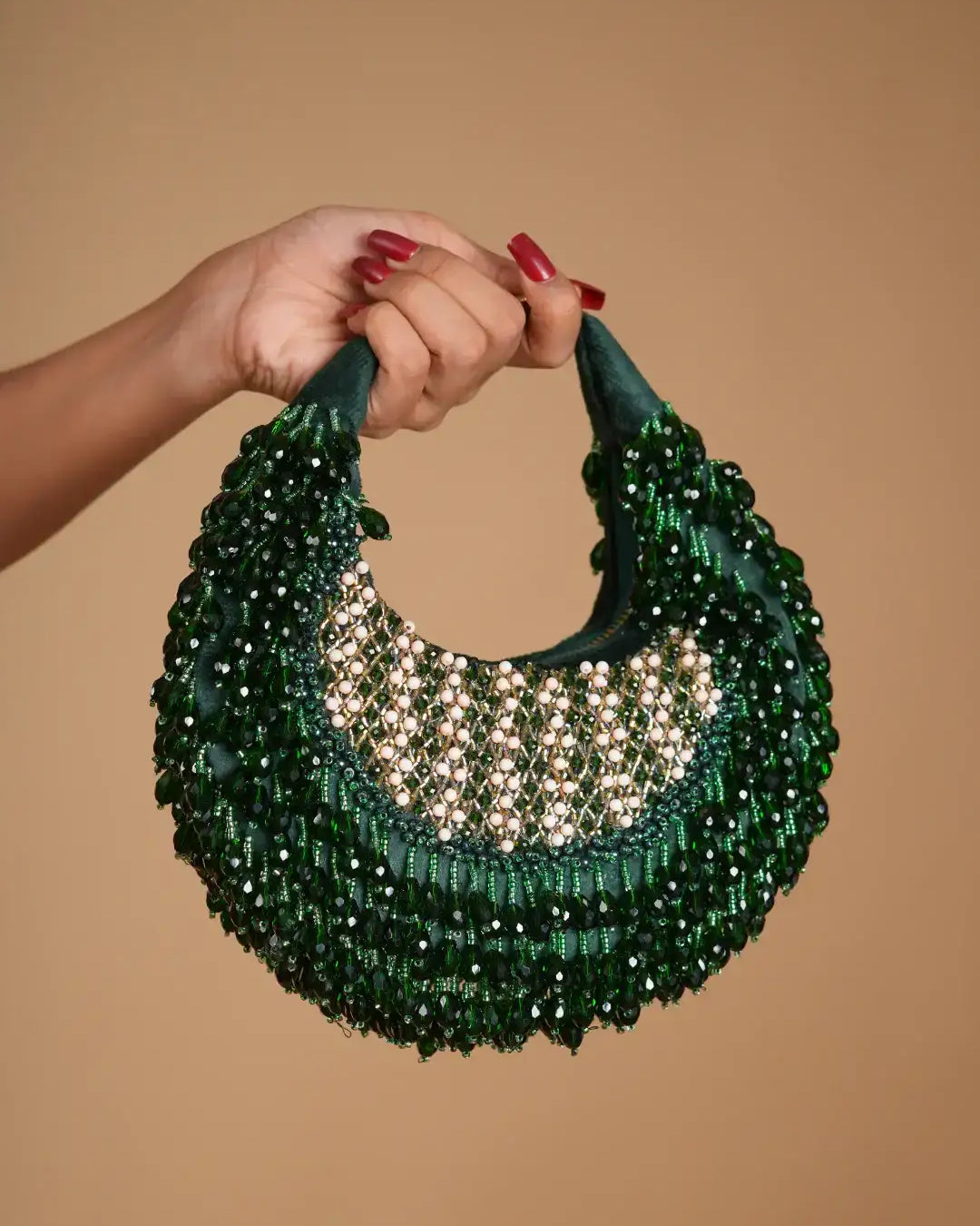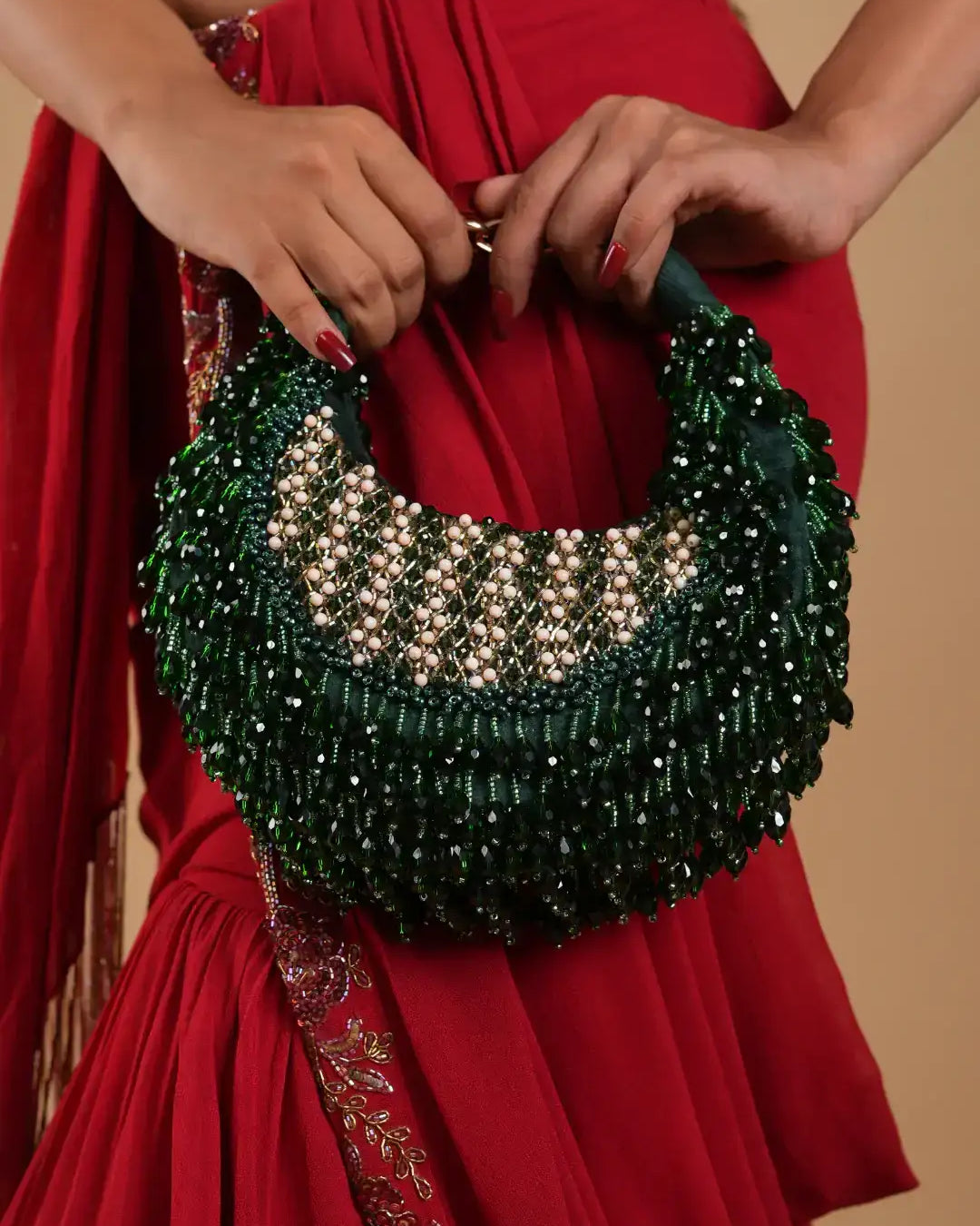 Add a touch of elegance to your ensemble with this stunning emerald pink beaded handbag. Designed in a chic crescent silhouette, this statement piece is intricately embellished with shimmering green beads, sequins, and delicate pearl accents, creating a rich texture that catches the light beautifully. The structured handle ensures comfort while carrying, making it the perfect accessory for weddings, festive occasions, or glamorous evenings out.