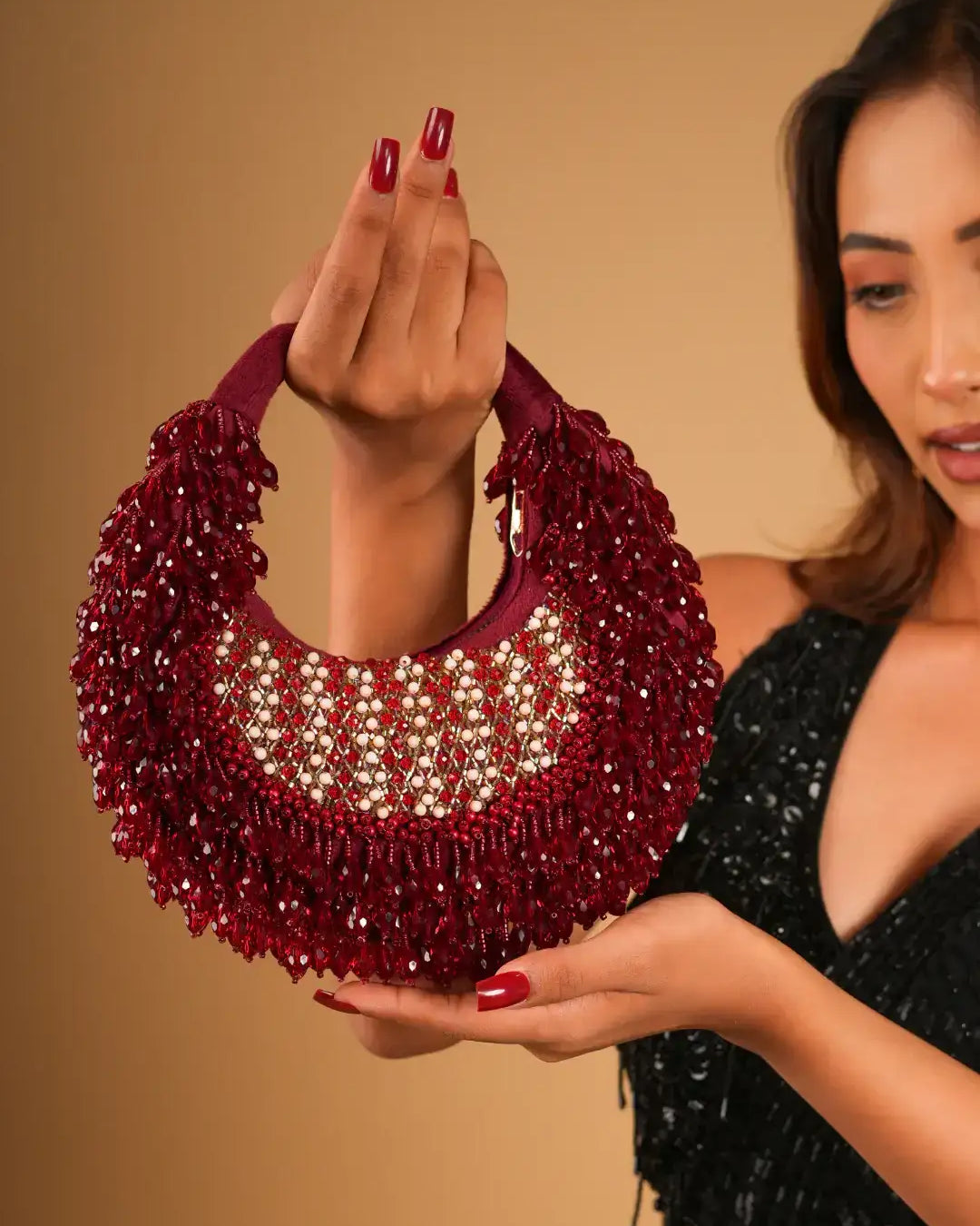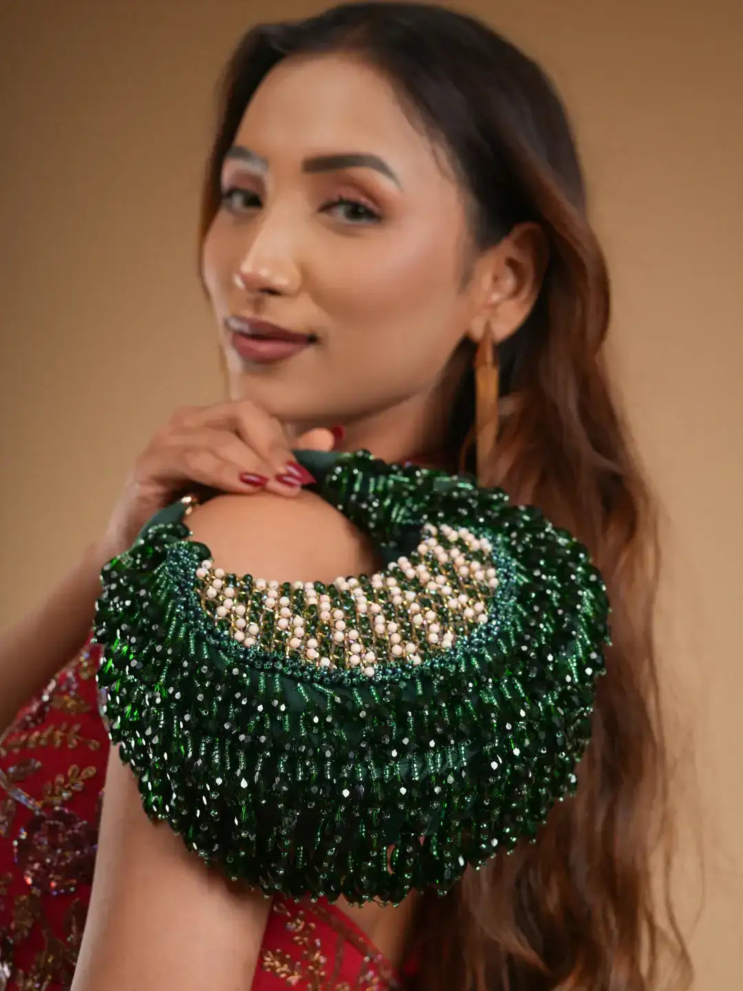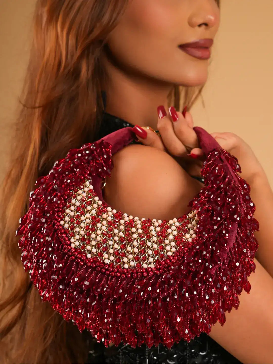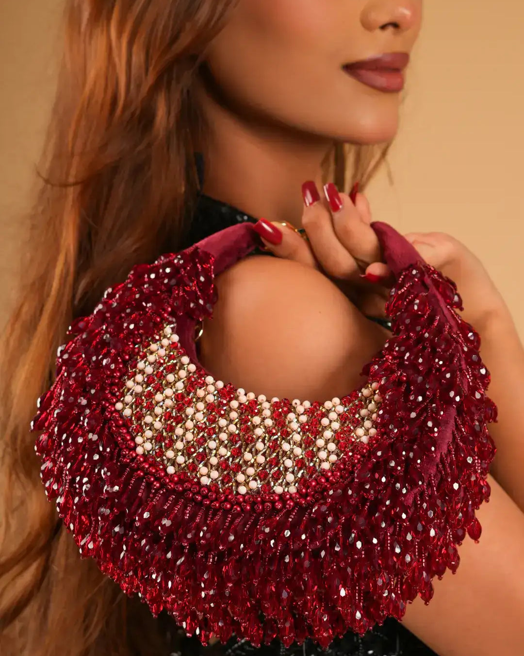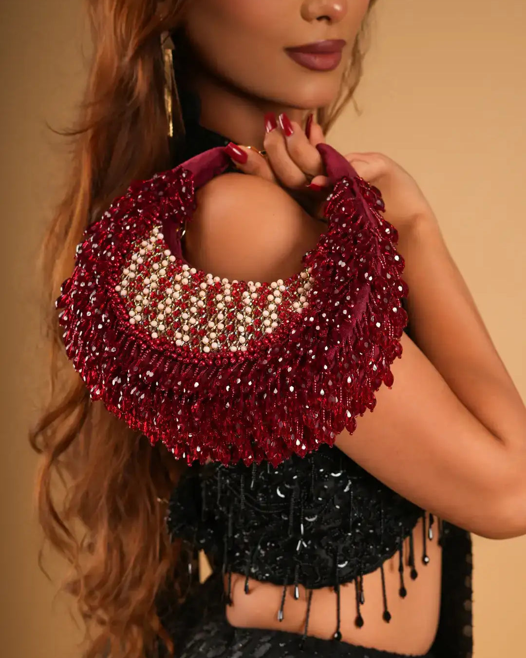 Add a touch of elegance to your ensemble with this stunning emerald pink beaded handbag. Designed in a chic crescent silhouette, this statement piece is intricately embellished with shimmering green beads, sequins, and delicate pearl accents, creating a rich texture that catches the light beautifully. The structured handle ensures comfort while carrying, making it the perfect accessory for weddings, festive occasions, or glamorous evenings out.