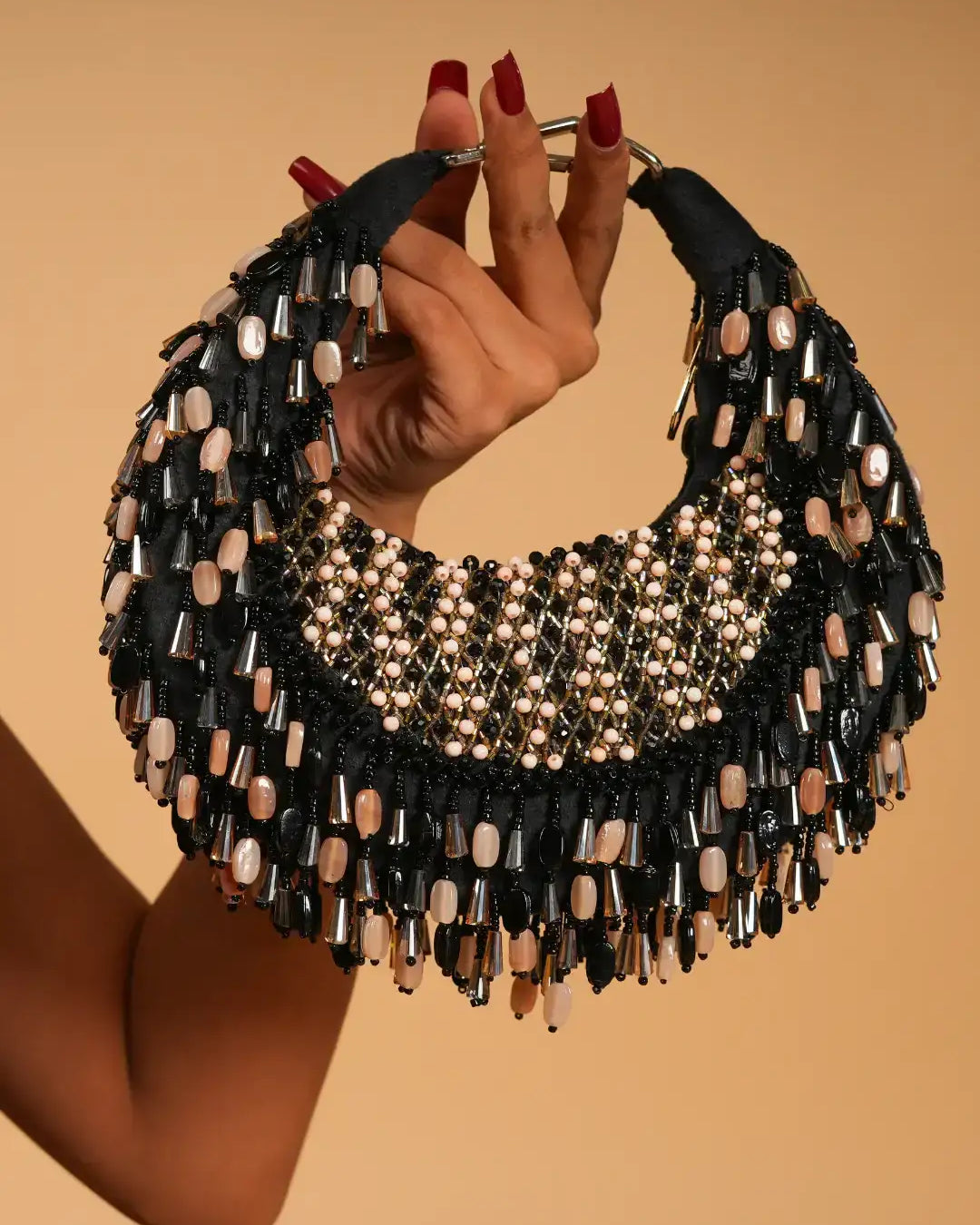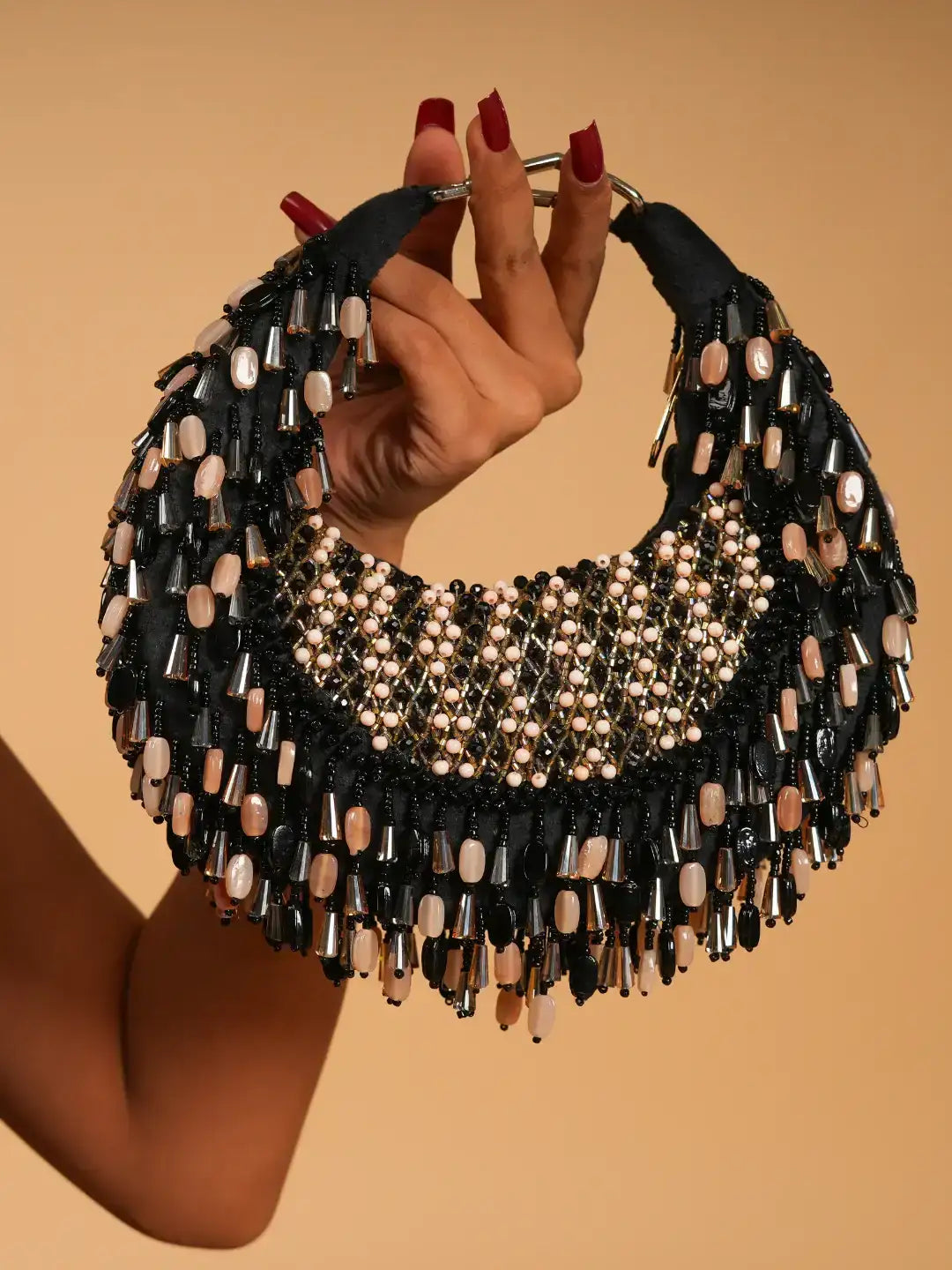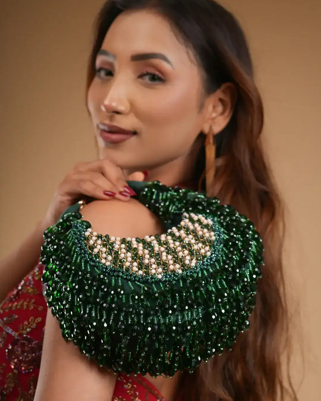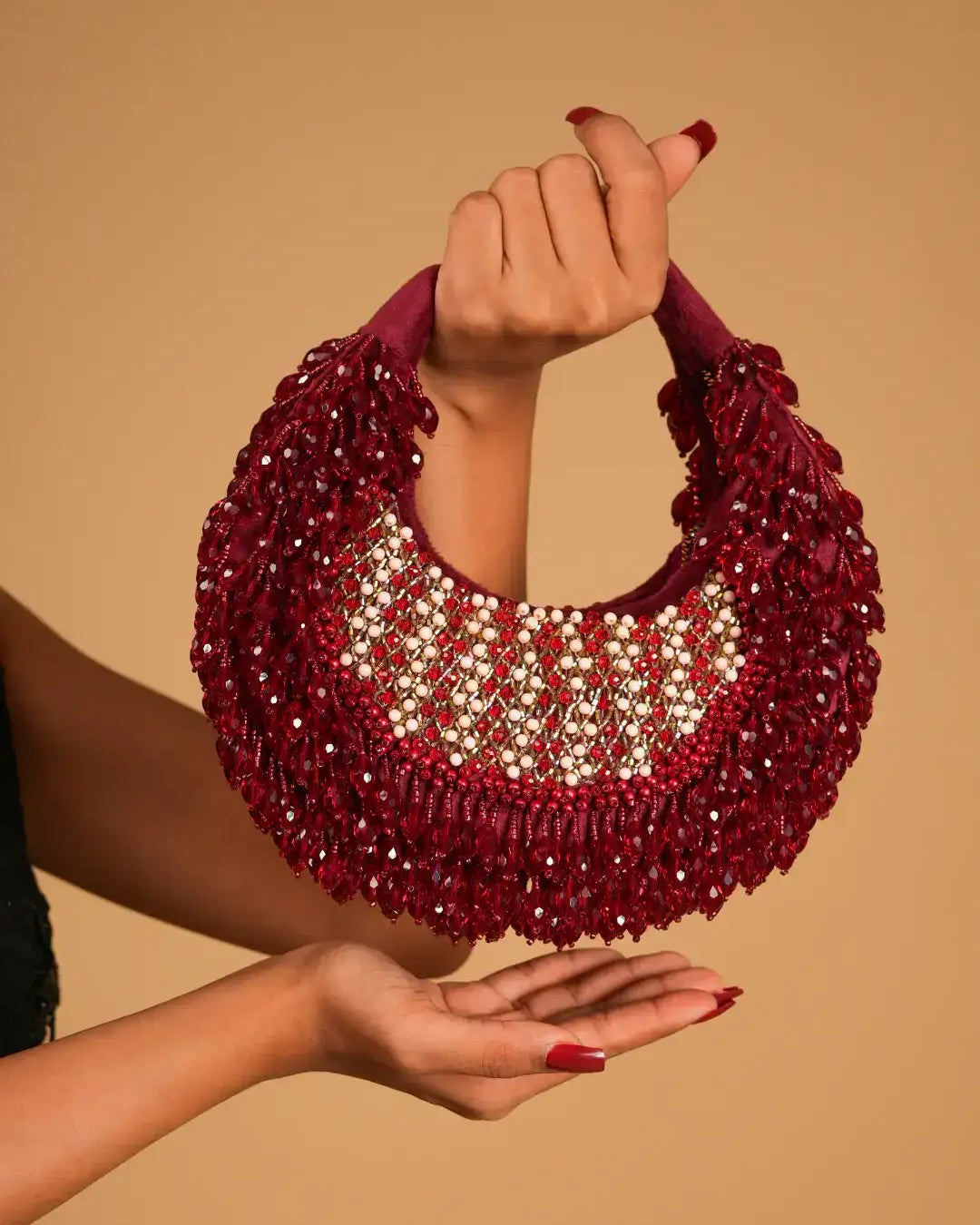 Add a touch of elegance to your ensemble with this stunning emerald pink beaded handbag. Designed in a chic crescent silhouette, this statement piece is intricately embellished with shimmering green beads, sequins, and delicate pearl accents, creating a rich texture that catches the light beautifully. The structured handle ensures comfort while carrying, making it the perfect accessory for weddings, festive occasions, or glamorous evenings out.