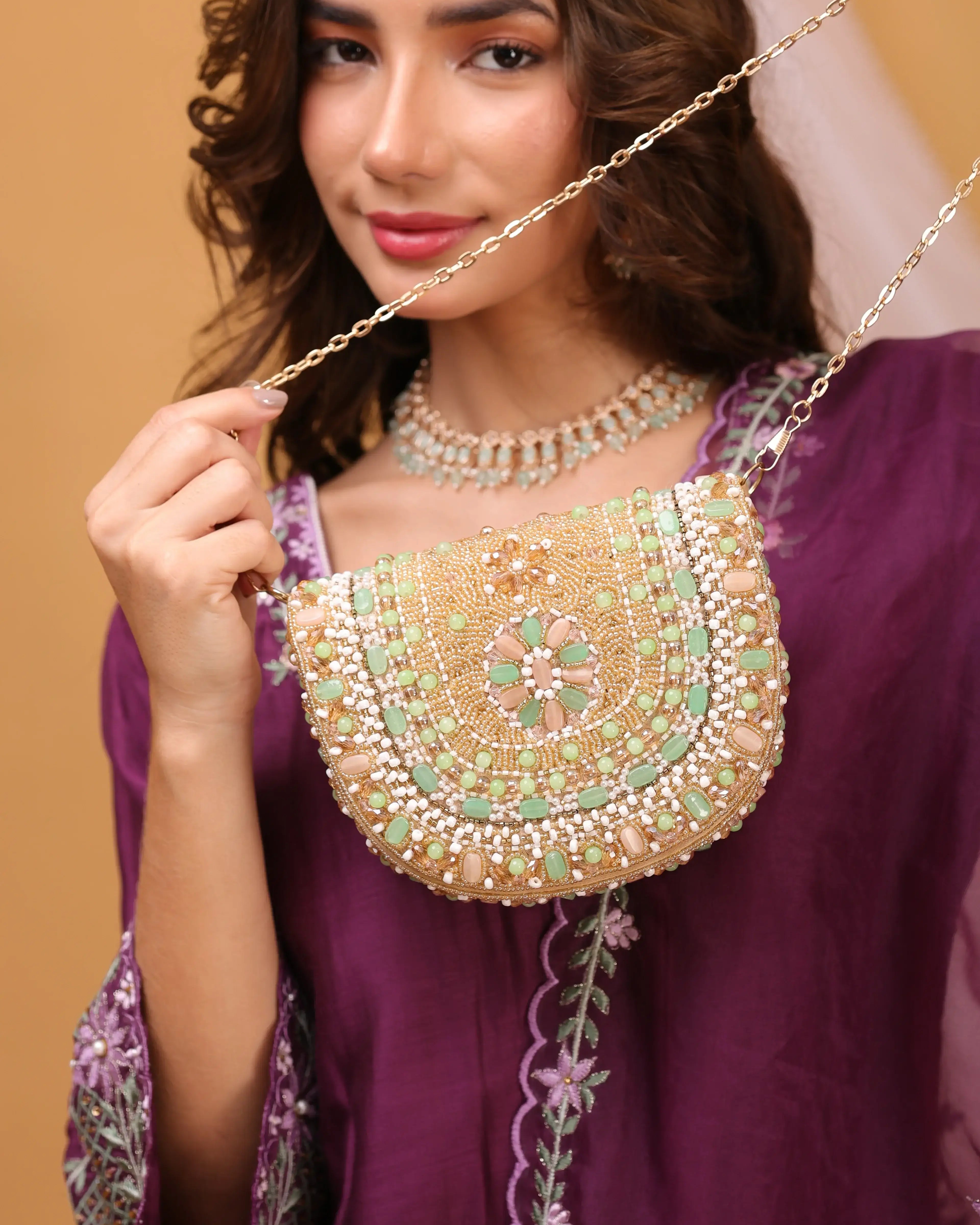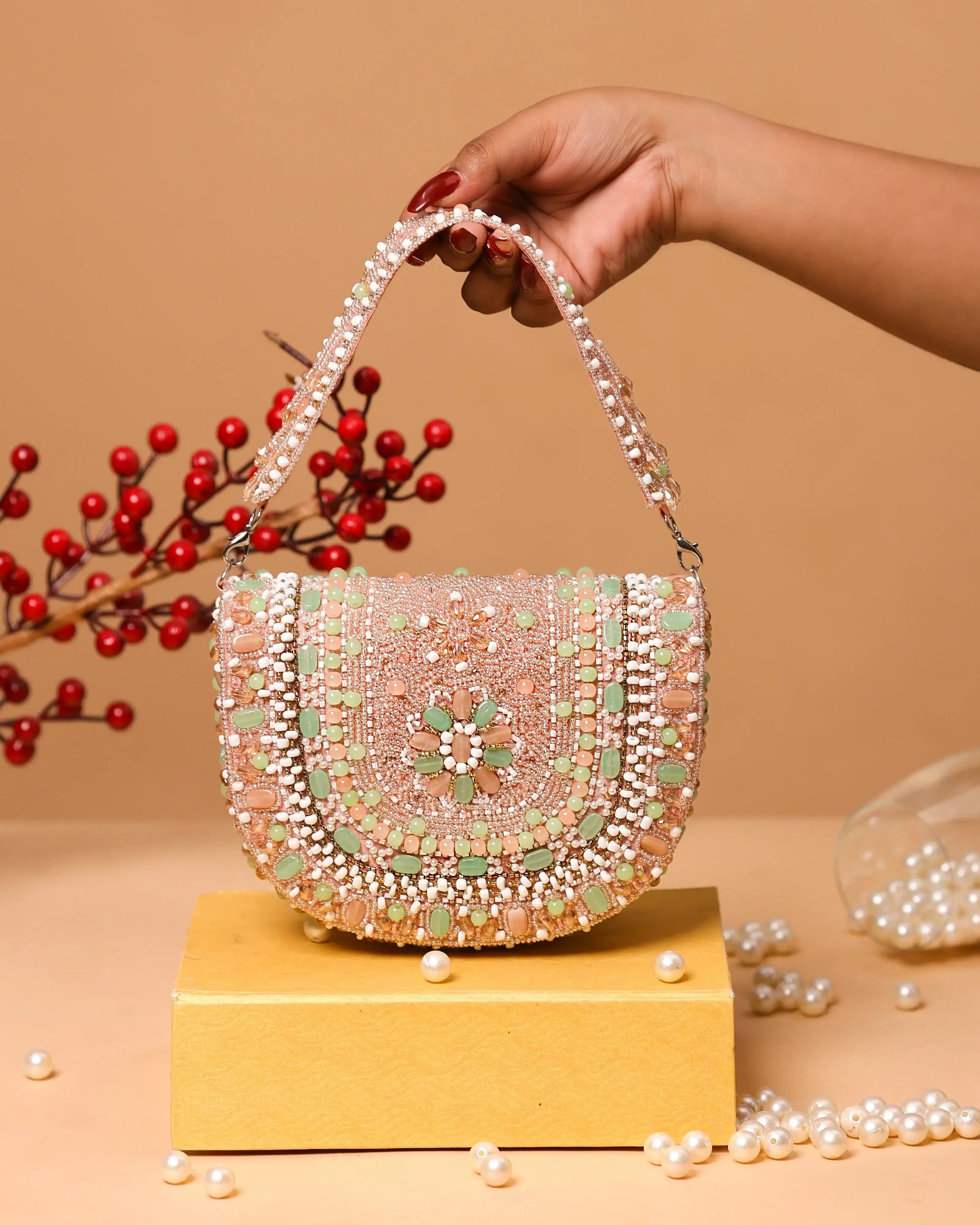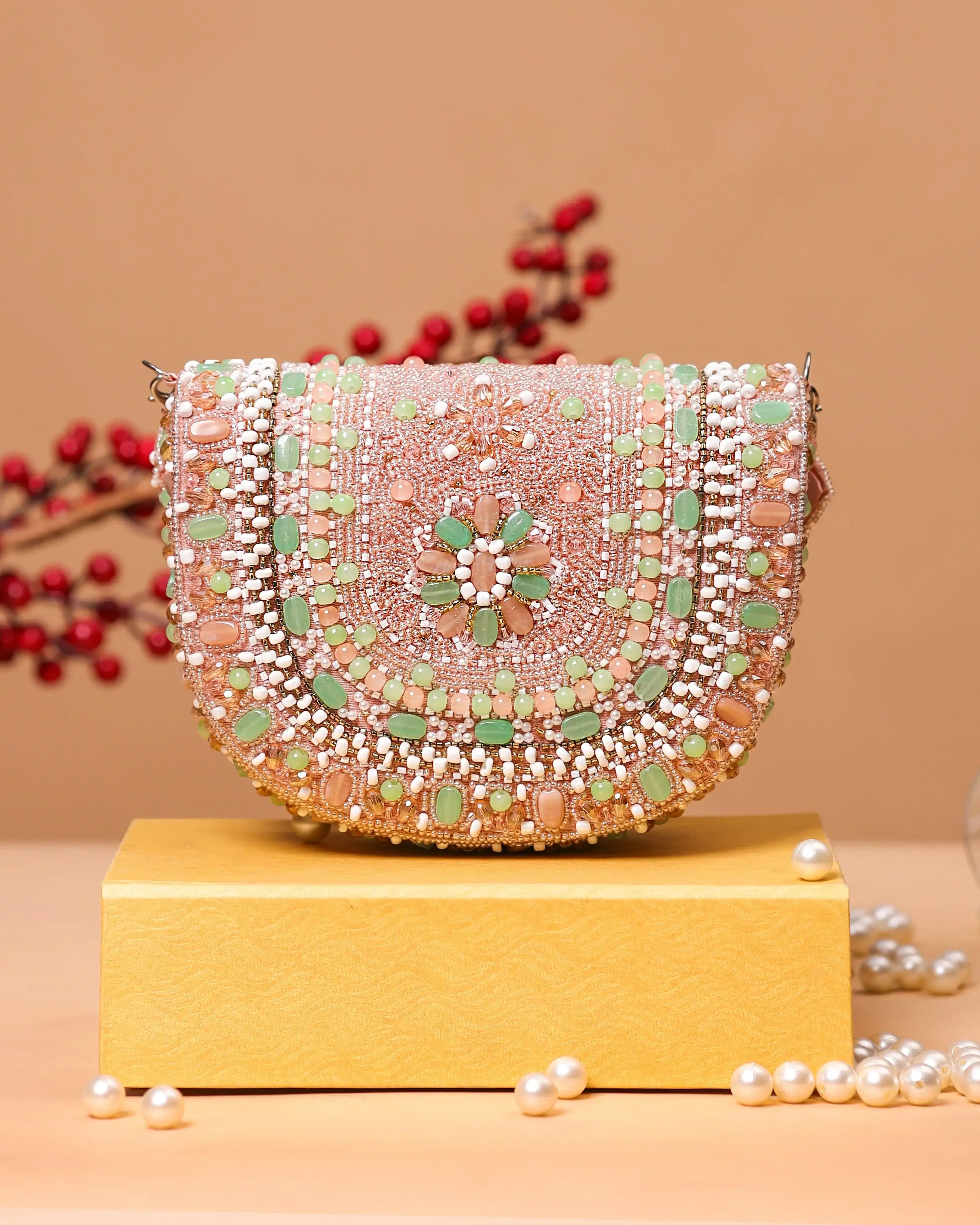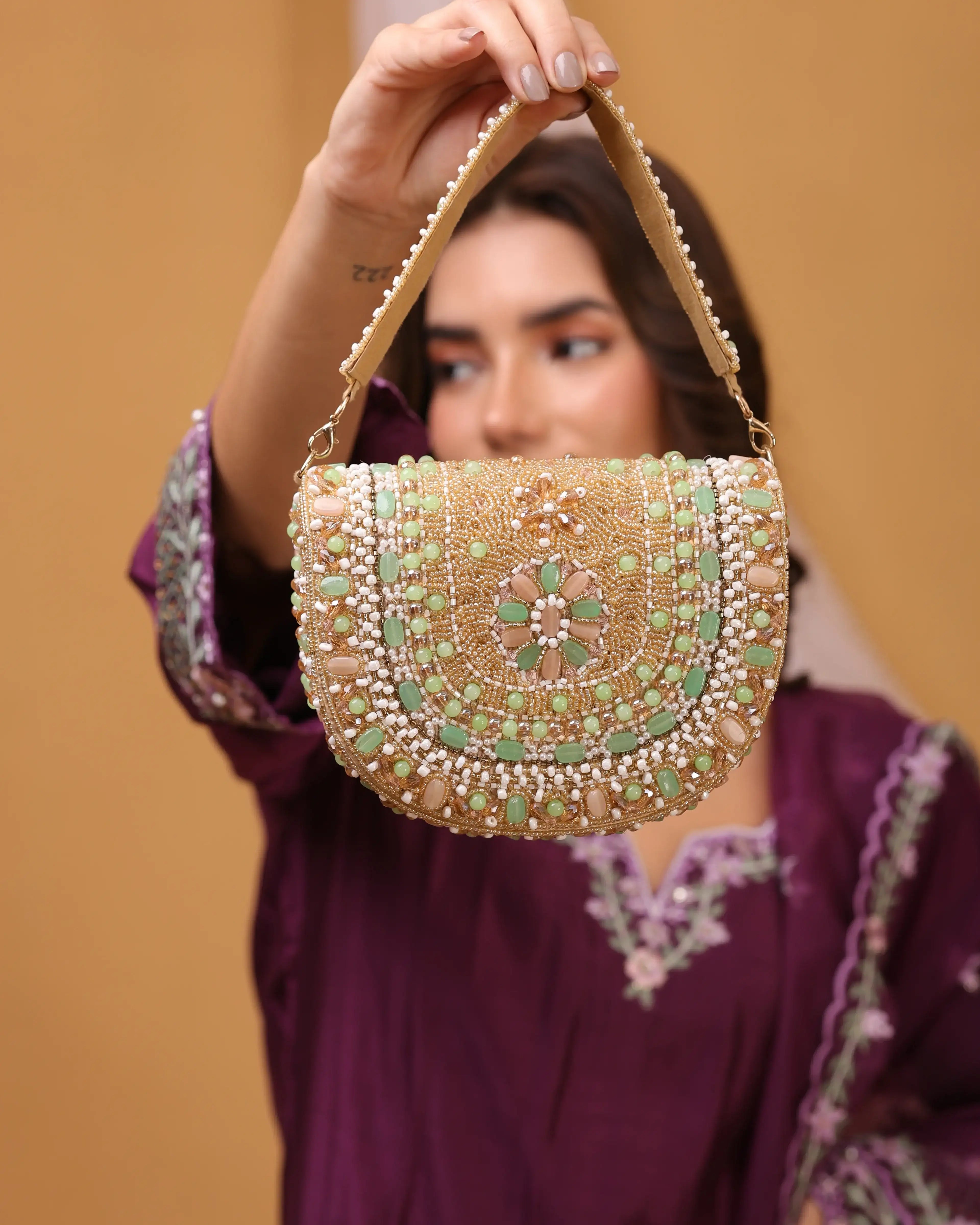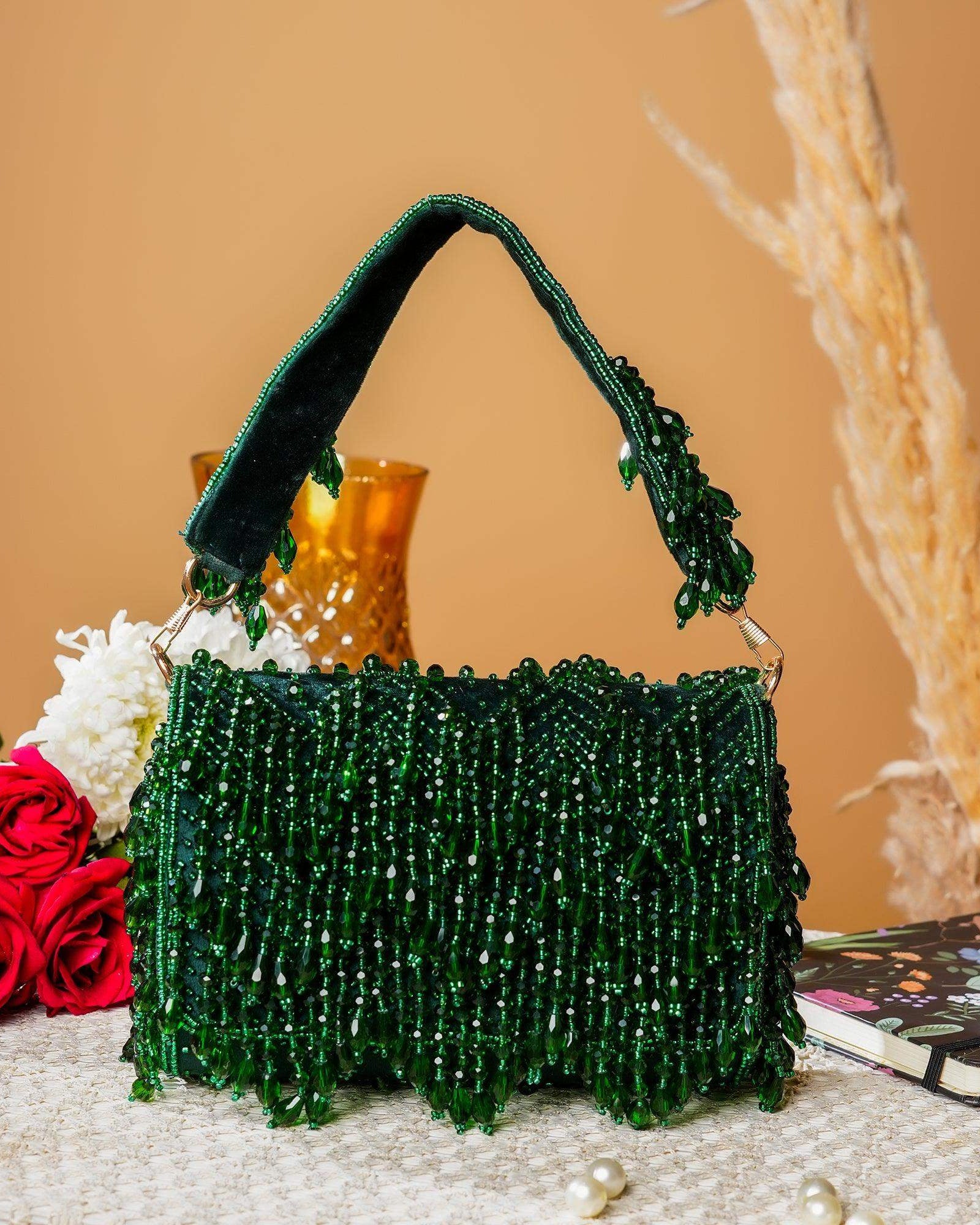 Add a touch of elegance to your ensemble with this stunning emerald pink beaded handbag. Designed in a chic crescent silhouette, this statement piece is intricately embellished with shimmering green beads, sequins, and delicate pearl accents, creating a rich texture that catches the light beautifully. The structured handle ensures comfort while carrying, making it the perfect accessory for weddings, festive occasions, or glamorous evenings out.