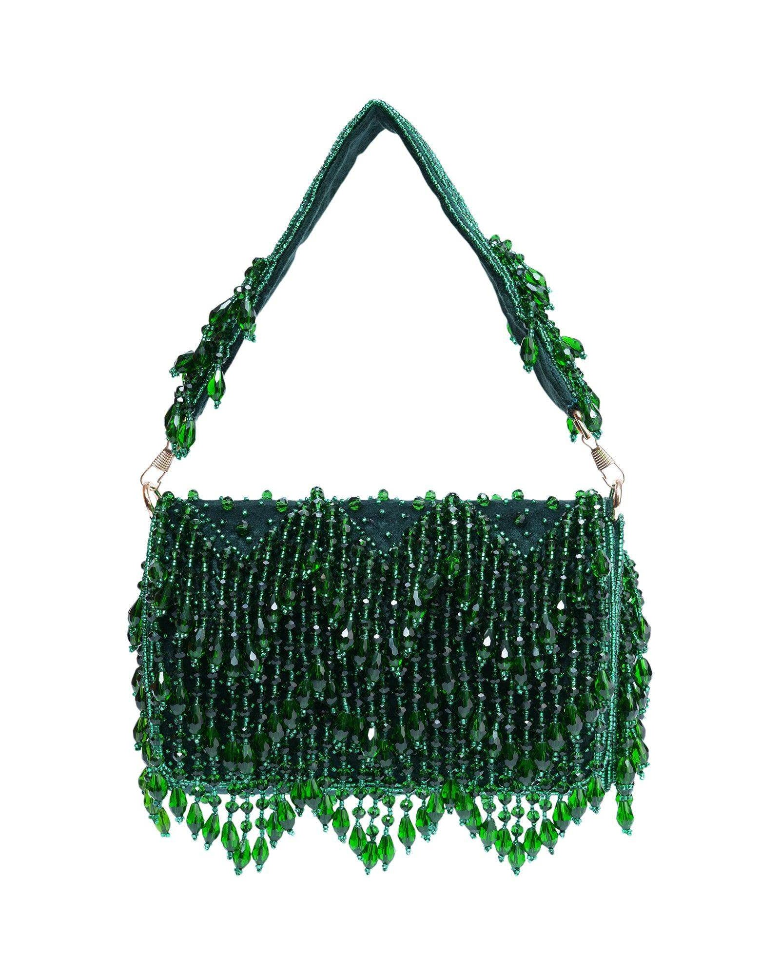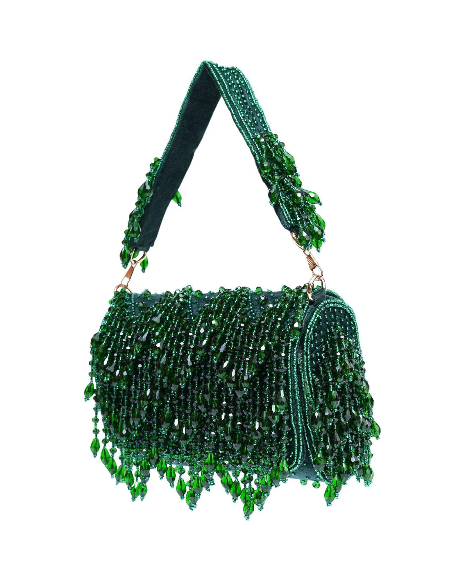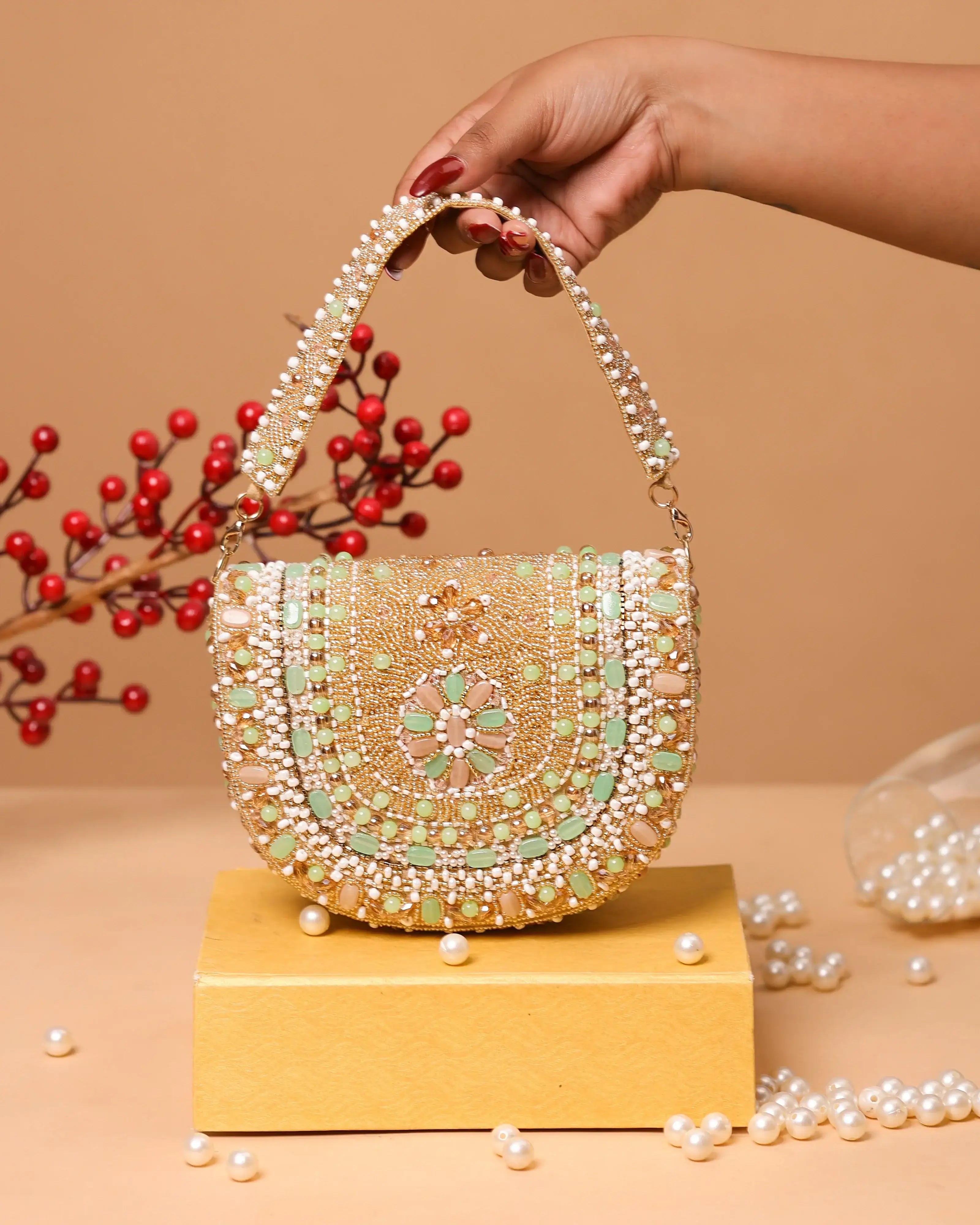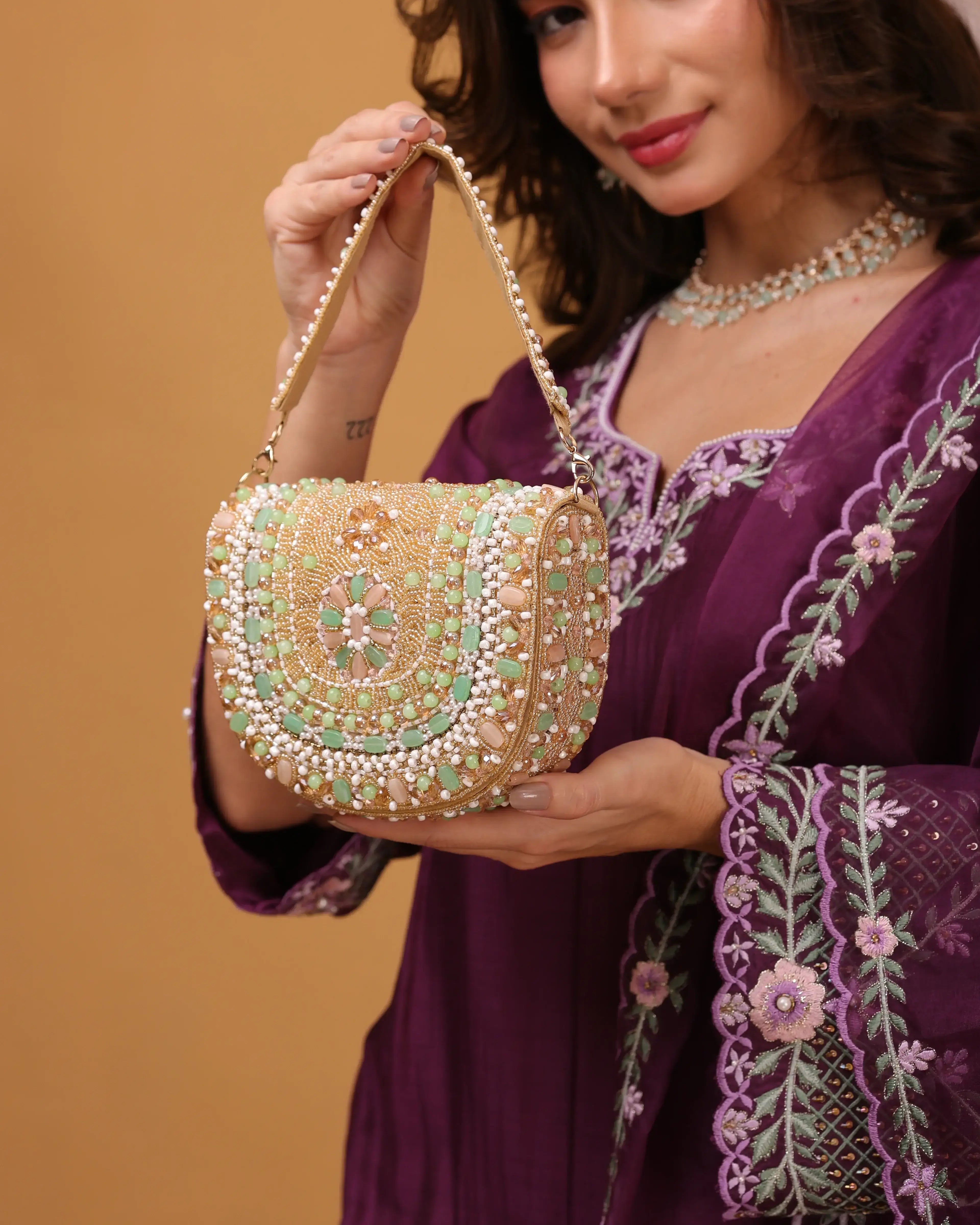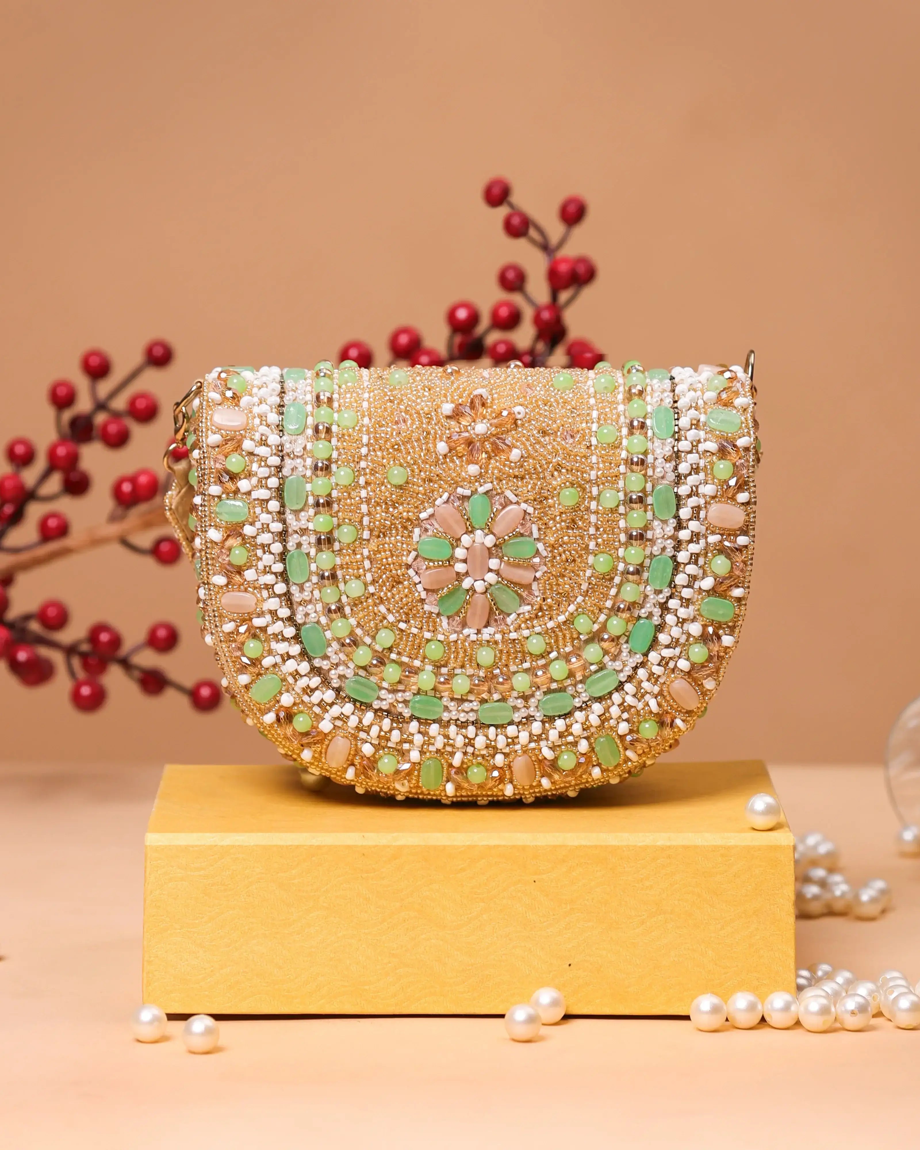 Add a touch of elegance to your ensemble with this stunning emerald pink beaded handbag. Designed in a chic crescent silhouette, this statement piece is intricately embellished with shimmering green beads, sequins, and delicate pearl accents, creating a rich texture that catches the light beautifully. The structured handle ensures comfort while carrying, making it the perfect accessory for weddings, festive occasions, or glamorous evenings out.