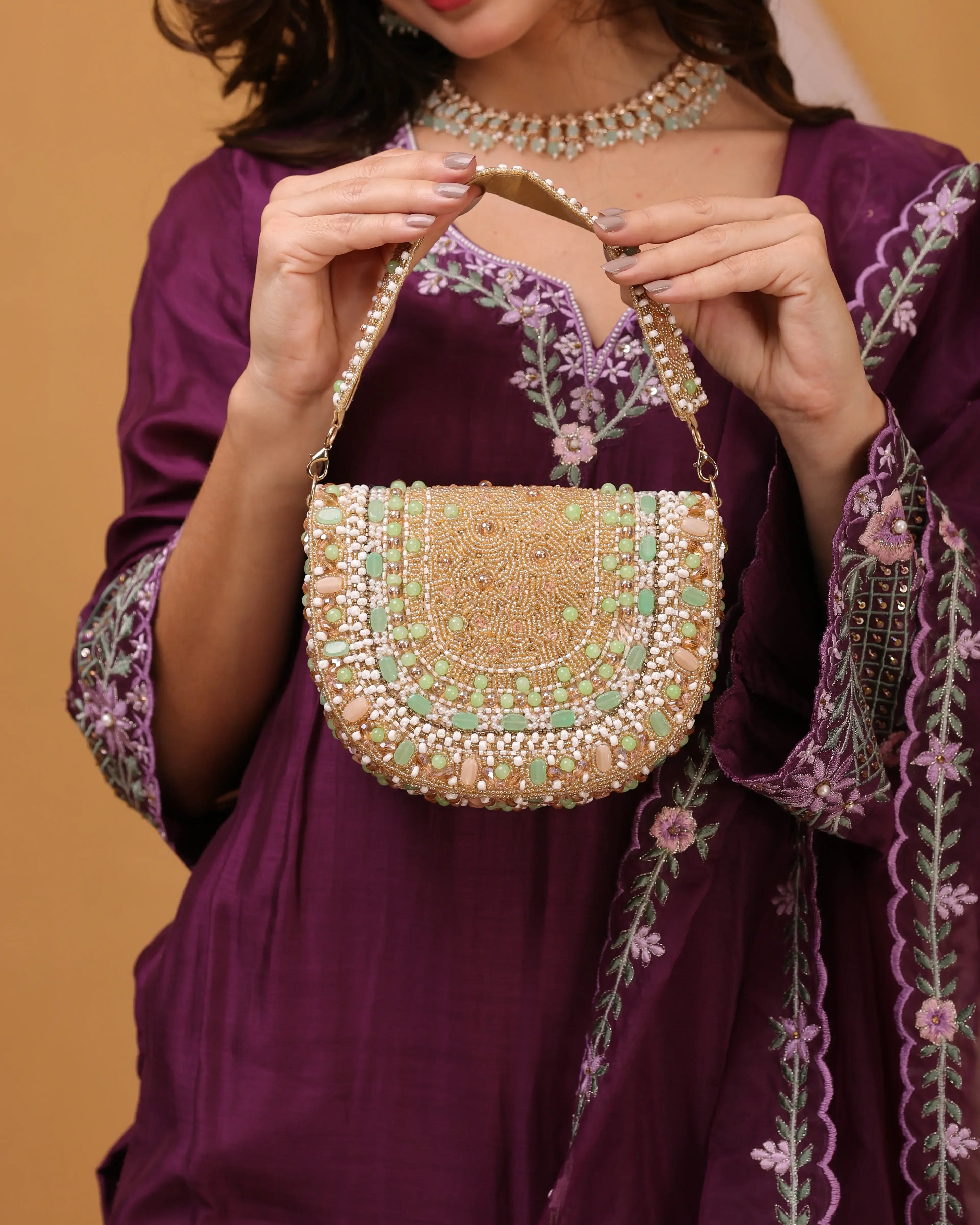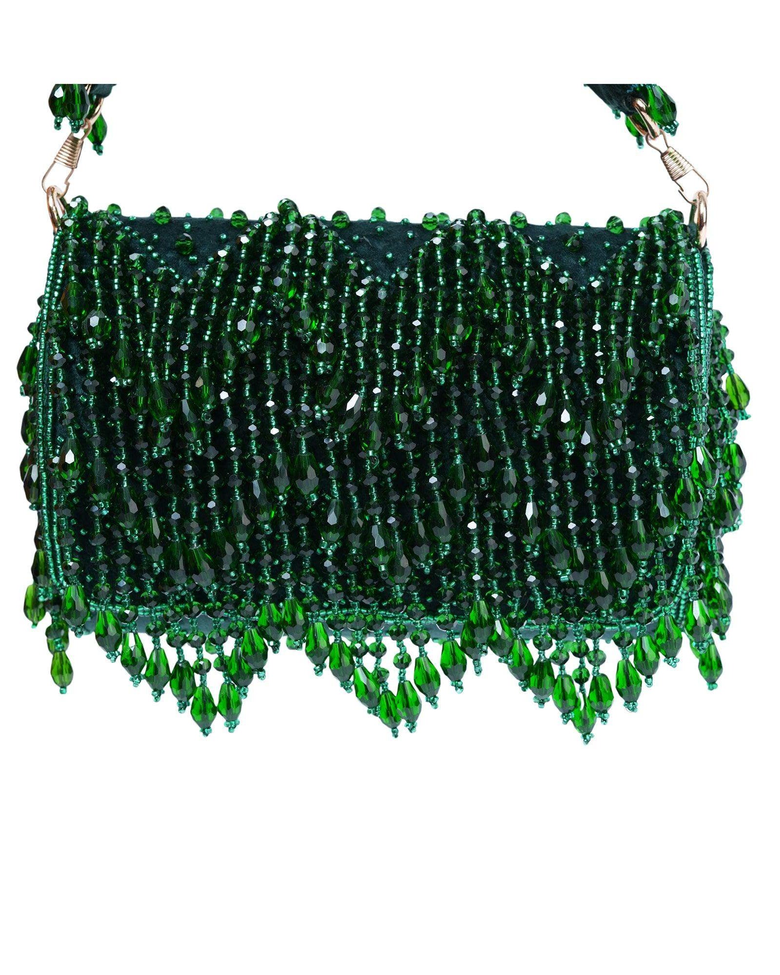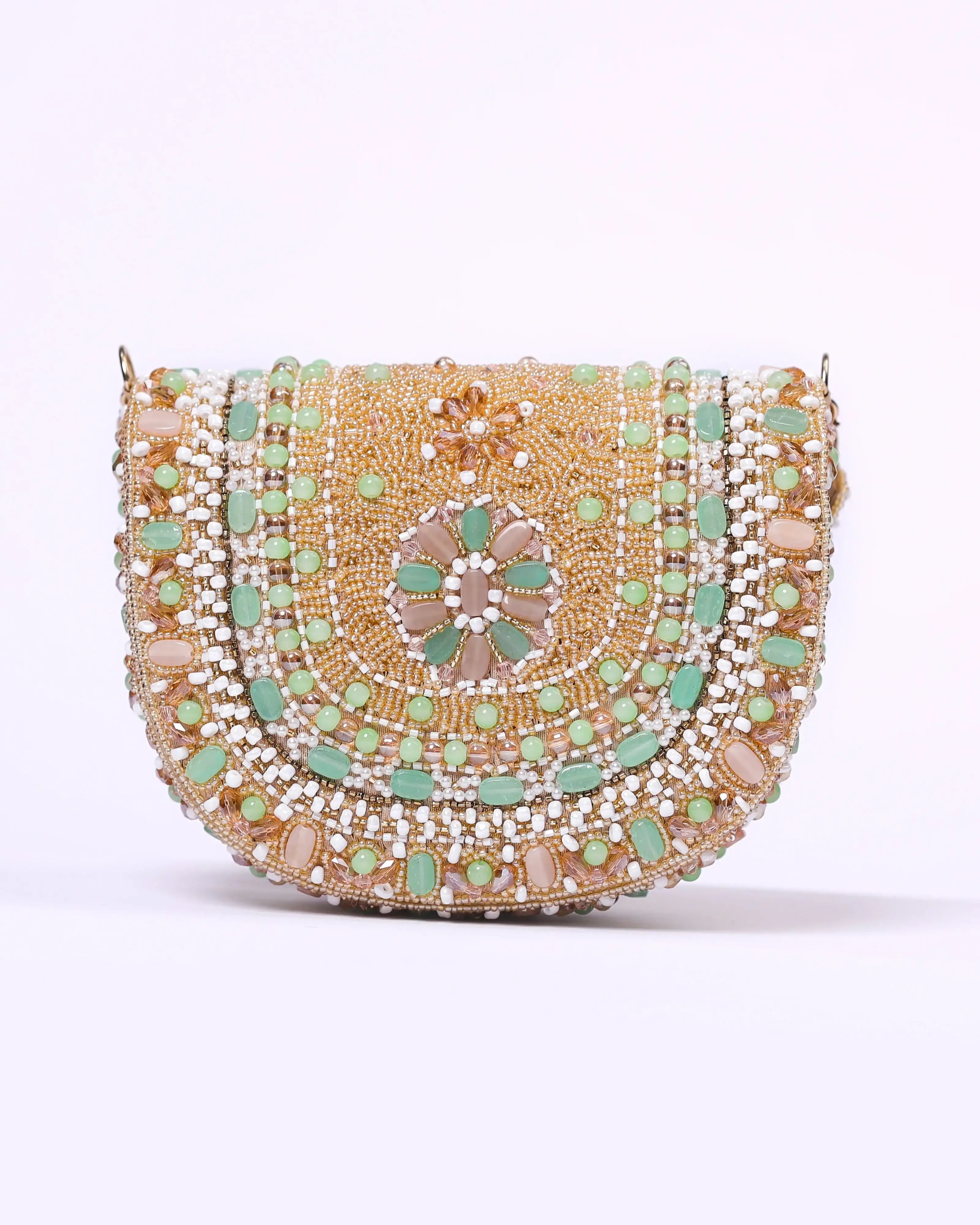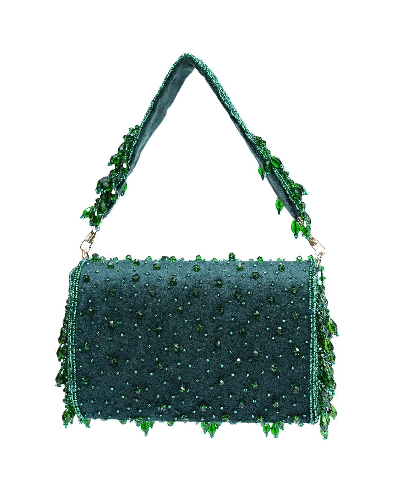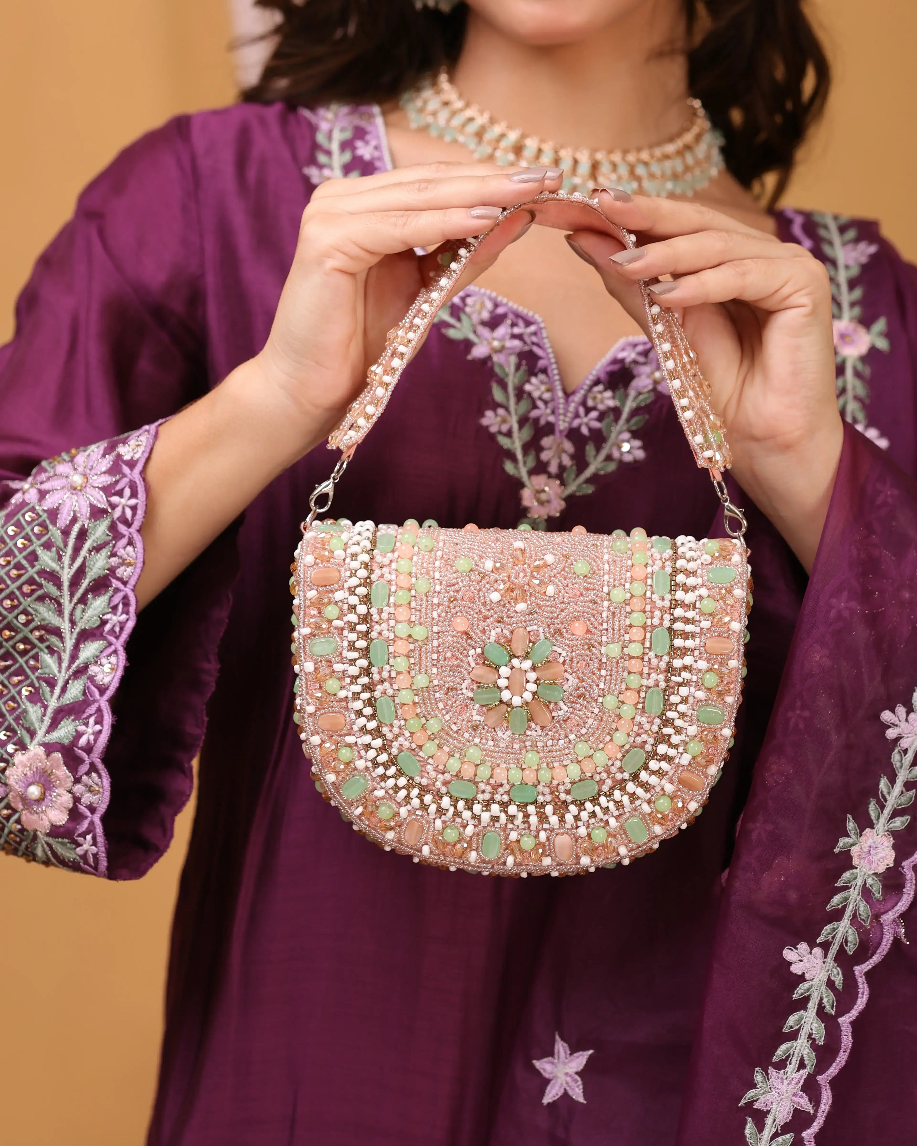 Add a touch of elegance to your ensemble with this stunning emerald pink beaded handbag. Designed in a chic crescent silhouette, this statement piece is intricately embellished with shimmering green beads, sequins, and delicate pearl accents, creating a rich texture that catches the light beautifully. The structured handle ensures comfort while carrying, making it the perfect accessory for weddings, festive occasions, or glamorous evenings out.