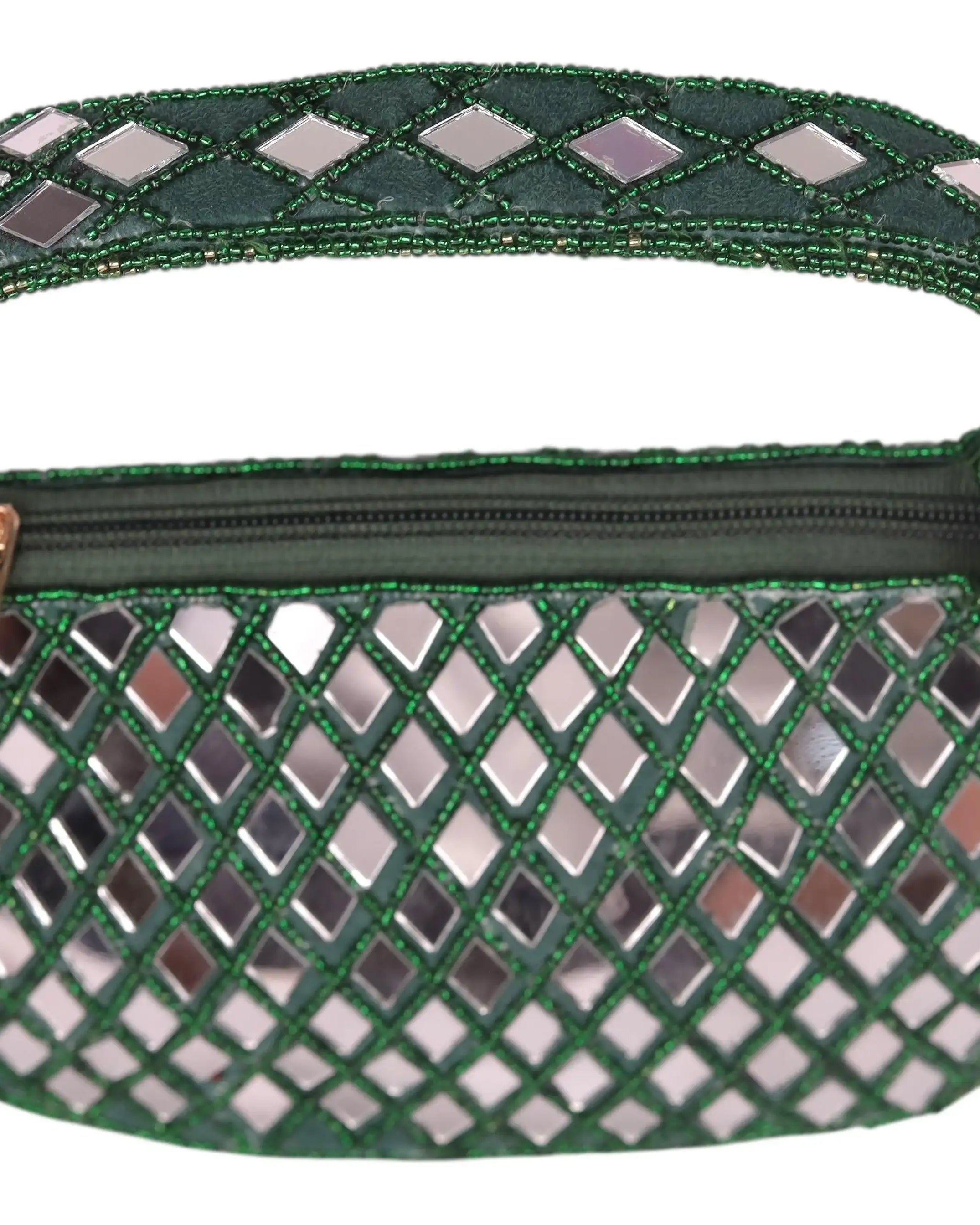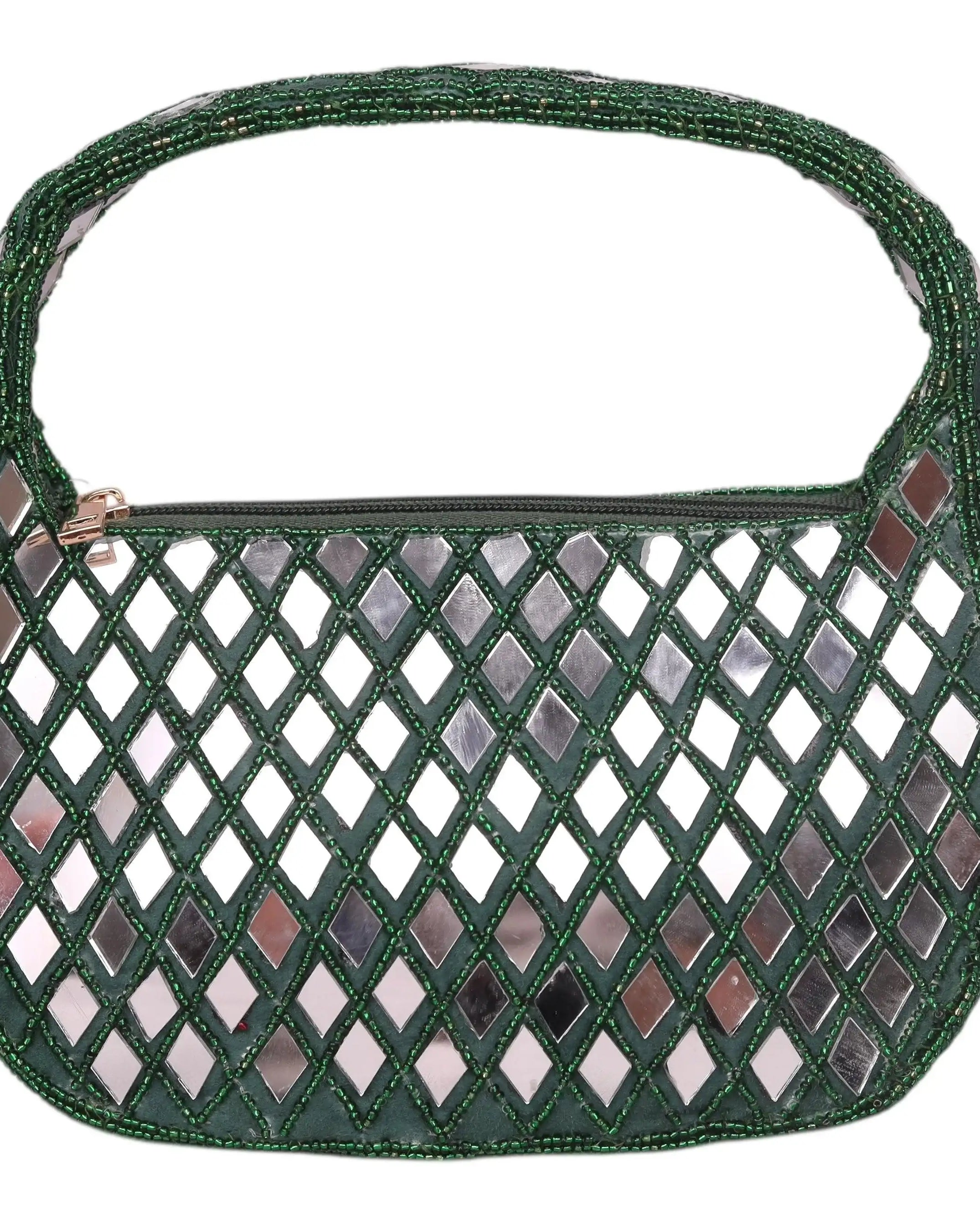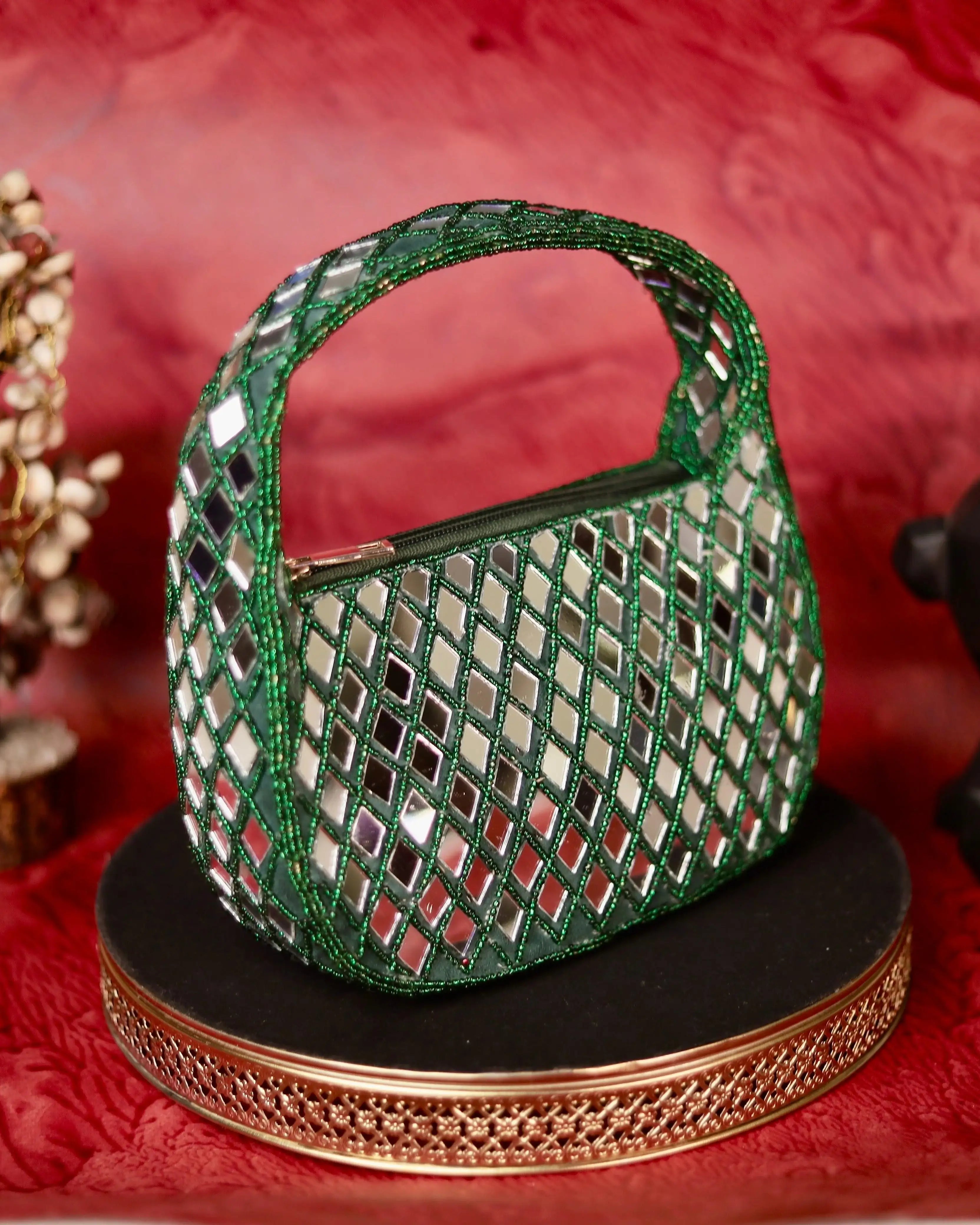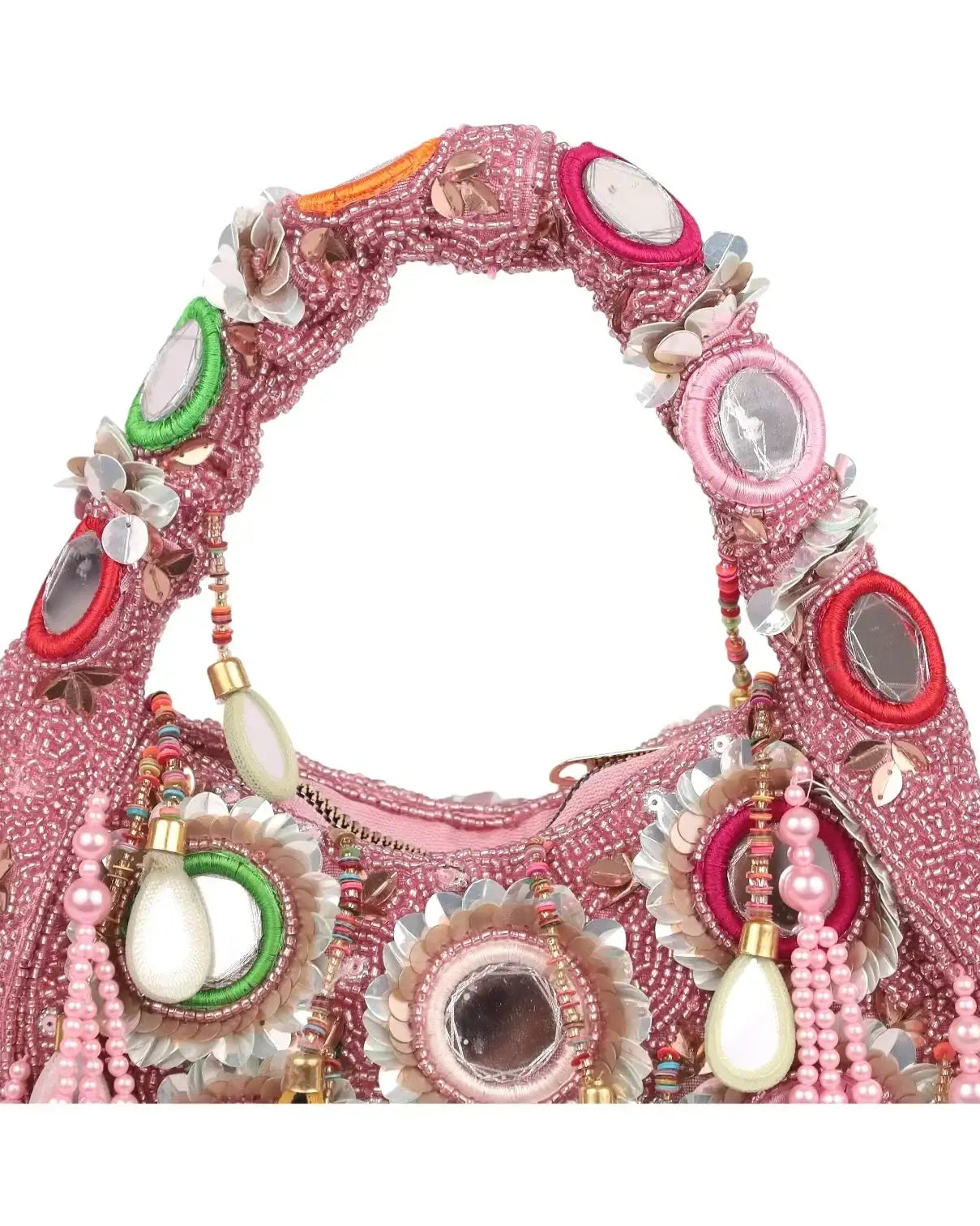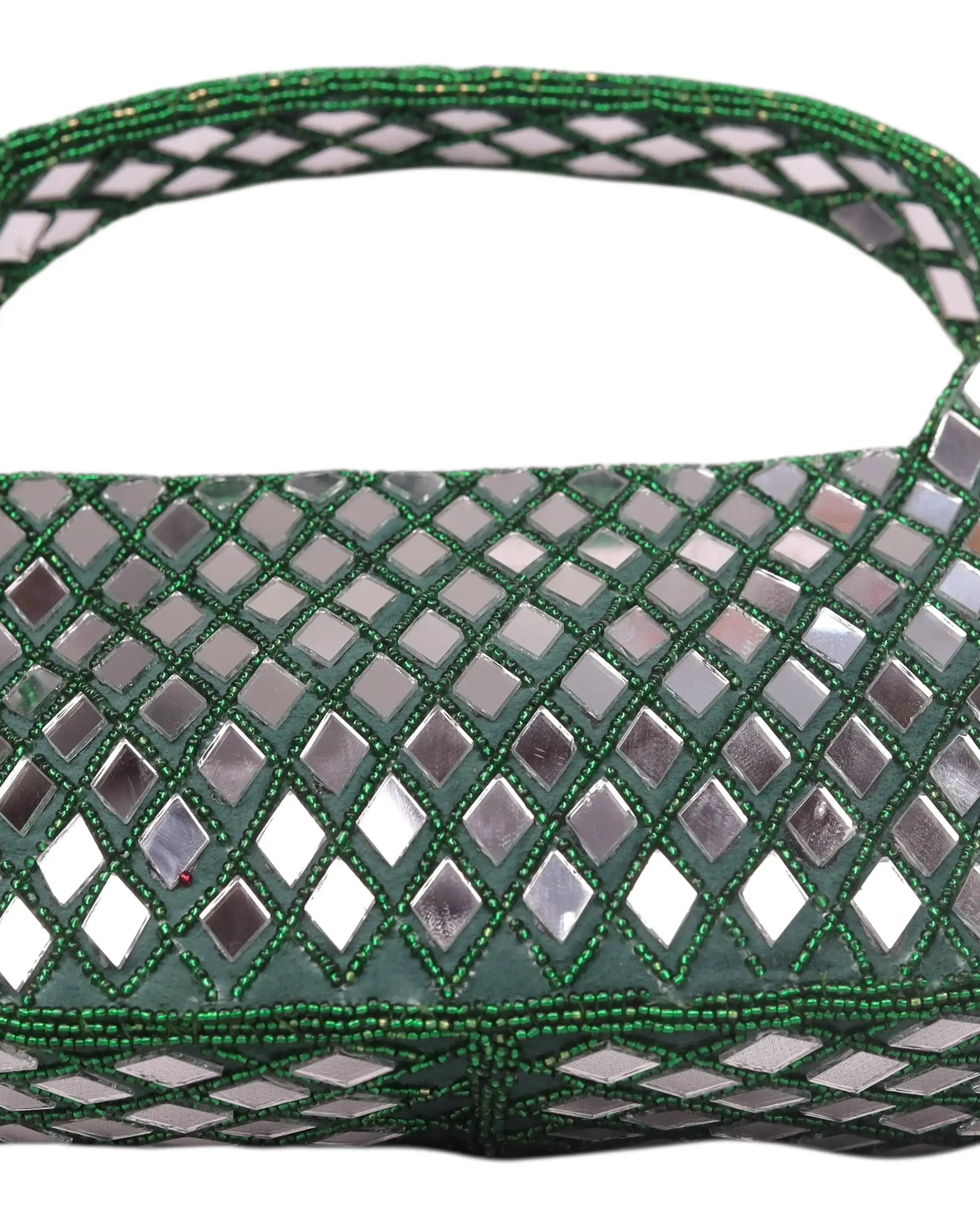 Add a touch of elegance to your ensemble with this stunning emerald pink beaded handbag. Designed in a chic crescent silhouette, this statement piece is intricately embellished with shimmering green beads, sequins, and delicate pearl accents, creating a rich texture that catches the light beautifully. The structured handle ensures comfort while carrying, making it the perfect accessory for weddings, festive occasions, or glamorous evenings out.