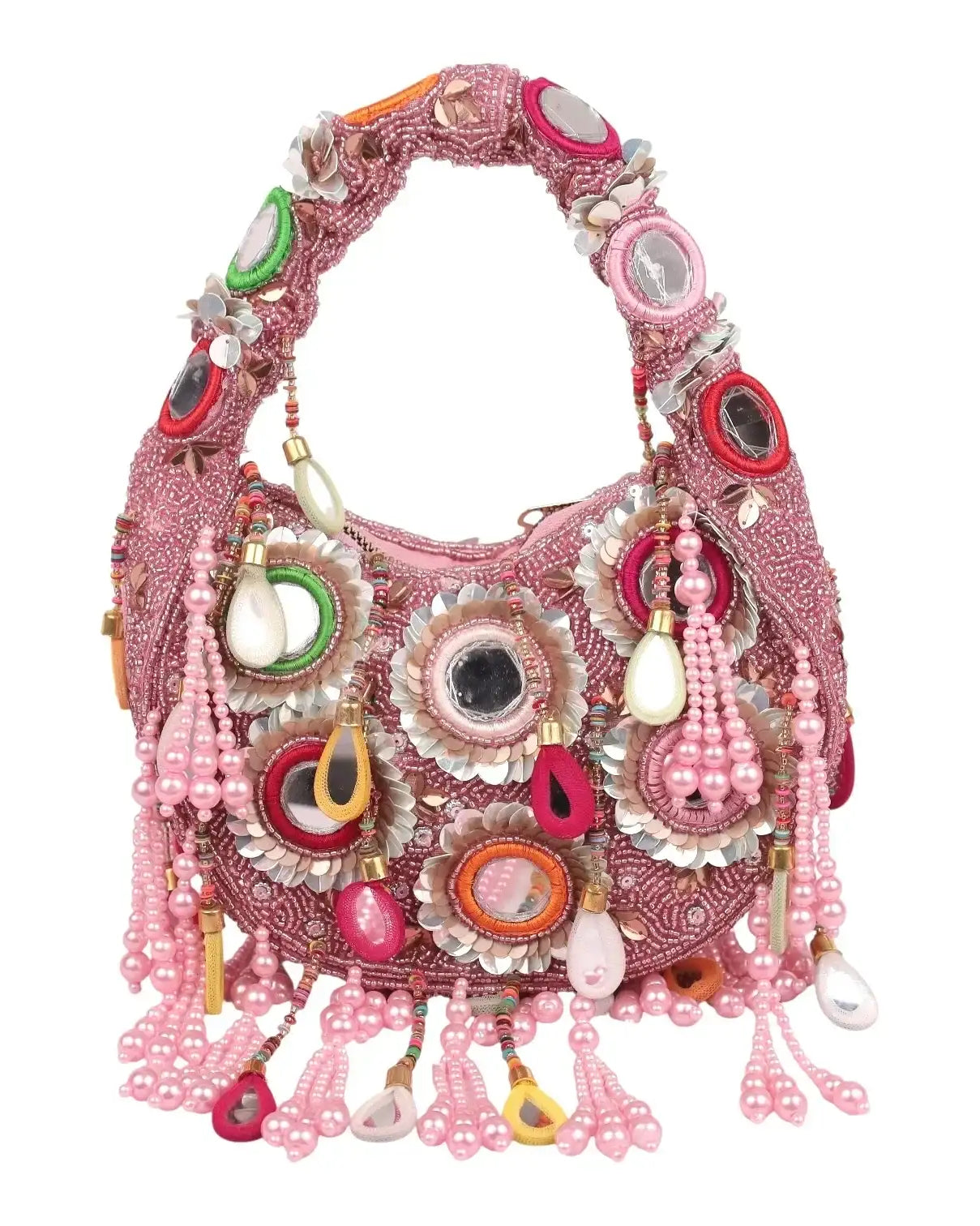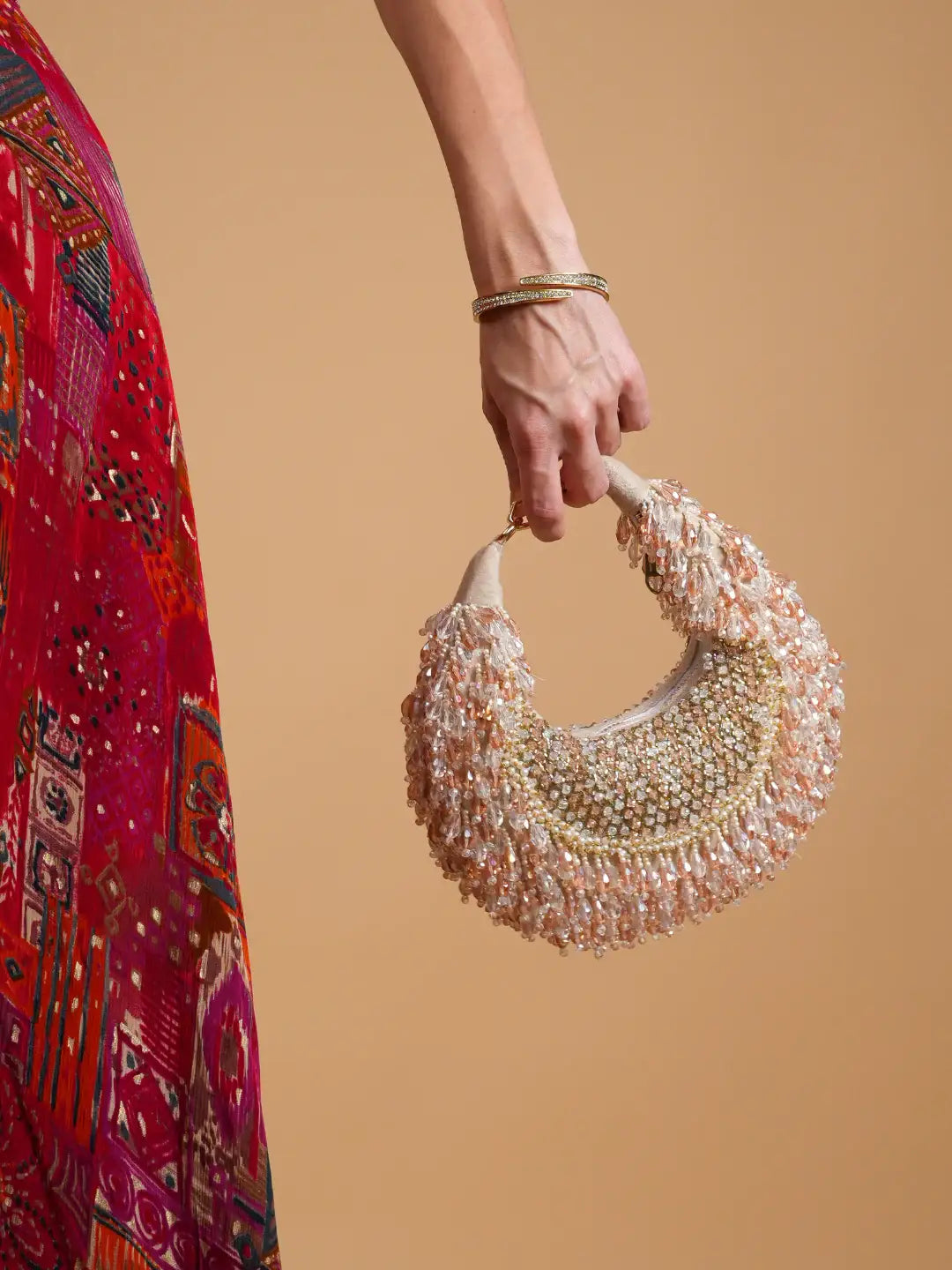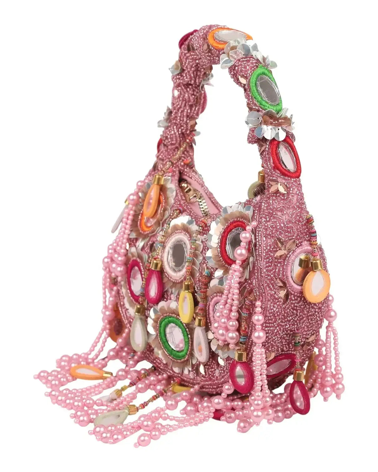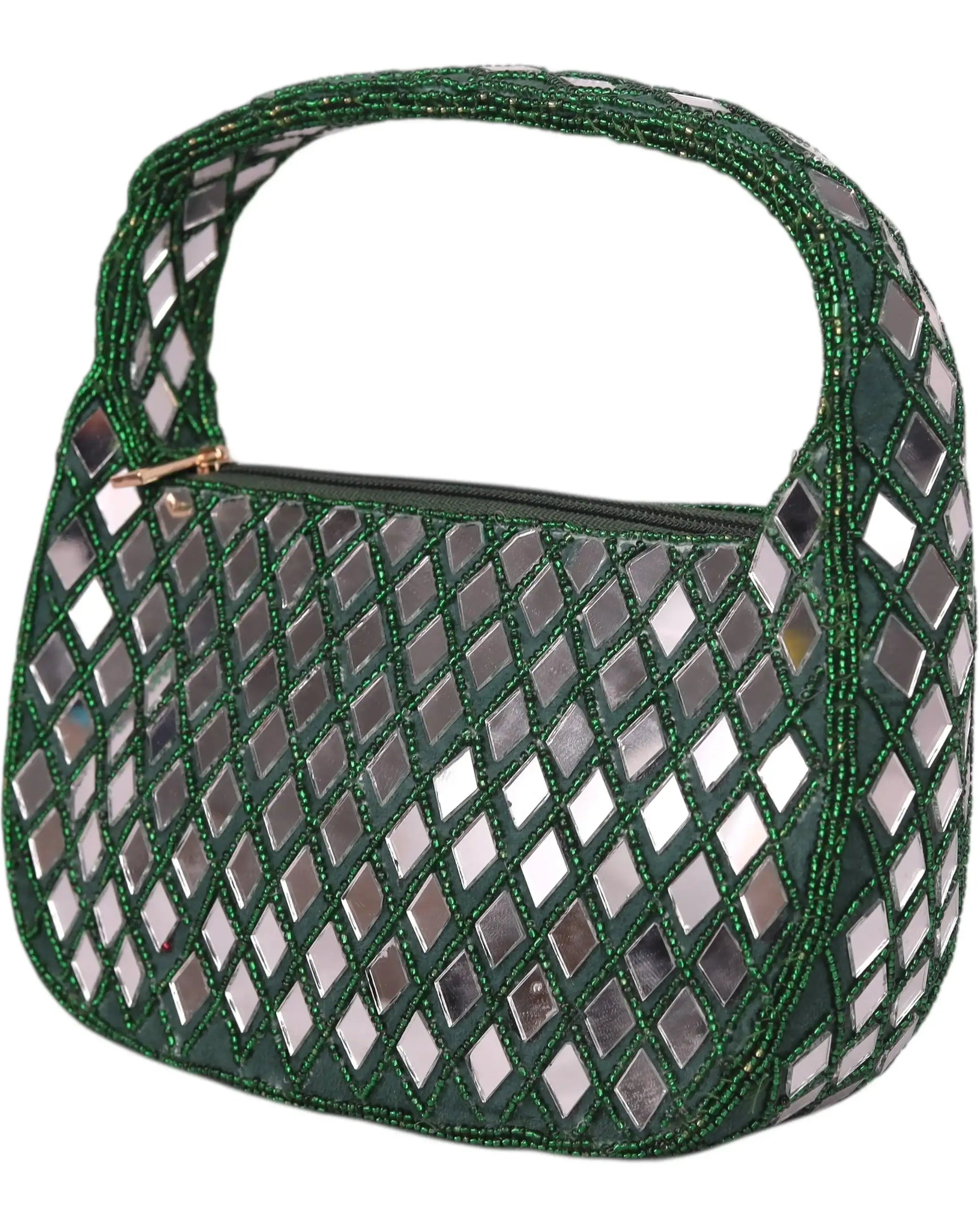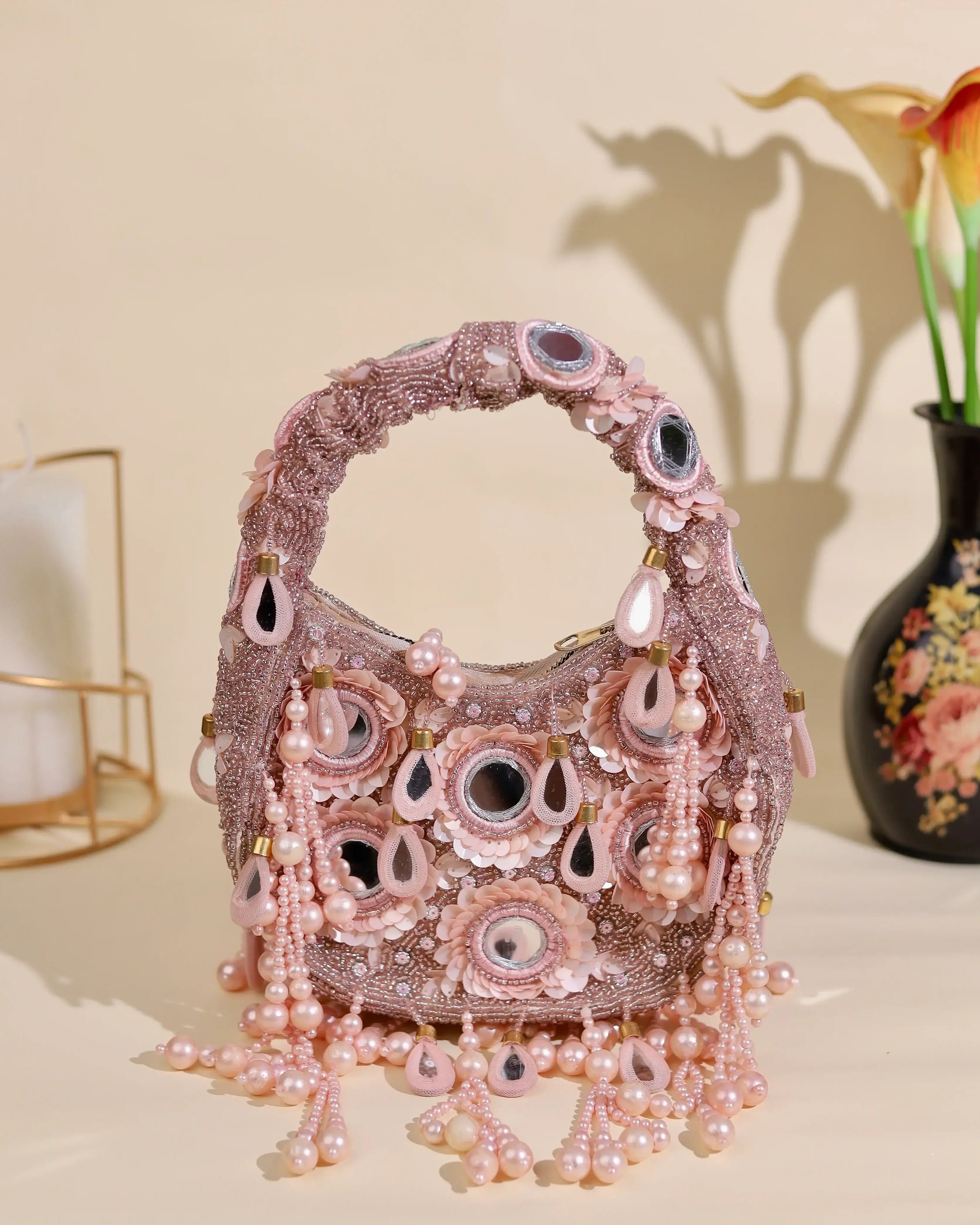 Add a touch of elegance to your ensemble with this stunning emerald pink beaded handbag. Designed in a chic crescent silhouette, this statement piece is intricately embellished with shimmering green beads, sequins, and delicate pearl accents, creating a rich texture that catches the light beautifully. The structured handle ensures comfort while carrying, making it the perfect accessory for weddings, festive occasions, or glamorous evenings out.