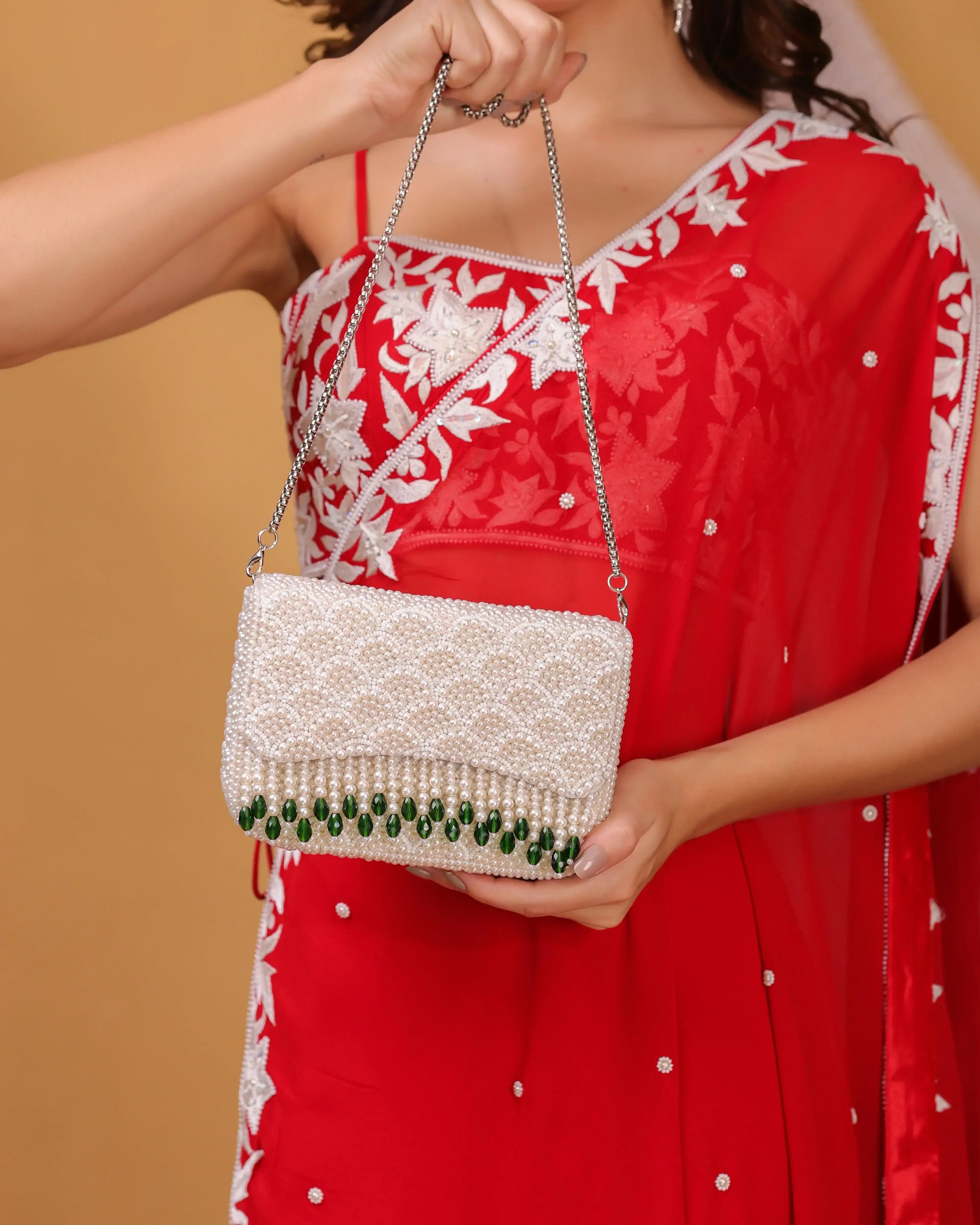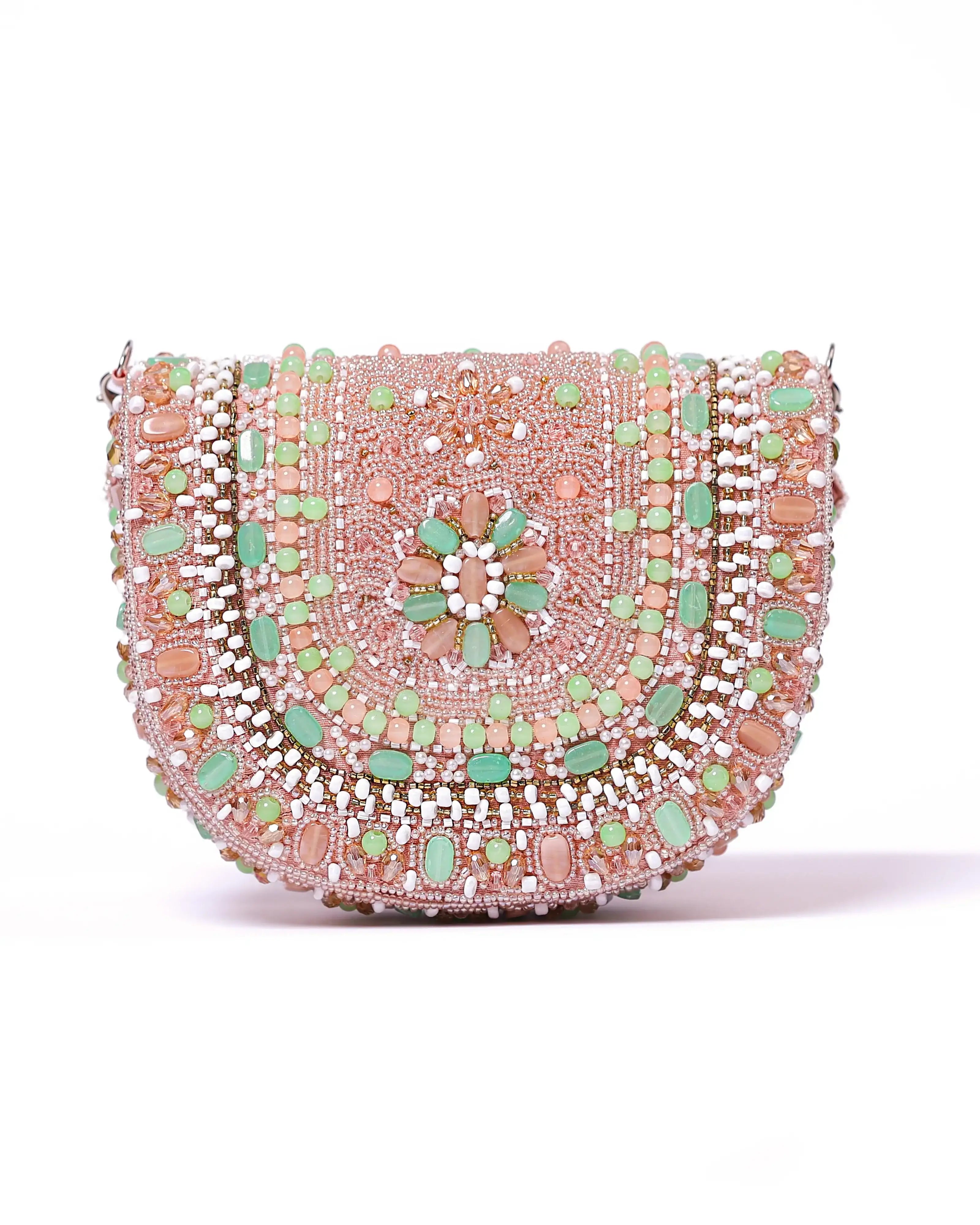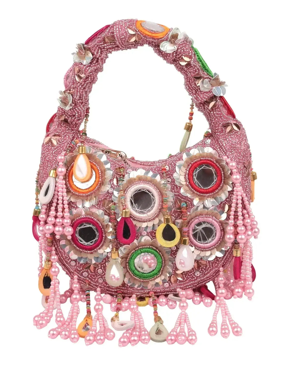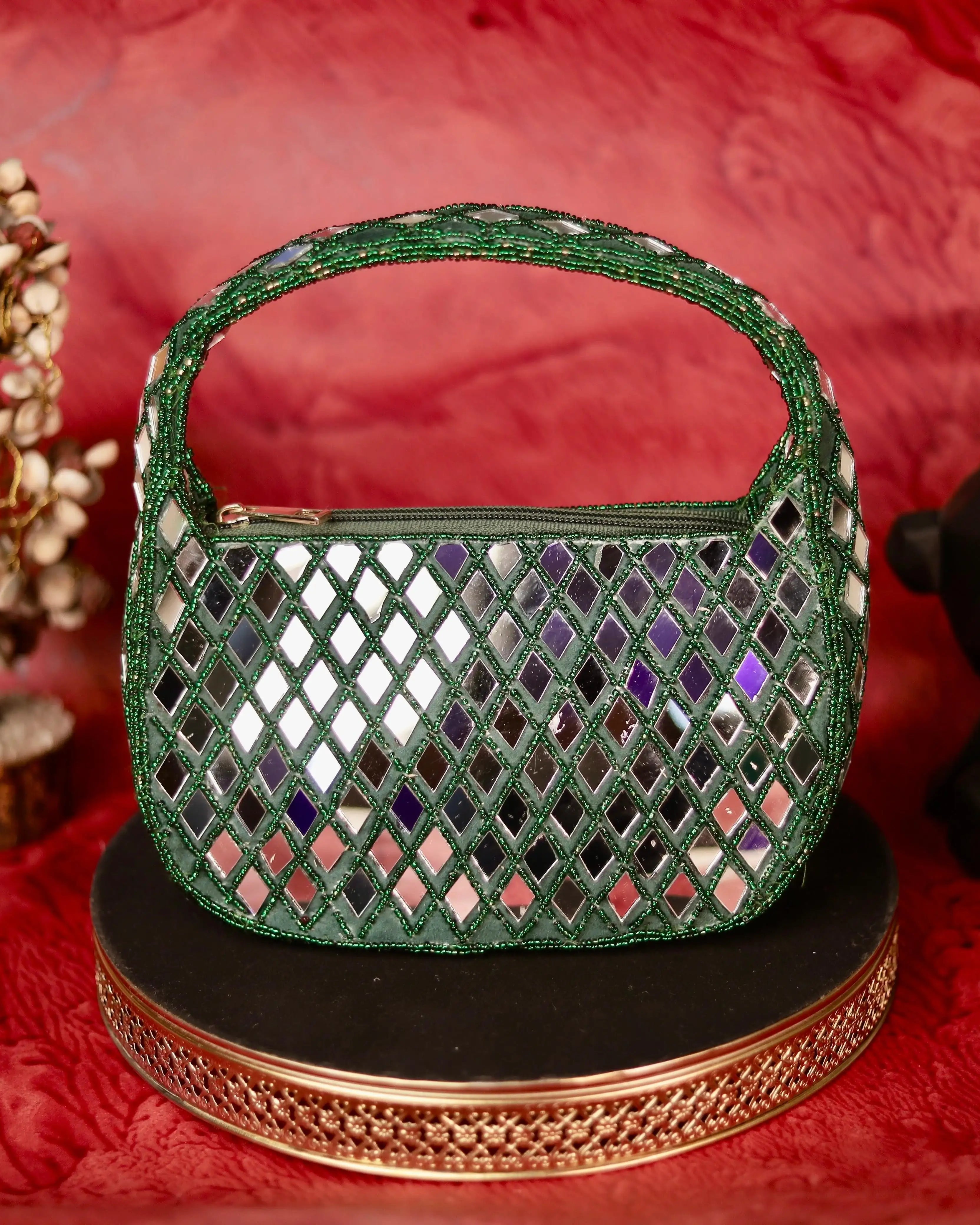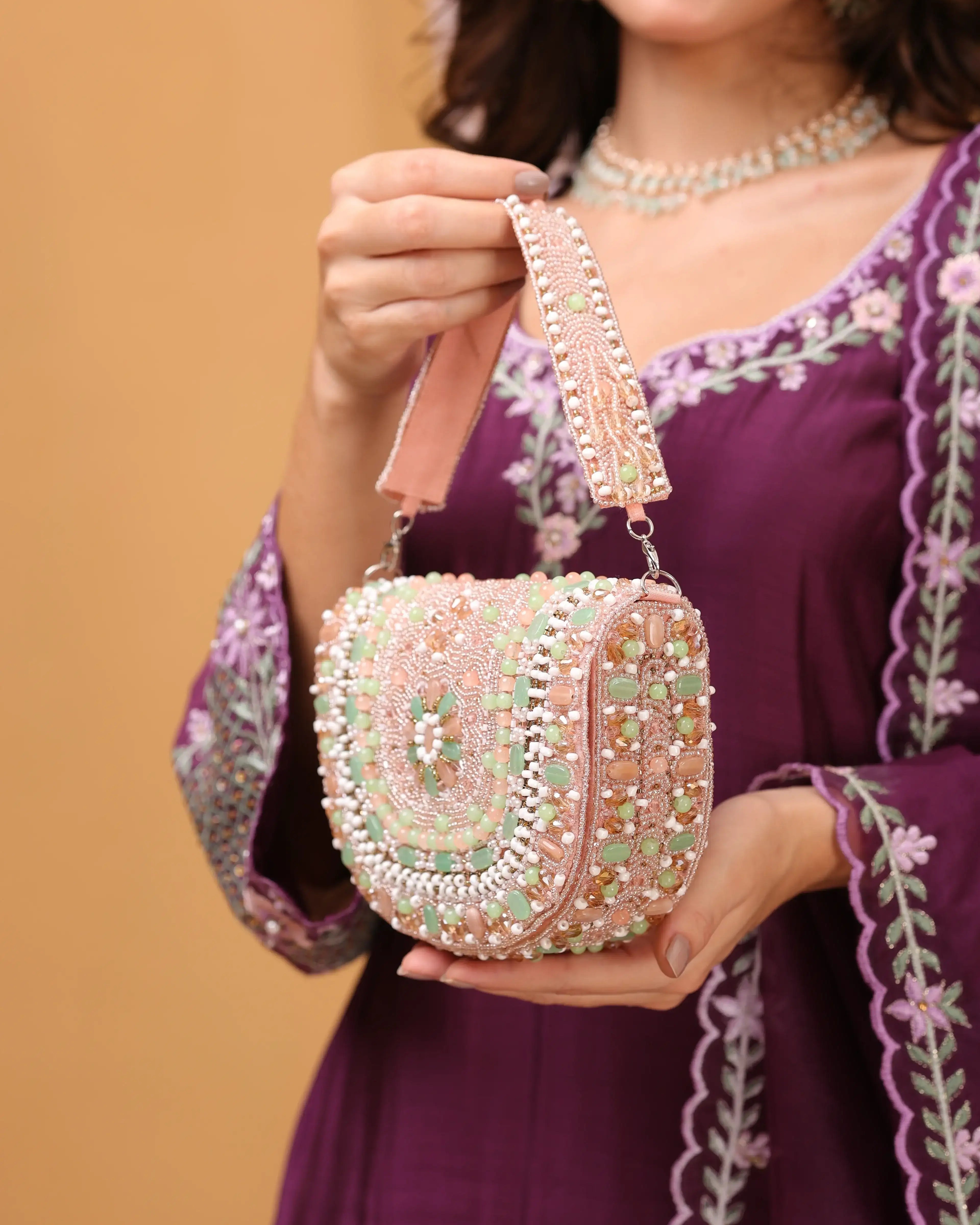 Add a touch of elegance to your ensemble with this stunning emerald pink beaded handbag. Designed in a chic crescent silhouette, this statement piece is intricately embellished with shimmering green beads, sequins, and delicate pearl accents, creating a rich texture that catches the light beautifully. The structured handle ensures comfort while carrying, making it the perfect accessory for weddings, festive occasions, or glamorous evenings out.