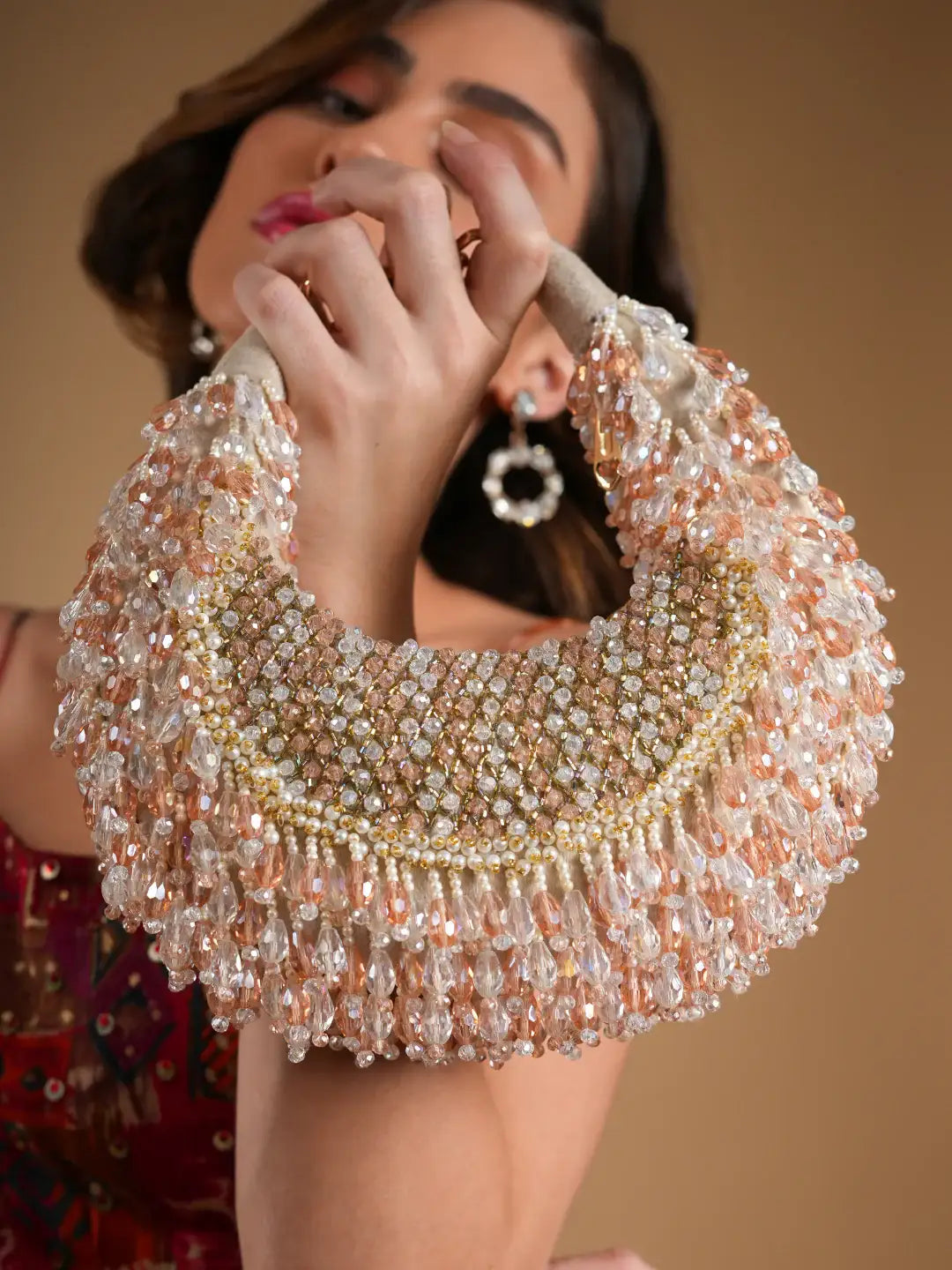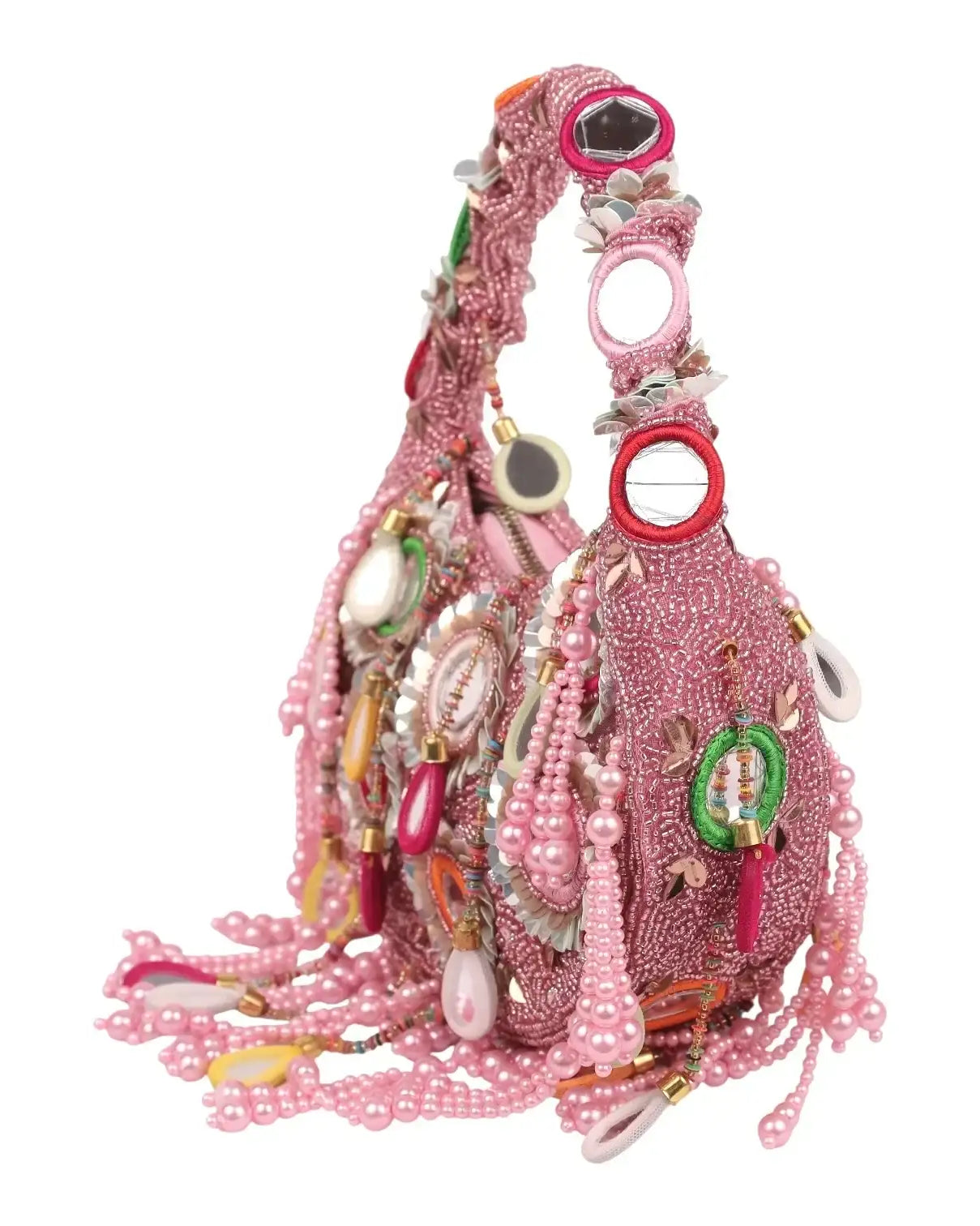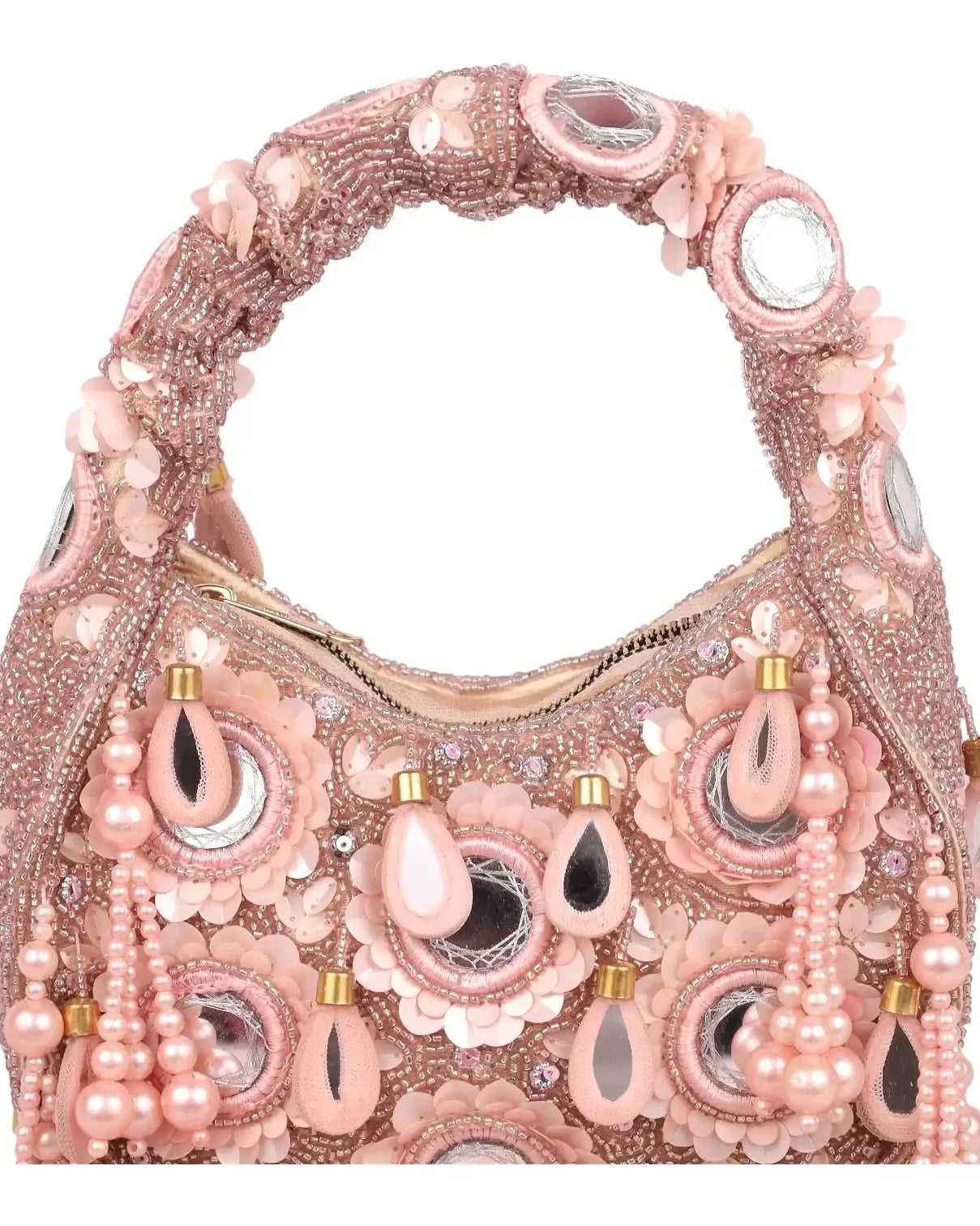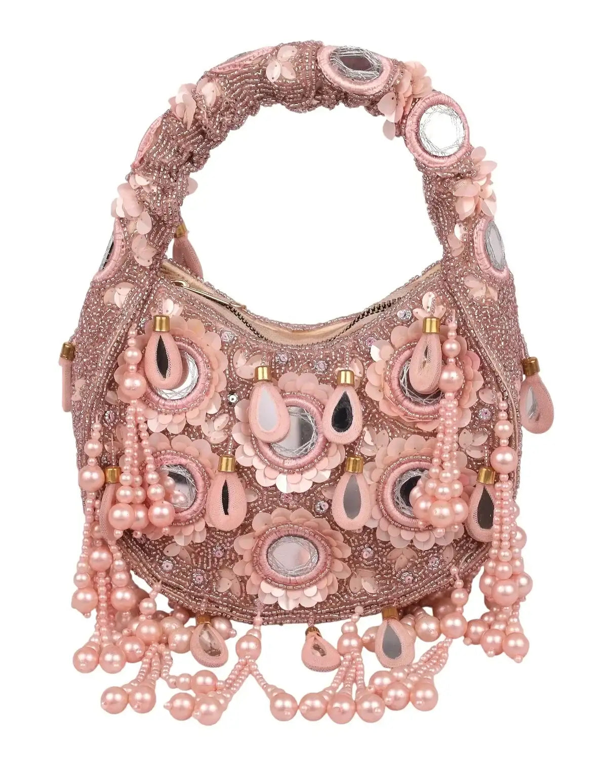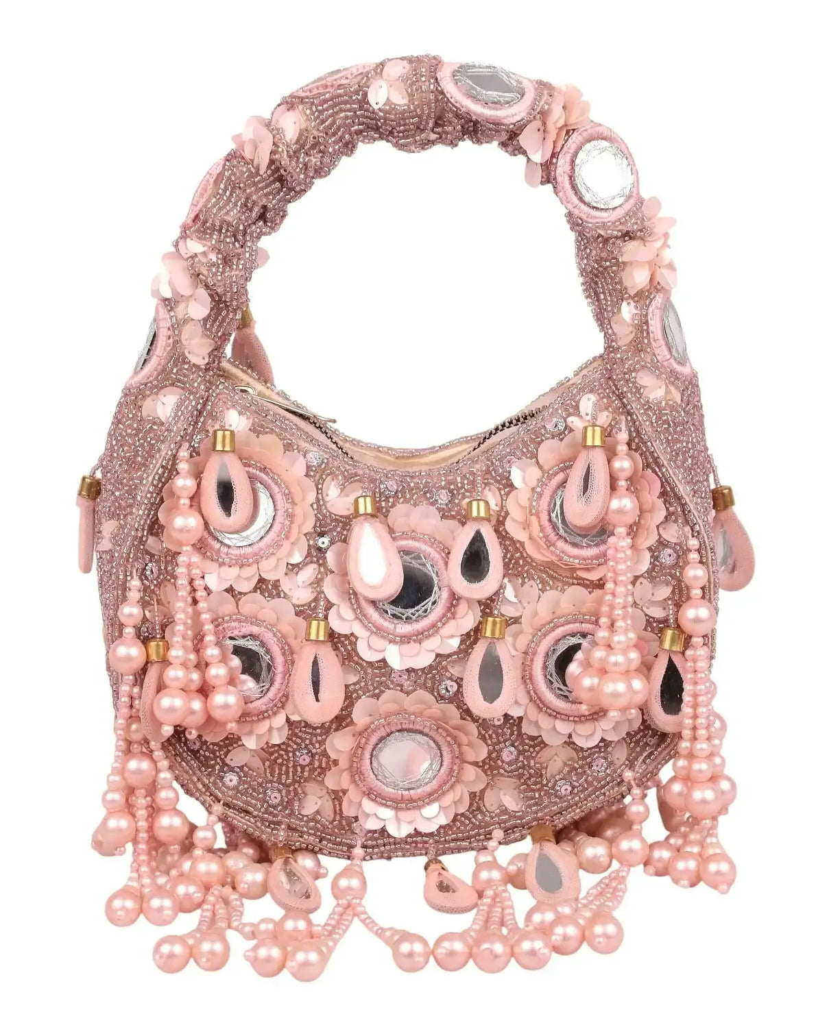 Add a touch of elegance to your ensemble with this stunning emerald pink beaded handbag. Designed in a chic crescent silhouette, this statement piece is intricately embellished with shimmering green beads, sequins, and delicate pearl accents, creating a rich texture that catches the light beautifully. The structured handle ensures comfort while carrying, making it the perfect accessory for weddings, festive occasions, or glamorous evenings out.