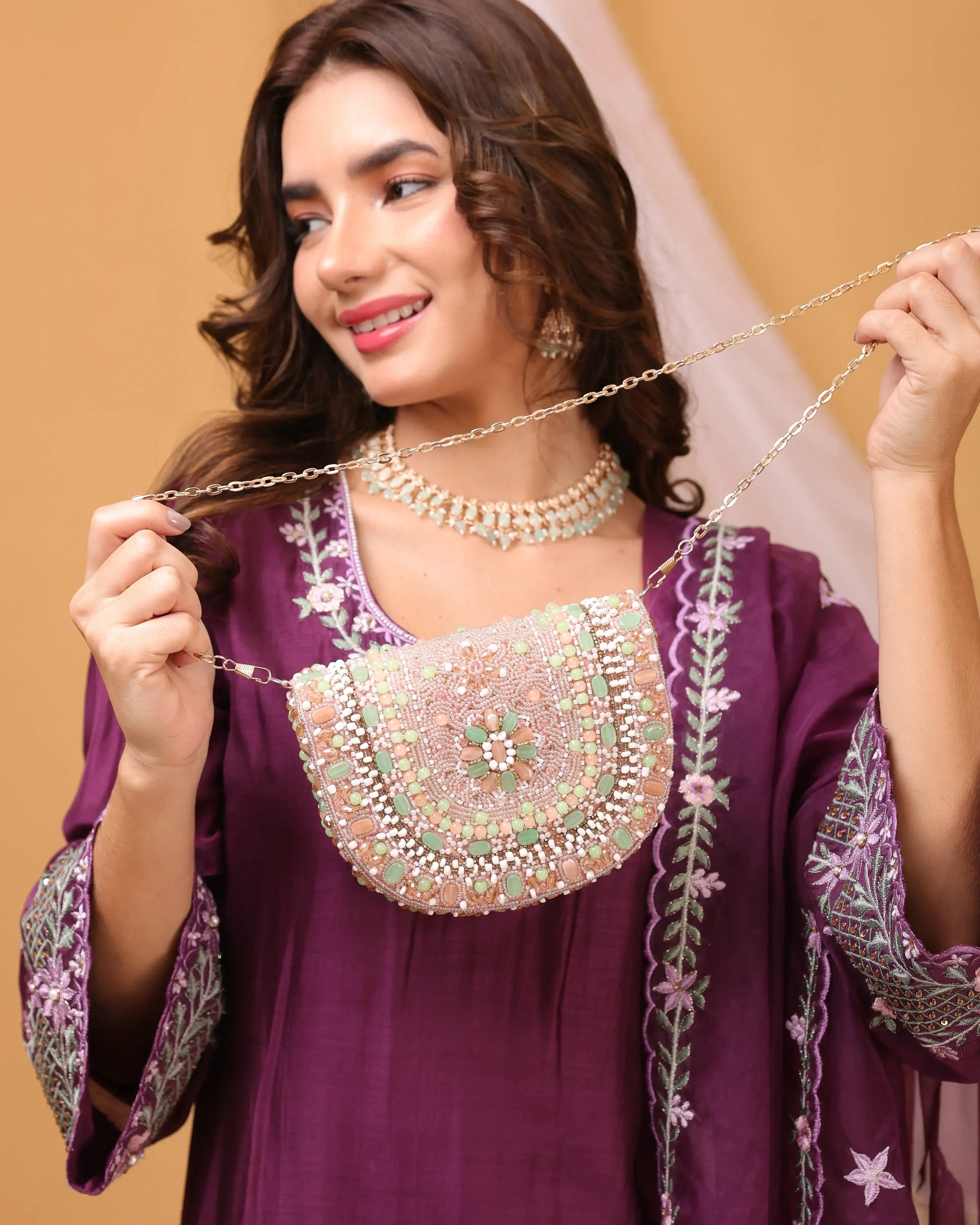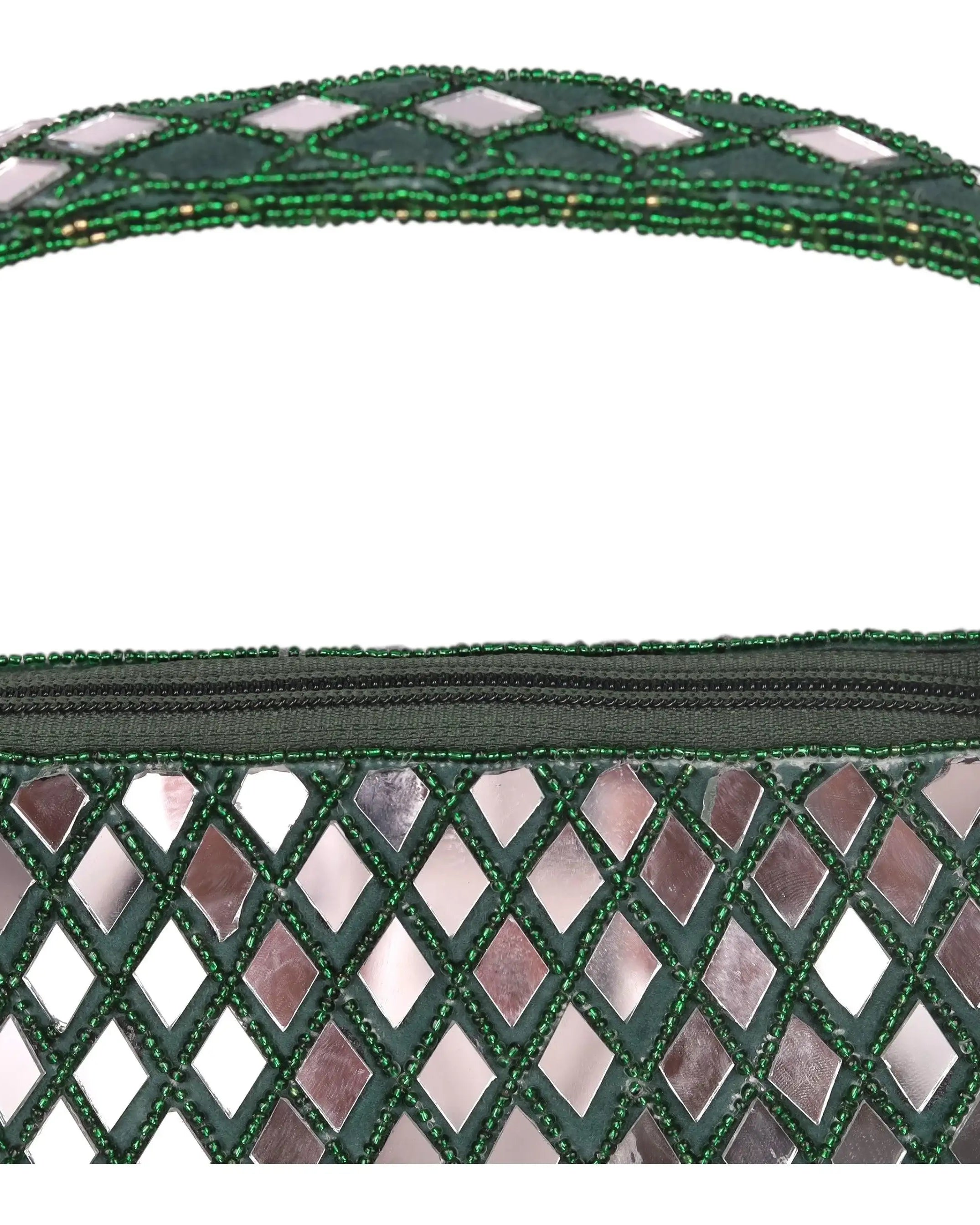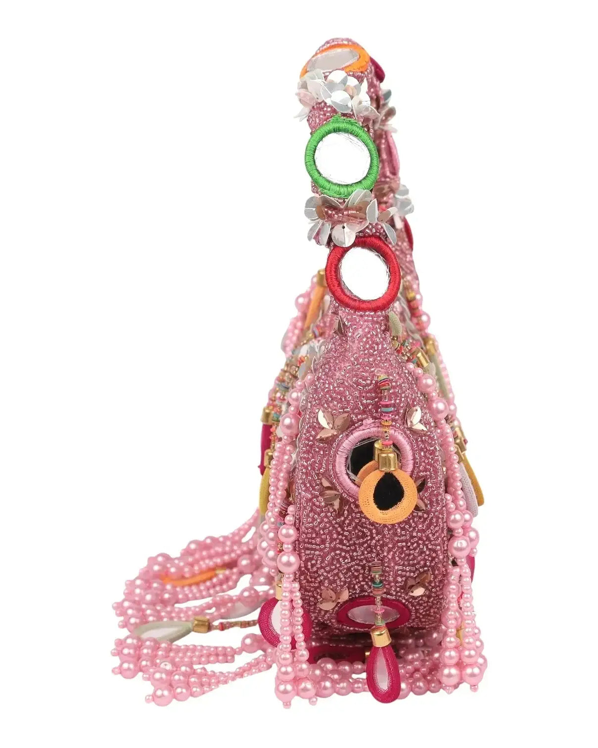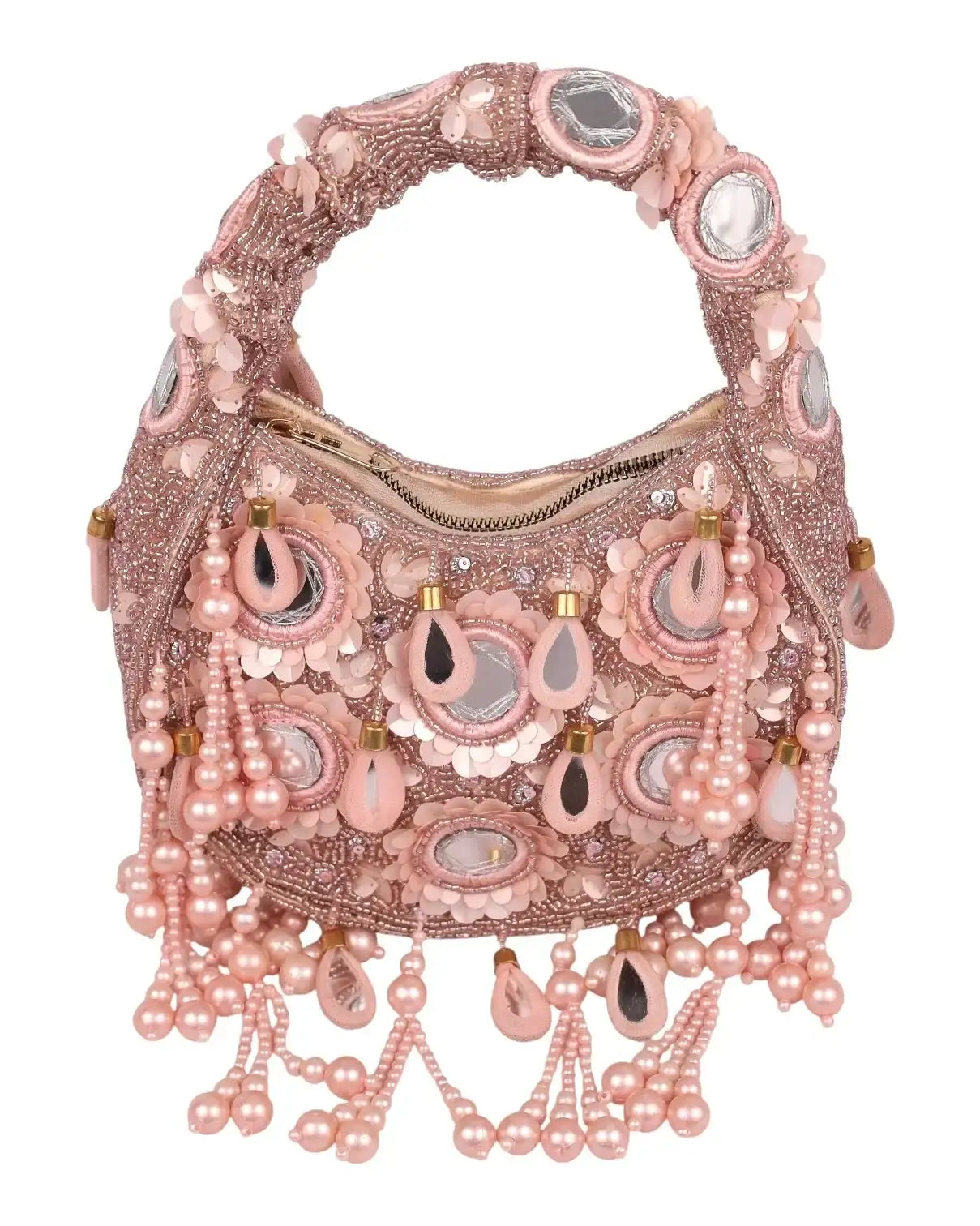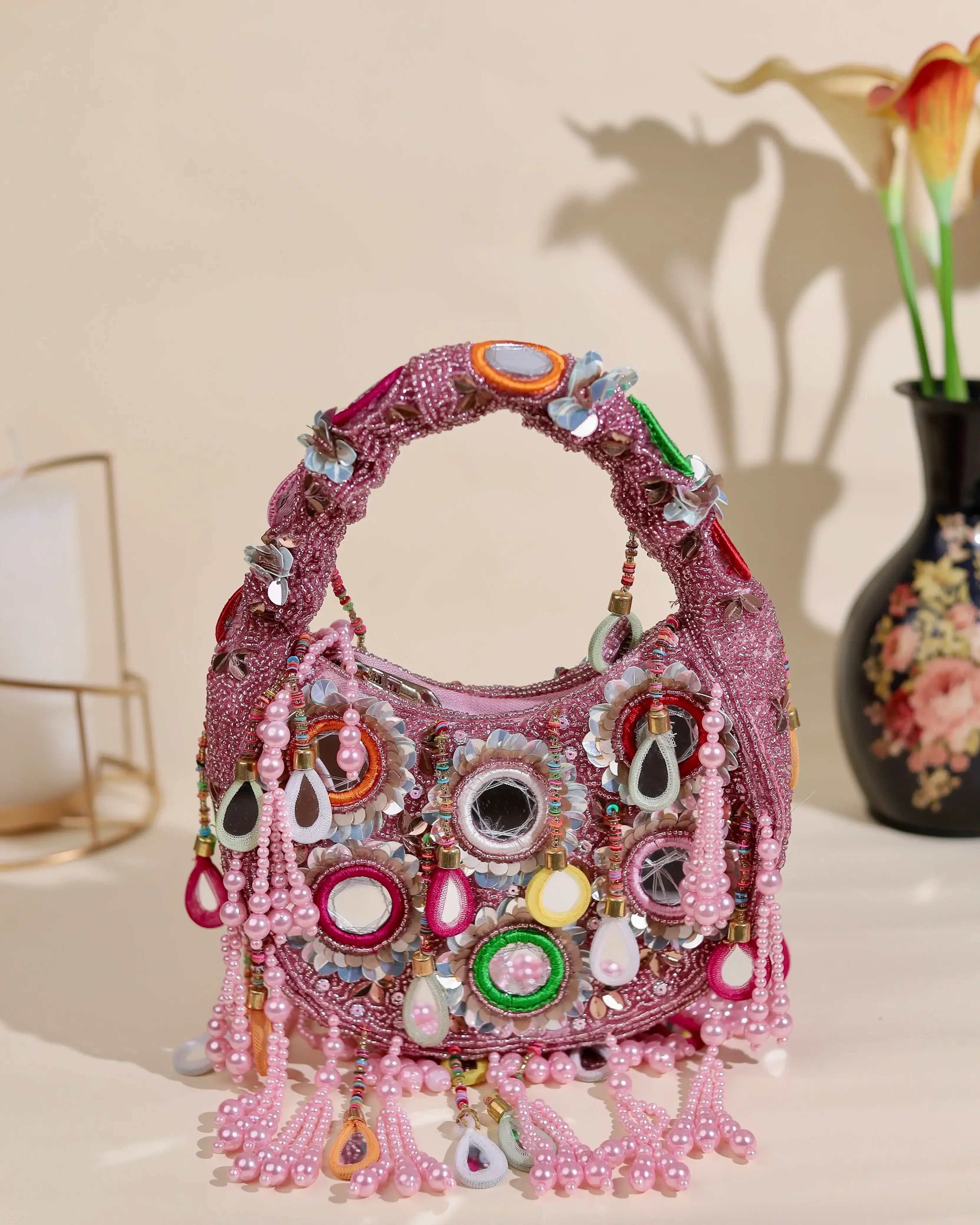 Add a touch of elegance to your ensemble with this stunning emerald pink beaded handbag. Designed in a chic crescent silhouette, this statement piece is intricately embellished with shimmering green beads, sequins, and delicate pearl accents, creating a rich texture that catches the light beautifully. The structured handle ensures comfort while carrying, making it the perfect accessory for weddings, festive occasions, or glamorous evenings out.