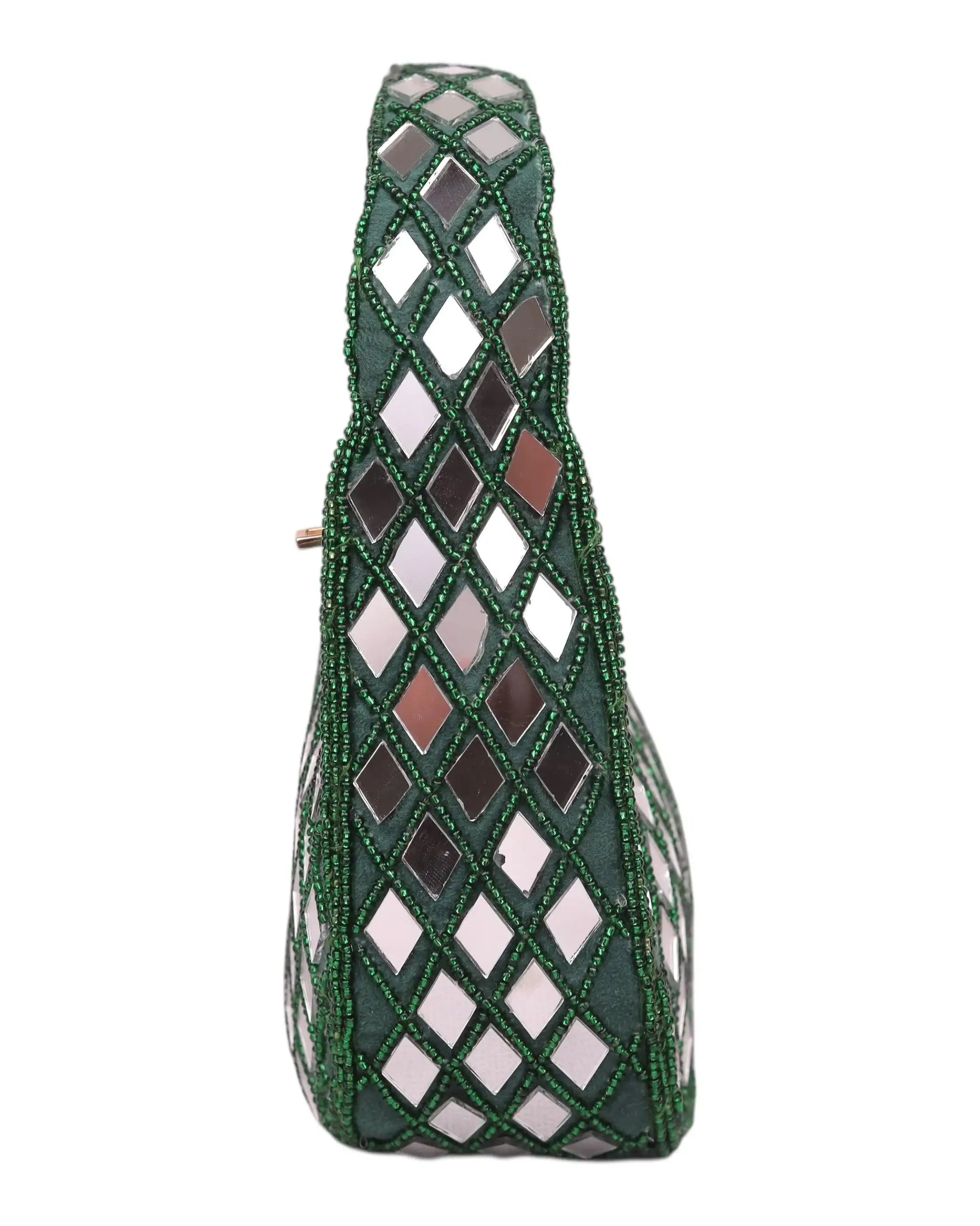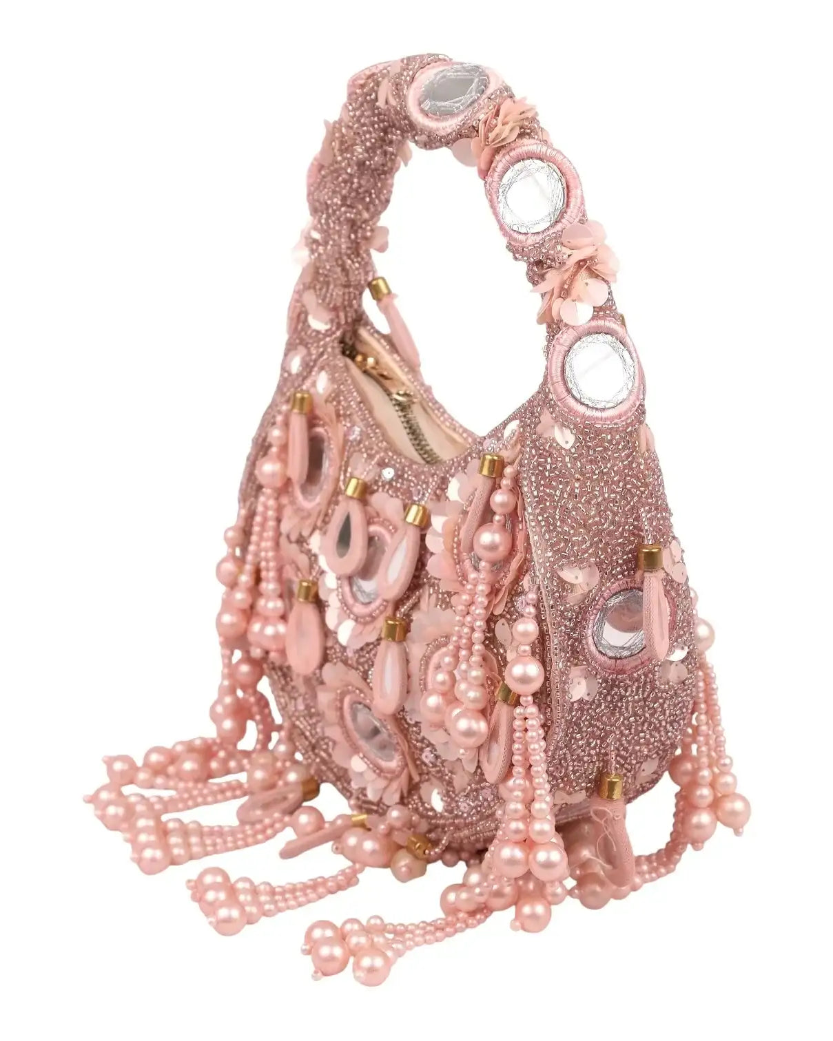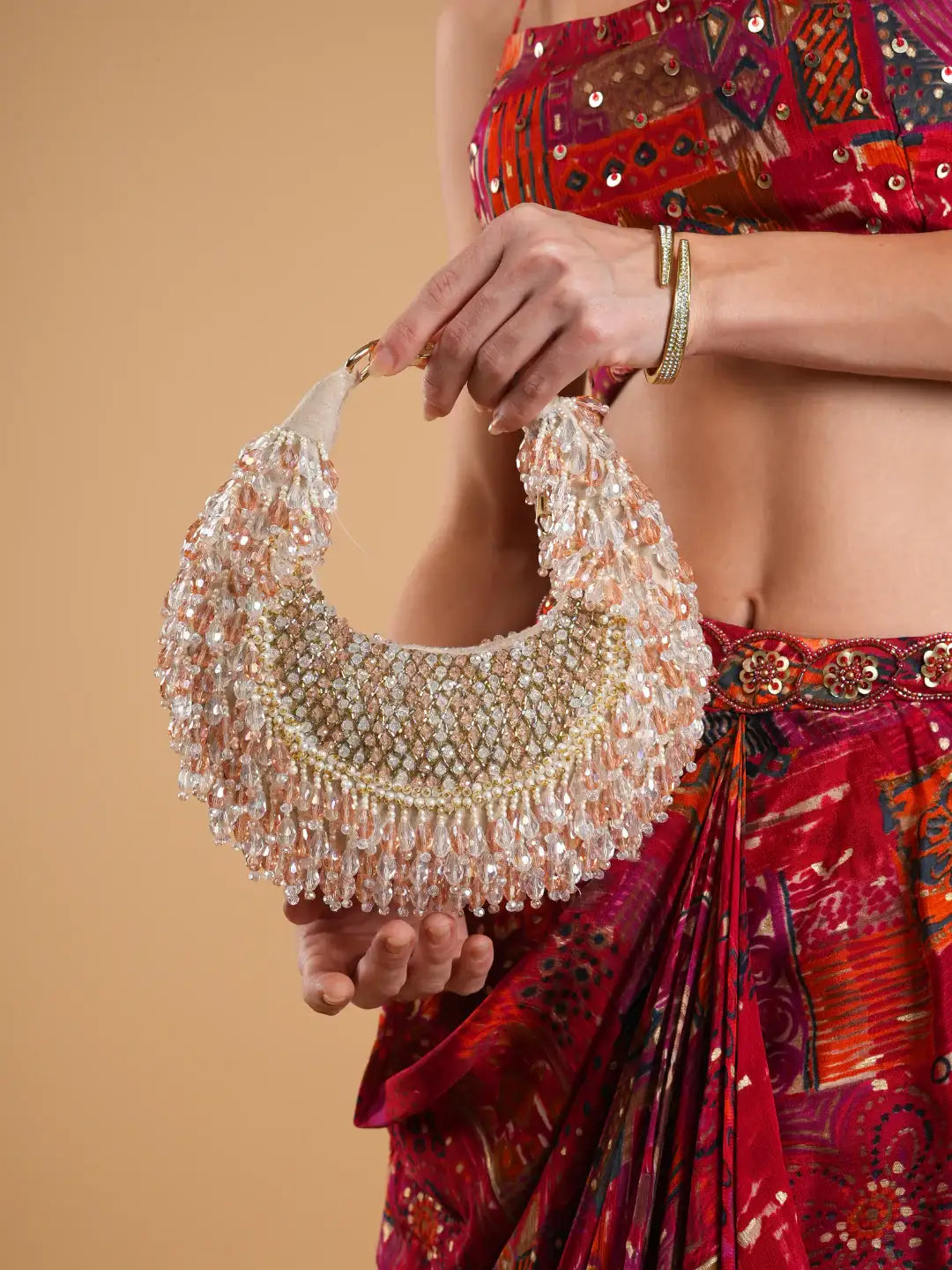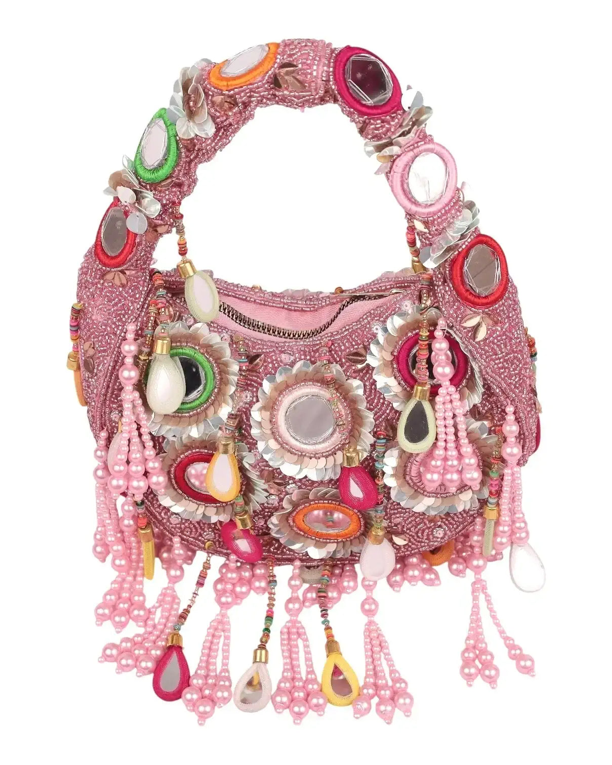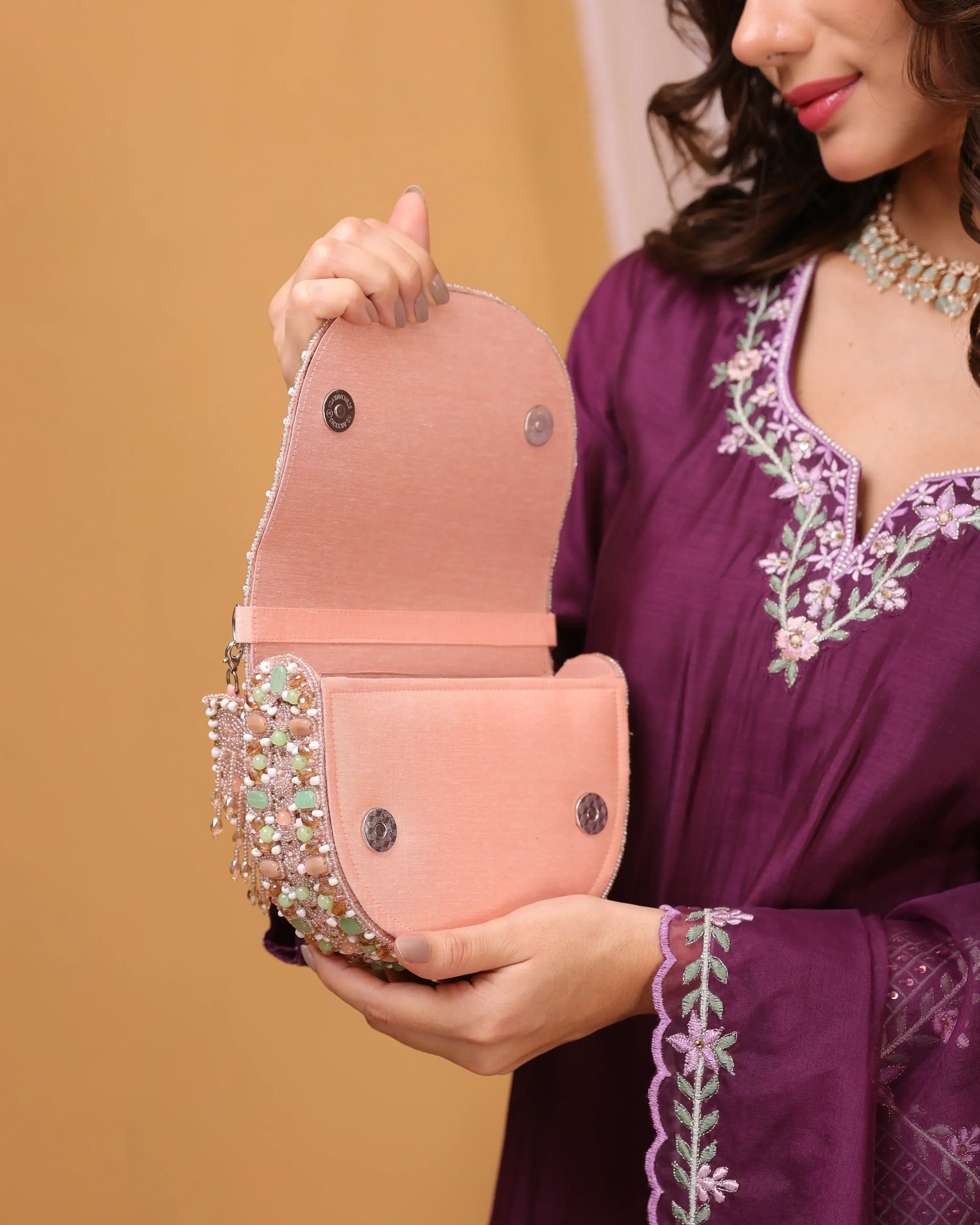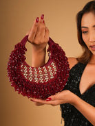 Add a touch of elegance to your ensemble with this stunning emerald pink beaded handbag. Designed in a chic crescent silhouette, this statement piece is intricately embellished with shimmering green beads, sequins, and delicate pearl accents, creating a rich texture that catches the light beautifully. The structured handle ensures comfort while carrying, making it the perfect accessory for weddings, festive occasions, or glamorous evenings out.