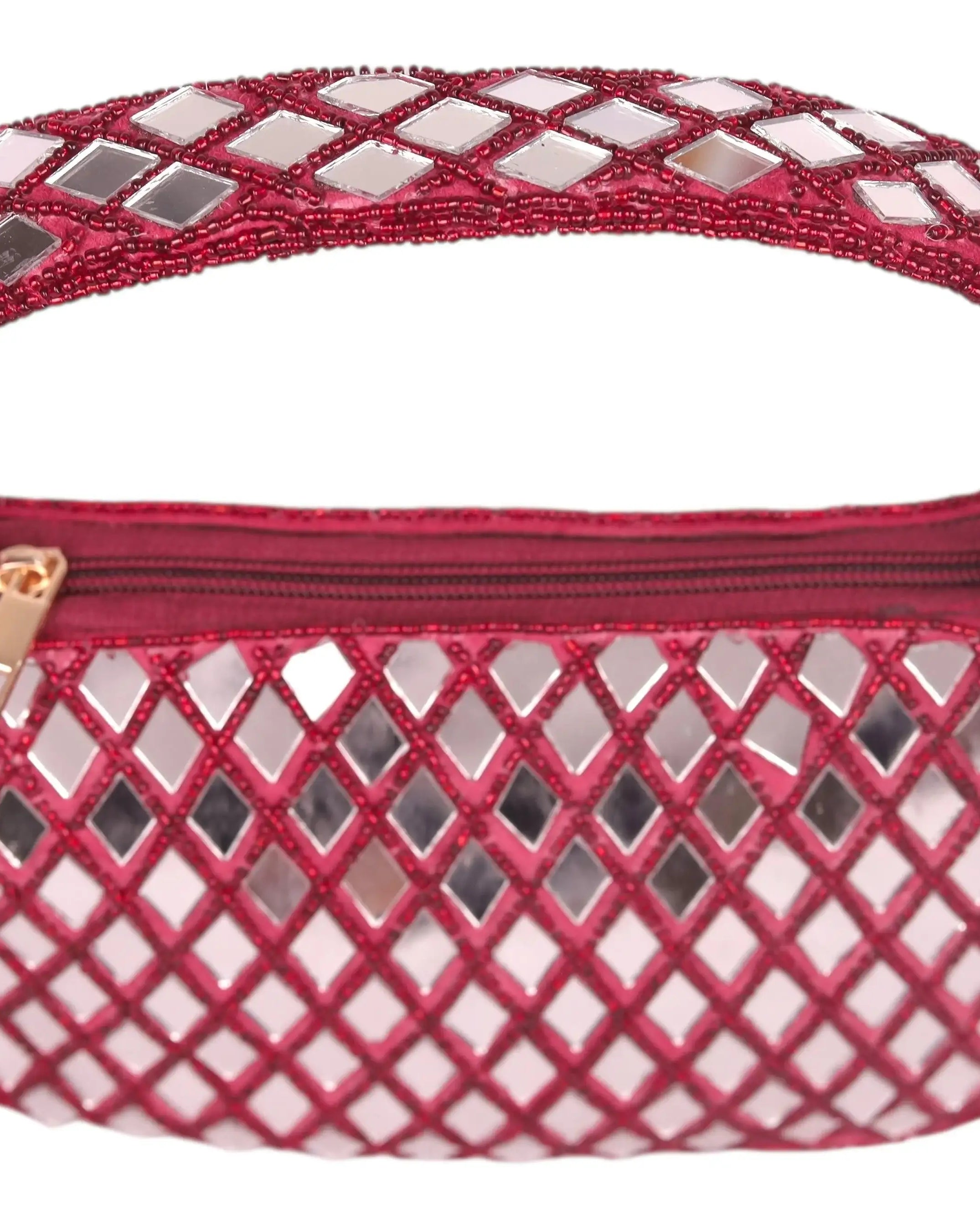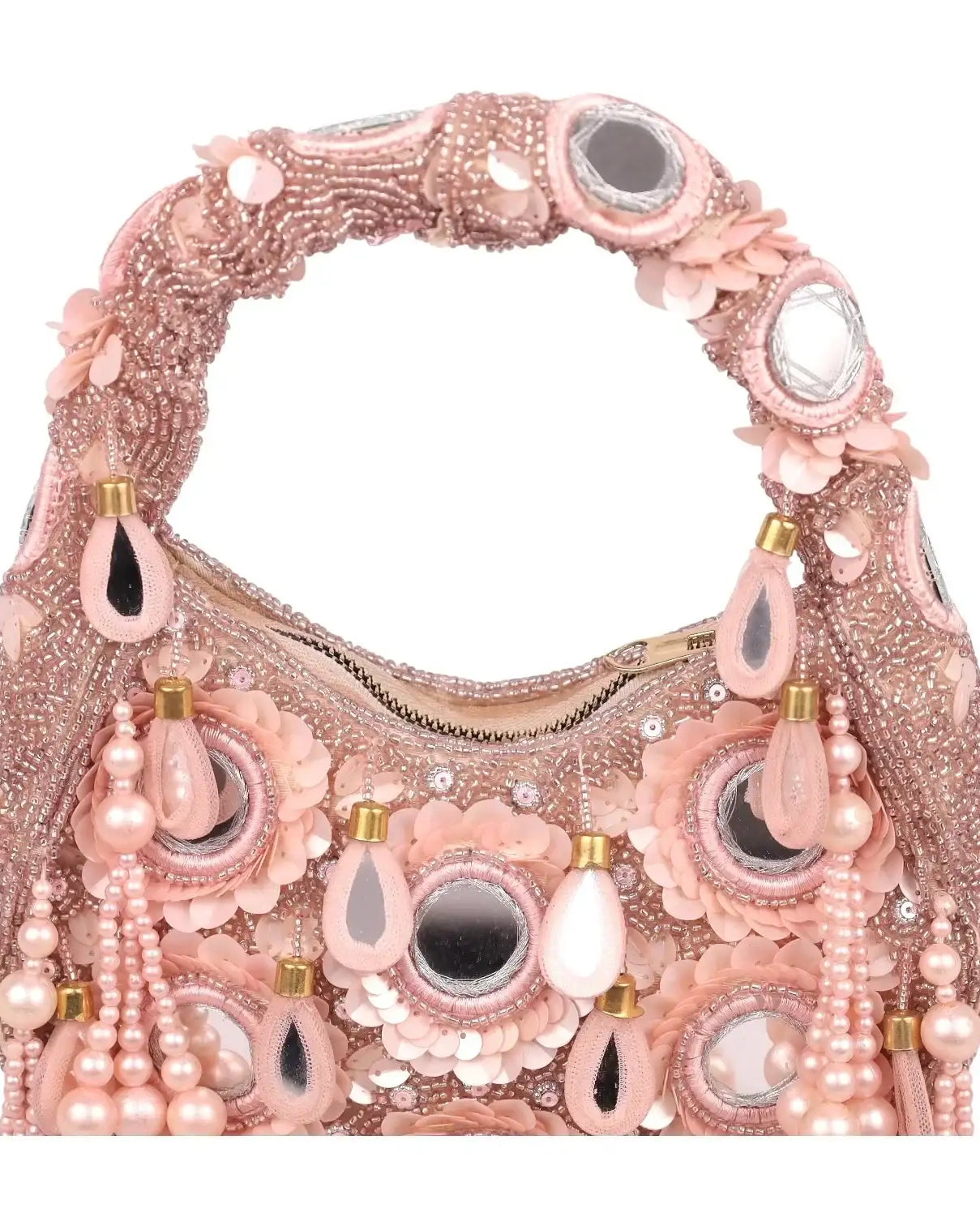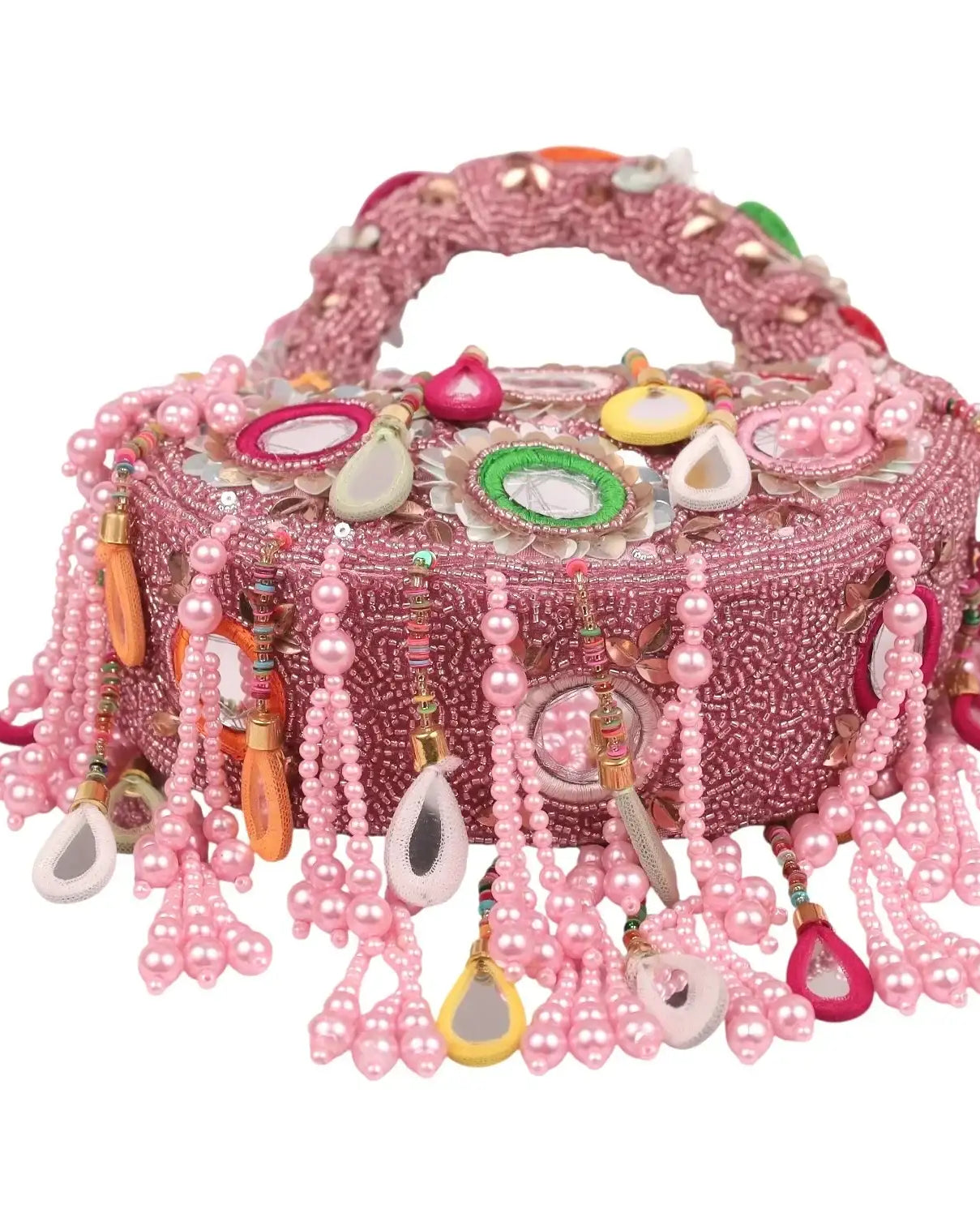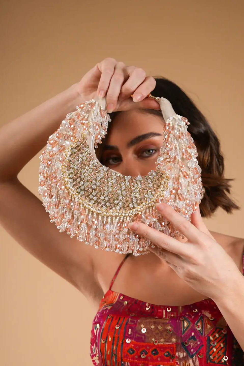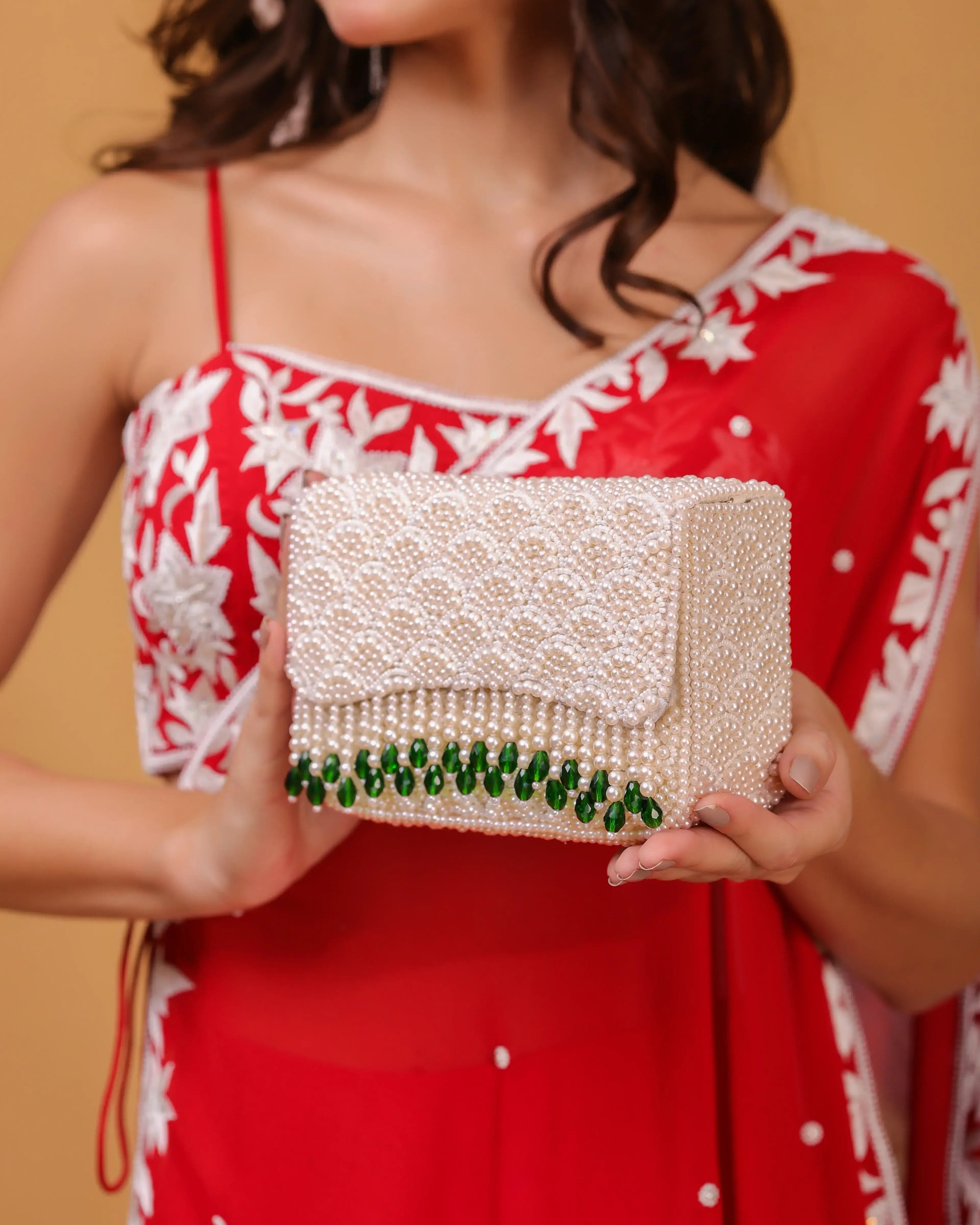 Add a touch of elegance to your ensemble with this stunning emerald pink beaded handbag. Designed in a chic crescent silhouette, this statement piece is intricately embellished with shimmering green beads, sequins, and delicate pearl accents, creating a rich texture that catches the light beautifully. The structured handle ensures comfort while carrying, making it the perfect accessory for weddings, festive occasions, or glamorous evenings out.