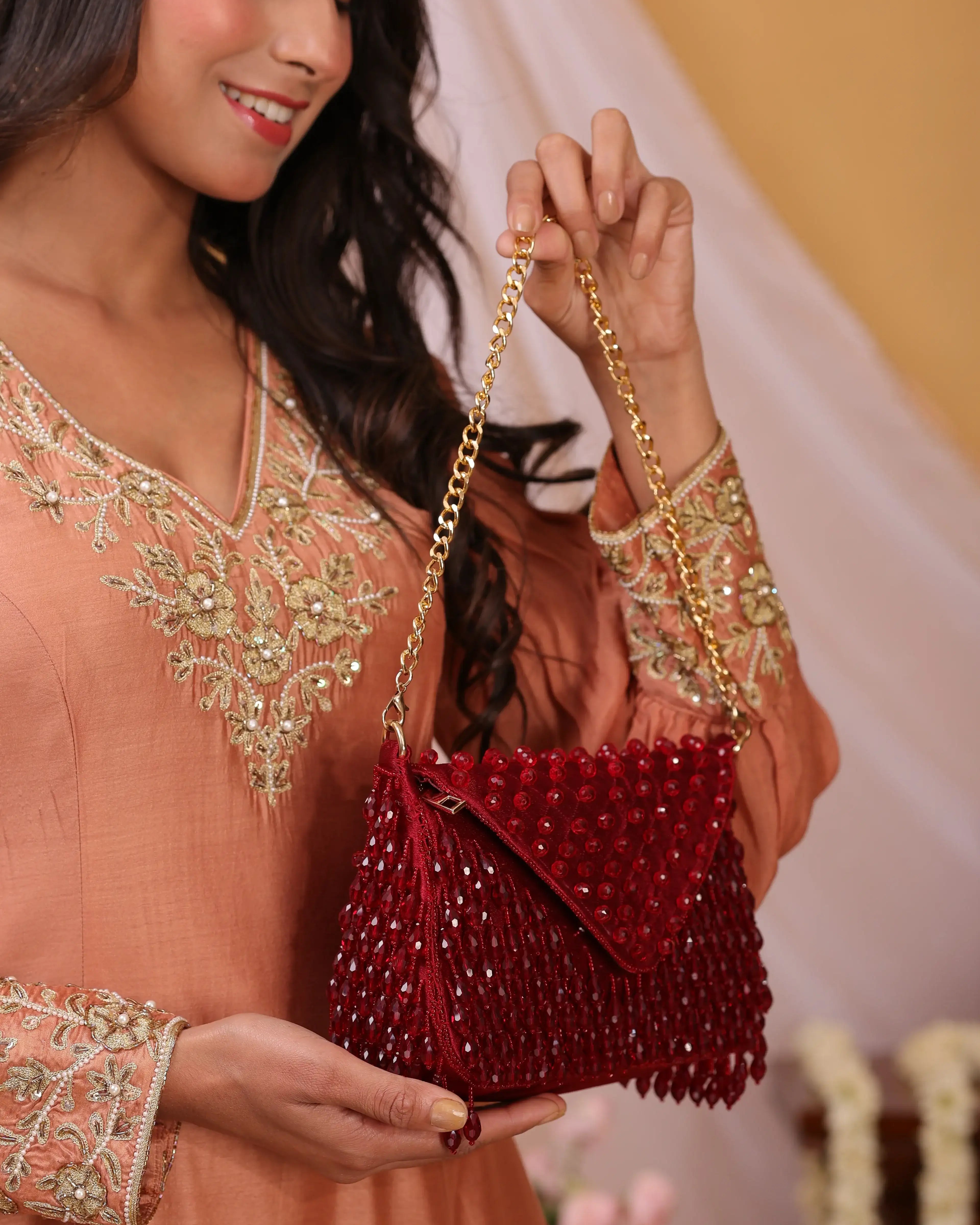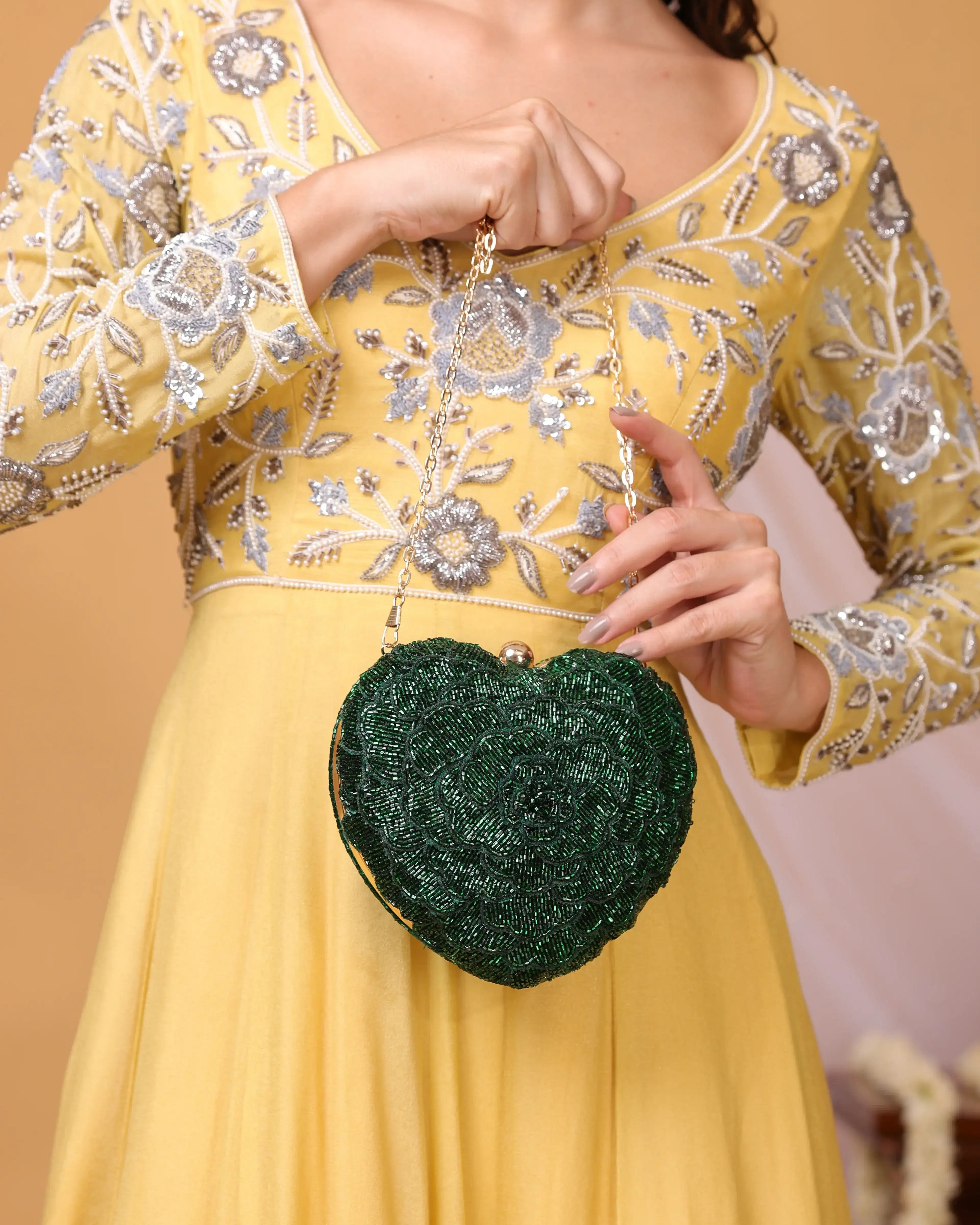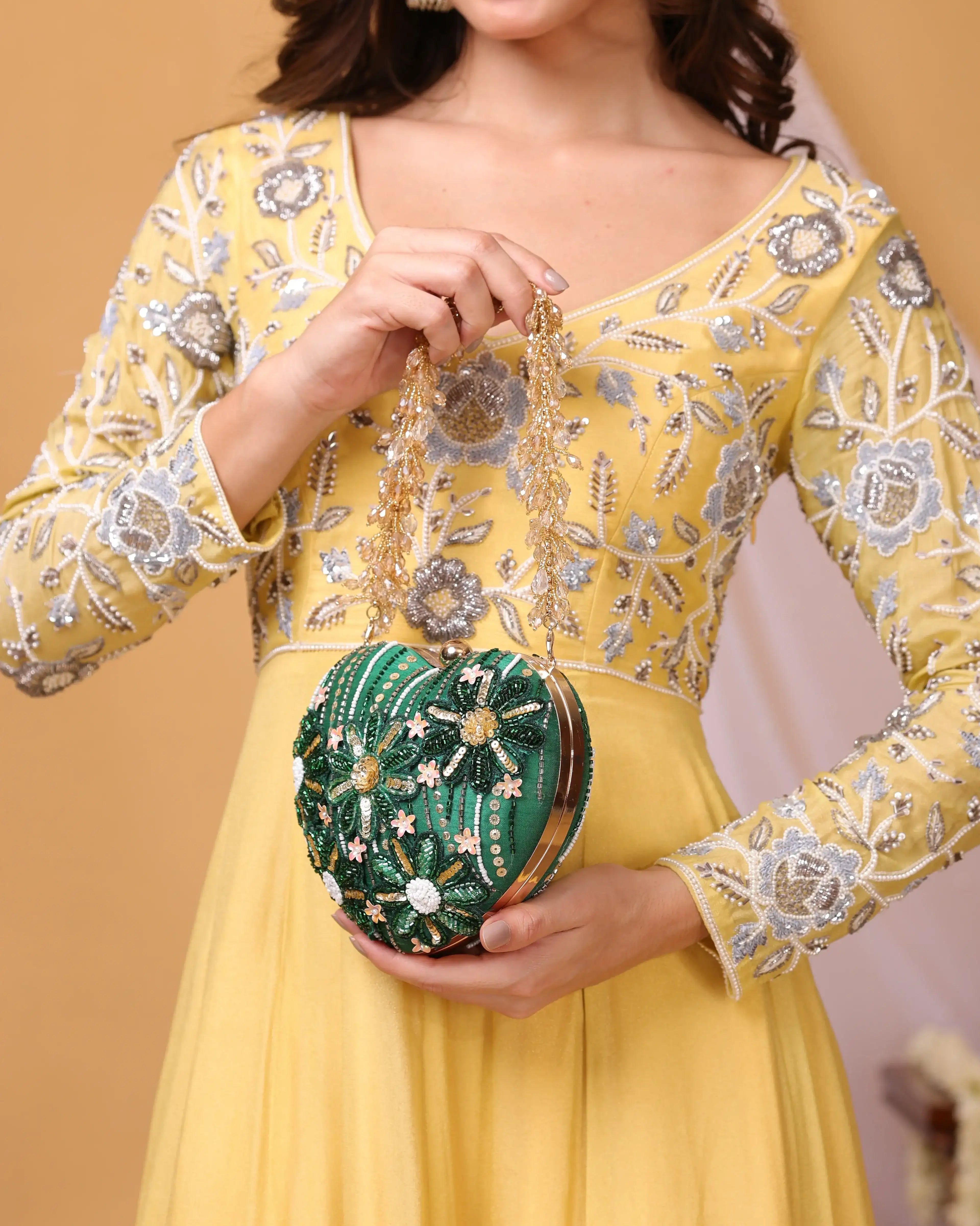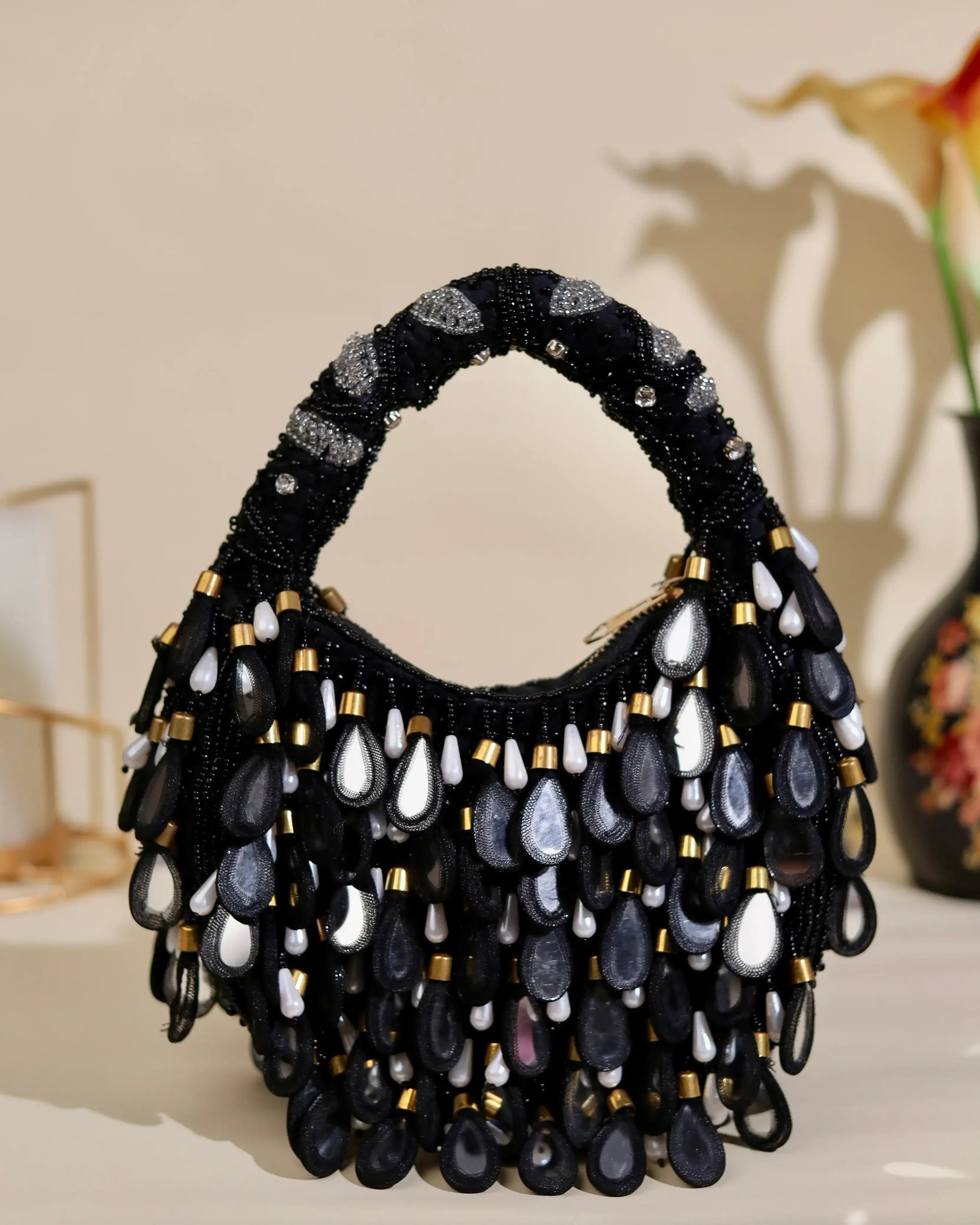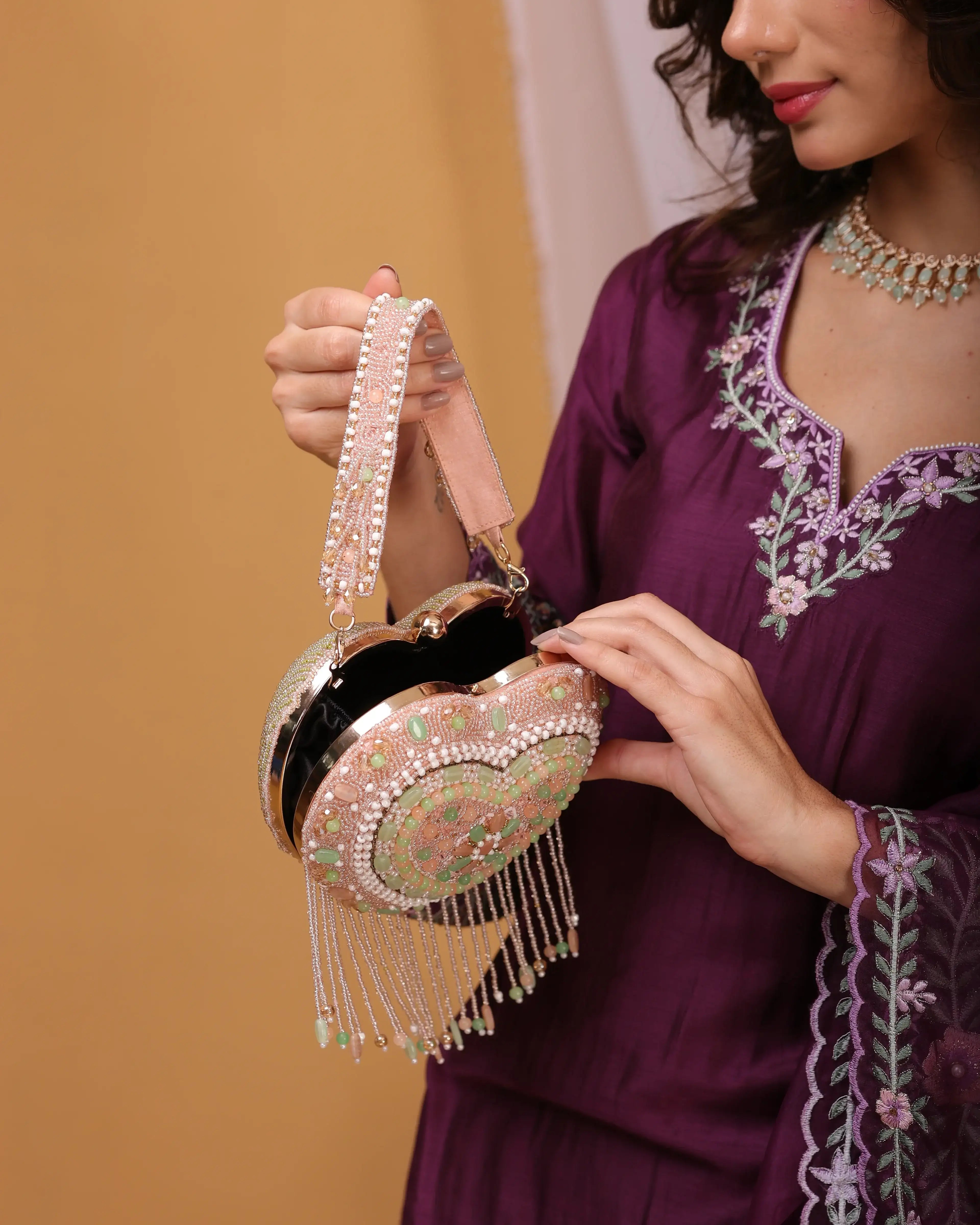 Add a touch of elegance to your ensemble with this stunning emerald pink beaded handbag. Designed in a chic crescent silhouette, this statement piece is intricately embellished with shimmering green beads, sequins, and delicate pearl accents, creating a rich texture that catches the light beautifully. The structured handle ensures comfort while carrying, making it the perfect accessory for weddings, festive occasions, or glamorous evenings out.