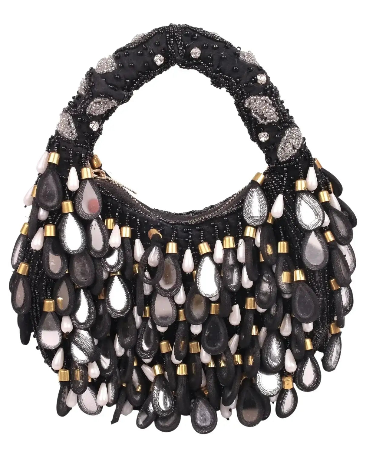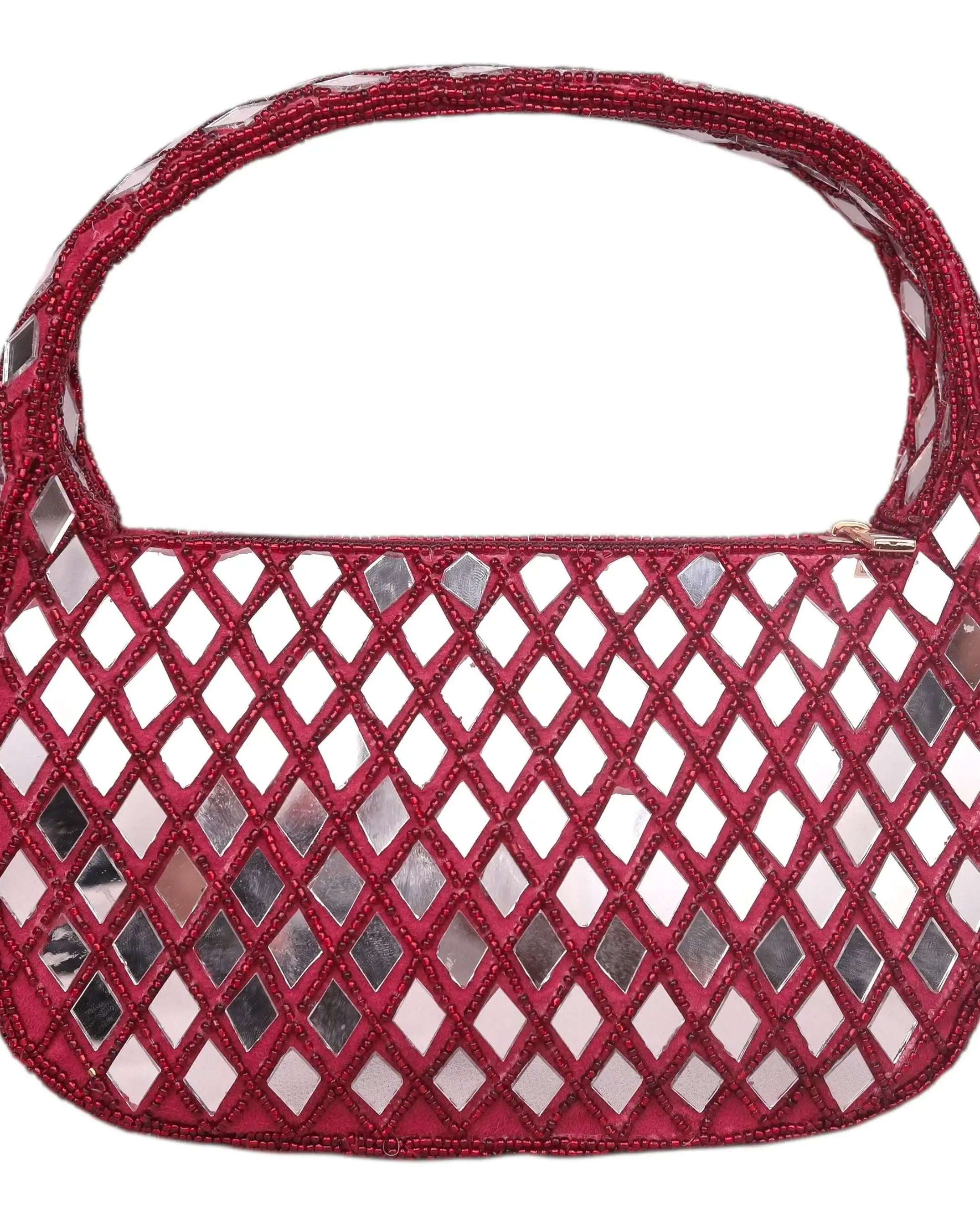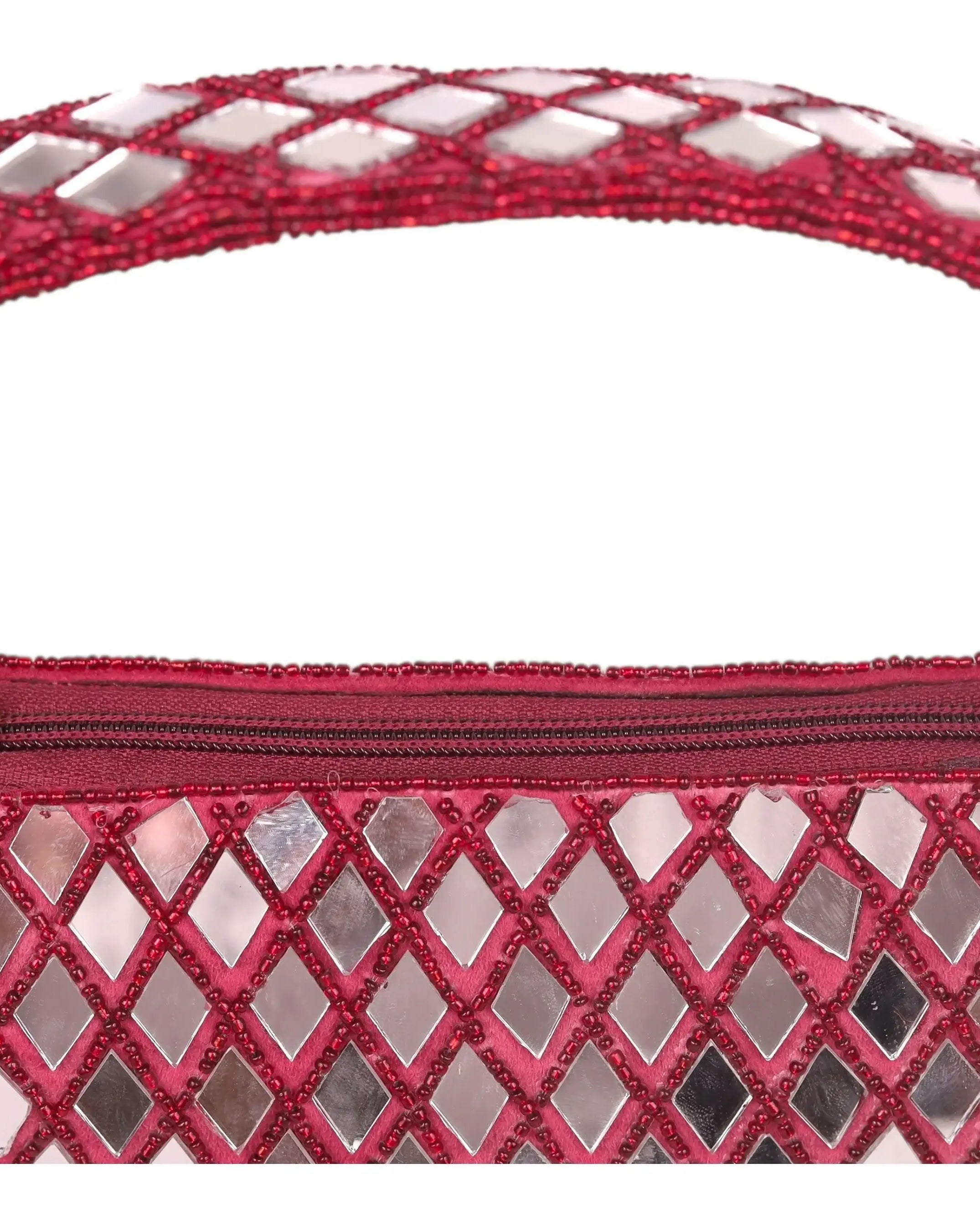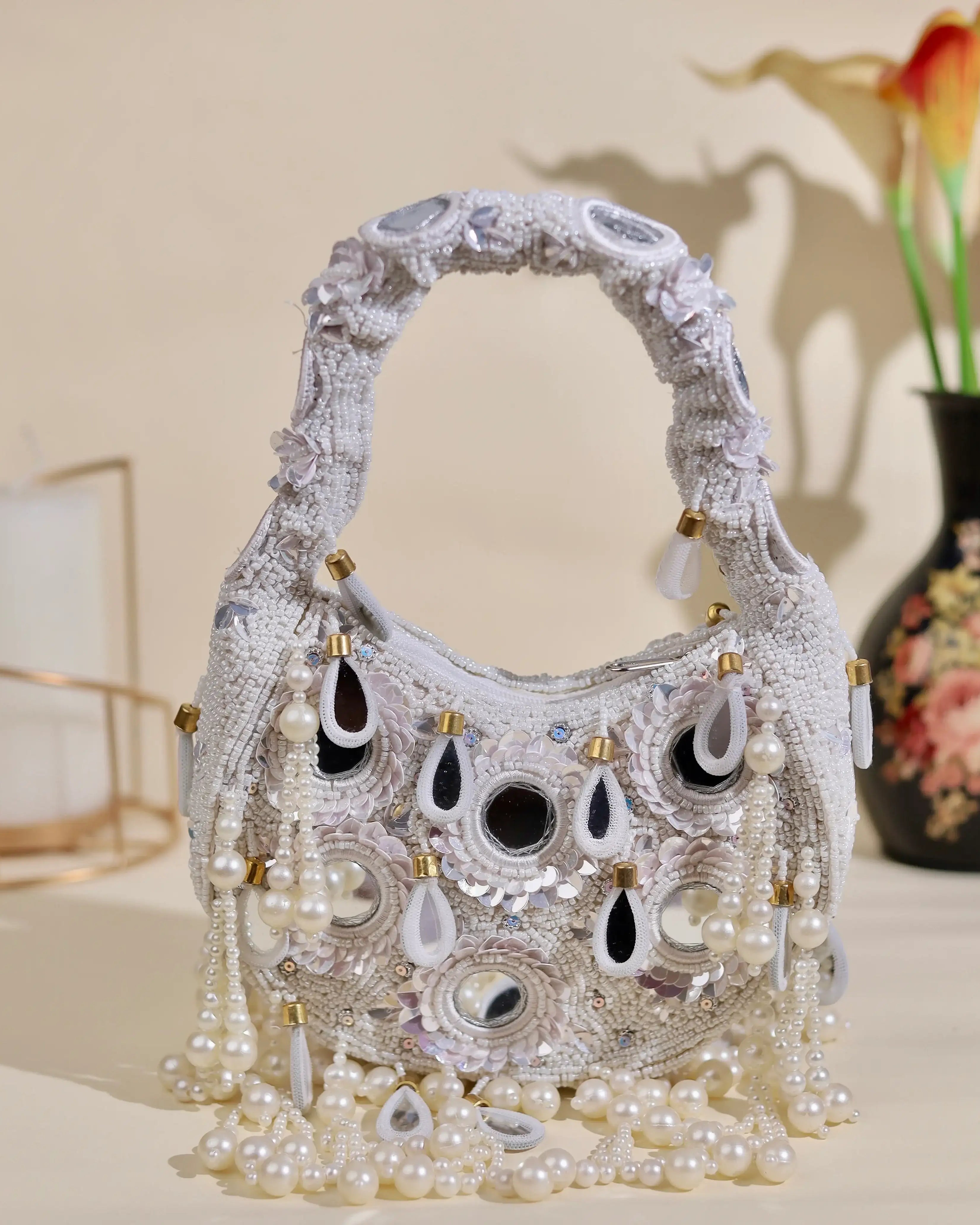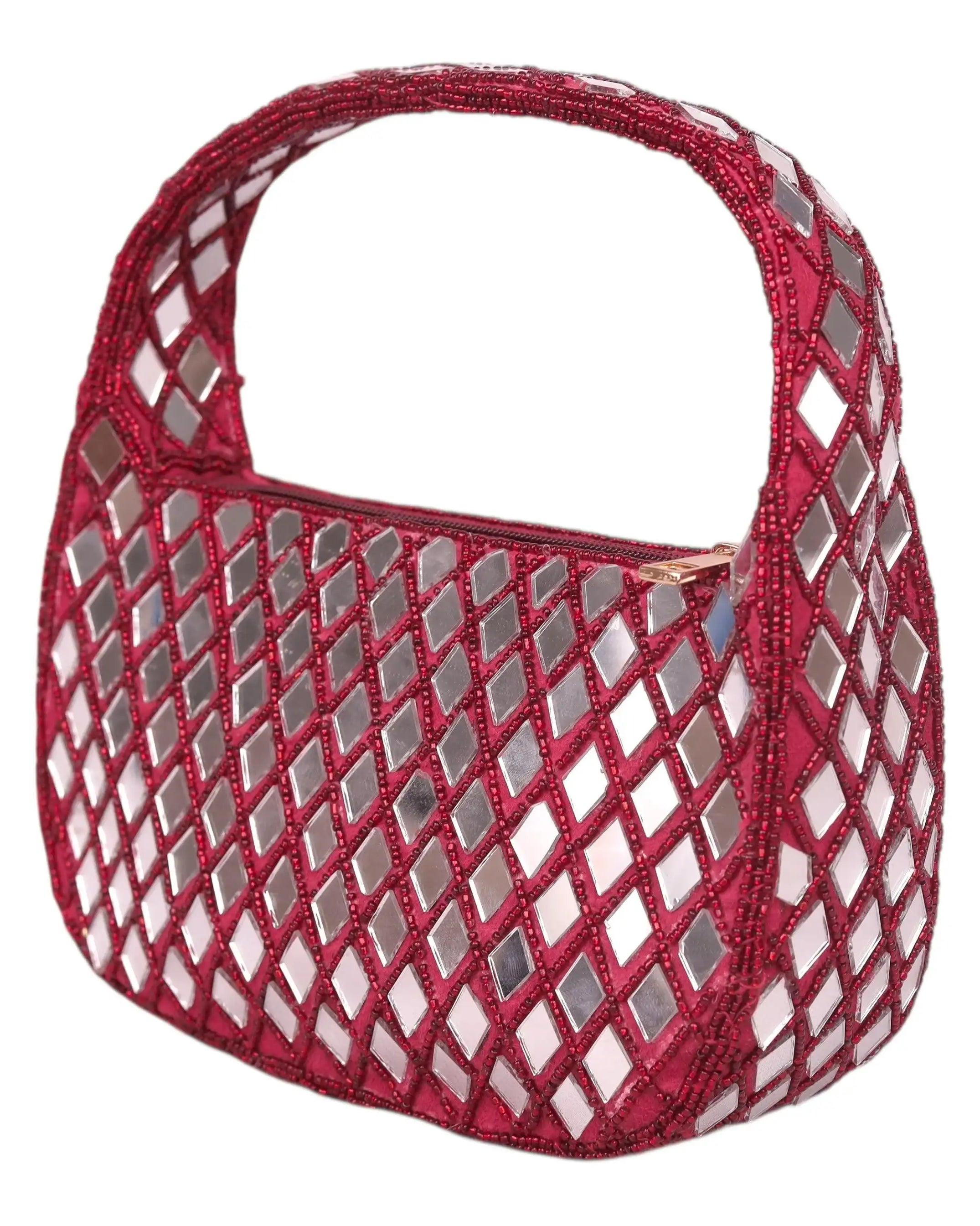 Add a touch of elegance to your ensemble with this stunning emerald pink beaded handbag. Designed in a chic crescent silhouette, this statement piece is intricately embellished with shimmering green beads, sequins, and delicate pearl accents, creating a rich texture that catches the light beautifully. The structured handle ensures comfort while carrying, making it the perfect accessory for weddings, festive occasions, or glamorous evenings out.
