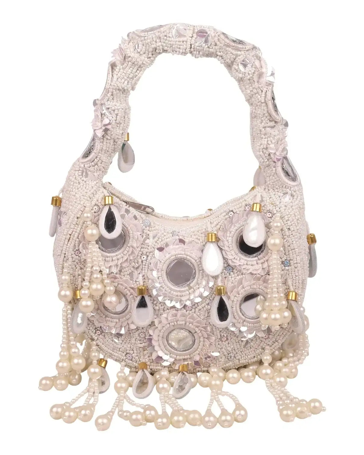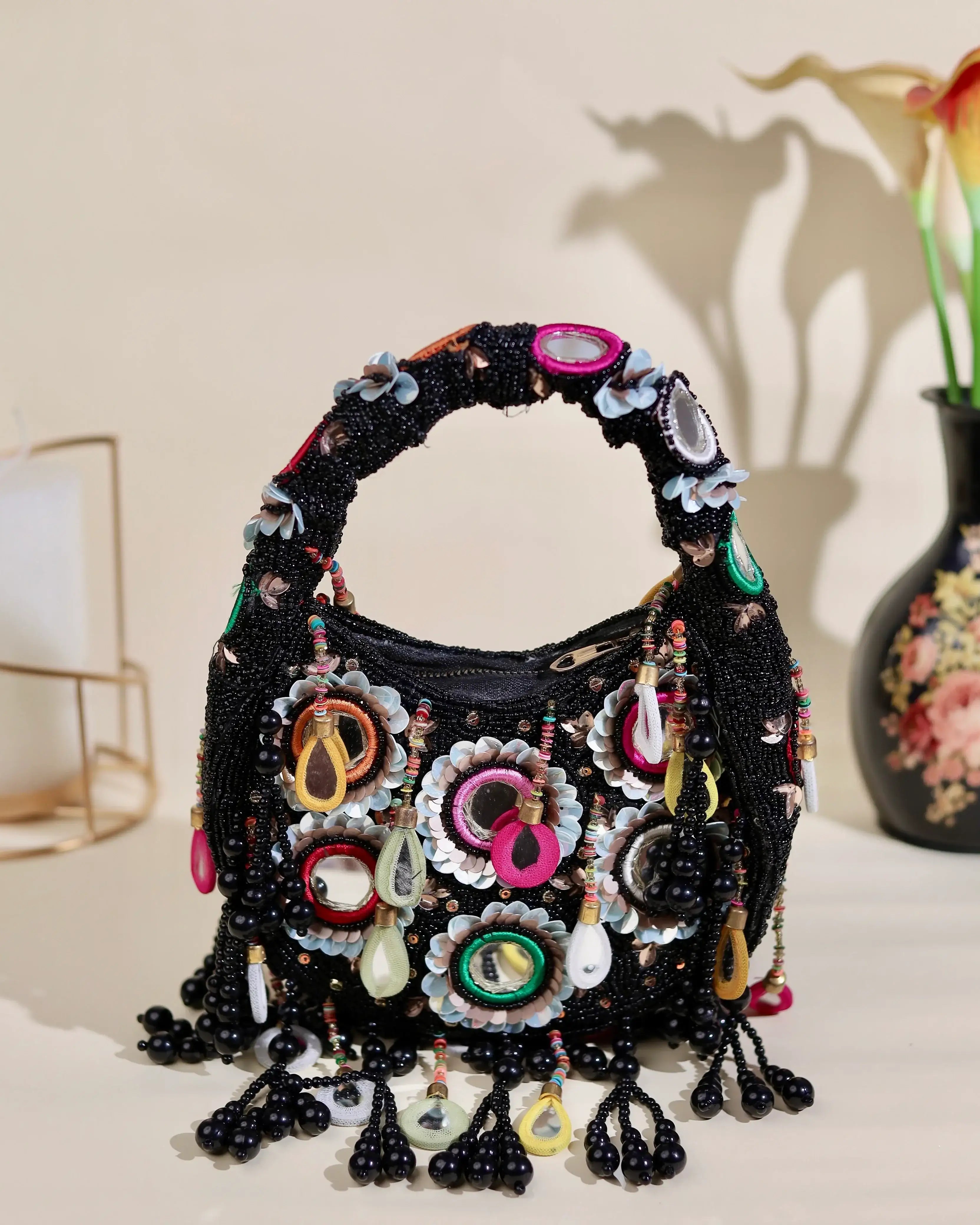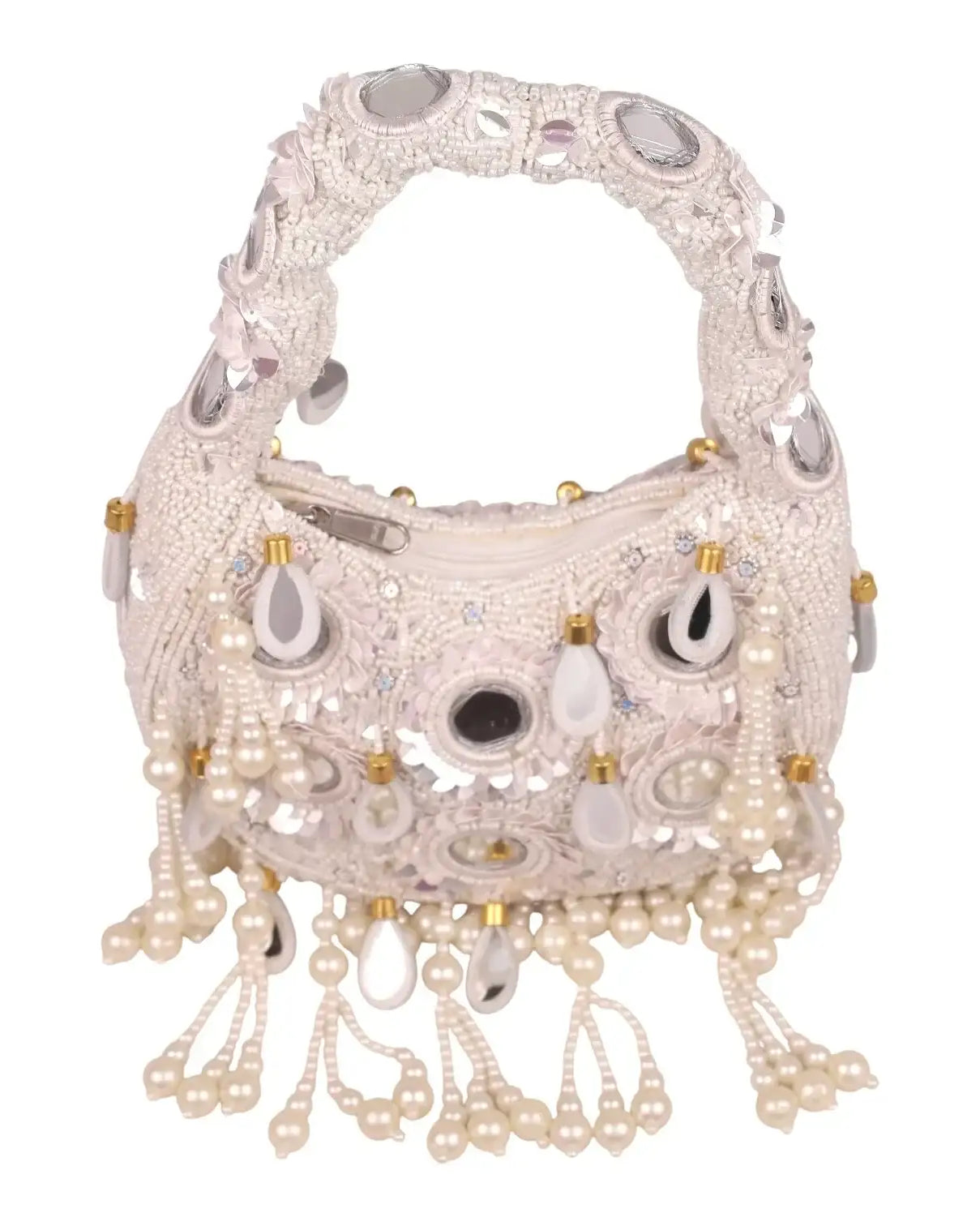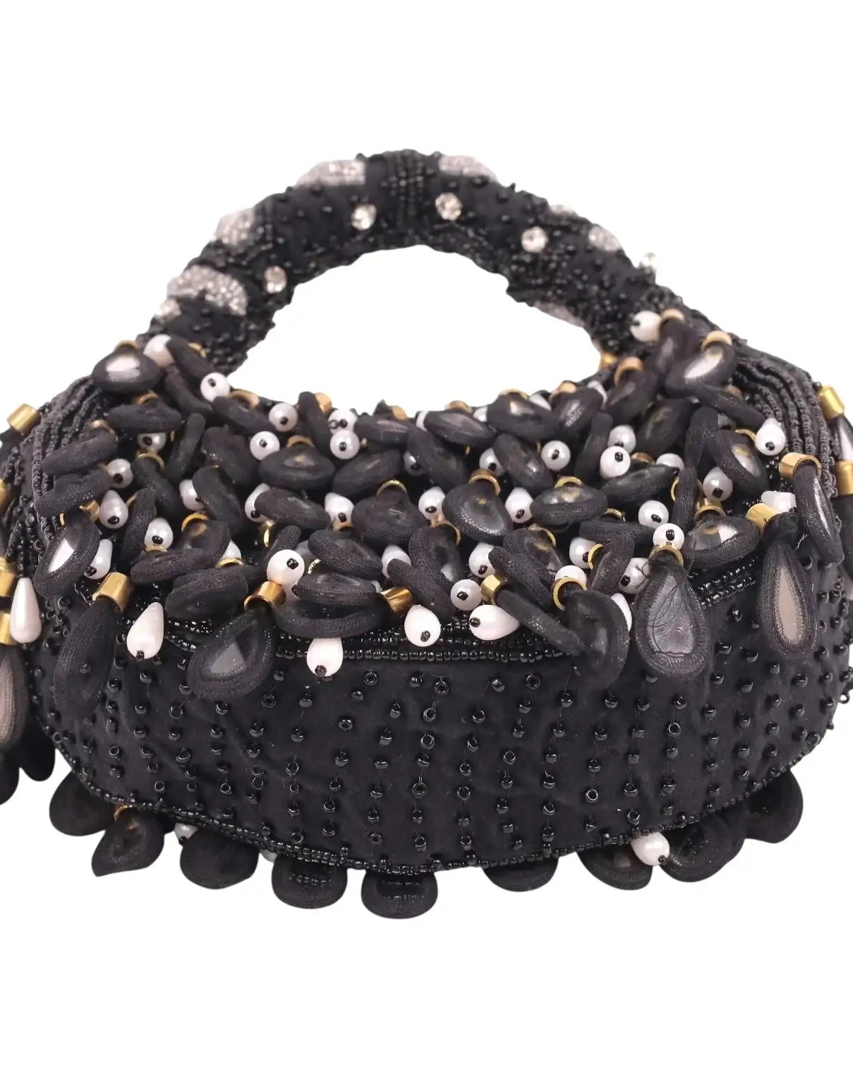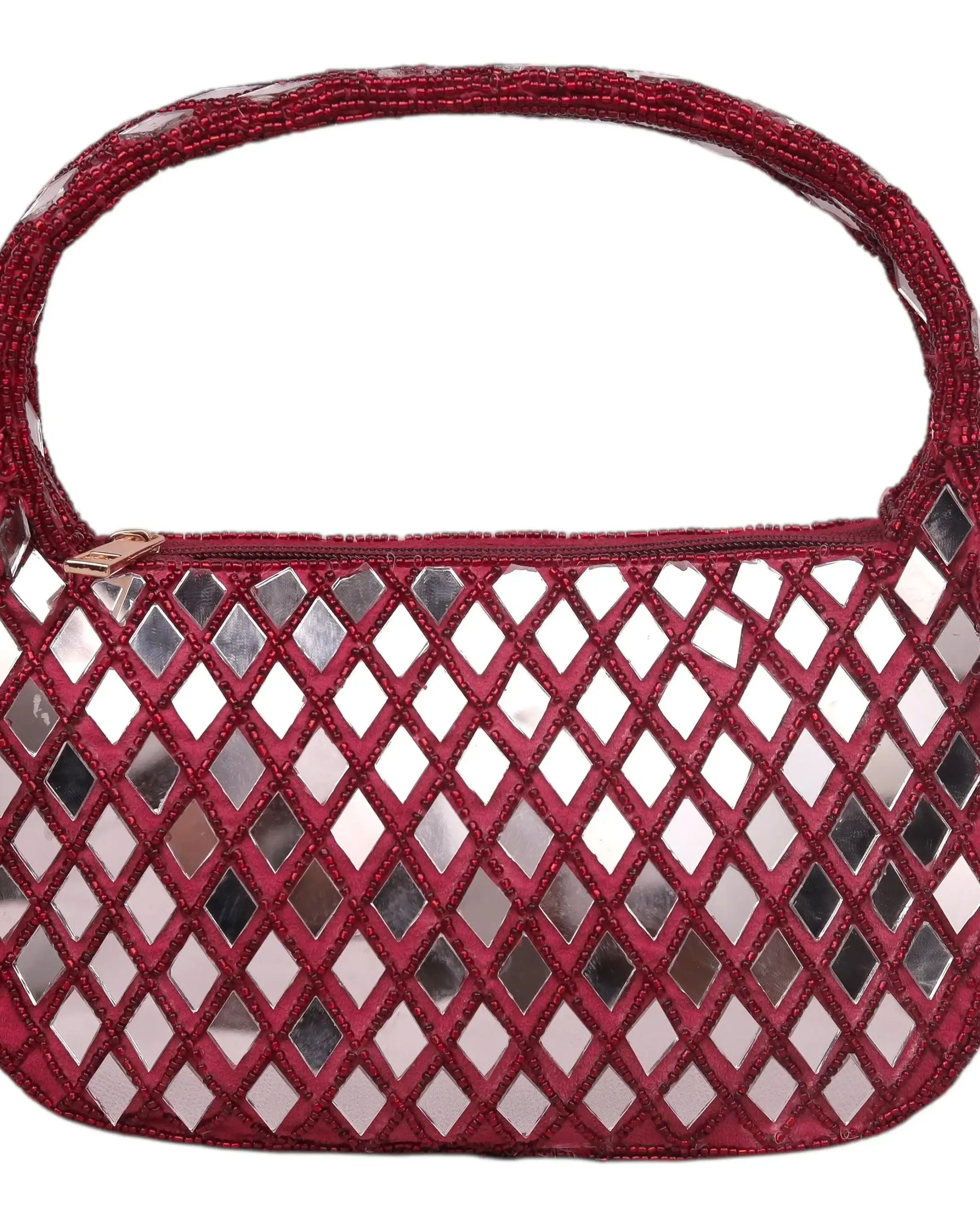 Add a touch of elegance to your ensemble with this stunning emerald pink beaded handbag. Designed in a chic crescent silhouette, this statement piece is intricately embellished with shimmering green beads, sequins, and delicate pearl accents, creating a rich texture that catches the light beautifully. The structured handle ensures comfort while carrying, making it the perfect accessory for weddings, festive occasions, or glamorous evenings out.