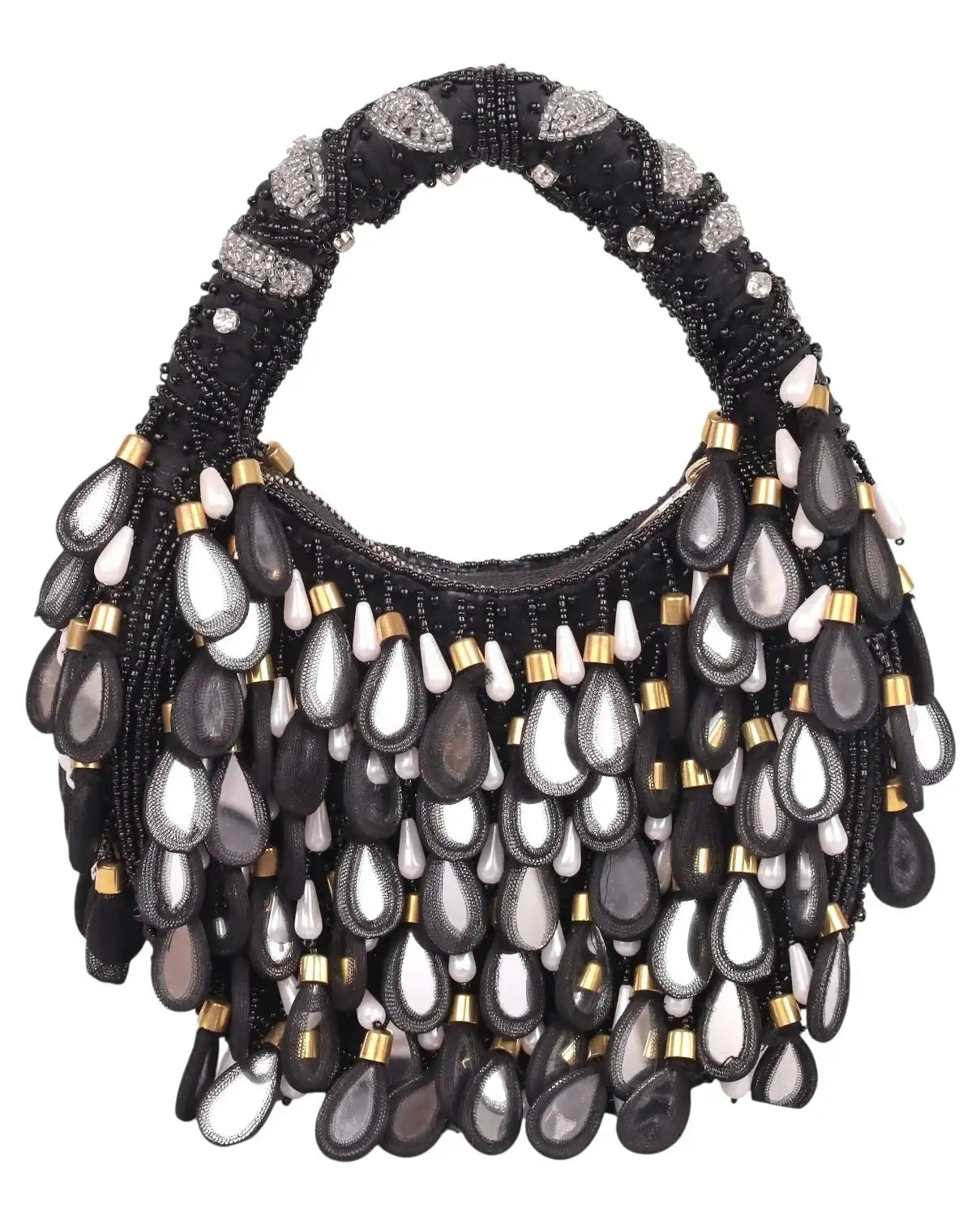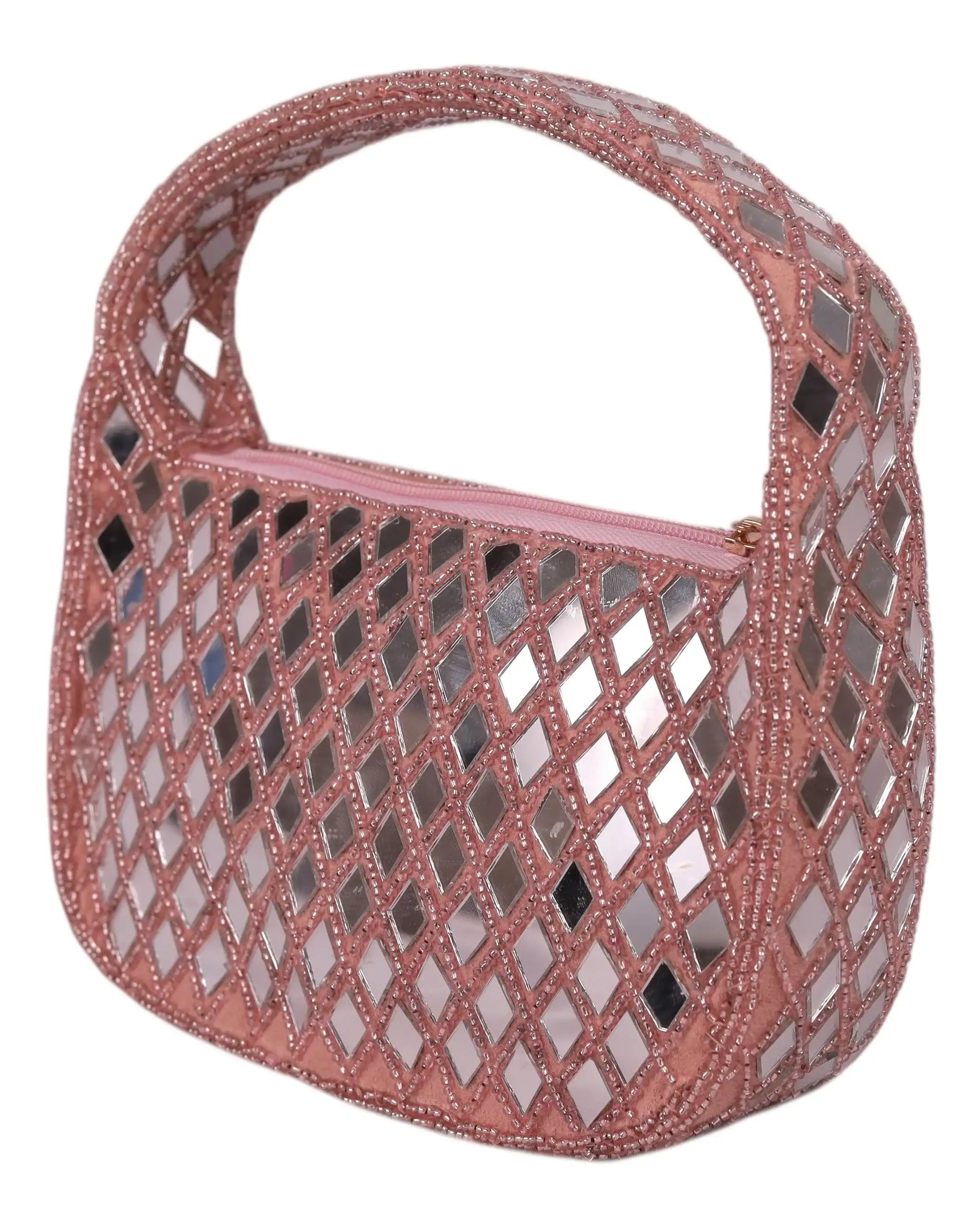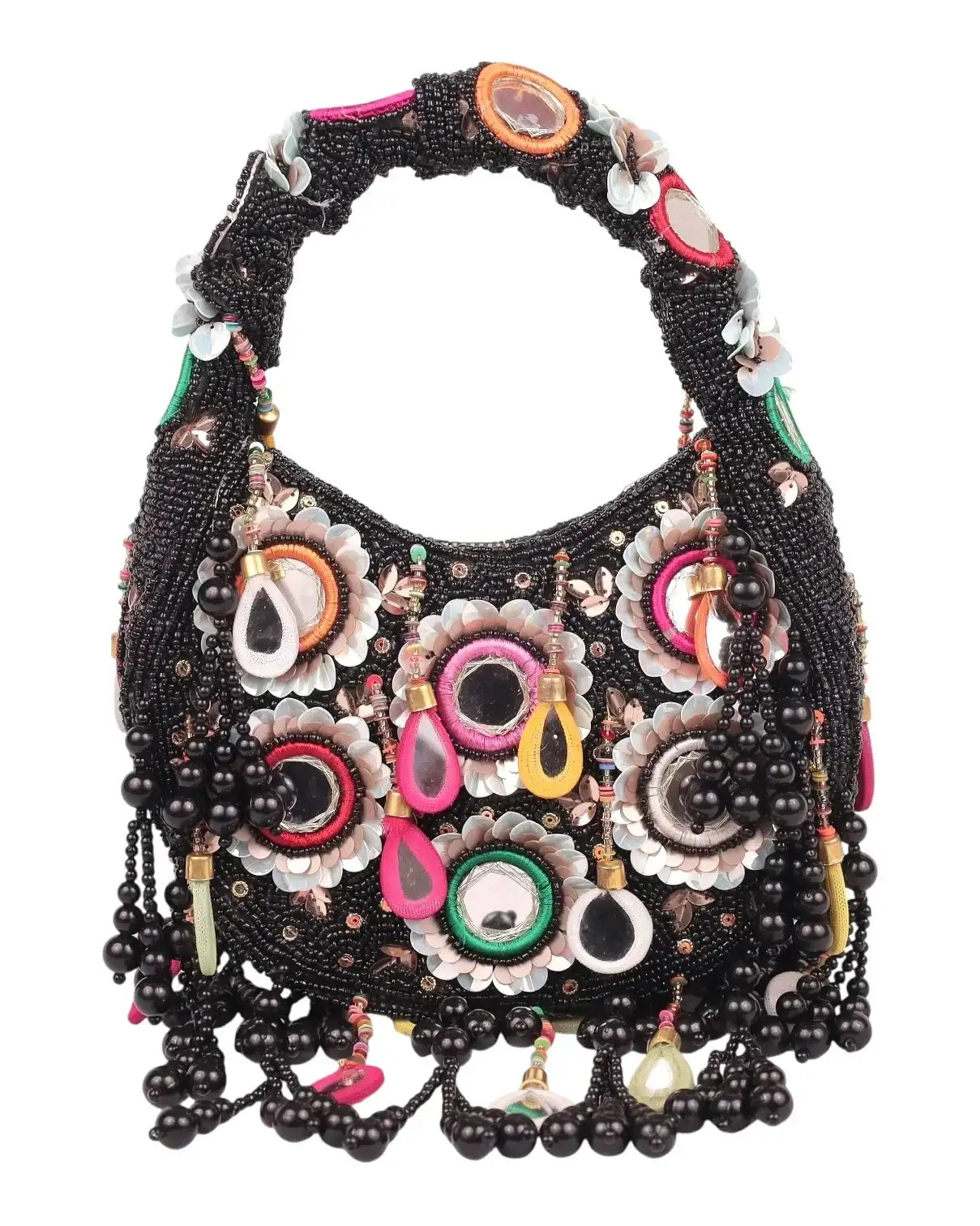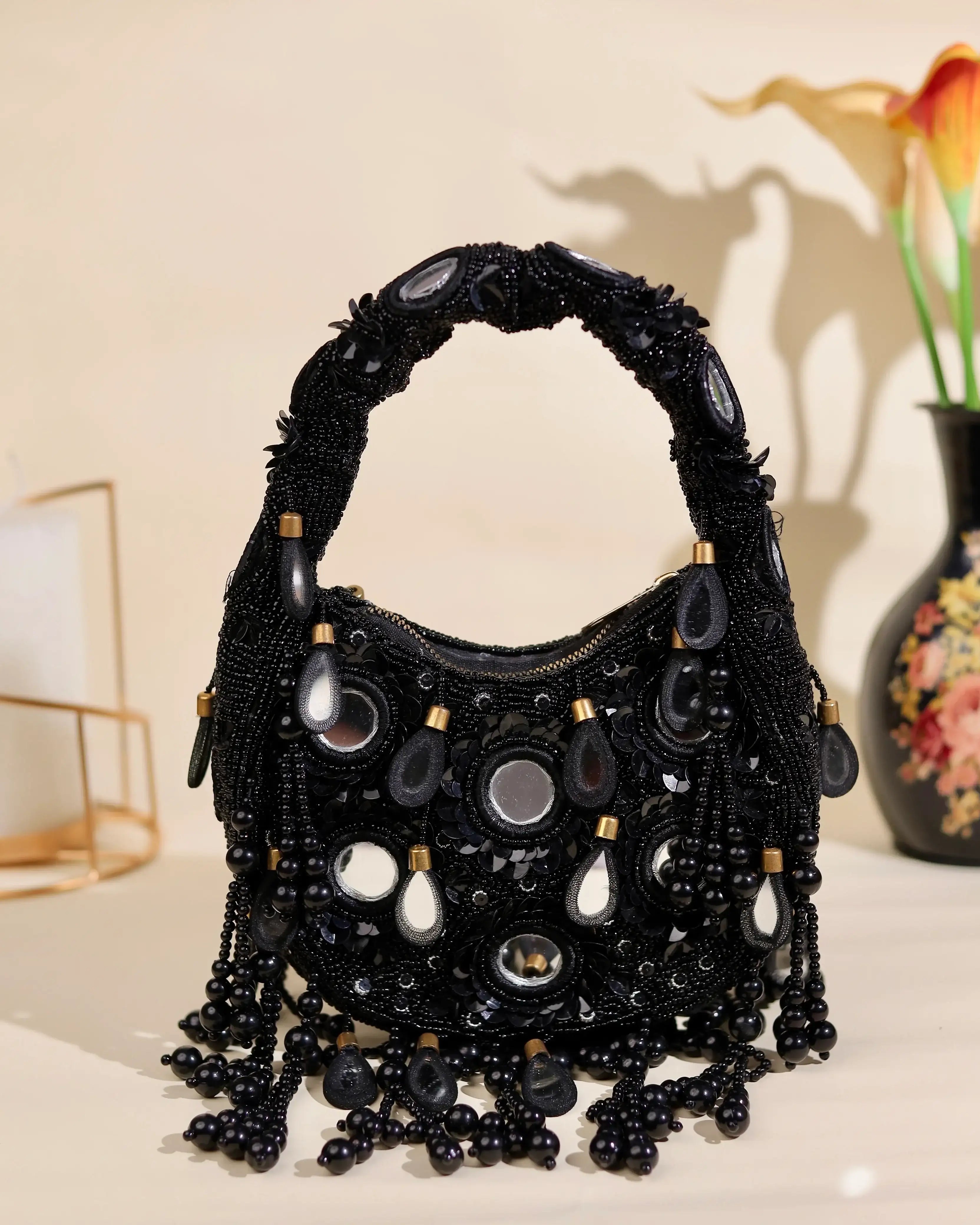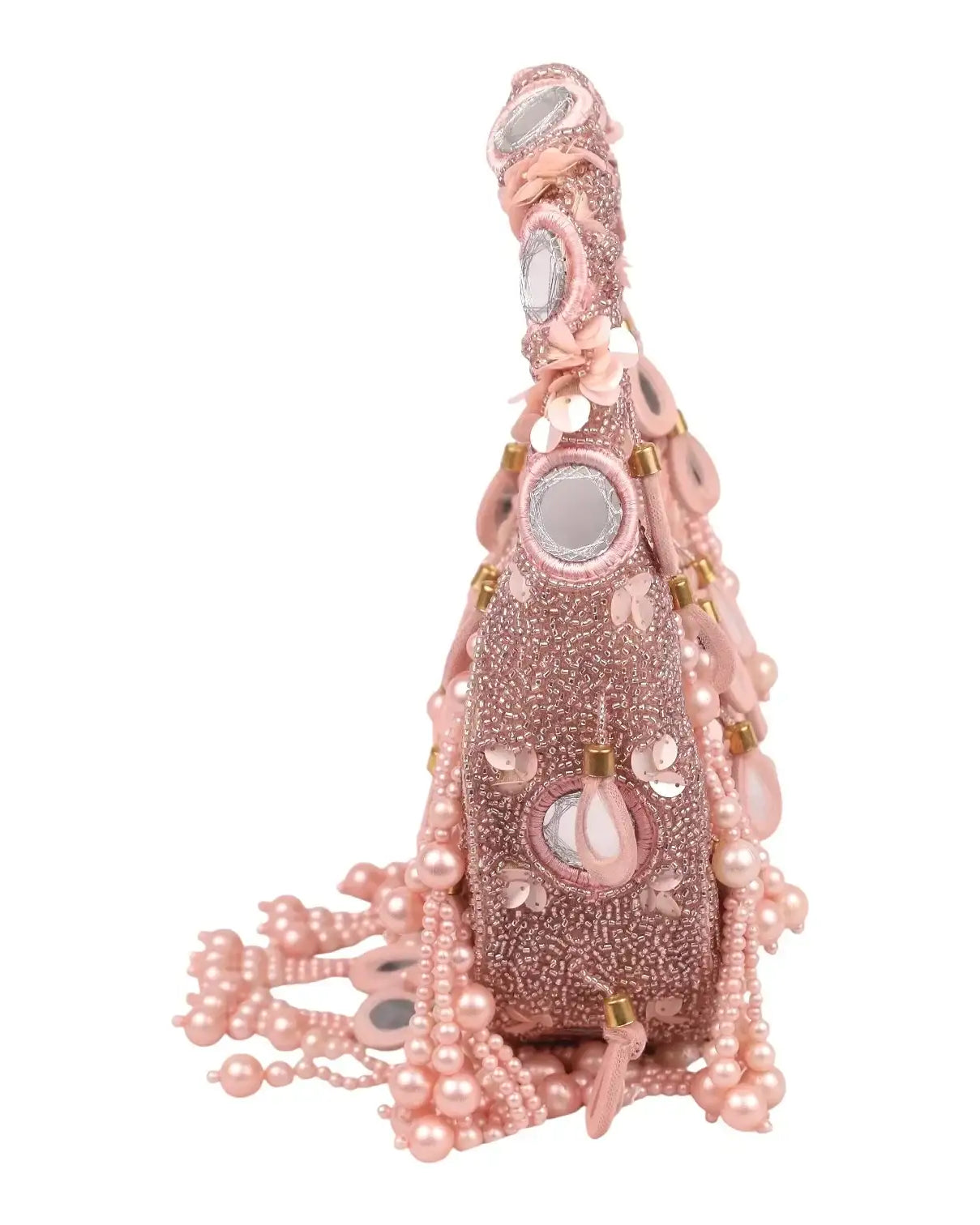 Add a touch of elegance to your ensemble with this stunning emerald pink beaded handbag. Designed in a chic crescent silhouette, this statement piece is intricately embellished with shimmering green beads, sequins, and delicate pearl accents, creating a rich texture that catches the light beautifully. The structured handle ensures comfort while carrying, making it the perfect accessory for weddings, festive occasions, or glamorous evenings out.