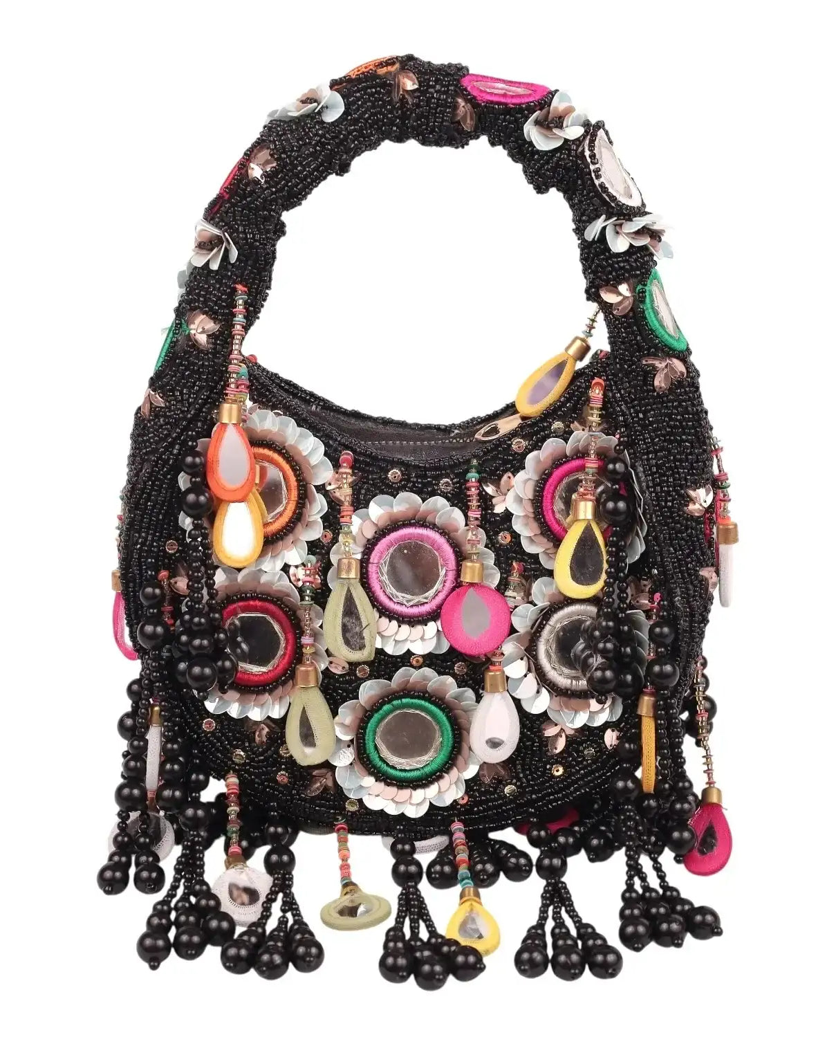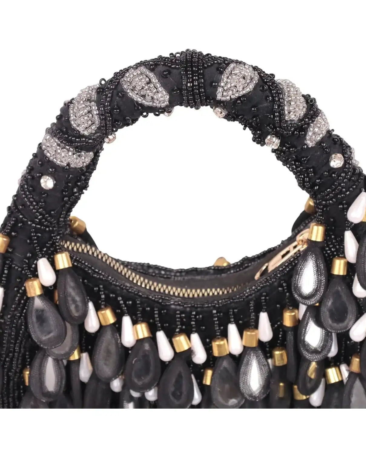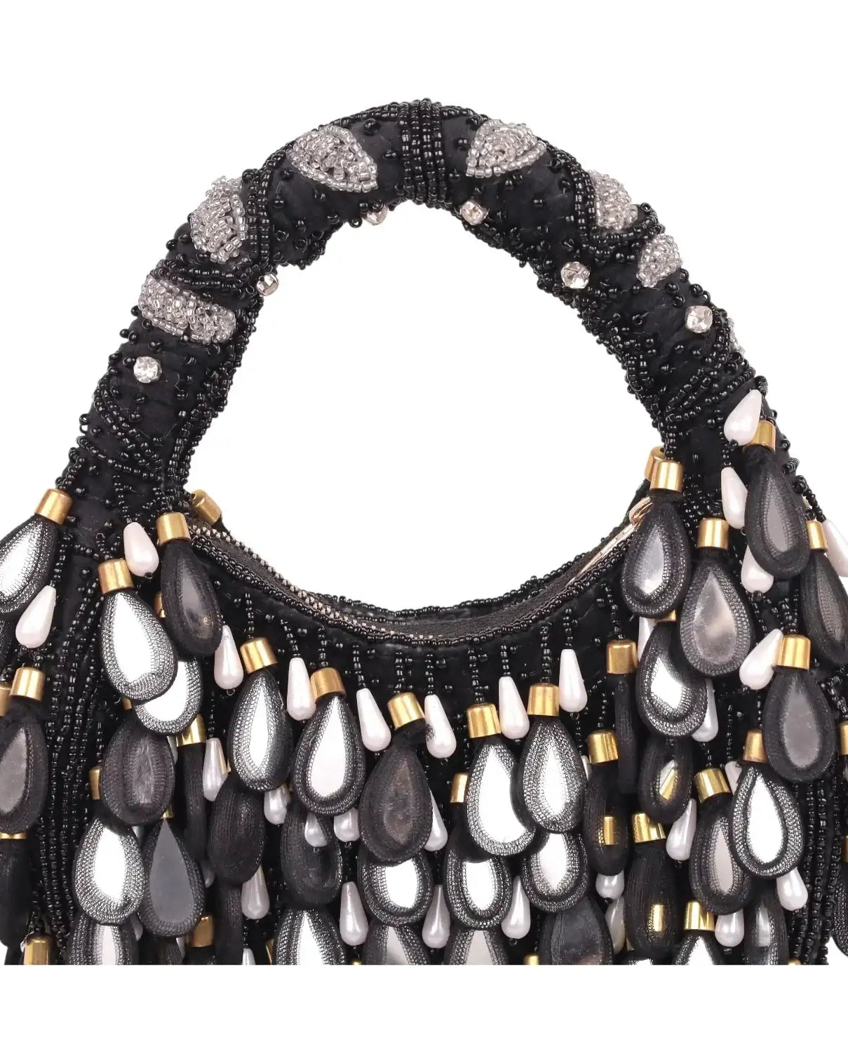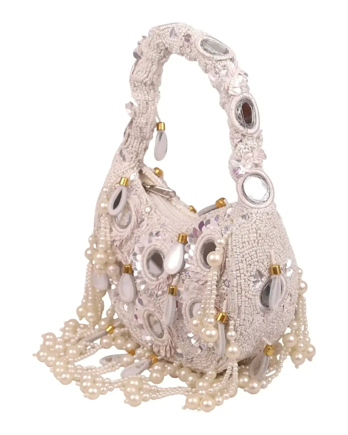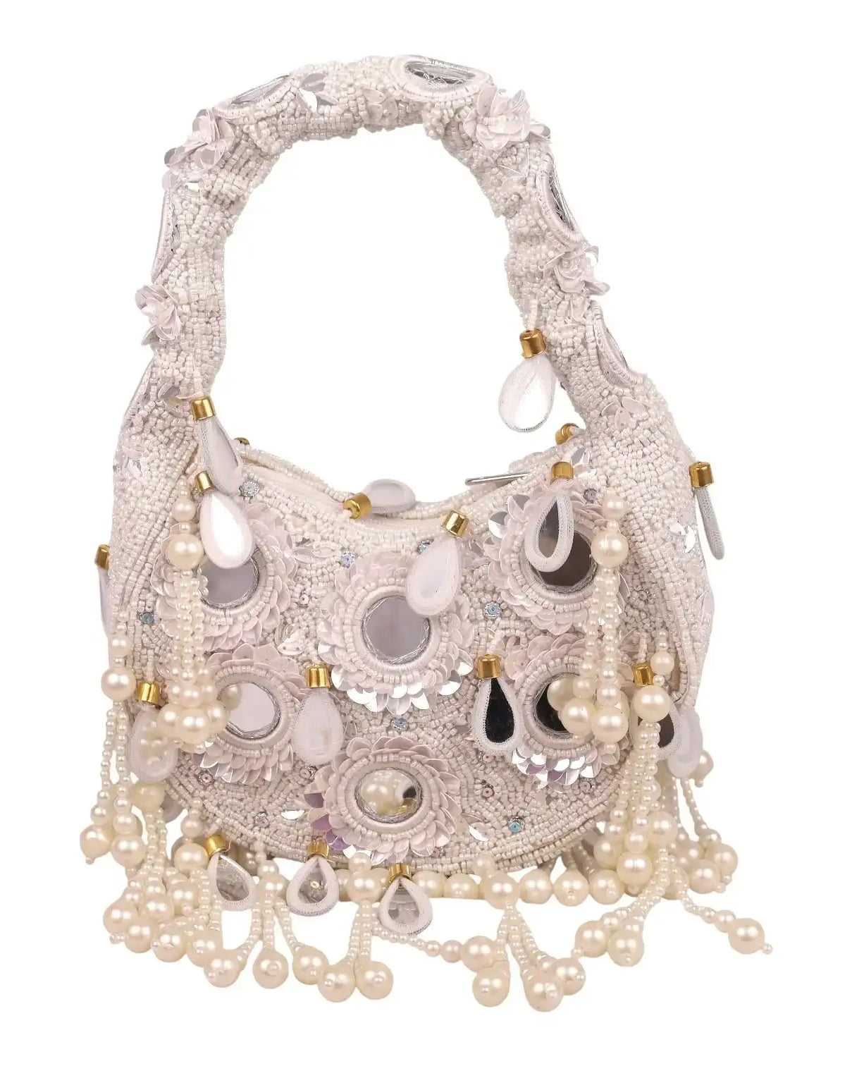 Add a touch of elegance to your ensemble with this stunning emerald pink beaded handbag. Designed in a chic crescent silhouette, this statement piece is intricately embellished with shimmering green beads, sequins, and delicate pearl accents, creating a rich texture that catches the light beautifully. The structured handle ensures comfort while carrying, making it the perfect accessory for weddings, festive occasions, or glamorous evenings out.