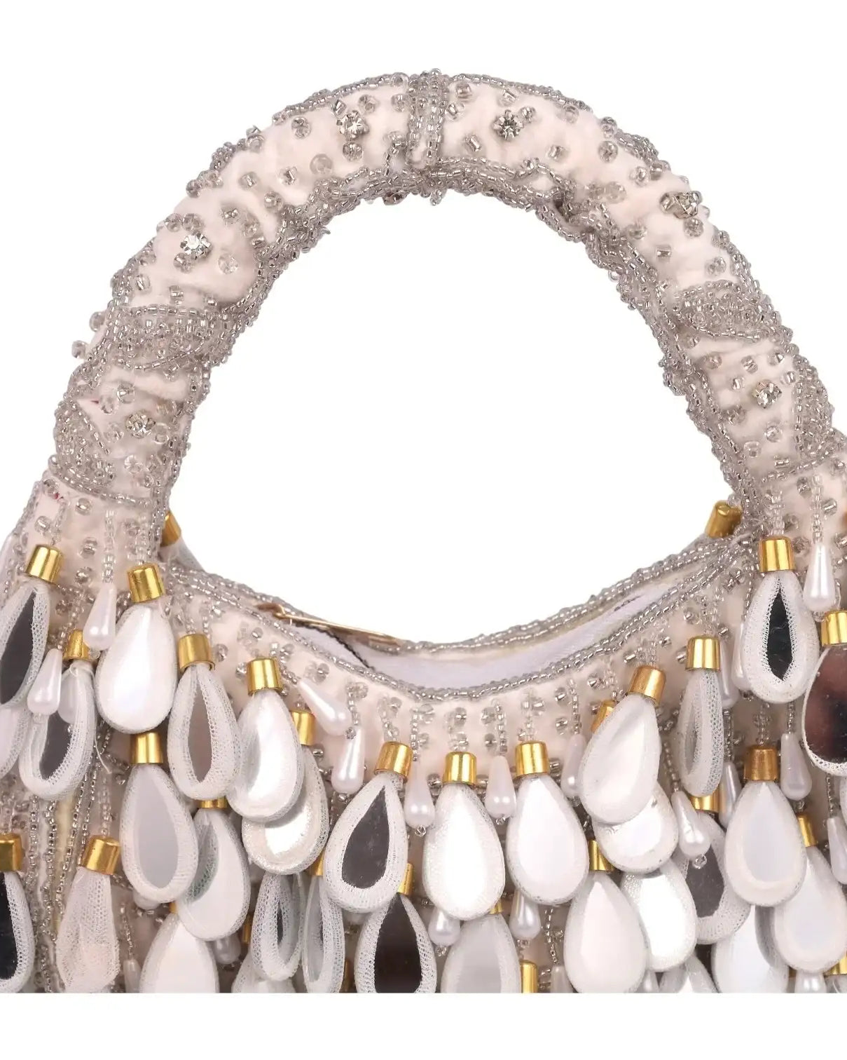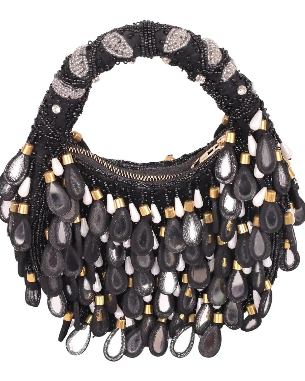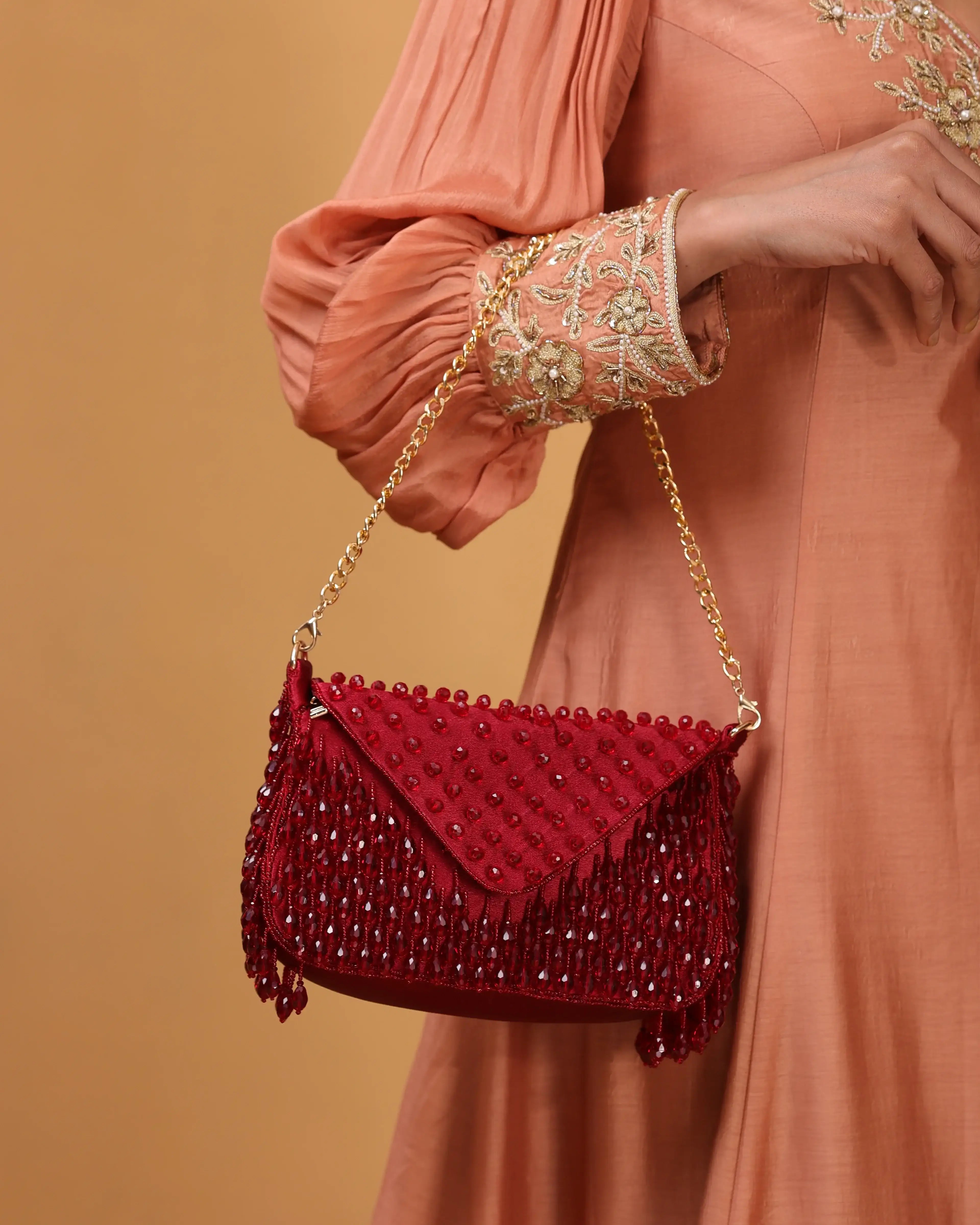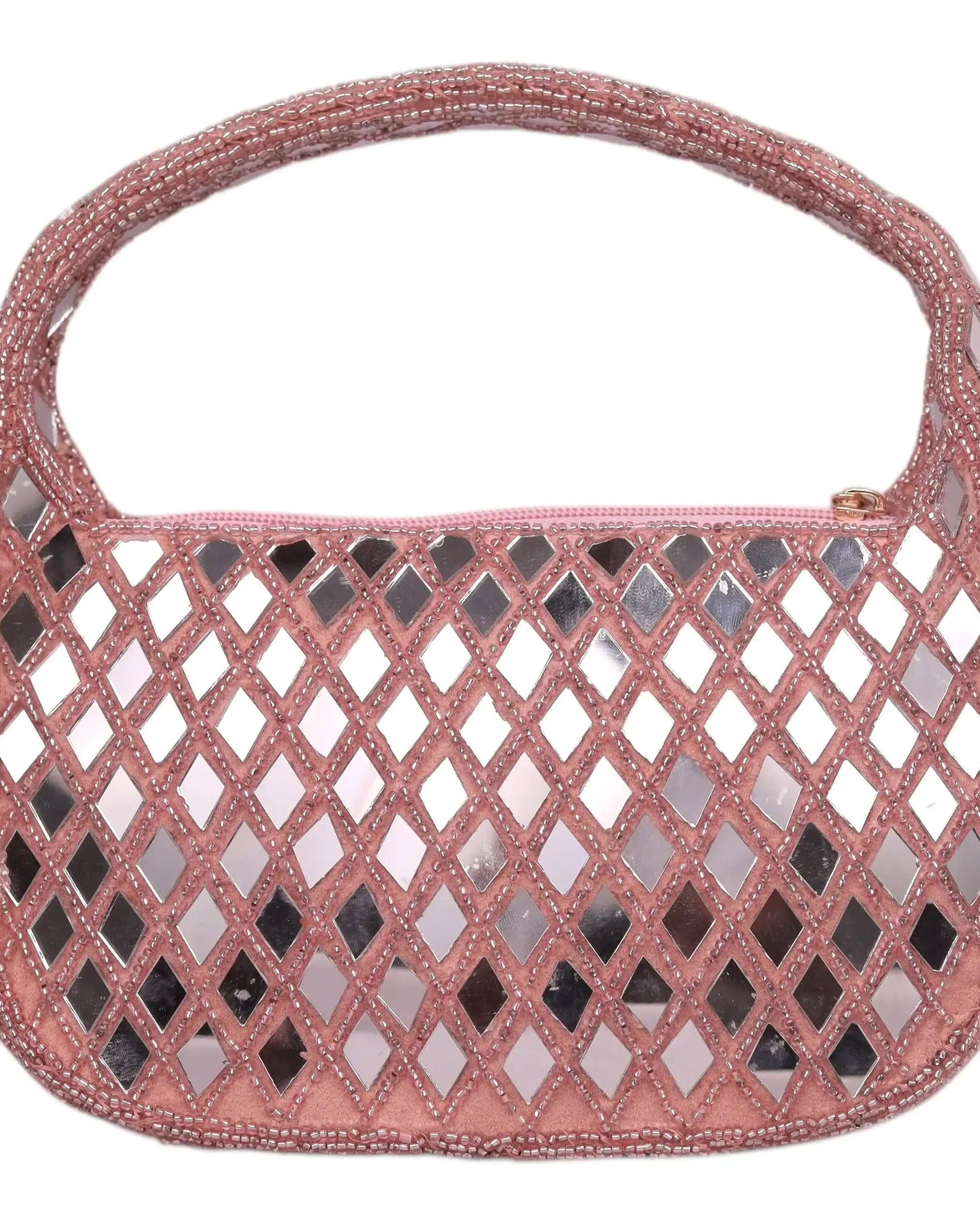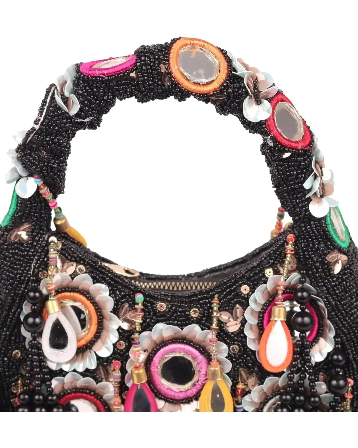 Add a touch of elegance to your ensemble with this stunning emerald pink beaded handbag. Designed in a chic crescent silhouette, this statement piece is intricately embellished with shimmering green beads, sequins, and delicate pearl accents, creating a rich texture that catches the light beautifully. The structured handle ensures comfort while carrying, making it the perfect accessory for weddings, festive occasions, or glamorous evenings out.