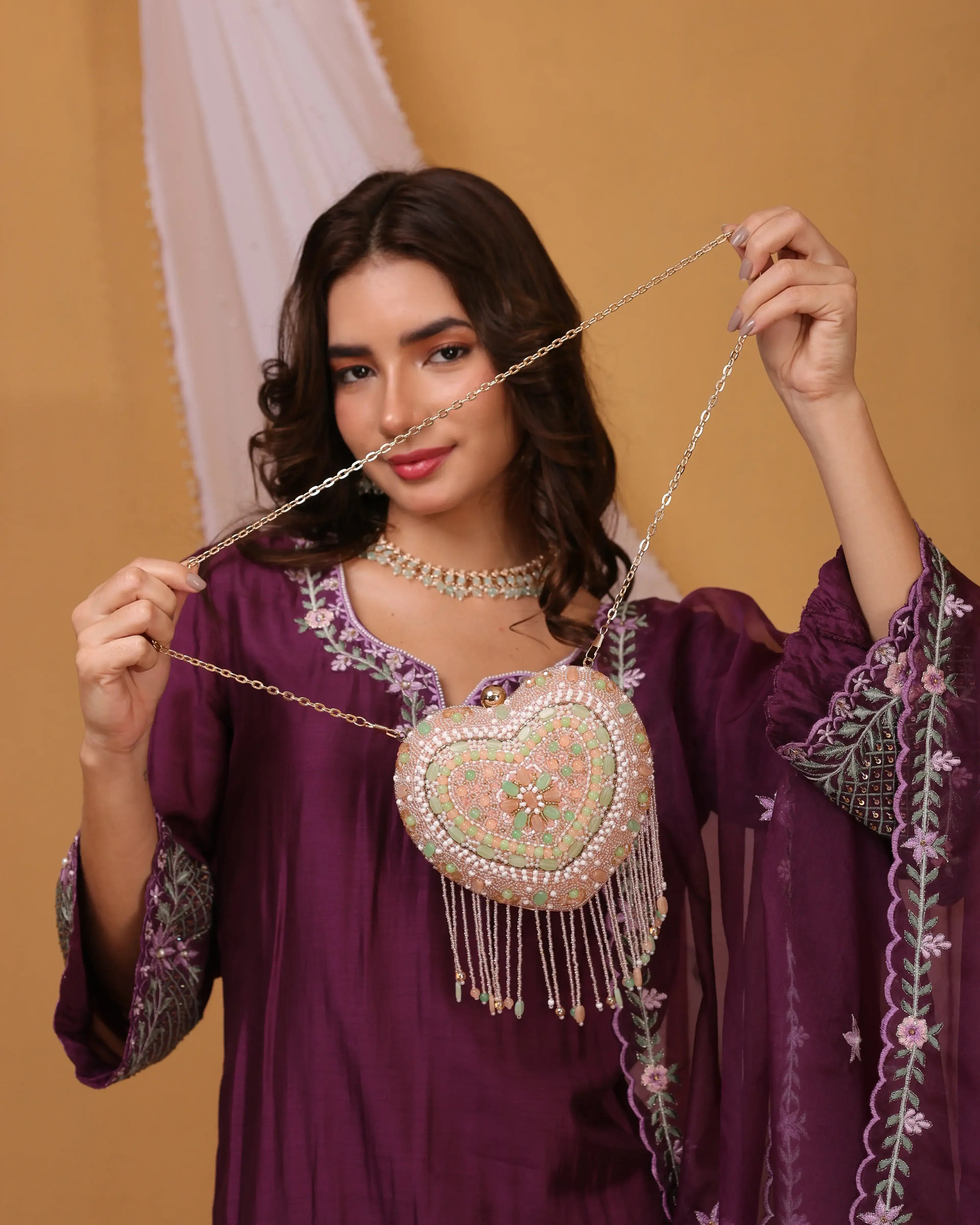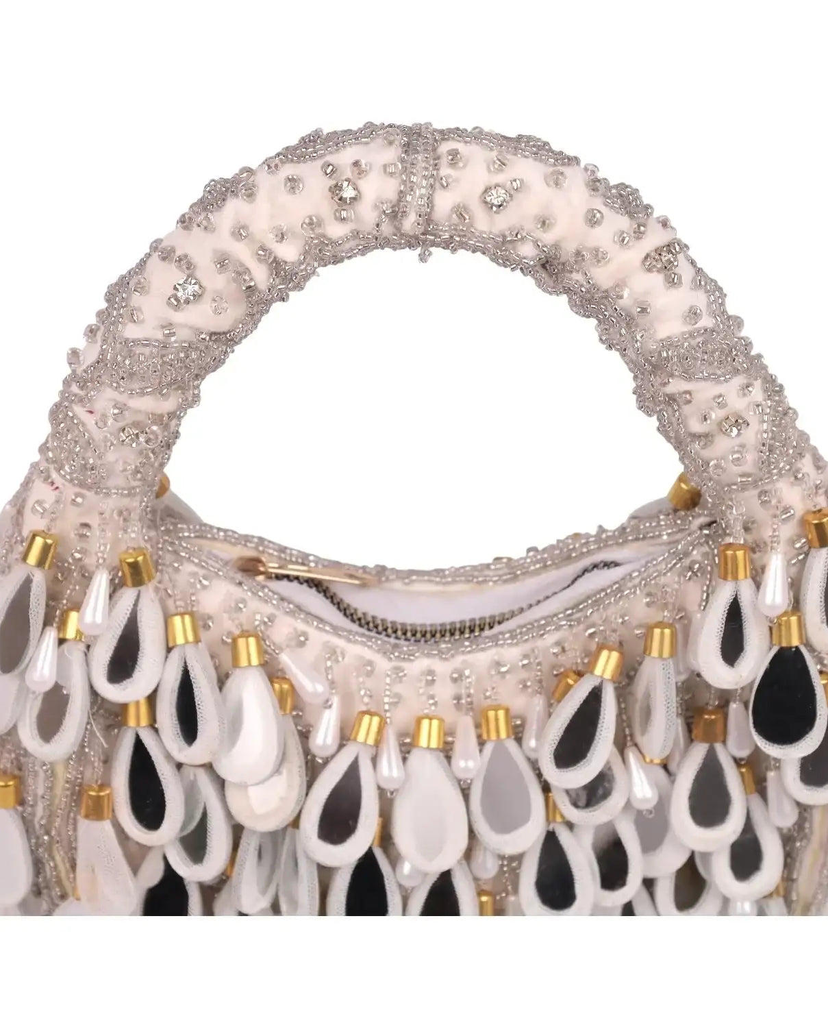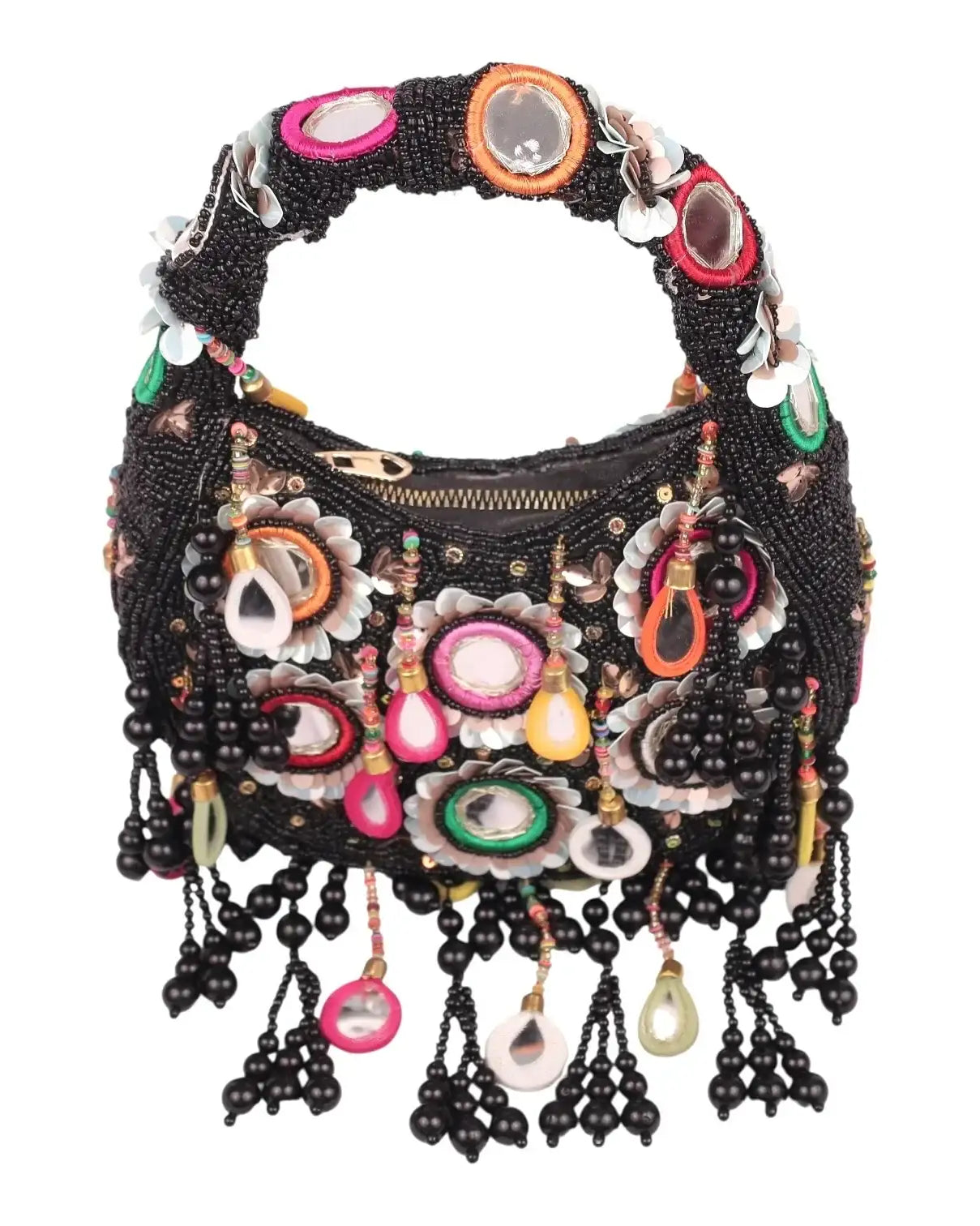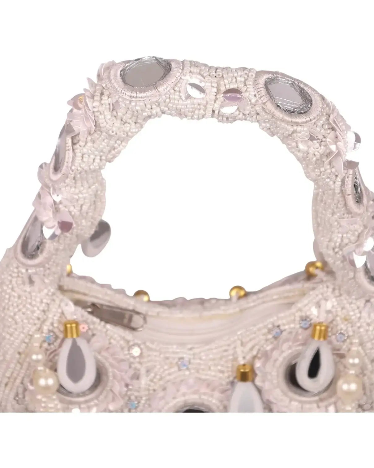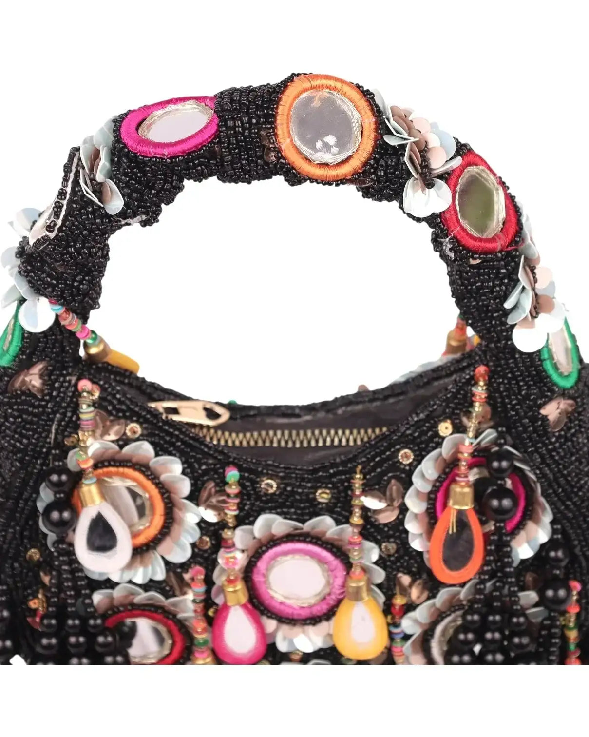 Add a touch of elegance to your ensemble with this stunning emerald pink beaded handbag. Designed in a chic crescent silhouette, this statement piece is intricately embellished with shimmering green beads, sequins, and delicate pearl accents, creating a rich texture that catches the light beautifully. The structured handle ensures comfort while carrying, making it the perfect accessory for weddings, festive occasions, or glamorous evenings out.