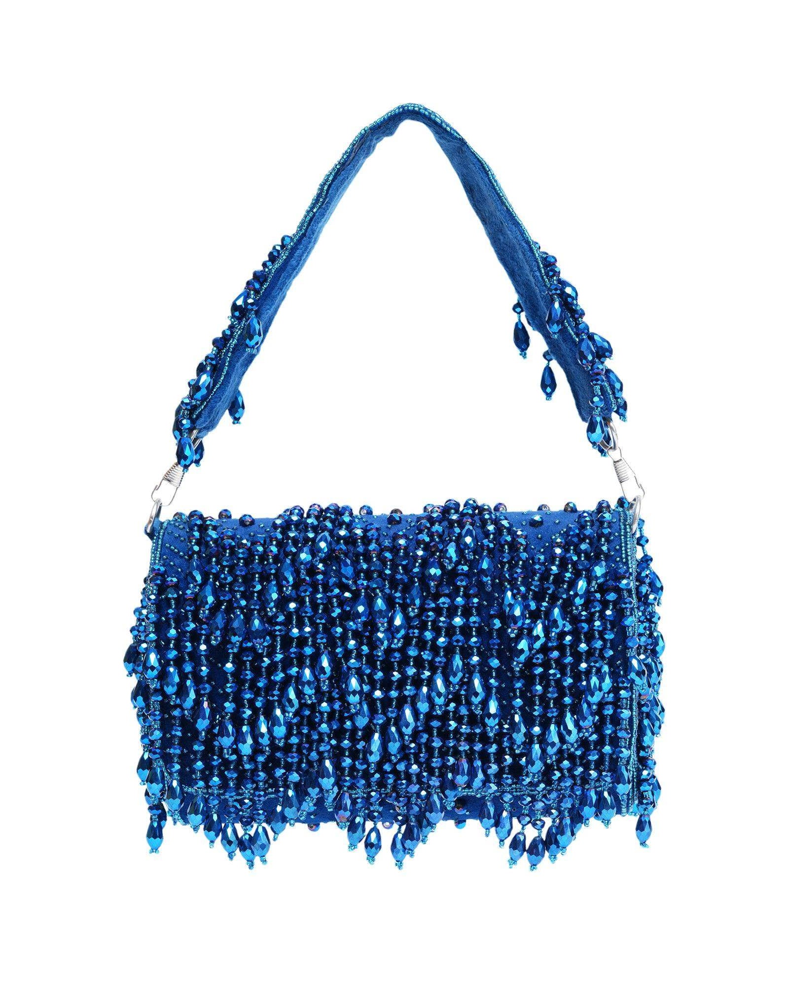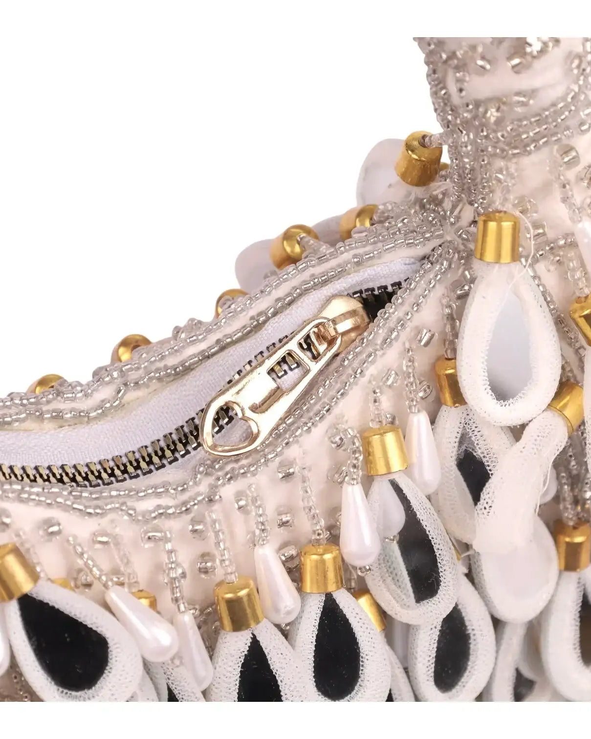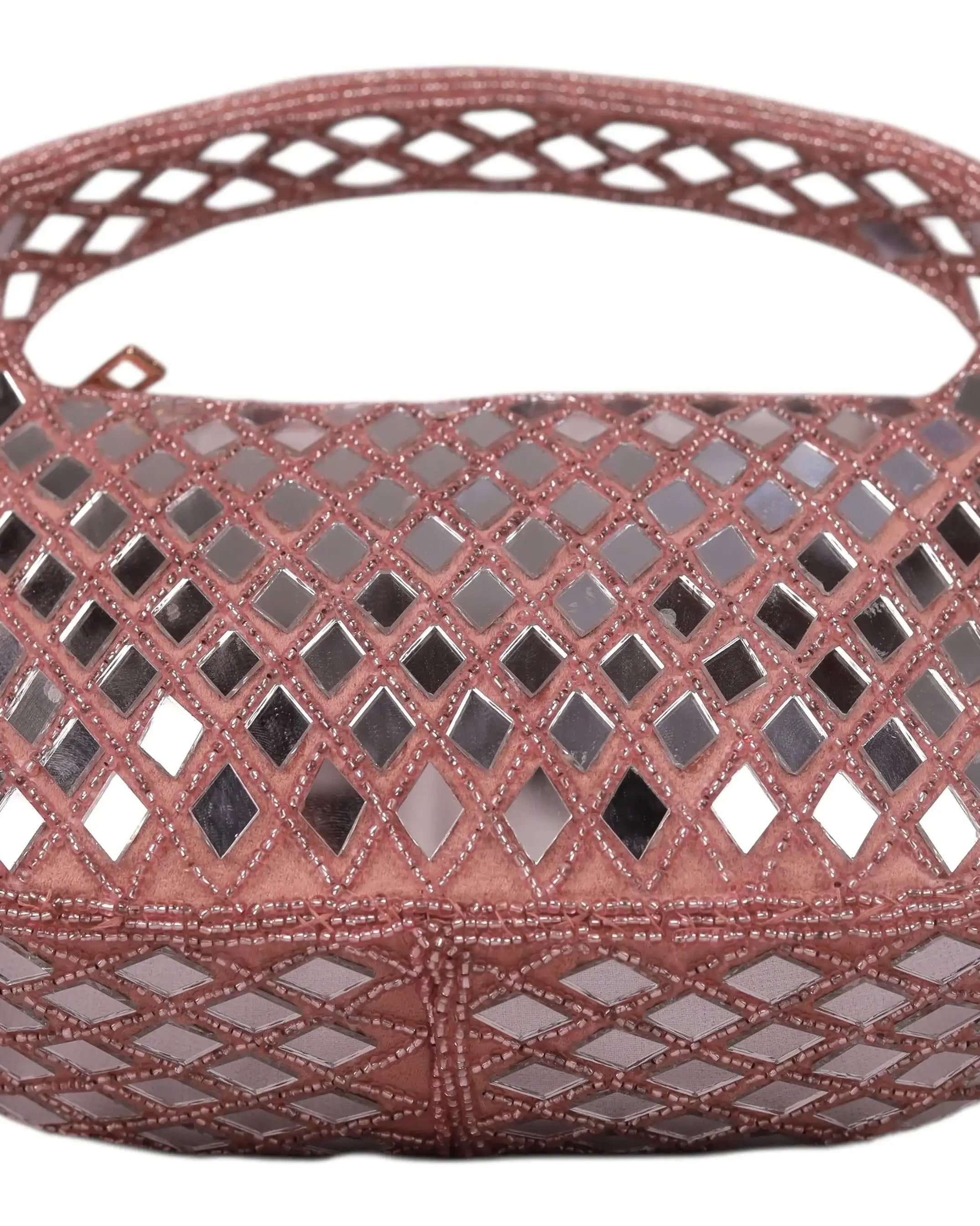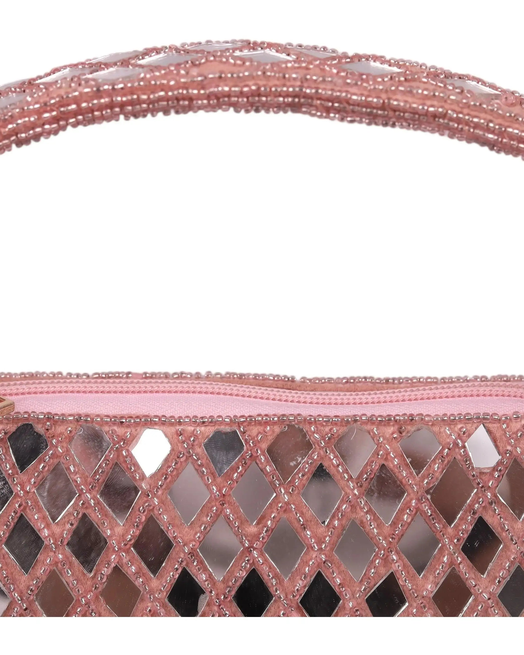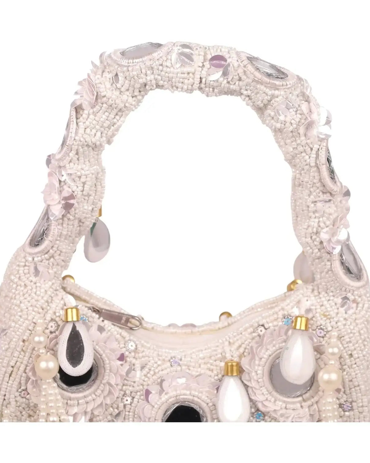 Add a touch of elegance to your ensemble with this stunning emerald pink beaded handbag. Designed in a chic crescent silhouette, this statement piece is intricately embellished with shimmering green beads, sequins, and delicate pearl accents, creating a rich texture that catches the light beautifully. The structured handle ensures comfort while carrying, making it the perfect accessory for weddings, festive occasions, or glamorous evenings out.