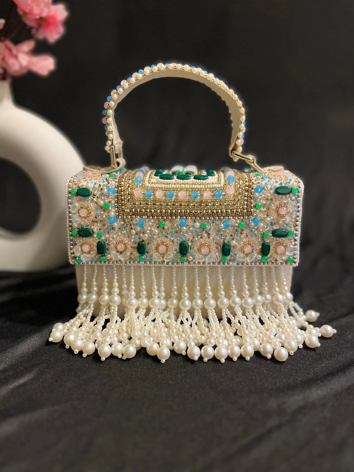 - Features: This Embellished clutch for women has metal lock closure, detachable metal sling and pearl chain