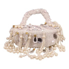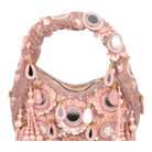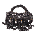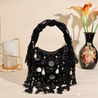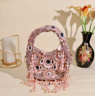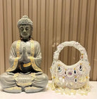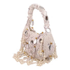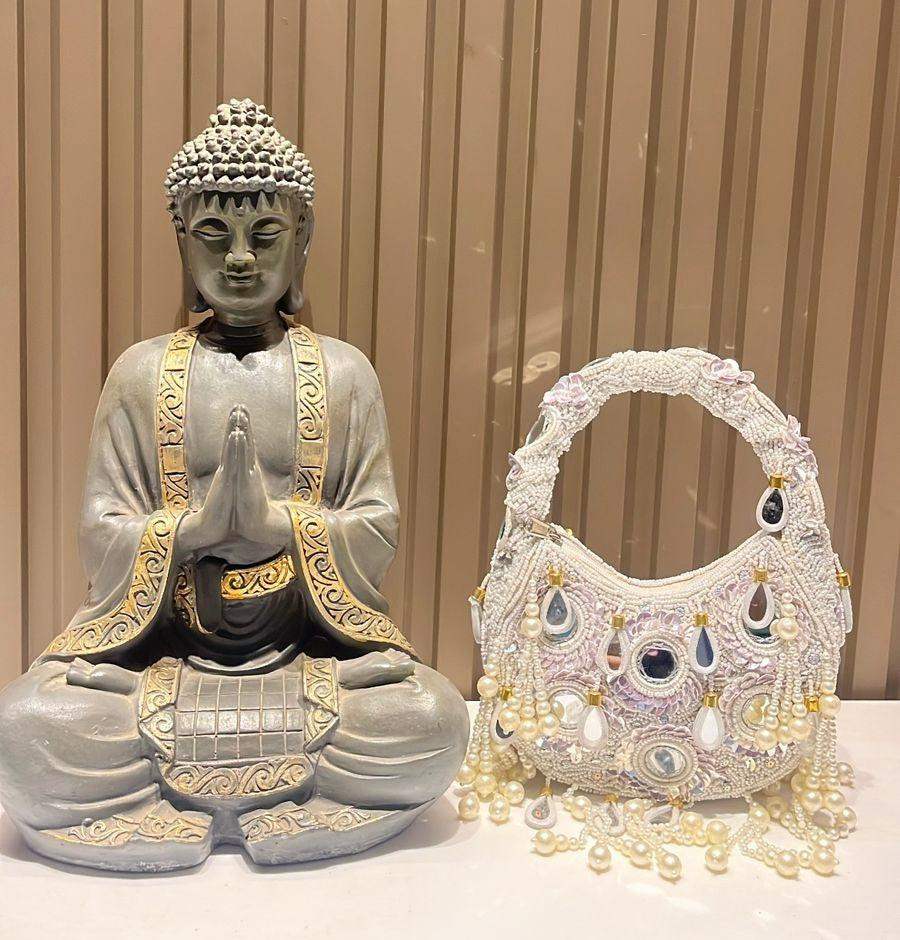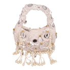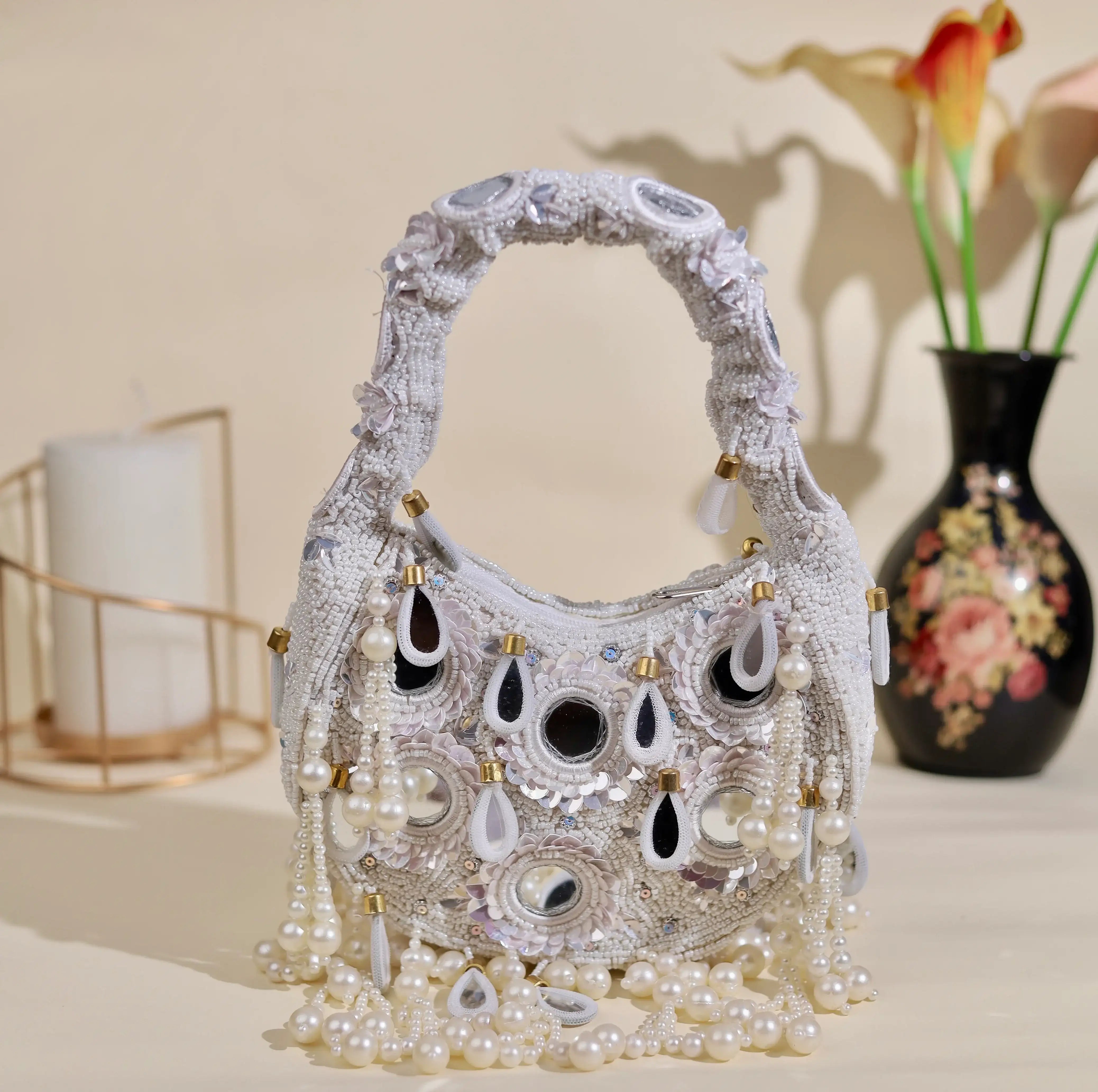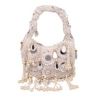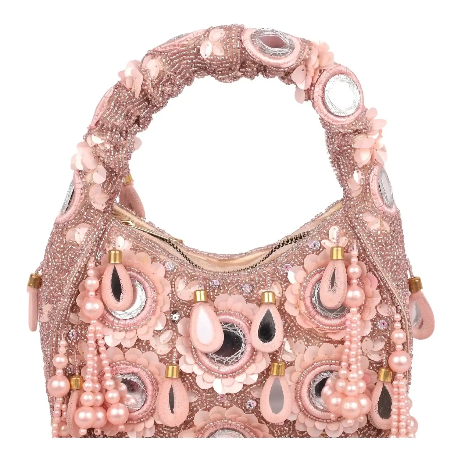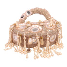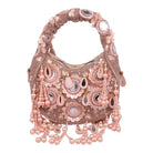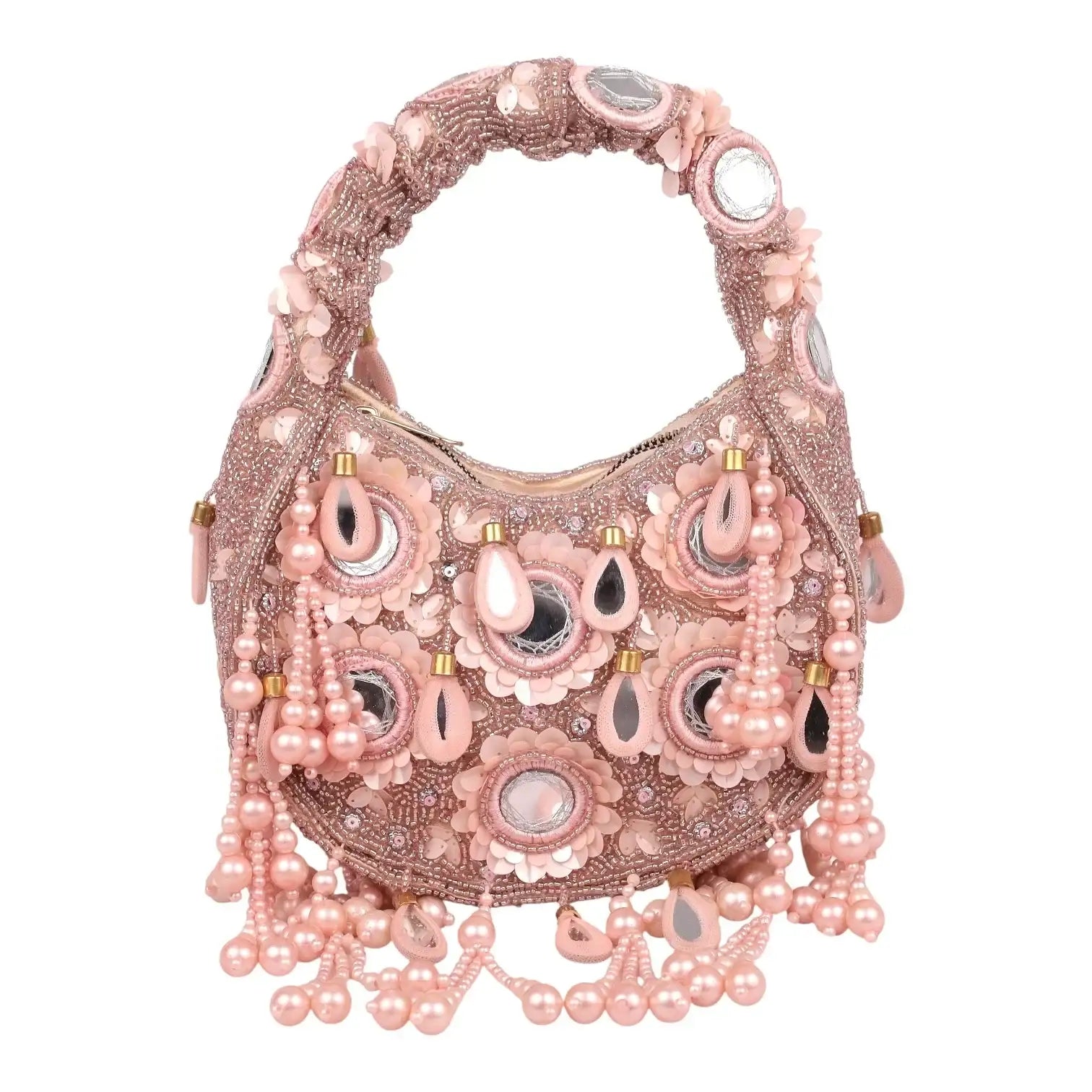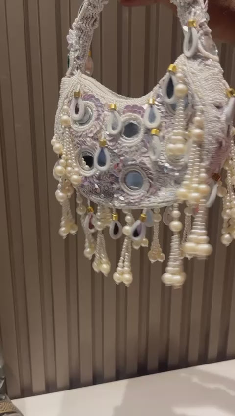 An exquisite potli purse with sparkling mirrors and sequins handcrafted with metallic threads in champagne colour, with large chandellier danglings in varied mirror shapes. Further adding to this beautiful potli purse, the drawstrings carry the signature large mirror tassels! PS- you can use the tassels like a small hand mirror, to retouch your lipstick or makeup if you please! The two way wear potli purse comes with a detachable, embroidered top handle.