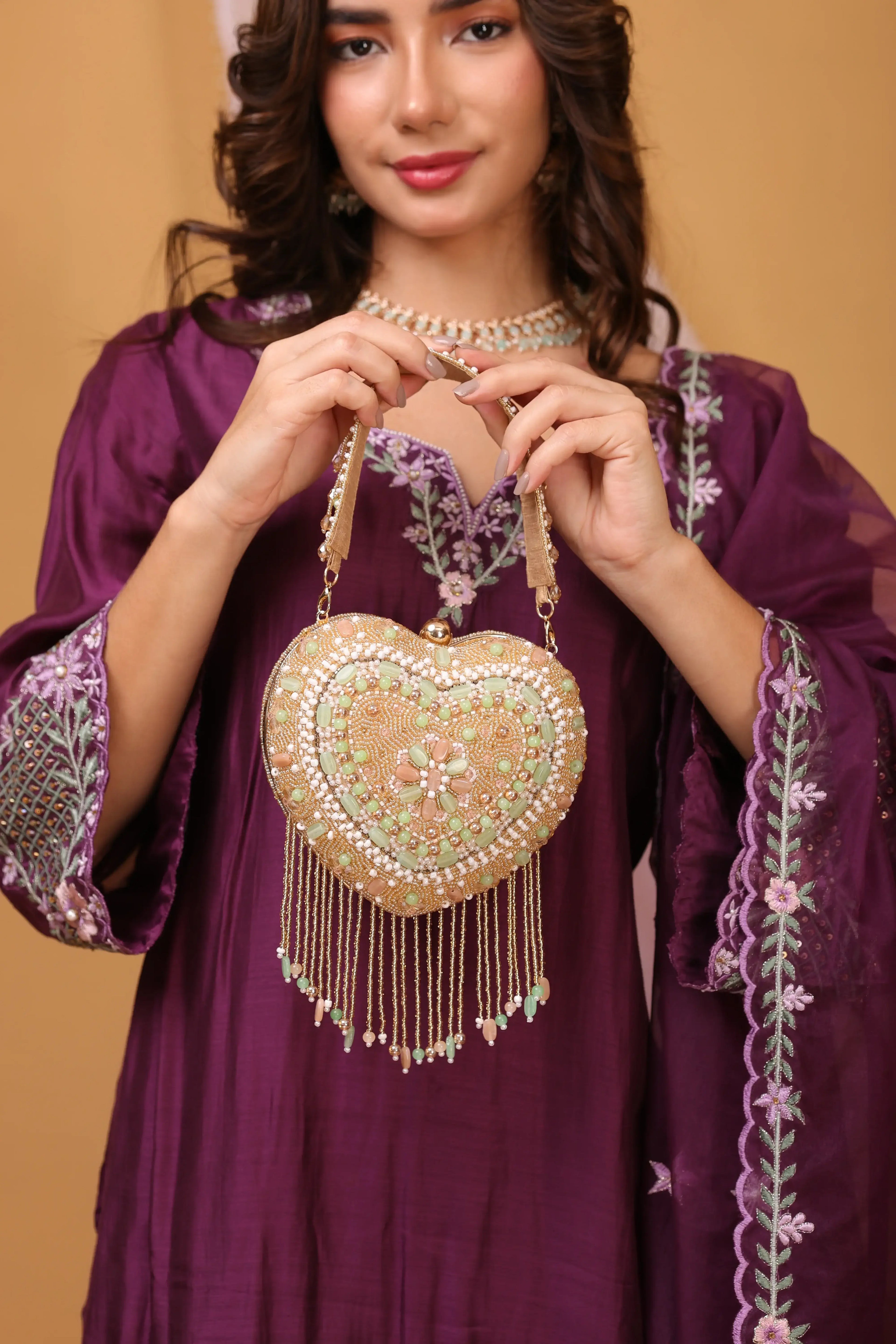 Inspired by opulent encrusted legacy Jadau and Polki jewellery, the callie Mini heart Sublime Pastel Multi is embellished with semi-precious nuggets, stones, kundans and lustrous gold silver Japanese beads. Our mini heart bag is a compact and edgy silhouette. This is designed with soft edges. It comes with a detachable sling chain. This collectible statement accessory fits in your valuables like makeup, keys, currency and cards.