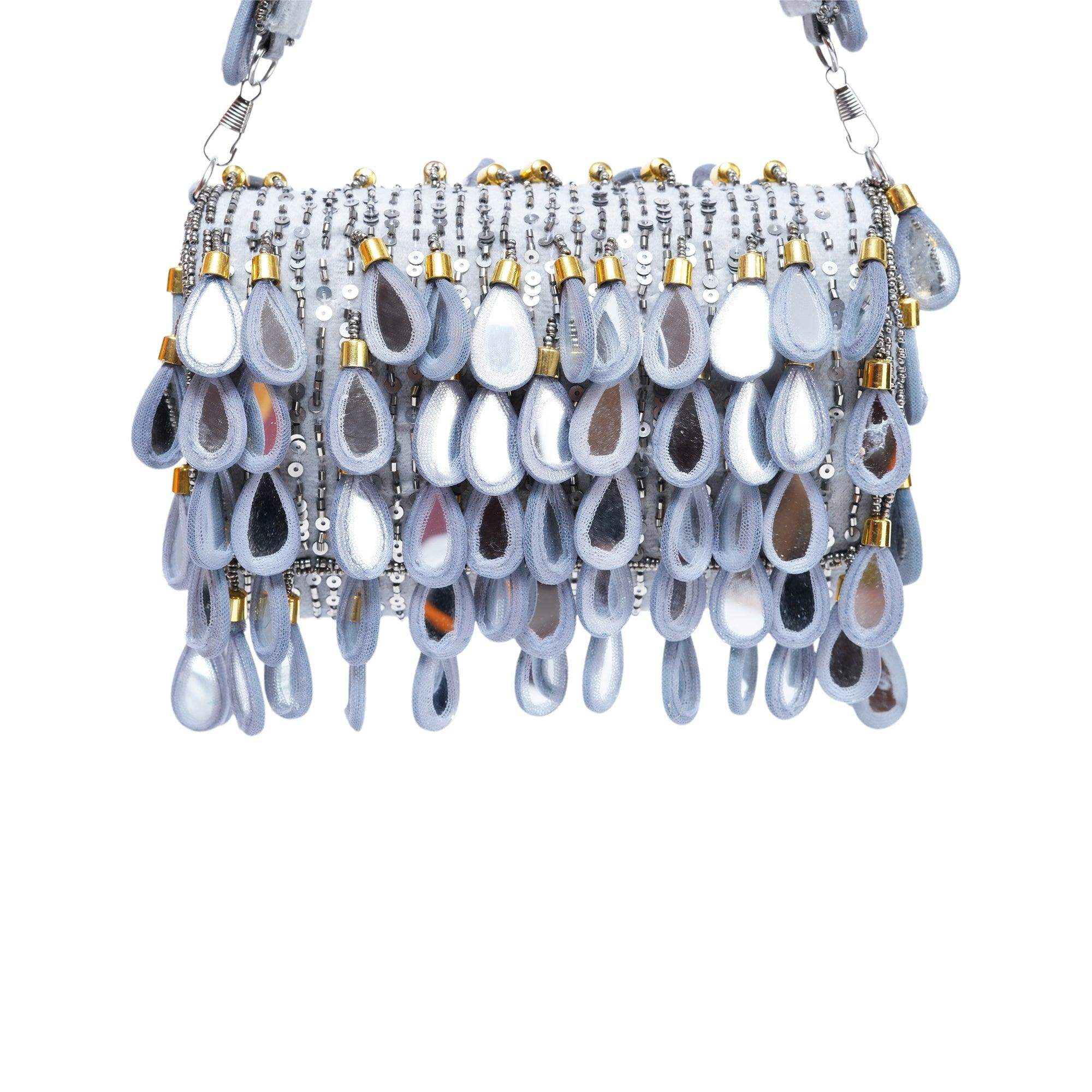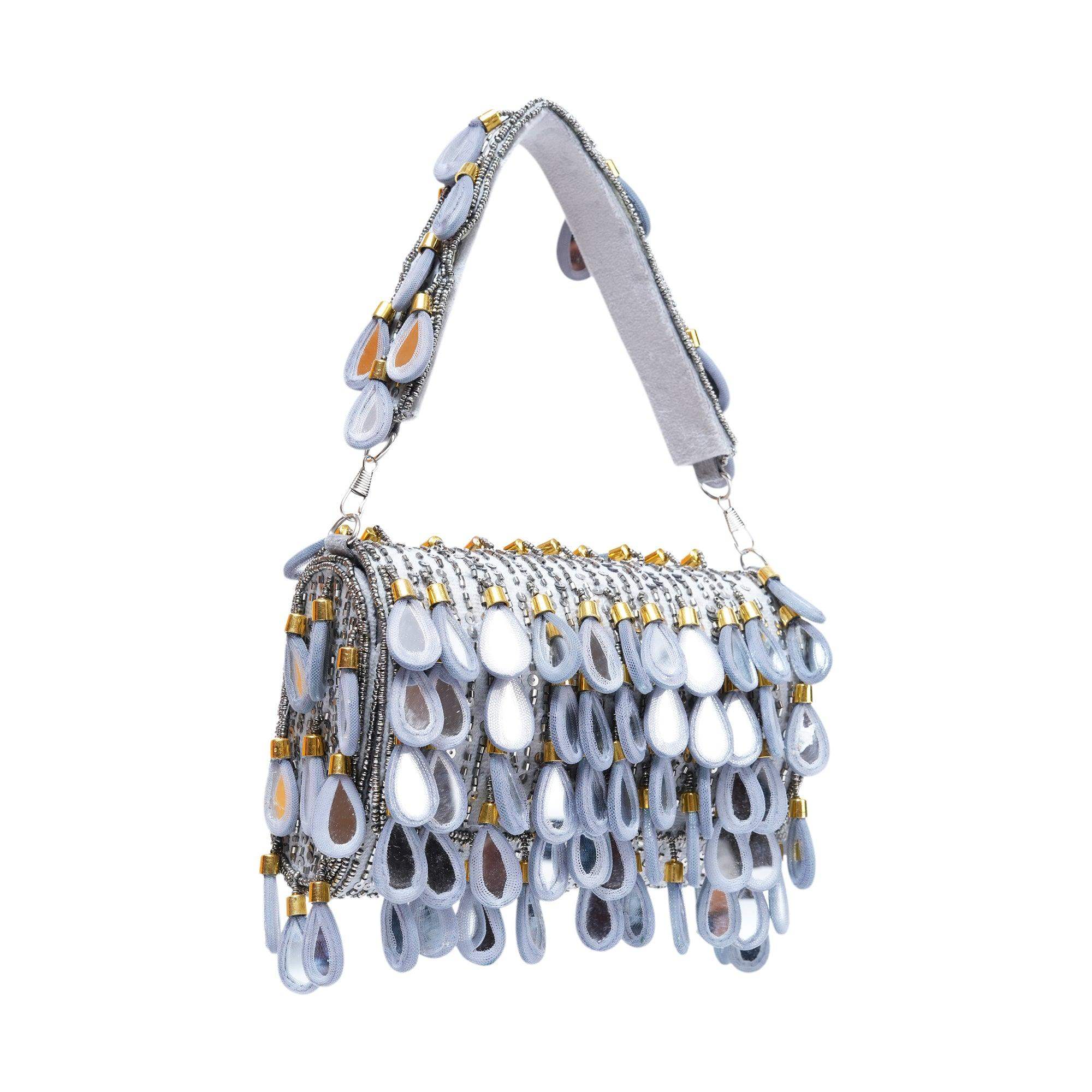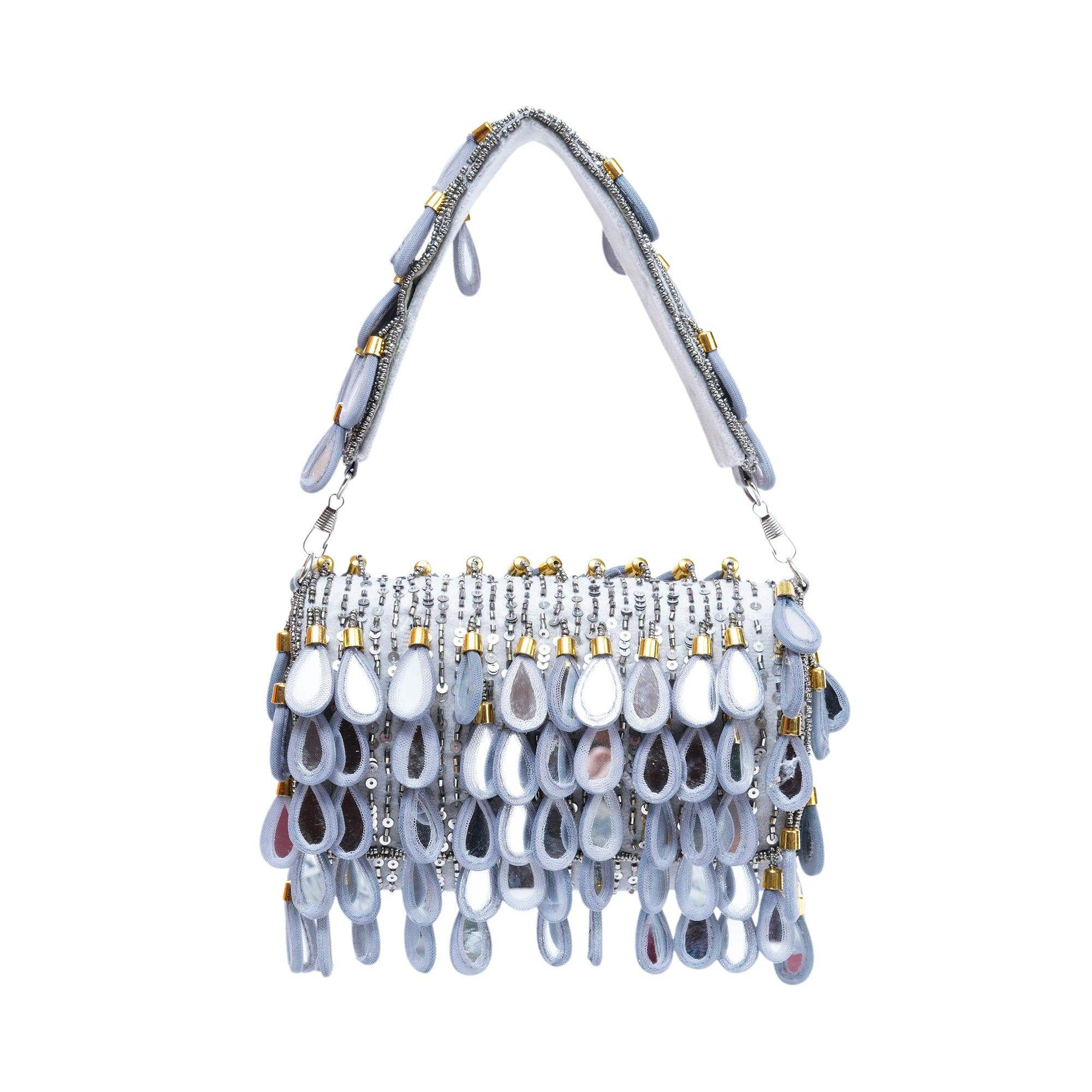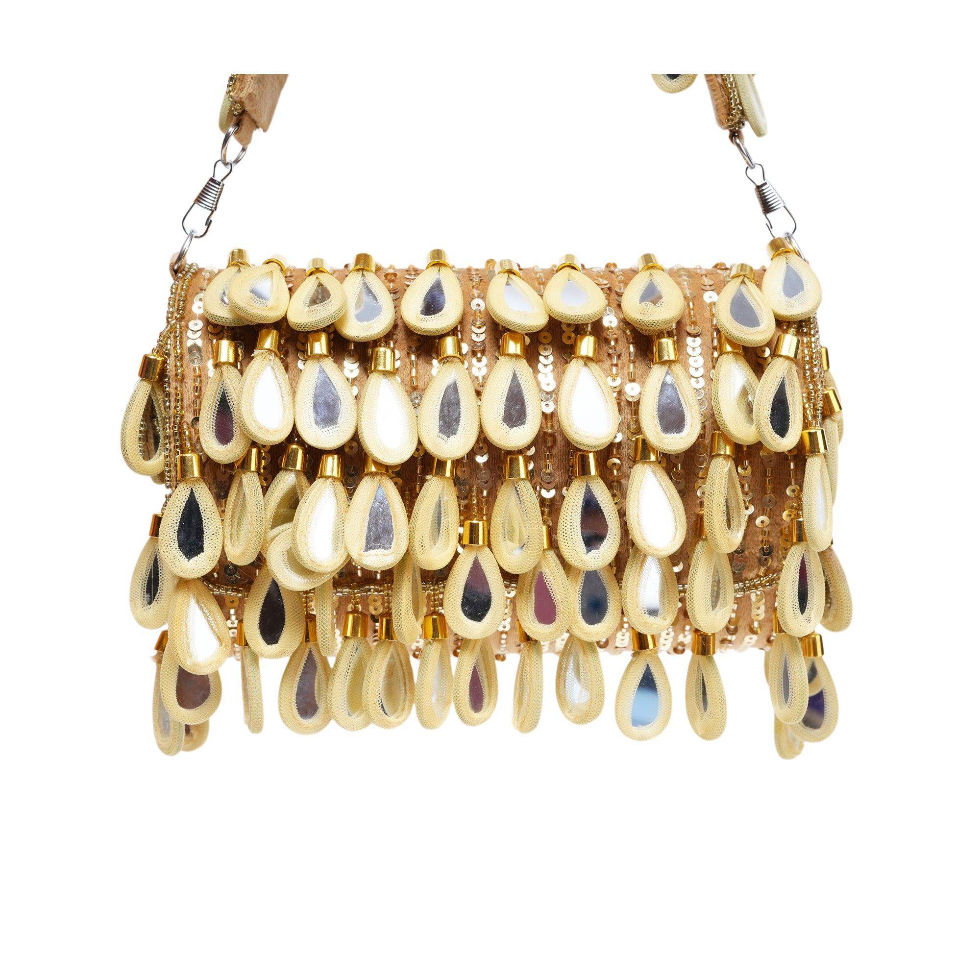 An exquisite potli purse with sparkling mirrors and sequins handcrafted with metallic threads in champagne colour, with large chandellier danglings in varied mirror shapes. Further adding to this beautiful potli purse, the drawstrings carry the signature large mirror tassels! PS- you can use the tassels like a small hand mirror, to retouch your lipstick or makeup if you please! The two way wear potli purse comes with a detachable, embroidered top handle.