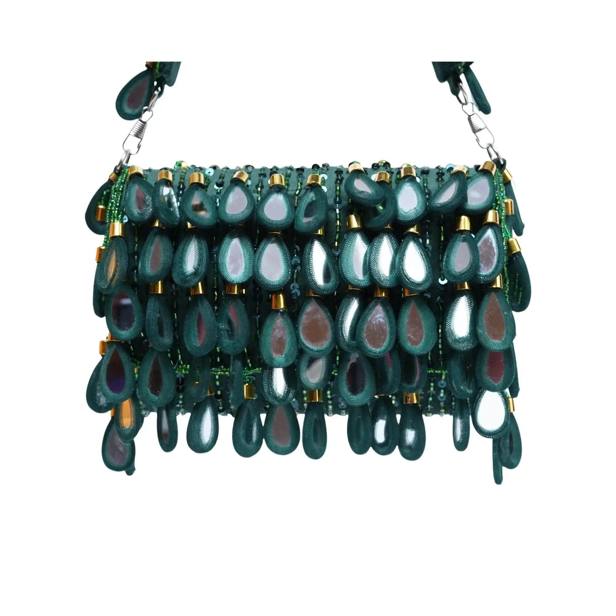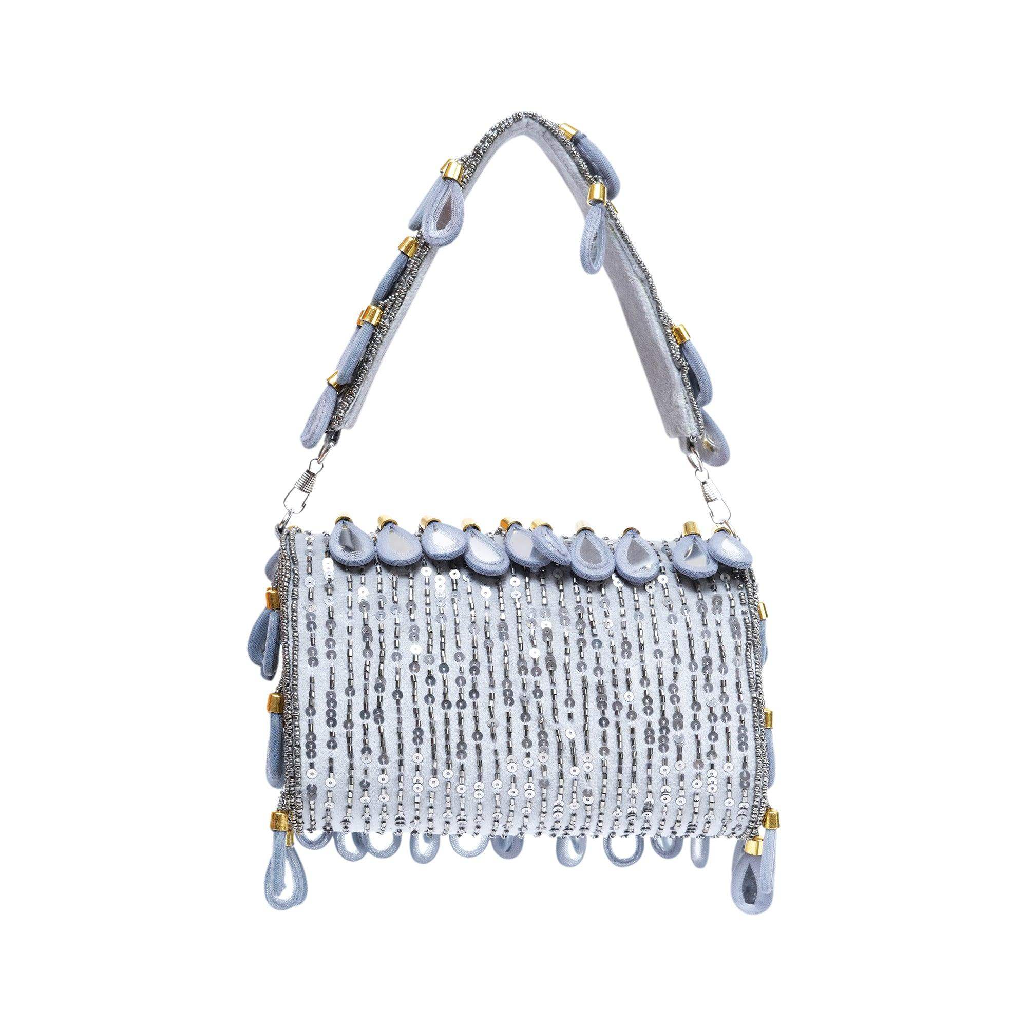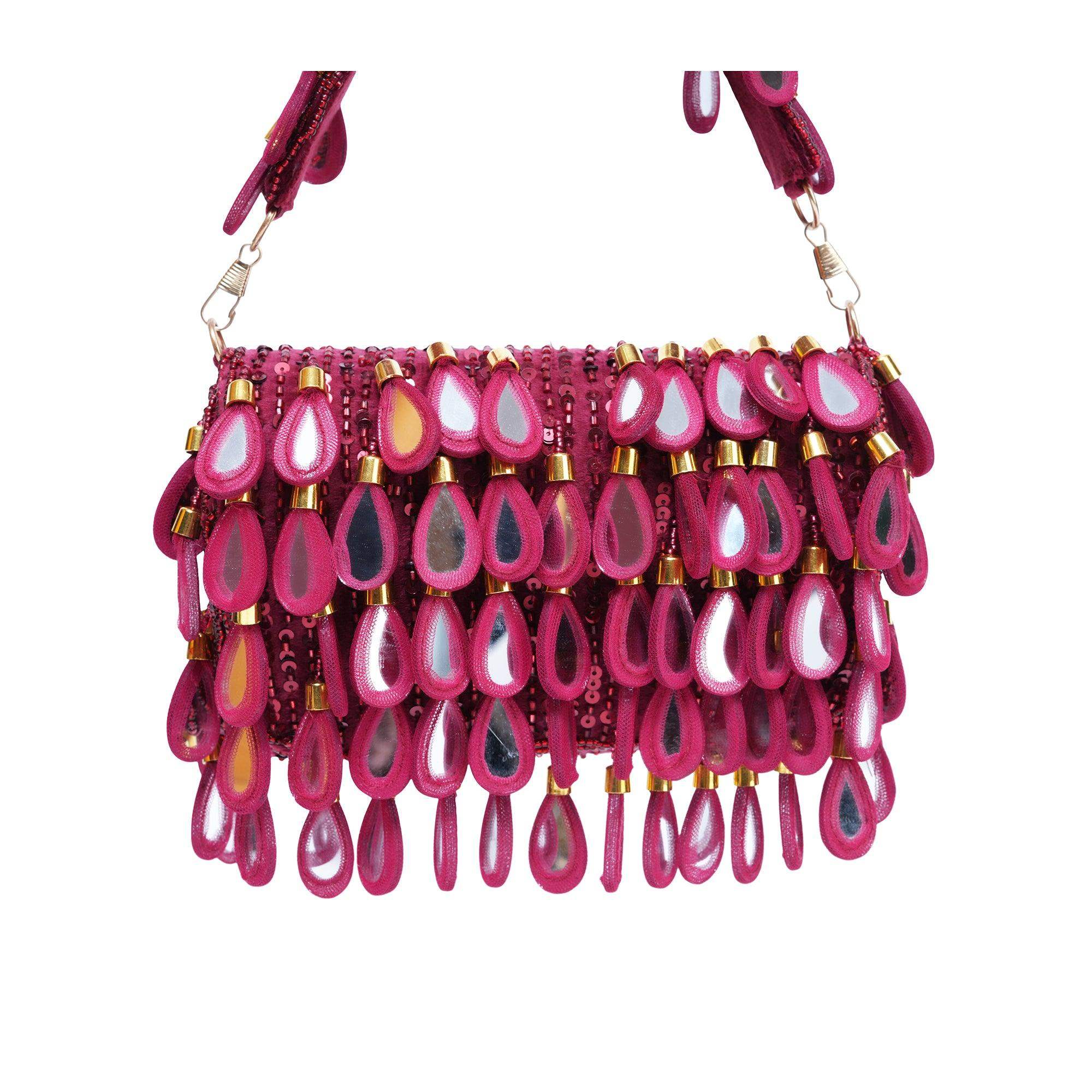 An exquisite potli purse with sparkling mirrors and sequins handcrafted with metallic threads in champagne colour, with large chandellier danglings in varied mirror shapes. Further adding to this beautiful potli purse, the drawstrings carry the signature large mirror tassels! PS- you can use the tassels like a small hand mirror, to retouch your lipstick or makeup if you please! The two way wear potli purse comes with a detachable, embroidered top handle.