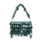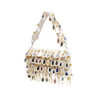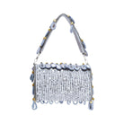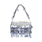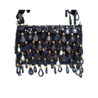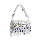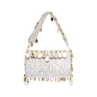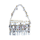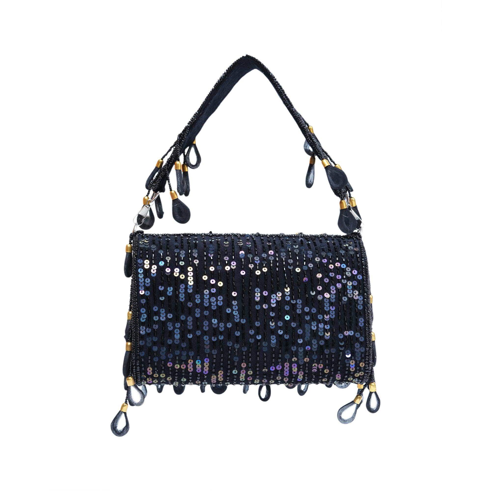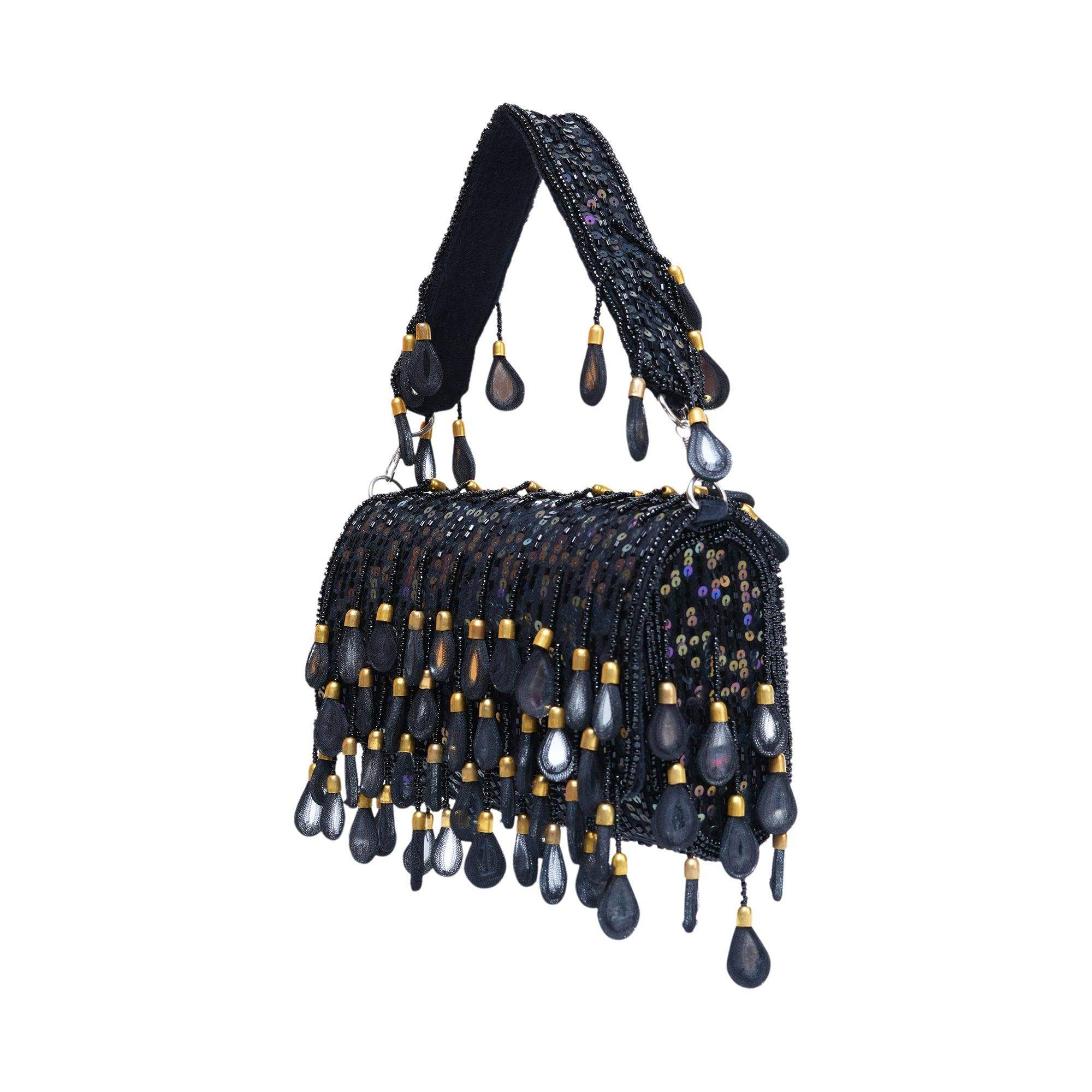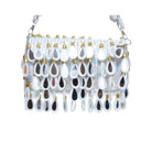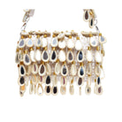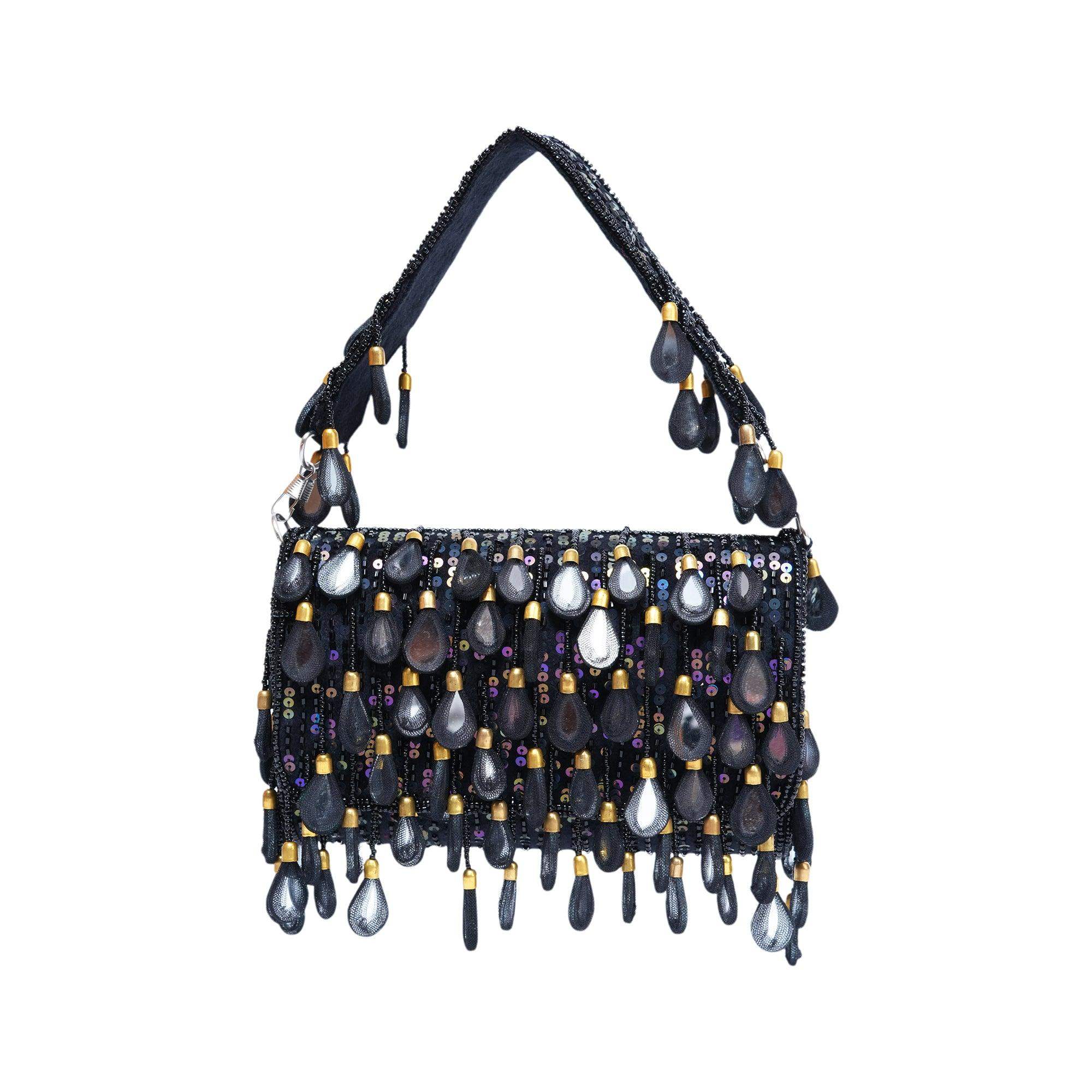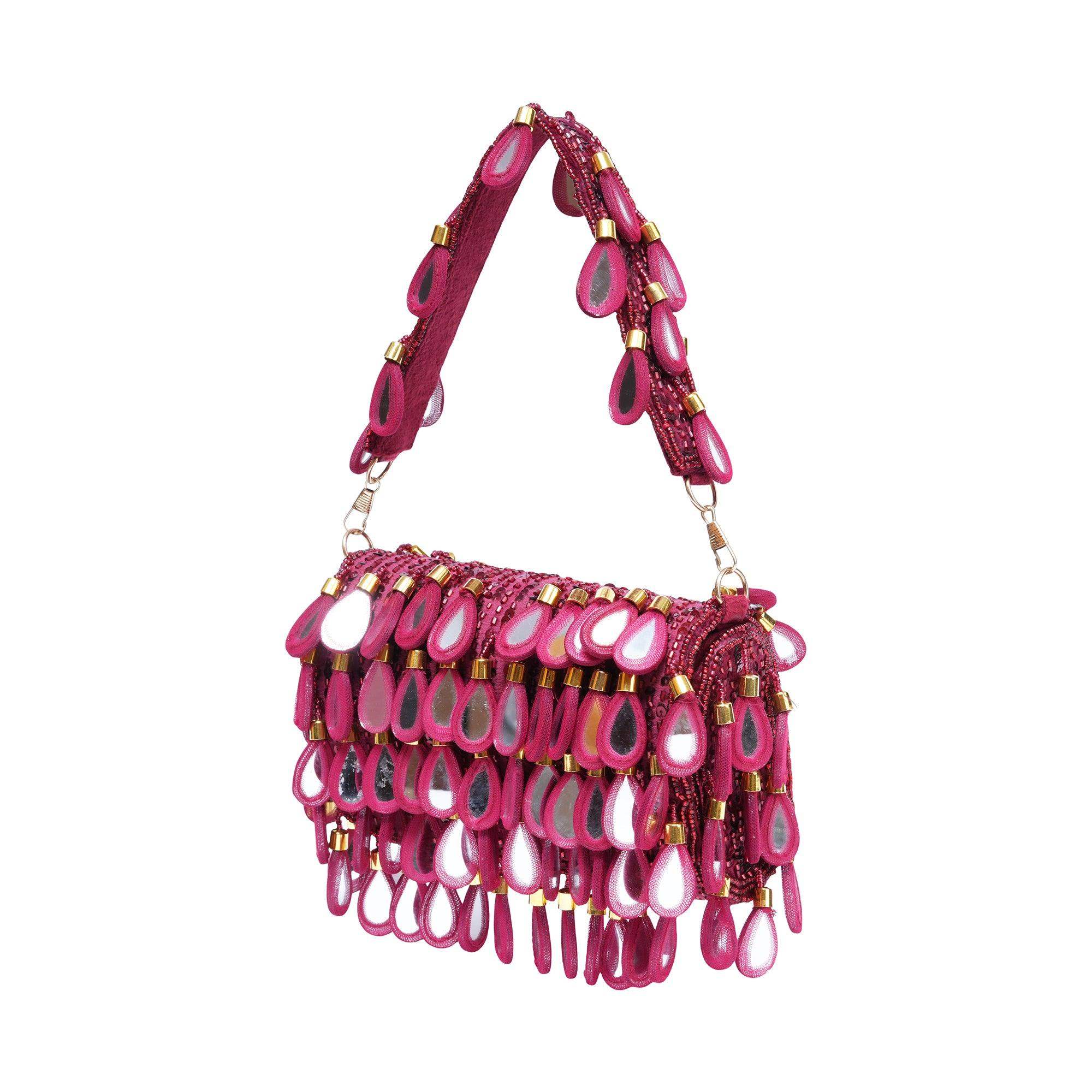 An exquisite potli purse with sparkling mirrors and sequins handcrafted with metallic threads in champagne colour, with large chandellier danglings in varied mirror shapes. Further adding to this beautiful potli purse, the drawstrings carry the signature large mirror tassels! PS- you can use the tassels like a small hand mirror, to retouch your lipstick or makeup if you please! The two way wear potli purse comes with a detachable, embroidered top handle.