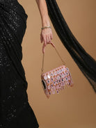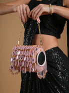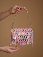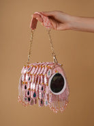 Elevate your evening style with this exquisite pink embellished statement handbag. Designed with a luxurious gold-tone chain handle, this bag is adorned with cascading teardrop-shaped embellishments in soft pink and mirror accents that catch the light beautifully. The intricate beadwork and delicate hanging details add a touch of glamour, making it the perfect accessory for special occasions, parties, or elegant dinners.