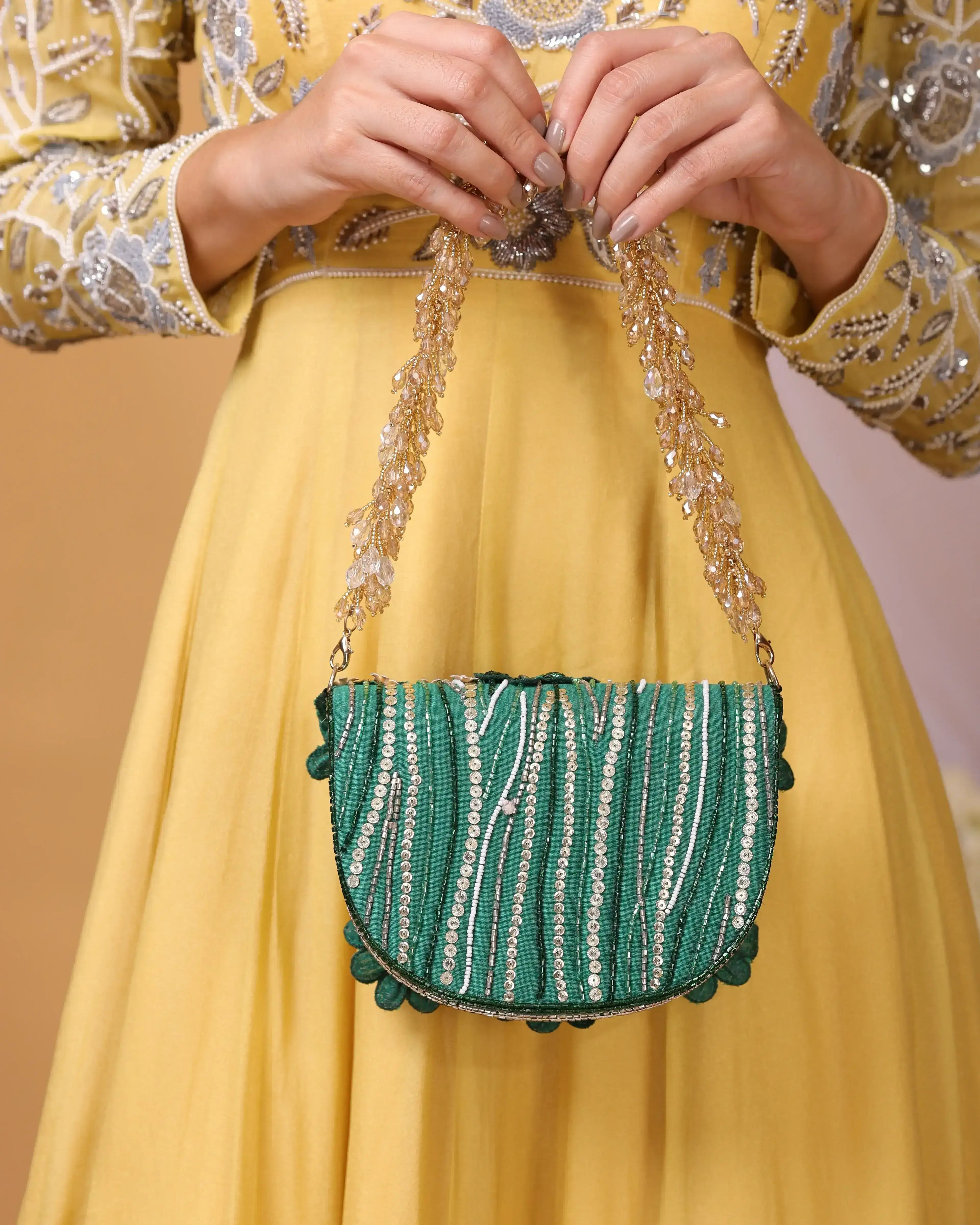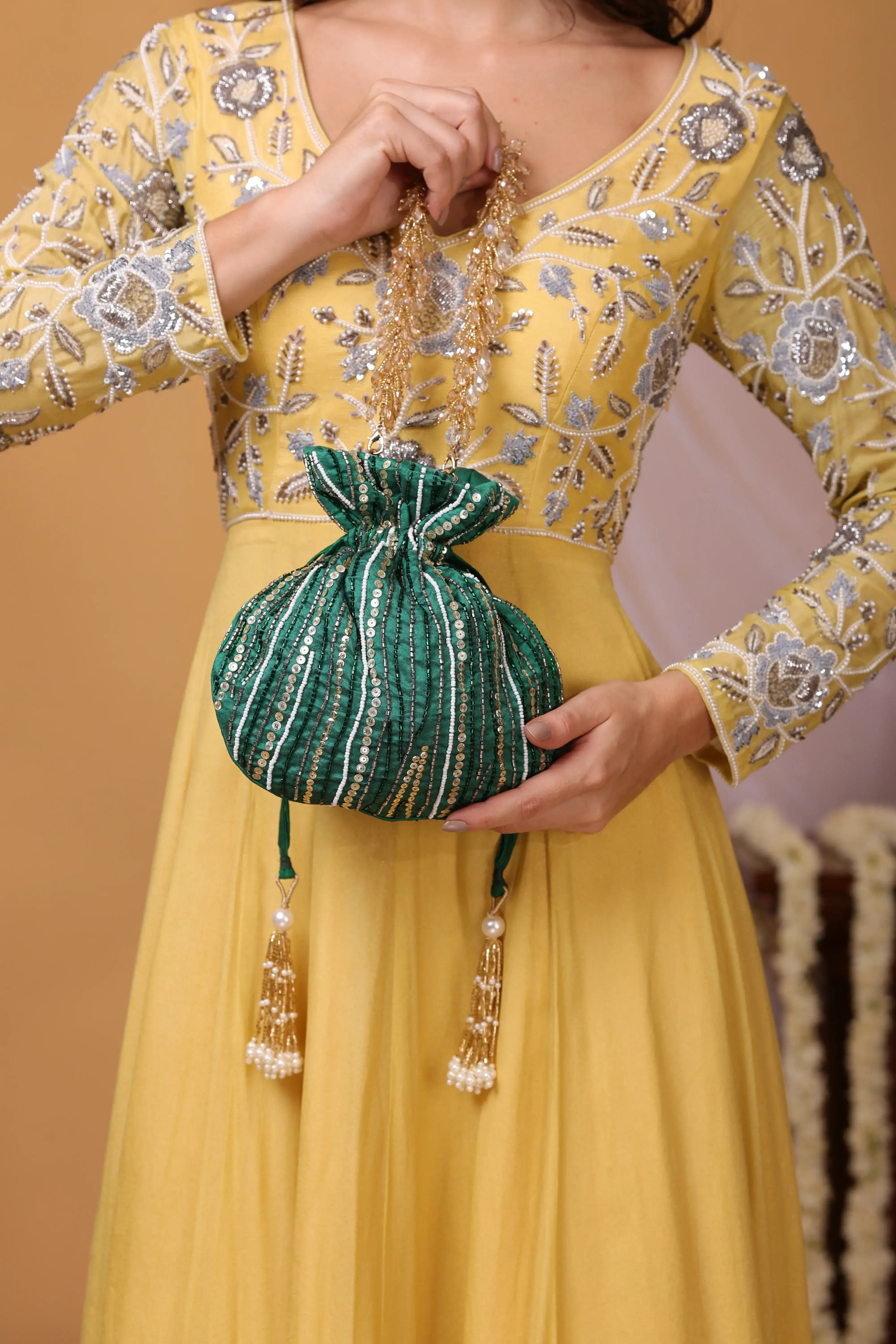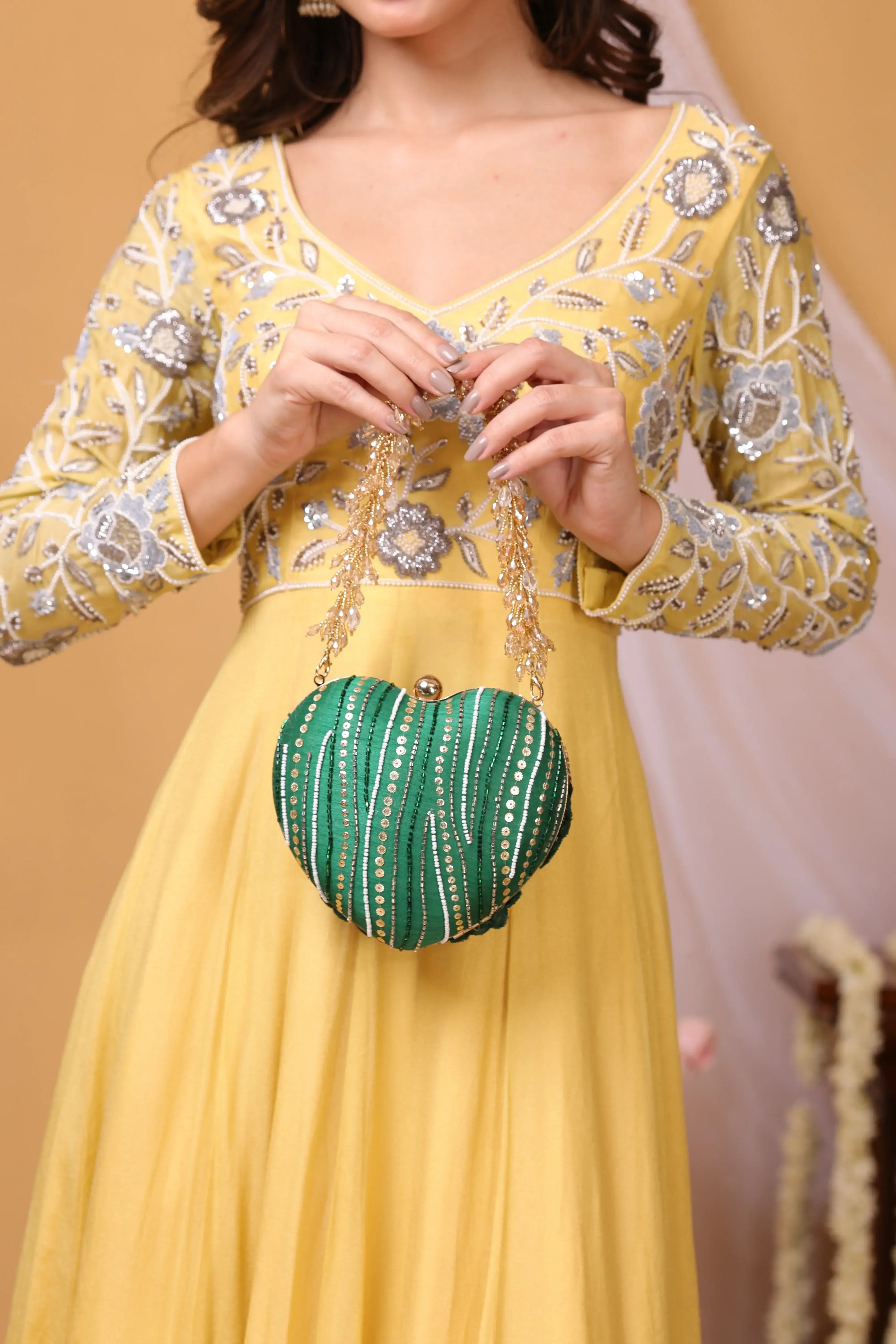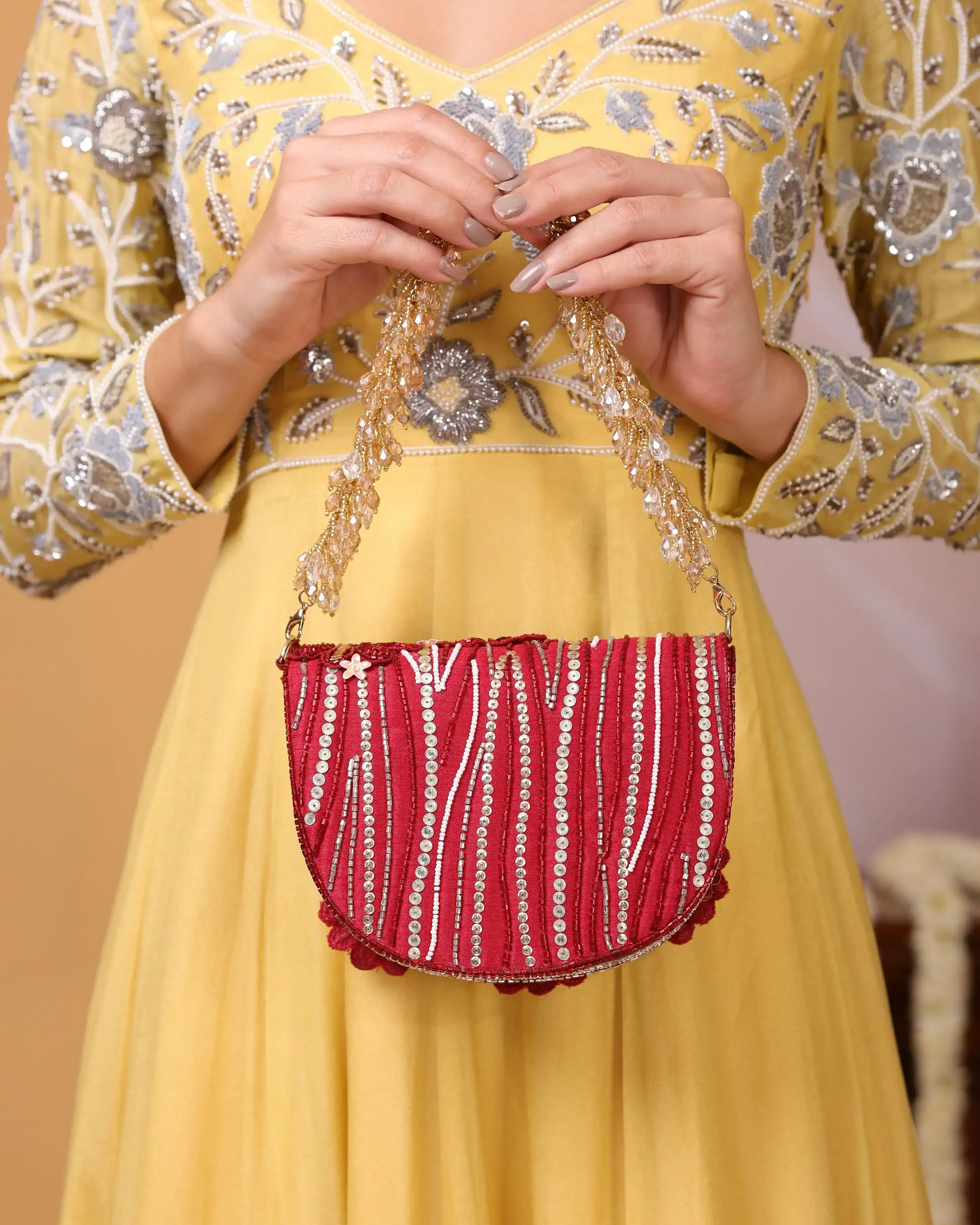 Make a statement with these yellow and golden-toned clutches and potlis, designed to reflect the vibrant, festive spirit of the Haldi ceremony.