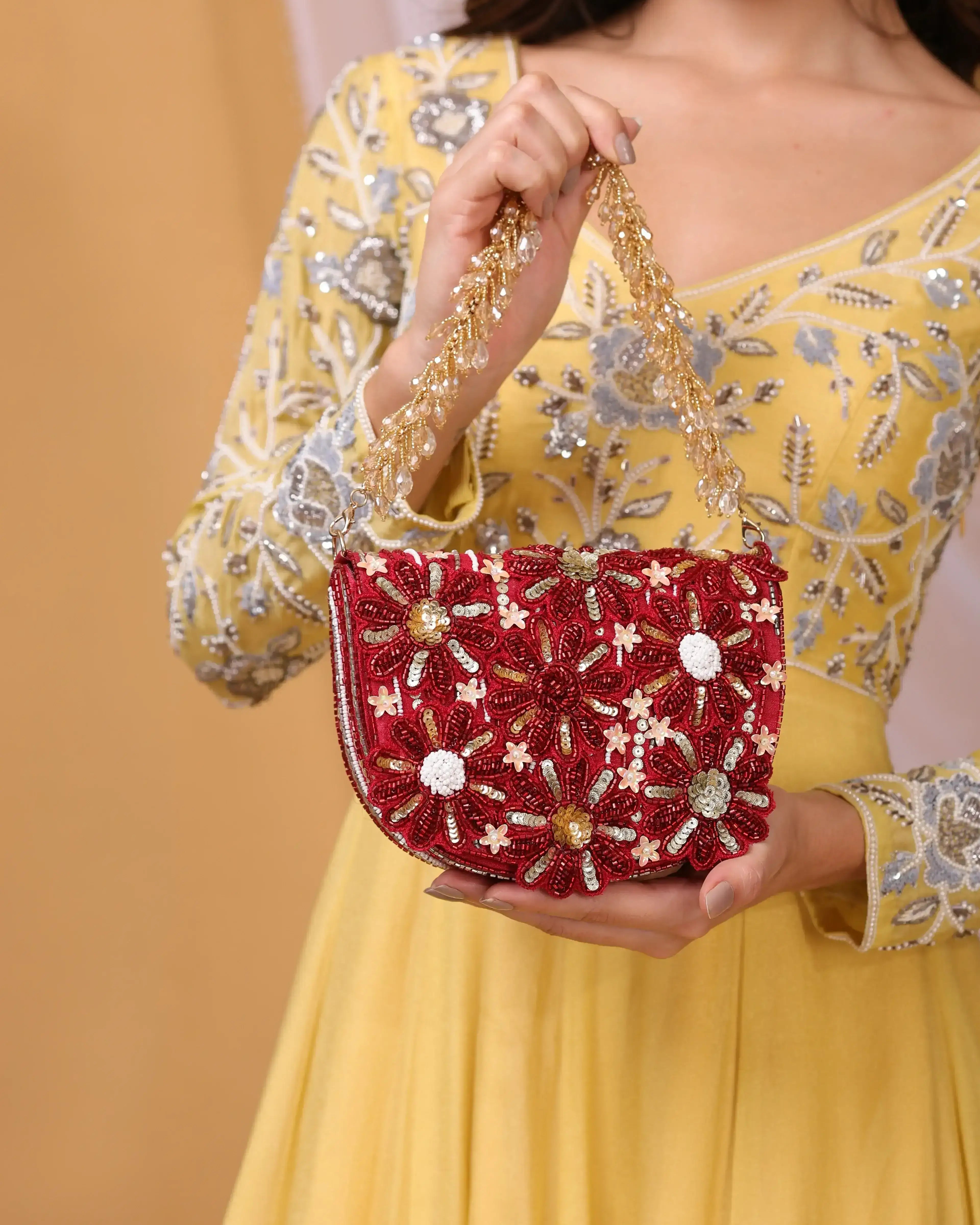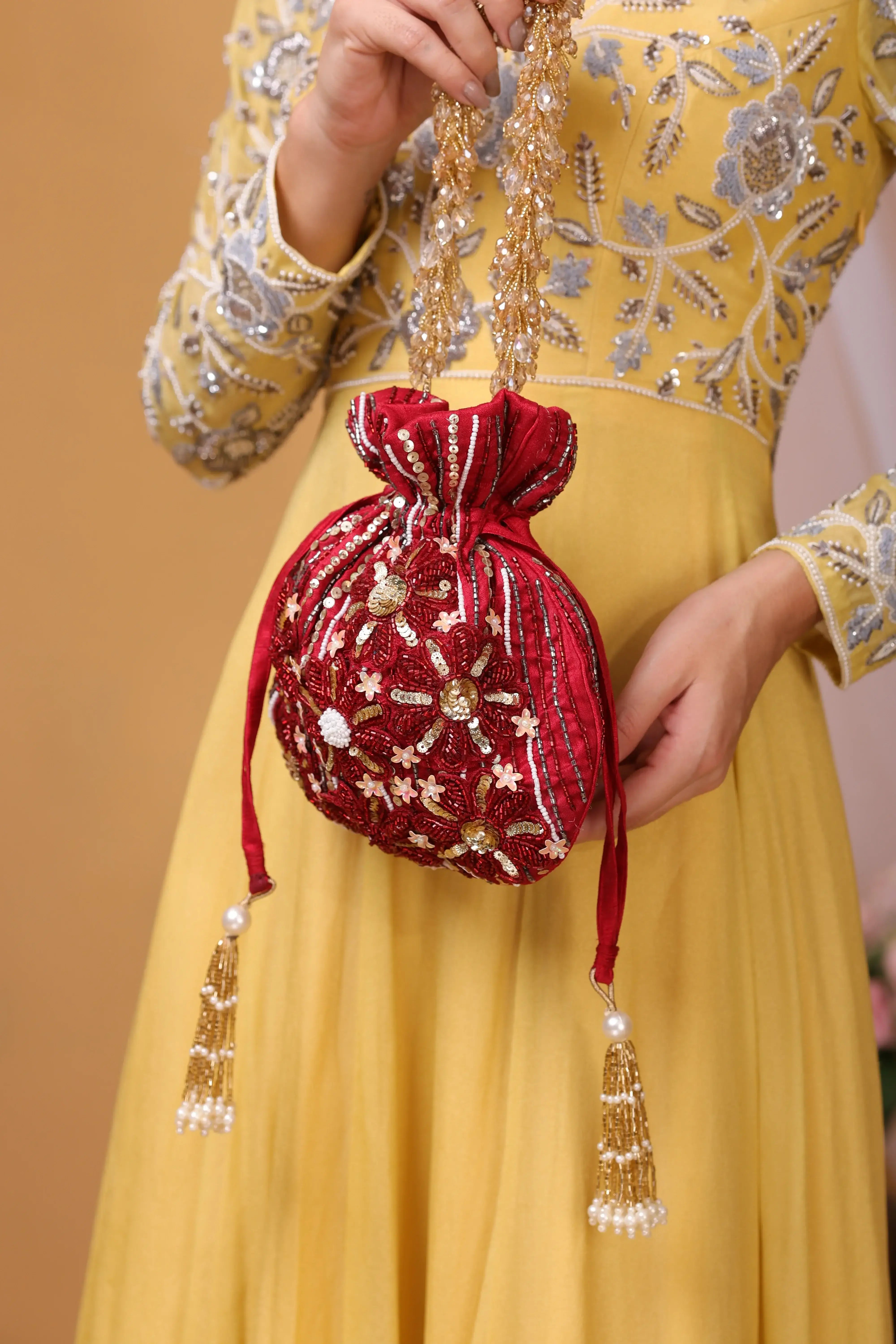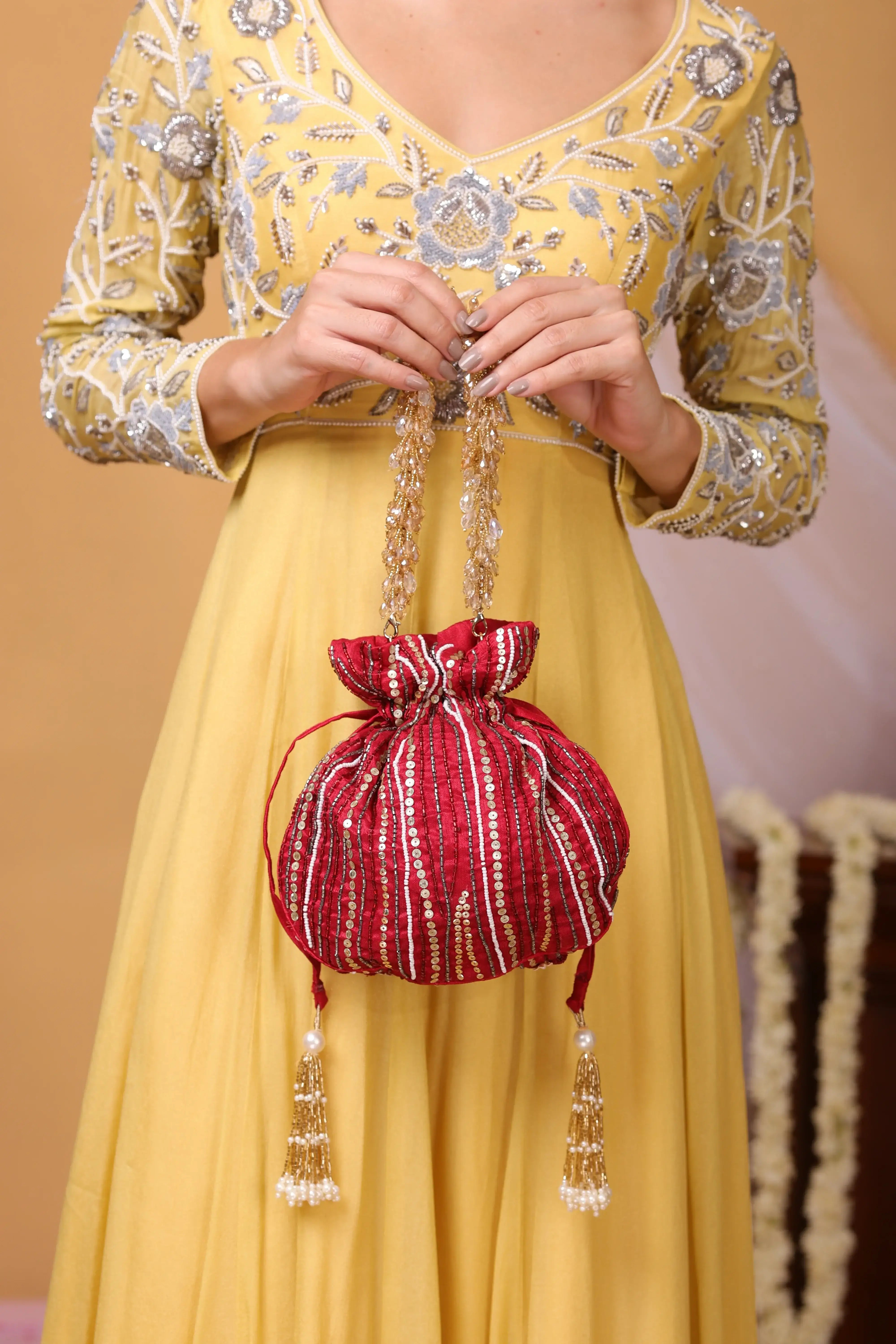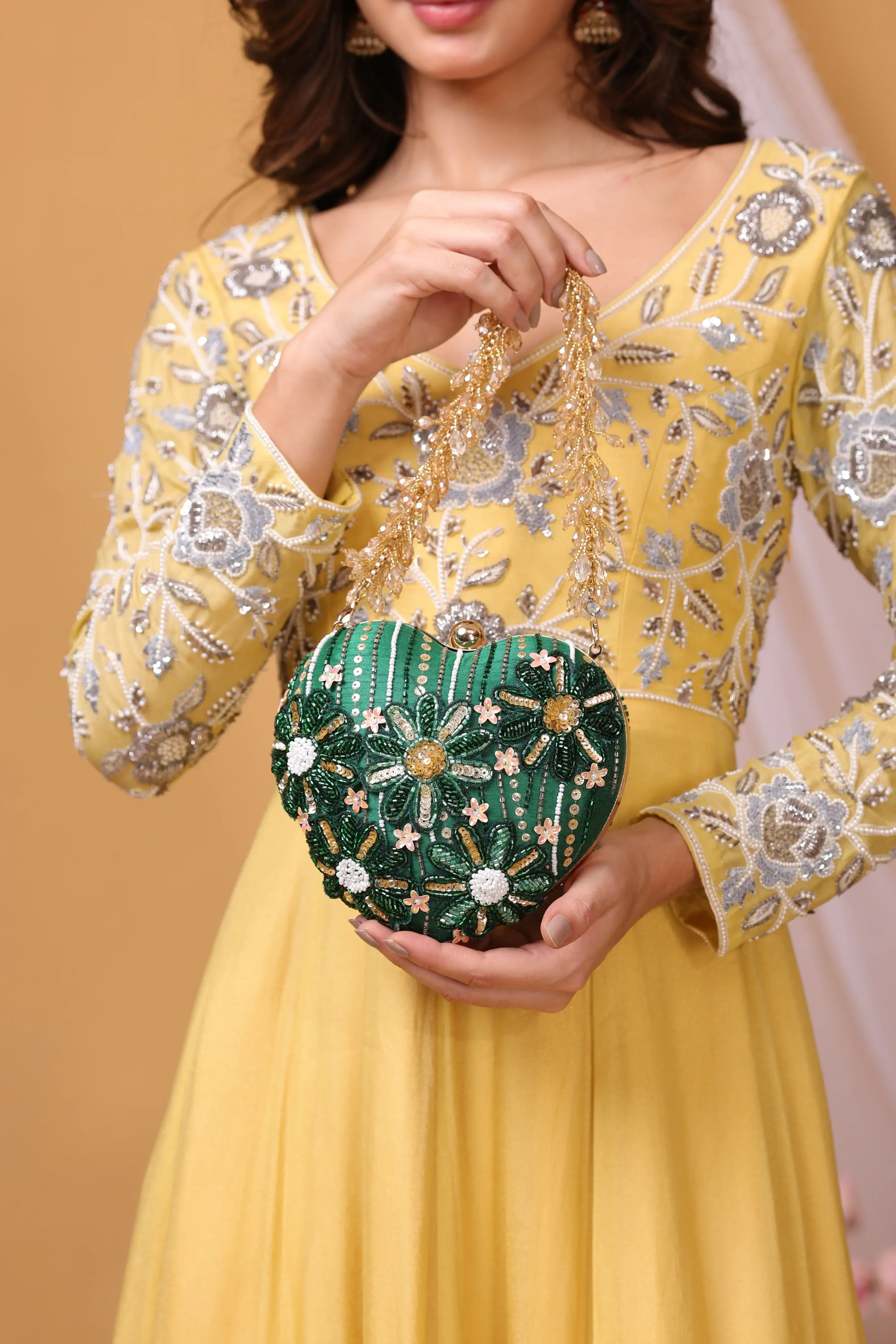 Make a statement with these yellow and golden-toned clutches and potlis, designed to reflect the vibrant, festive spirit of the Haldi ceremony.
