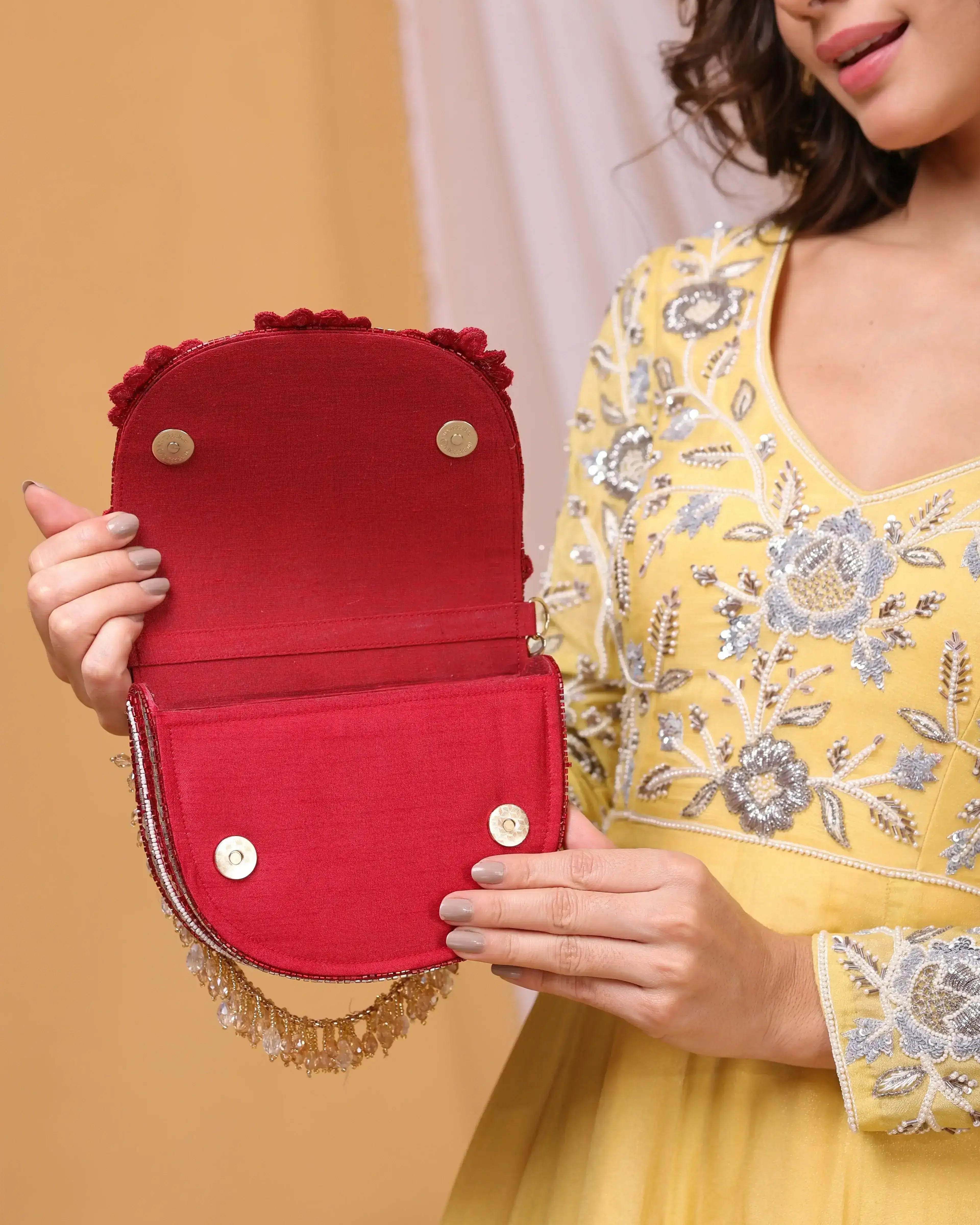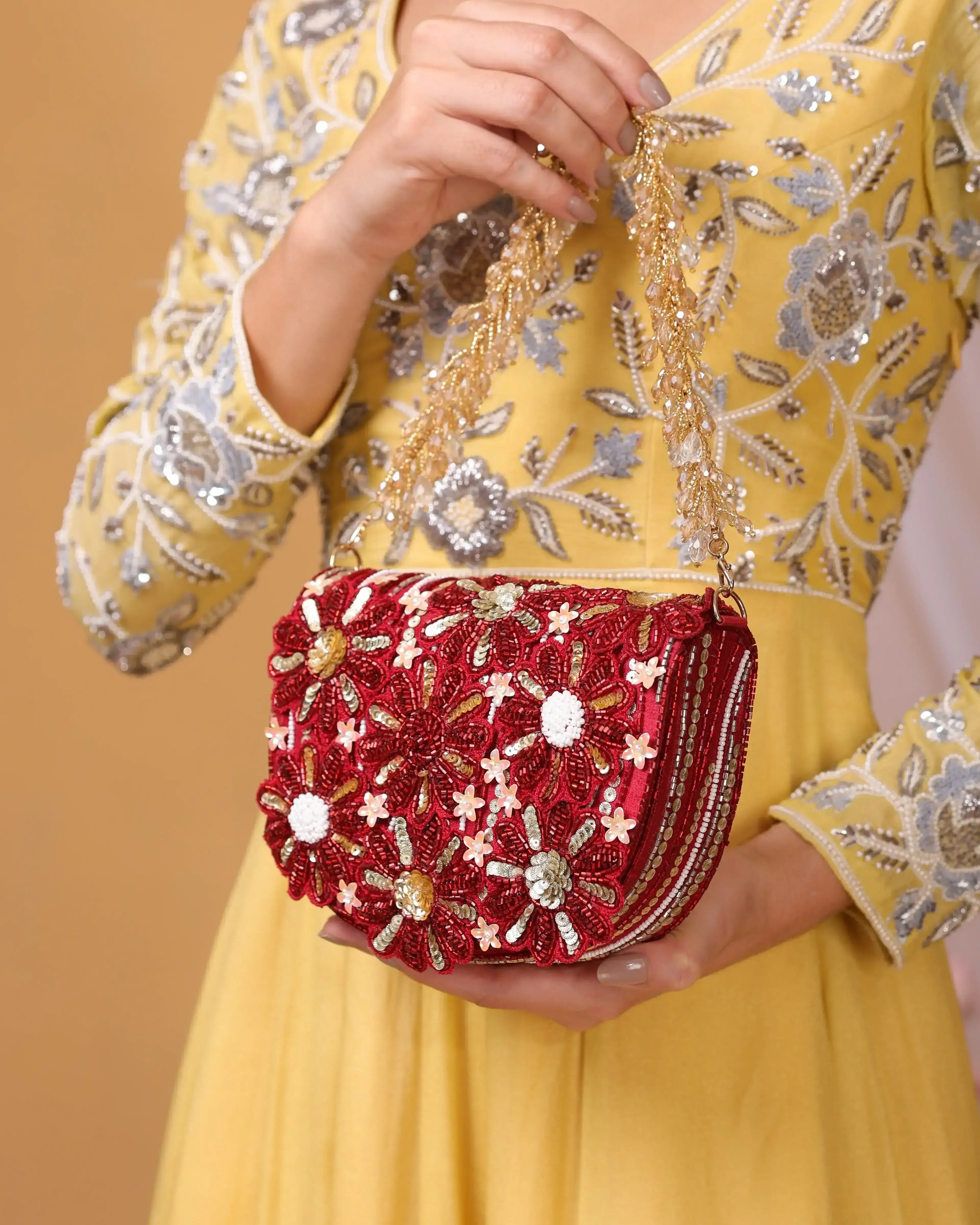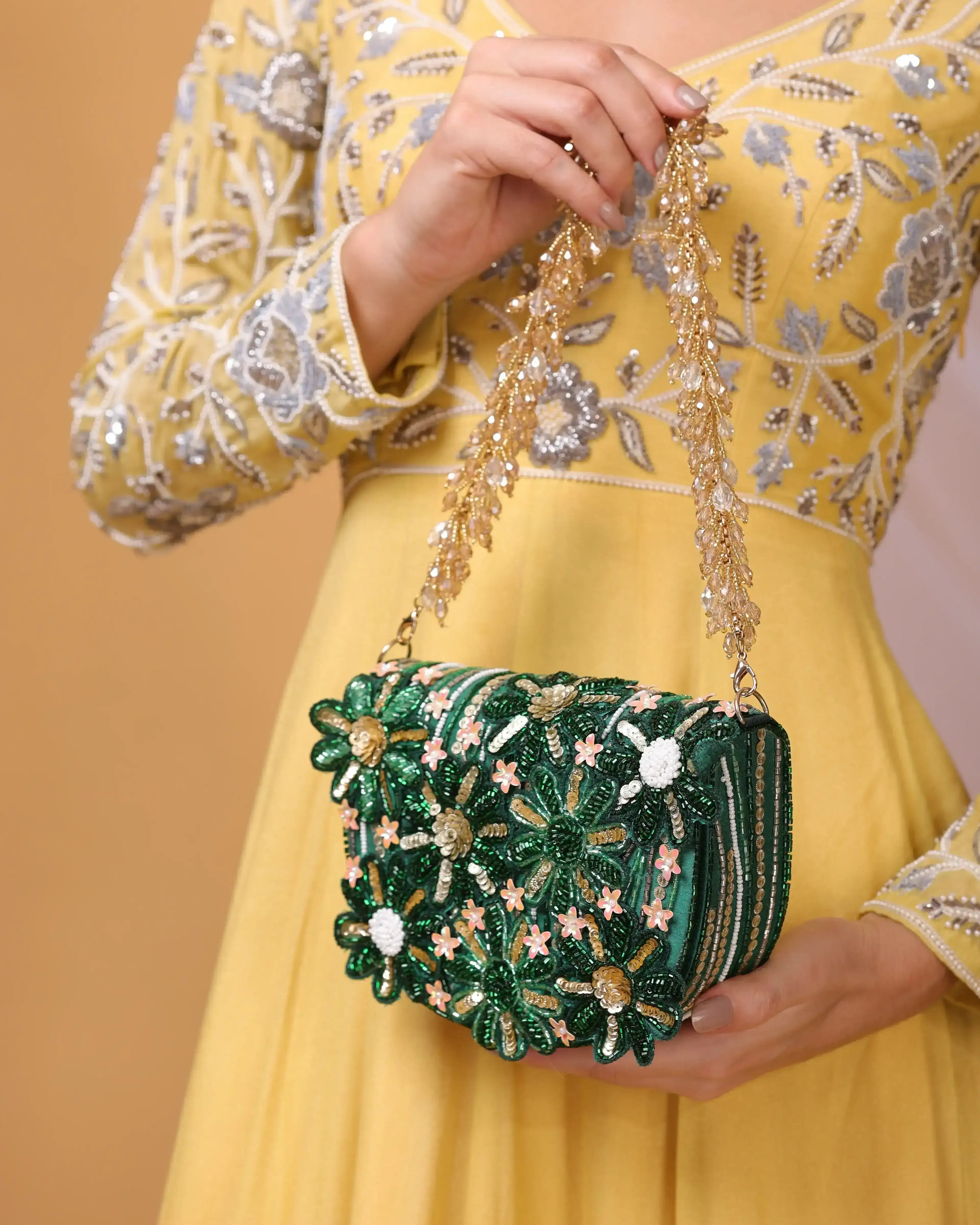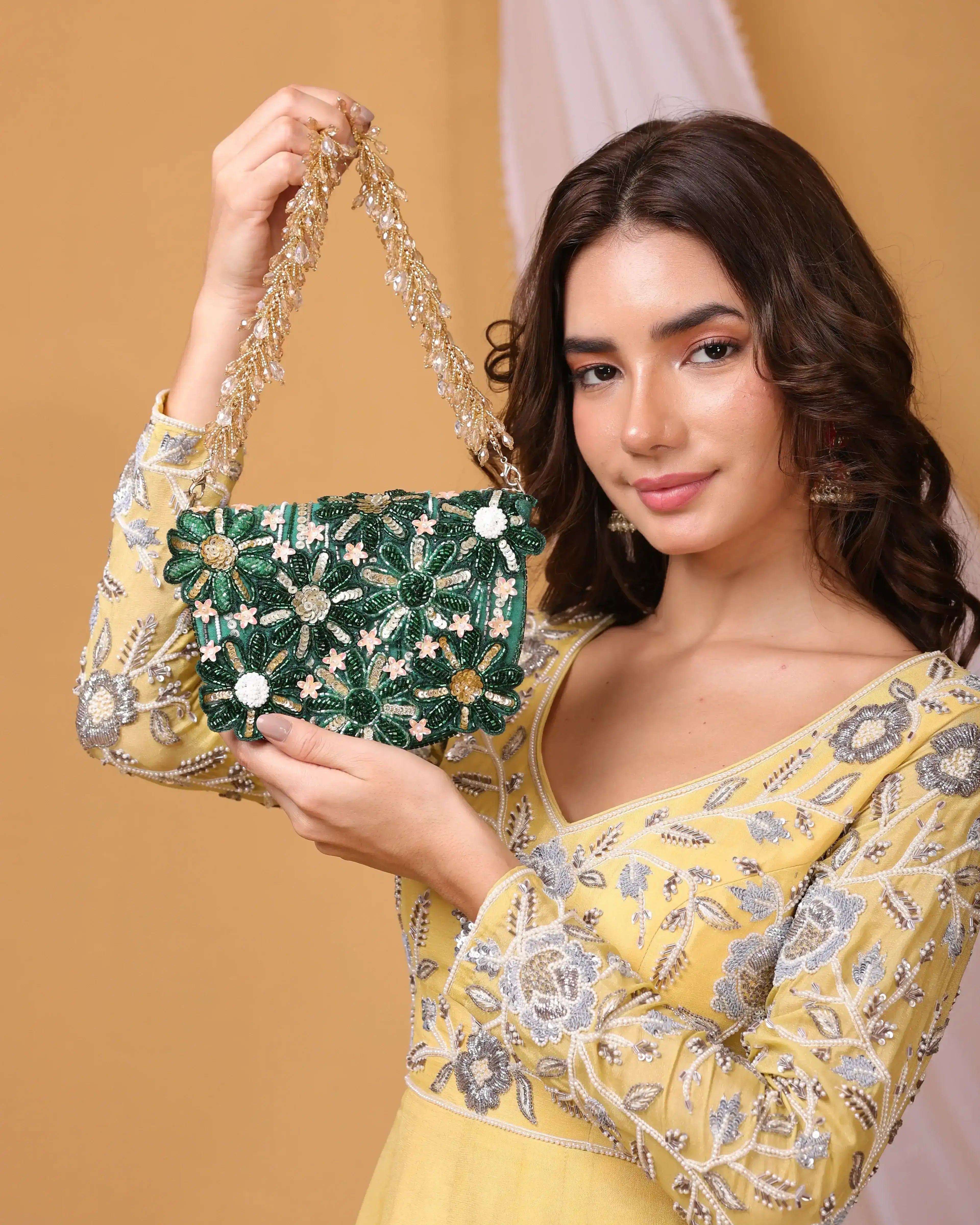 Make a statement with these yellow and golden-toned clutches and potlis, designed to reflect the vibrant, festive spirit of the Haldi ceremony.