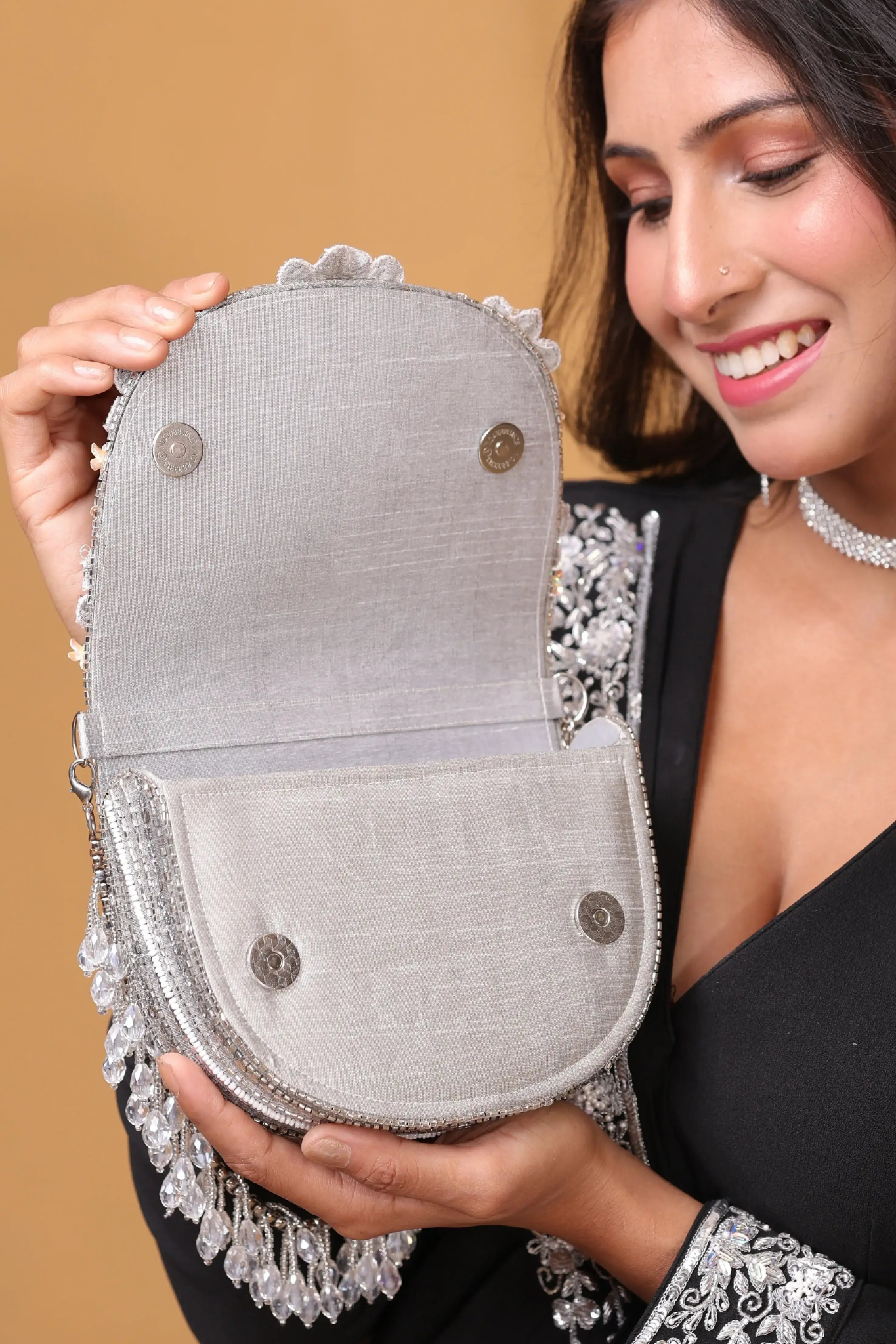 The hand-beaded chain isn’t just a handle — it’s a statement of luxury. Intricately crafted with shimmering beads and delicate tassels, it adds grace, grandeur, and exclusivity to your look.