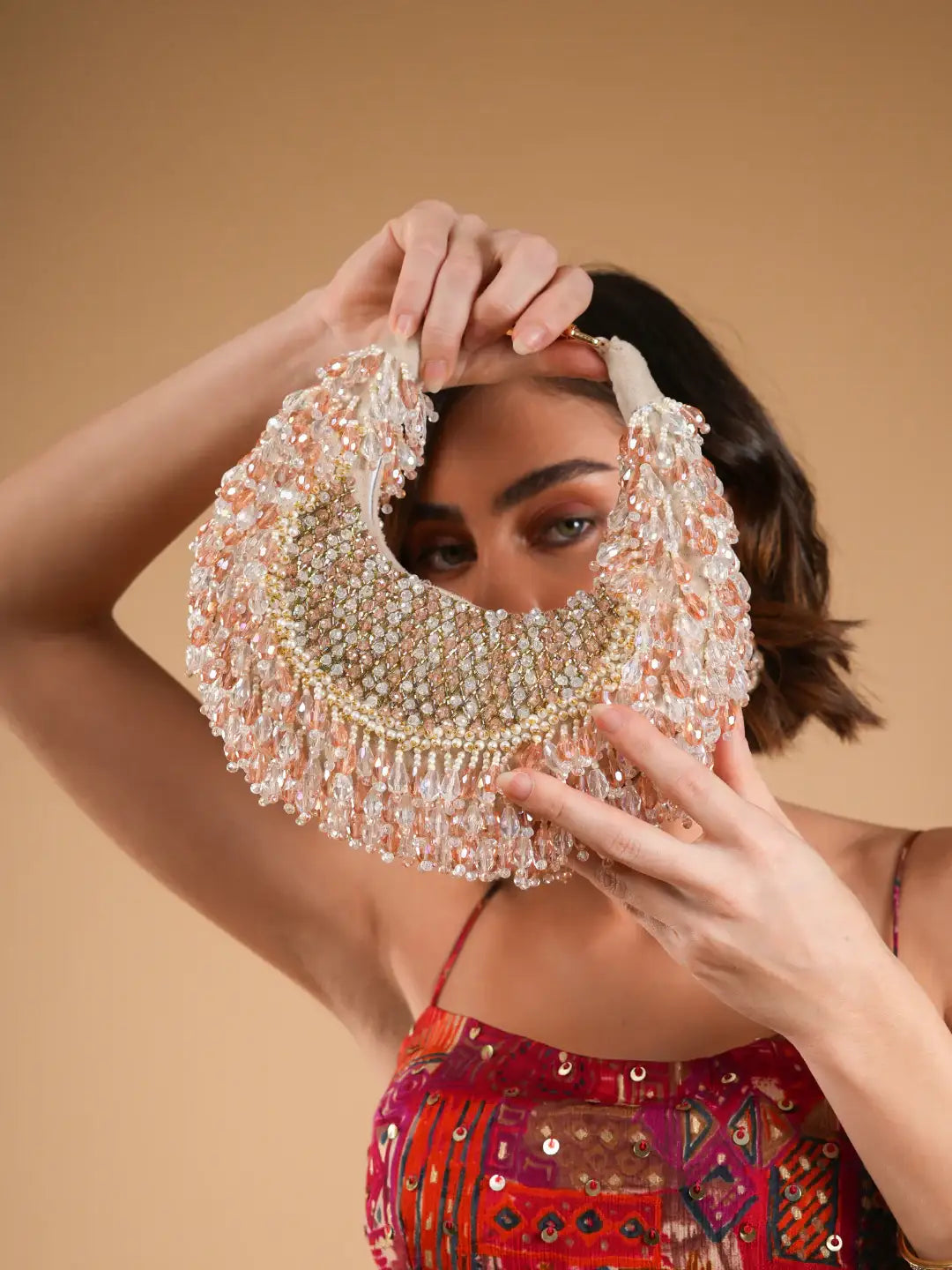 Add a touch of elegance to your ensemble with this stunning emerald pink beaded handbag. Designed in a chic crescent silhouette, this statement piece is intricately embellished with shimmering green beads, sequins, and delicate pearl accents, creating a rich texture that catches the light beautifully. The structured handle ensures comfort while carrying, making it the perfect accessory for weddings, festive occasions, or glamorous evenings out.