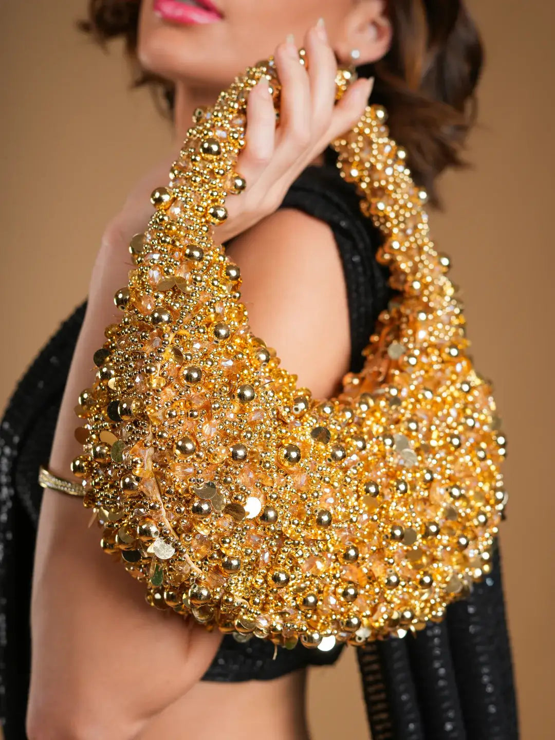 This is a glamorous, statement-making handbag with a bold and luxurious design. The bag is richly adorned with an array of golden embellishments, including beads, sequins, and metallic spheres that create a highly textured and eye-catching surface. The overall effect is dazzling, with the intricate beadwork reflecting light beautifully, making it perfect for special occasions or evening wear. Its unique crescent-like shape and thick, beaded handle add both structure and artistry. The bag exudes opulence and is designed for those who want to stand out with a striking, high-fashion accessory.