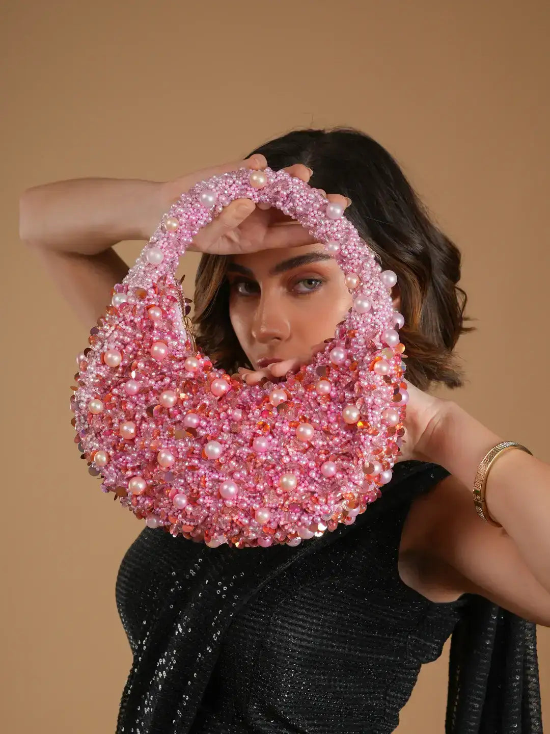This is a glamorous, statement-making handbag with a bold and luxurious design. The bag is richly adorned with an array of pink embellishments, including beads, sequins, and metallic spheres that create a highly textured and eye-catching surface. The overall effect is dazzling, with the intricate beadwork reflecting light beautifully, making it perfect for special occasions or evening wear. Its unique crescent-like shape and thick, beaded handle add both structure and artistry. The bag exudes opulence and is designed for those who want to stand out with a striking, high-fashion accessory.