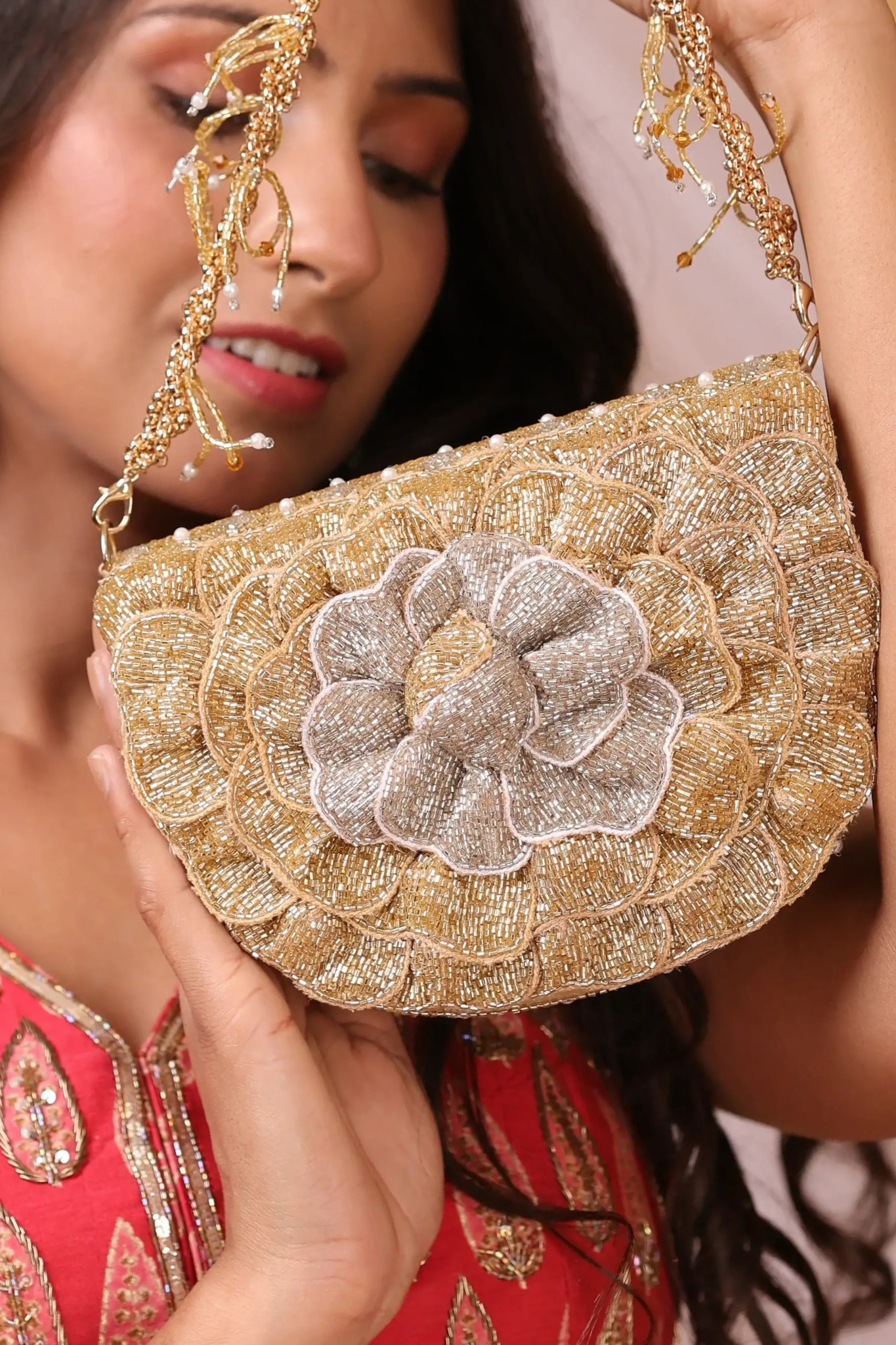 This exquisite bag features a stunning handcrafted flower design, delicately embellished with shimmering beads and sequins. The floral motif symbolizes grace and celebration, making it the perfect accessory for weddings, festive occasions, and elegant evenings. Every petal is thoughtfully detailed, ensuring your look blossoms with sophistication