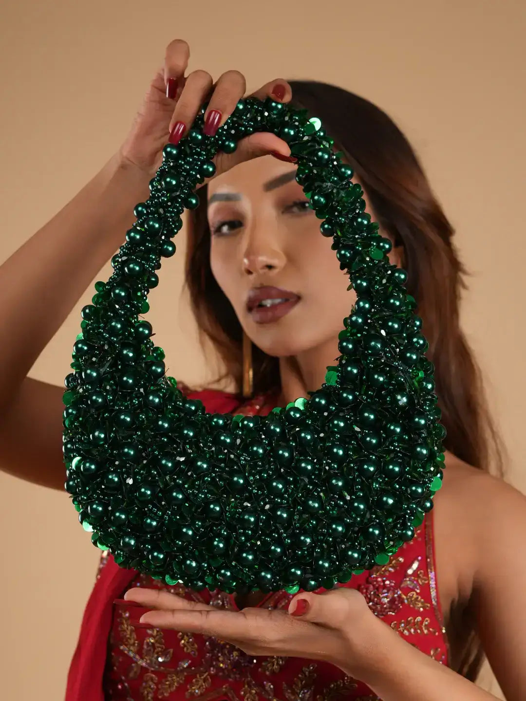 This is a glamorous, statement-making handbag with a bold and luxurious design. The bag is richly adorned with an array of Green embellishments, including beads, sequins, and metallic spheres that create a highly textured and eye-catching surface. The overall effect is dazzling, with the intricate beadwork reflecting light beautifully, making it perfect for special occasions or evening wear. Its unique crescent-like shape and thick, beaded handle add both structure and artistry. The bag exudes opulence and is designed for those who want to stand out with a striking, high-fashion accessory.