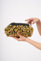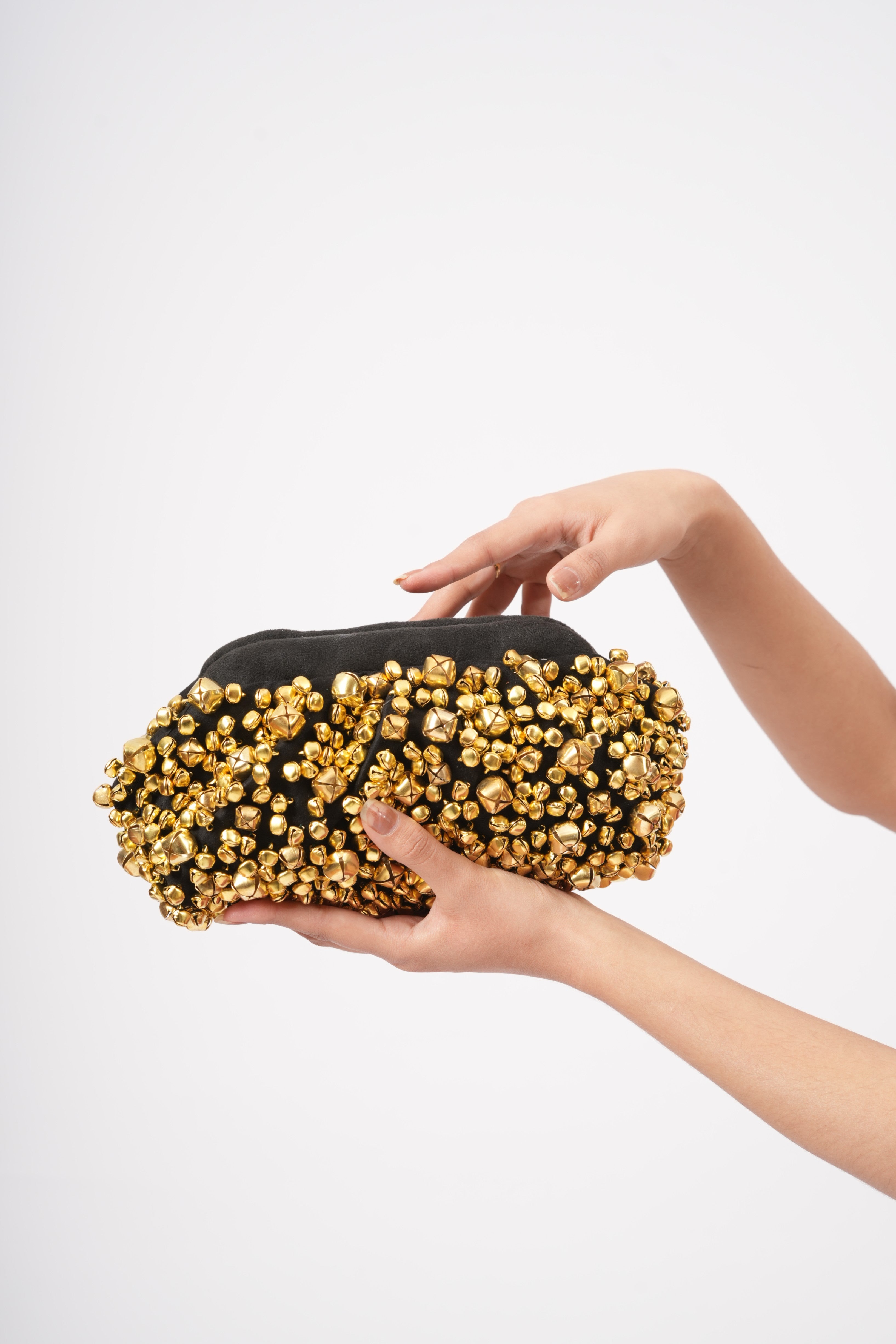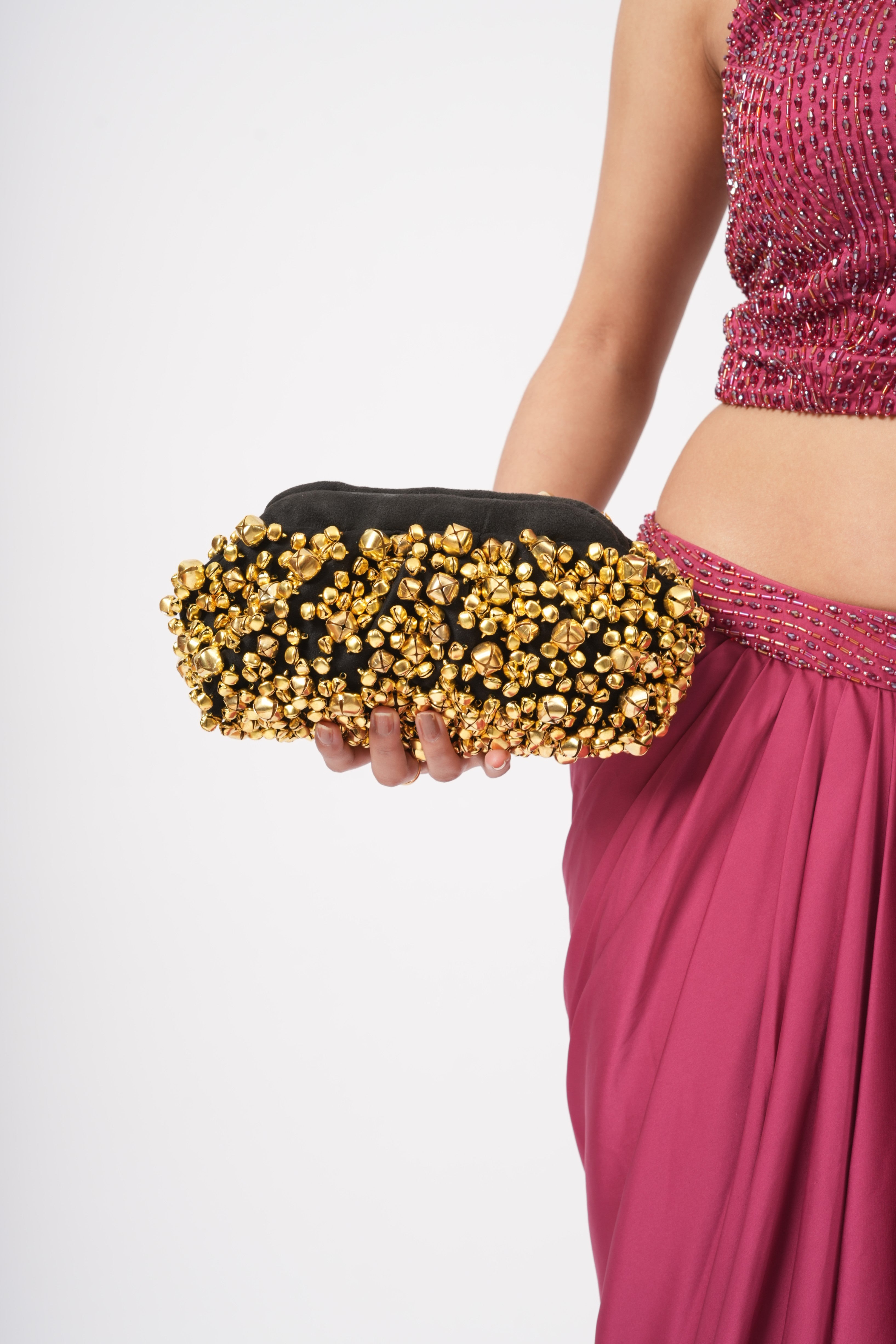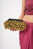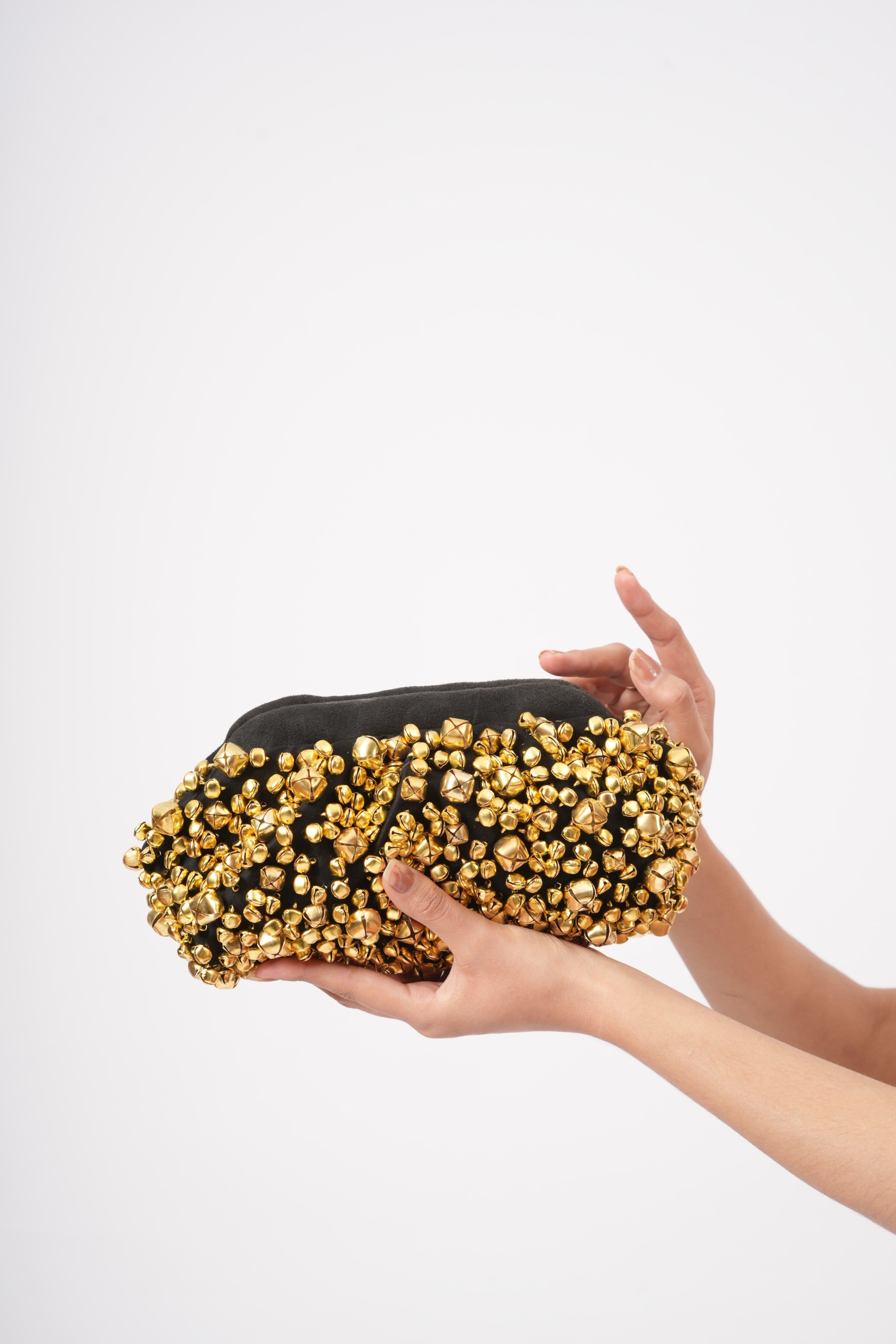 Step into the spotlight with our Ghungroo Chan Bag, a true statement piece that blends traditional artistry with modern luxury. Crafted to perfection, this exquisite creation features golden ghungroos meticulously embedded over rich black fabric, creating a stunning visual and auditory charm that’s first of its kind.