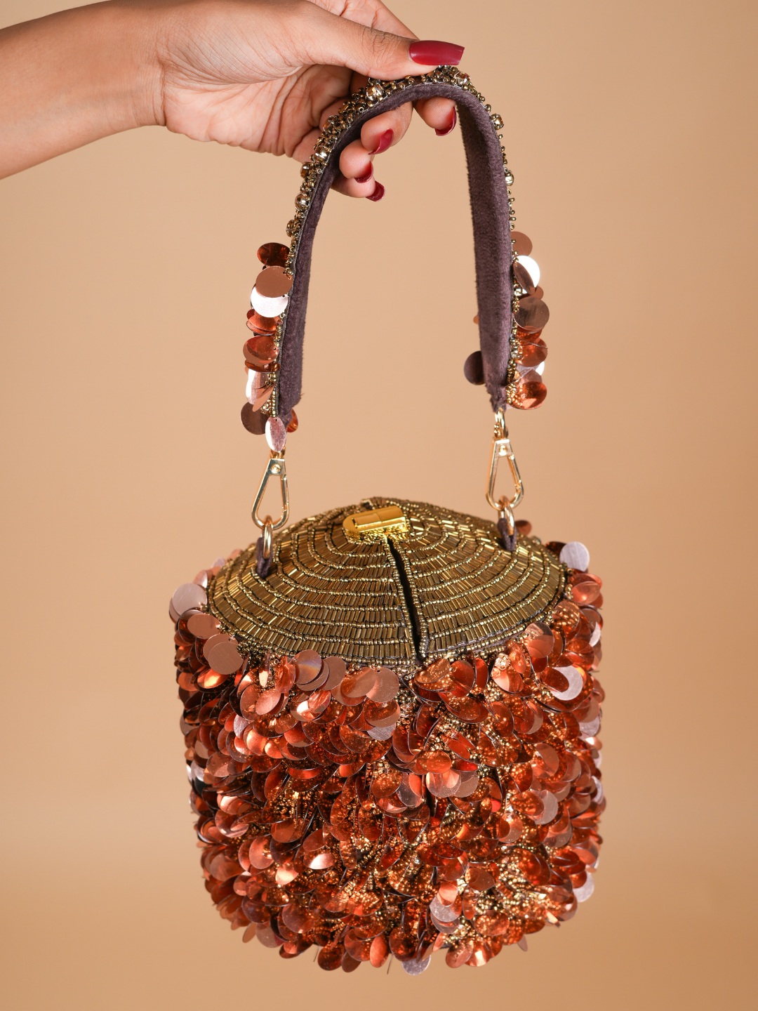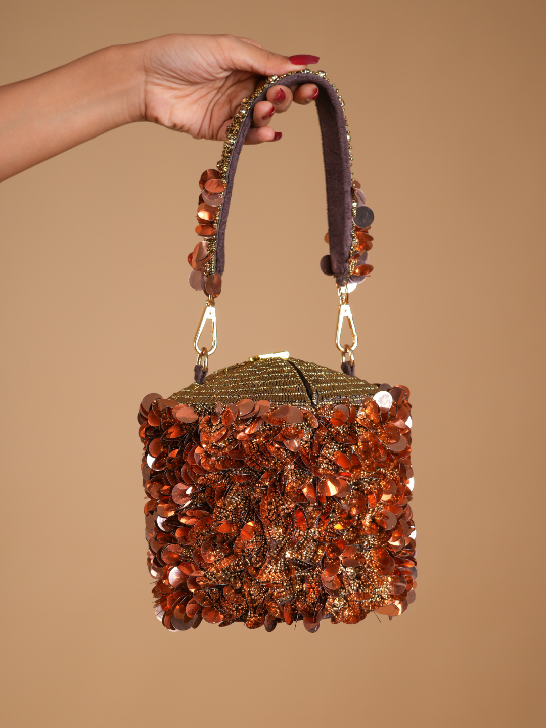An ode to timeless craftsmanship and modern opulence. Hand-embroidered with lustrous bronze sequins and intricate beadwork, each piece is a masterpiece of precision and artistry. The structured silhouette radiates elegance, while the embellished handle adds a sculptural charm — making it a statement accessory for soirées and celebrations alike.