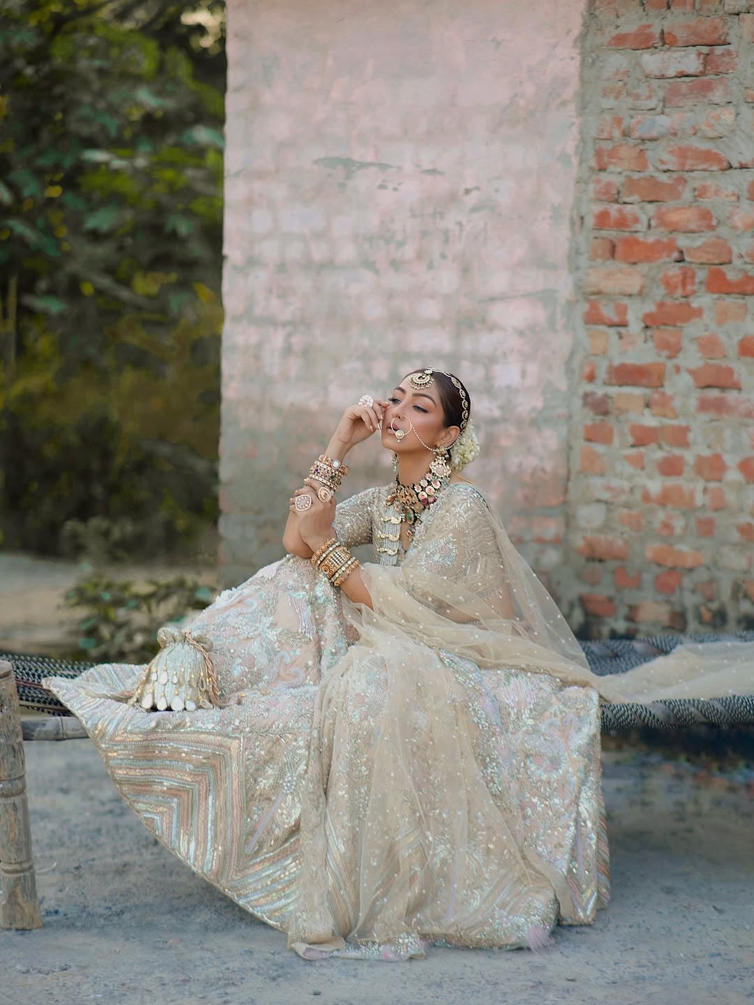The perfect one potli for all your gold, chamagne, silver outfits! This one was an exciting process to create! We first created a stunning ombre base of gold threads pouring into a chamapagne, then blending into a silver. The base is then embroidered with beads and sequins! The potli is then amped with chandellier like danglings of beautiful dew mirrors all over the purse! The drawstrings of our potli is further decorated with large mirror tassels! PS- you can use them as tiny hand mirrors to retouch your make up! The two way wear potli purse comes with a detachable crystal gold chain .