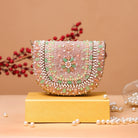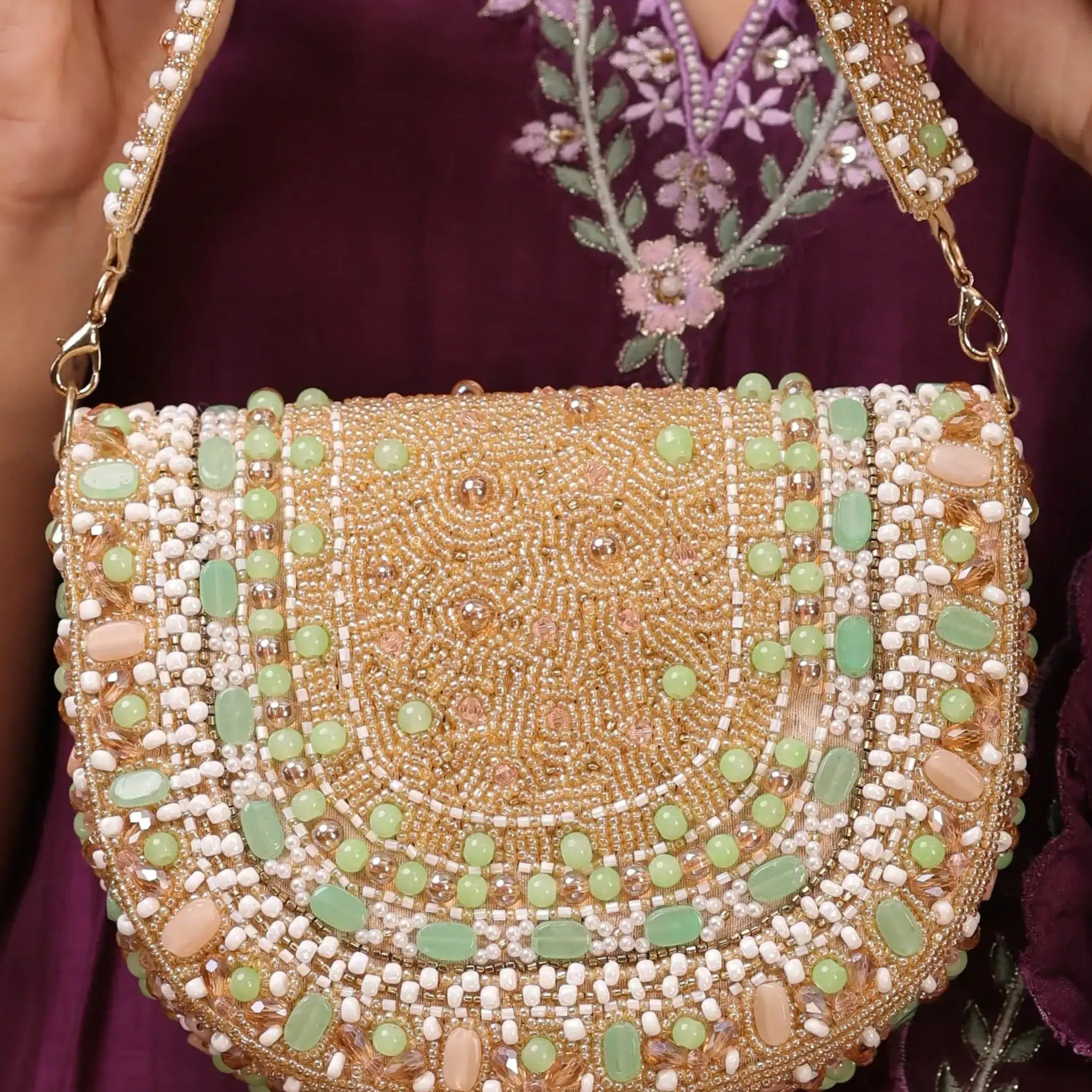 This exquisite bag is a true work of art, showcasing intricate hand-done beadwork and stone embellishments. Each detail, from the delicately placed pearls to the pastel-toned stones, adds depth and richness to its design. The meticulous craftsmanship ensures that every inch of this bag radiates elegance, making it the perfect accessory for weddings, festive celebrations, and special evenings where you want to stand out with timeless sophistication