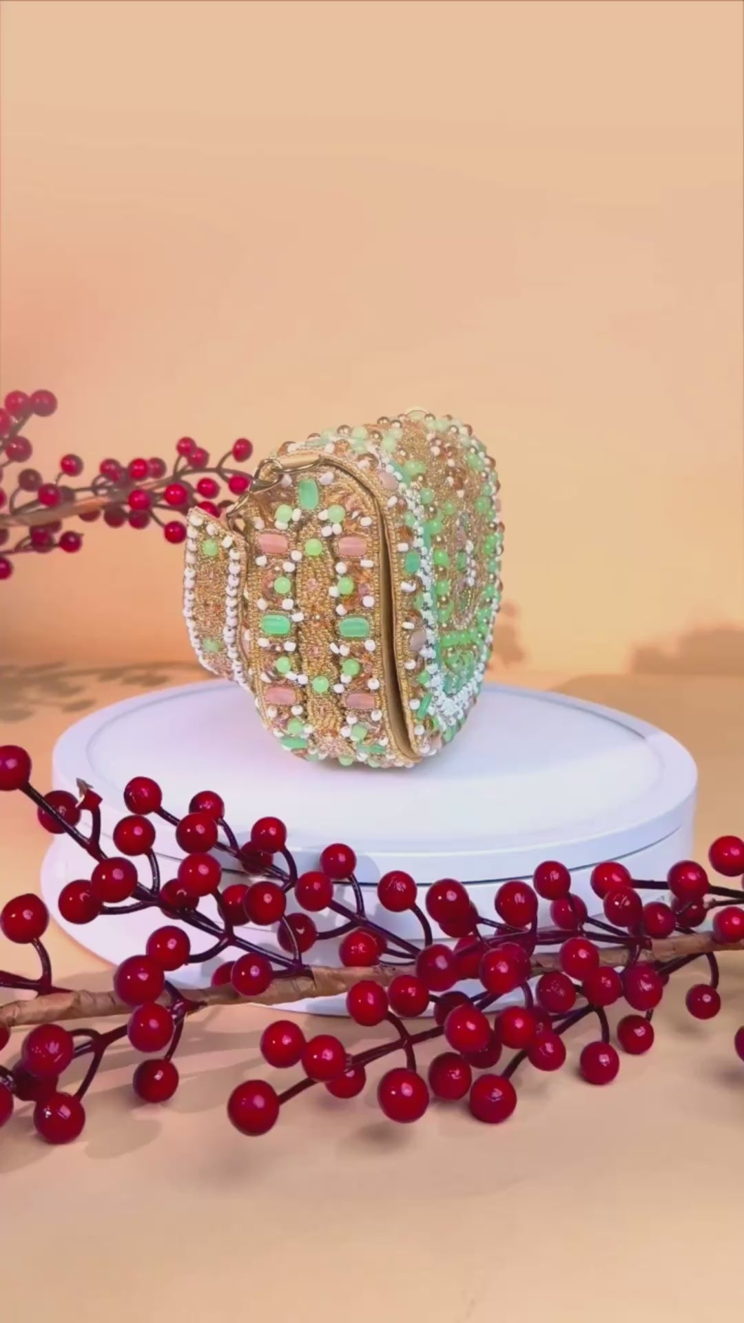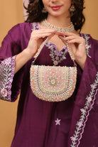 Crafted with precision stitching, this bag reflects durability and premium craftsmanship while retaining its luxurious appeal. The neatly finished interior offers ample space to carry your phone, makeup essentials, and other valuables with ease. A perfect balance of style and practicality, making it your go-to accessory for weddings, festive events, and elegant evenings.