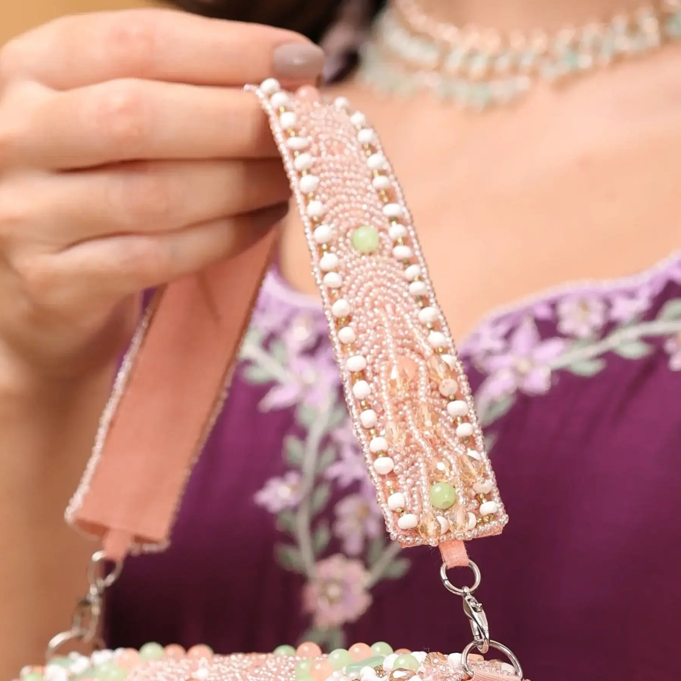 The hand-beaded chain isn’t just a handle — it’s a statement of luxury. Intricately crafted with shimmering beads and delicate motifs, it adds grace, grandeur, and exclusivity to your look.