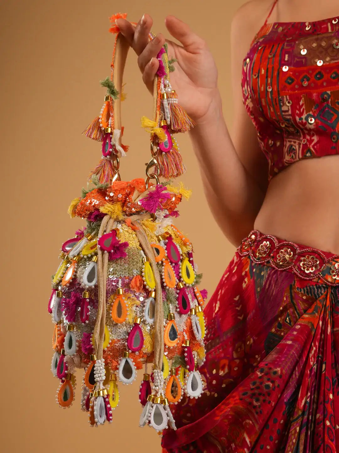 Step into the spotlight with this multi-colored handcrafted tassel potli, a playful fusion of tradition and boho-chic style. Designed on a base of shimmering sequins, it’s beautifully embellished with bold mirror work, vibrant threads, and lively tassels in shades of pink, orange, yellow, and green.