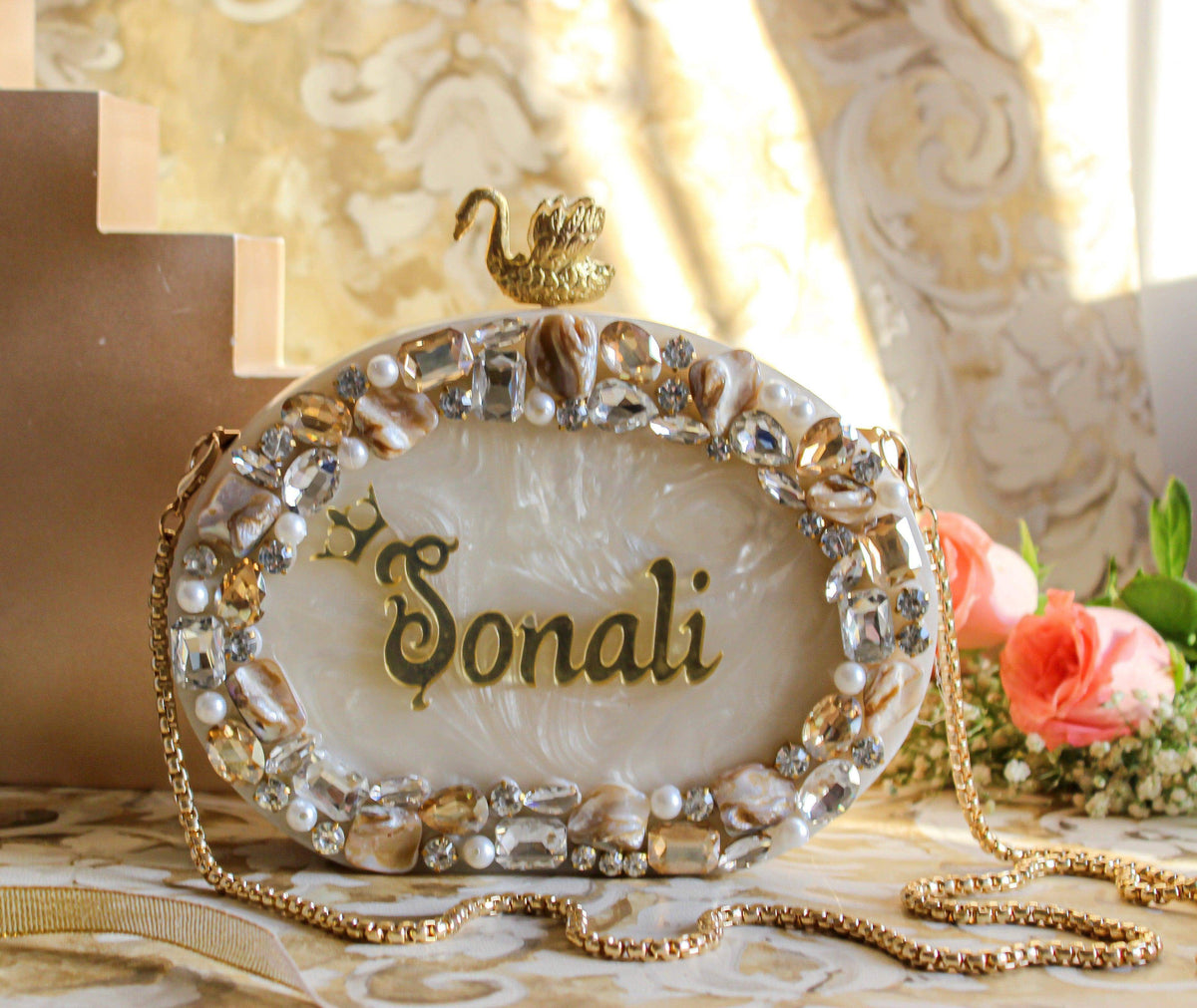 The Beige customised name clutch made from Resin is the perfect bespoke bag to take for all occasions. This one is sure to complete all your looks, making a statement everywhere you go, be it at brunch with the girls or at the airport.