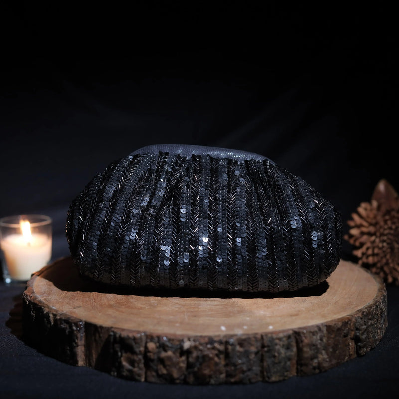 Elevate your look with our exquisite Rhea black Vintage Purse. Crafted in black sequence, this purse features intricate sequence and cut dana work, adding a touch of timeless elegance. The beautifully detailed embroidery showcases a fine blend of craftsmanship, making it a standout accessory for any occasion. Spacious yet stylish, it is perfect for carrying your essentials while complementing your attire. Whether for weddings, parties, or special celebrations, this potli bag is a must-have addition to your accessory collection.