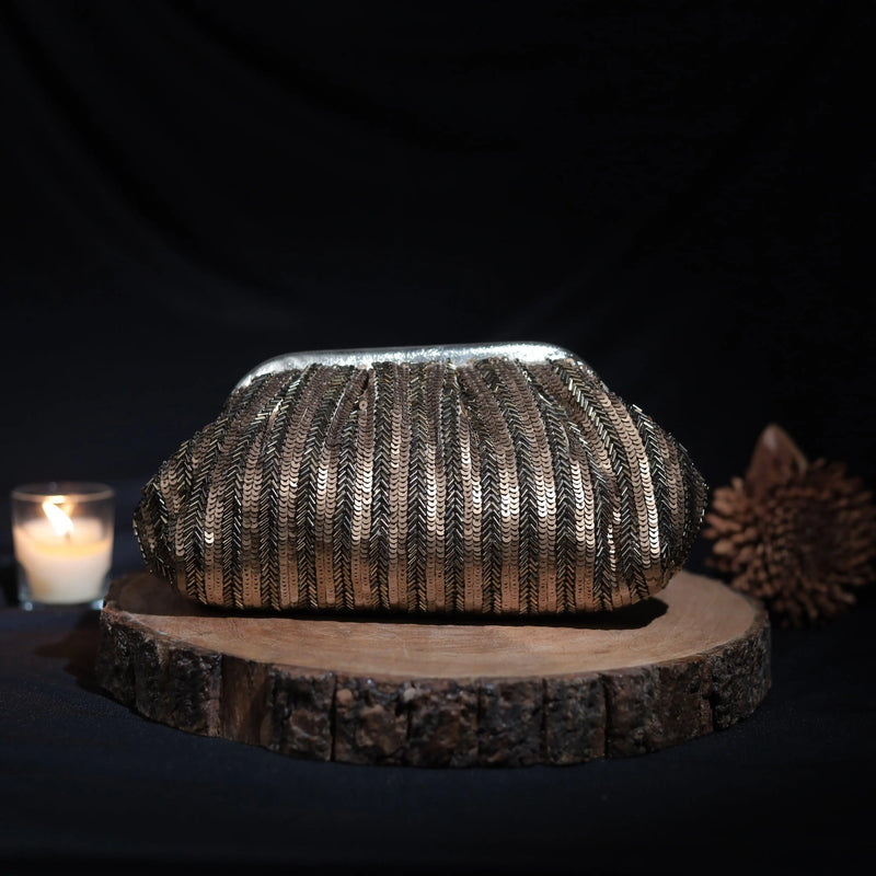 Elevate your look with our exquisite Rhea gold Vintage Purse. Crafted in golden sequence, this purse features intricate sequence and cut dana work, adding a touch of timeless elegance. The beautifully detailed embroidery showcases a fine blend of craftsmanship, making it a standout accessory for any occasion. Spacious yet stylish, it is perfect for carrying your essentials while complementing your attire. Whether for weddings, parties, or special celebrations, this potli bag is a must-have addition to your accessory collection.
